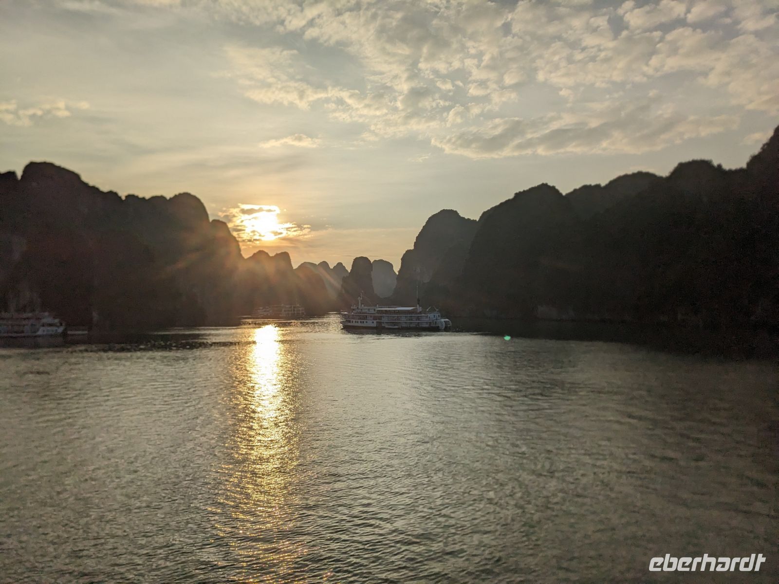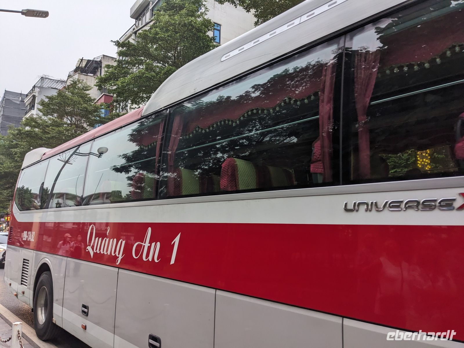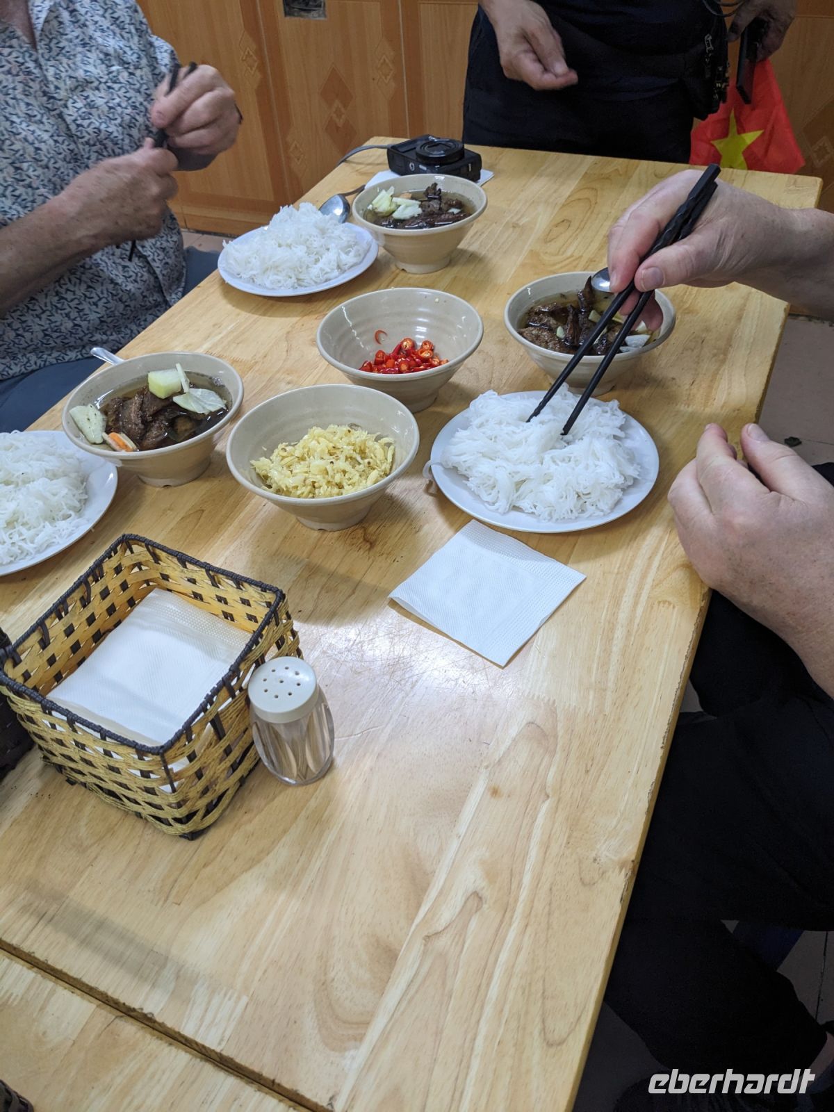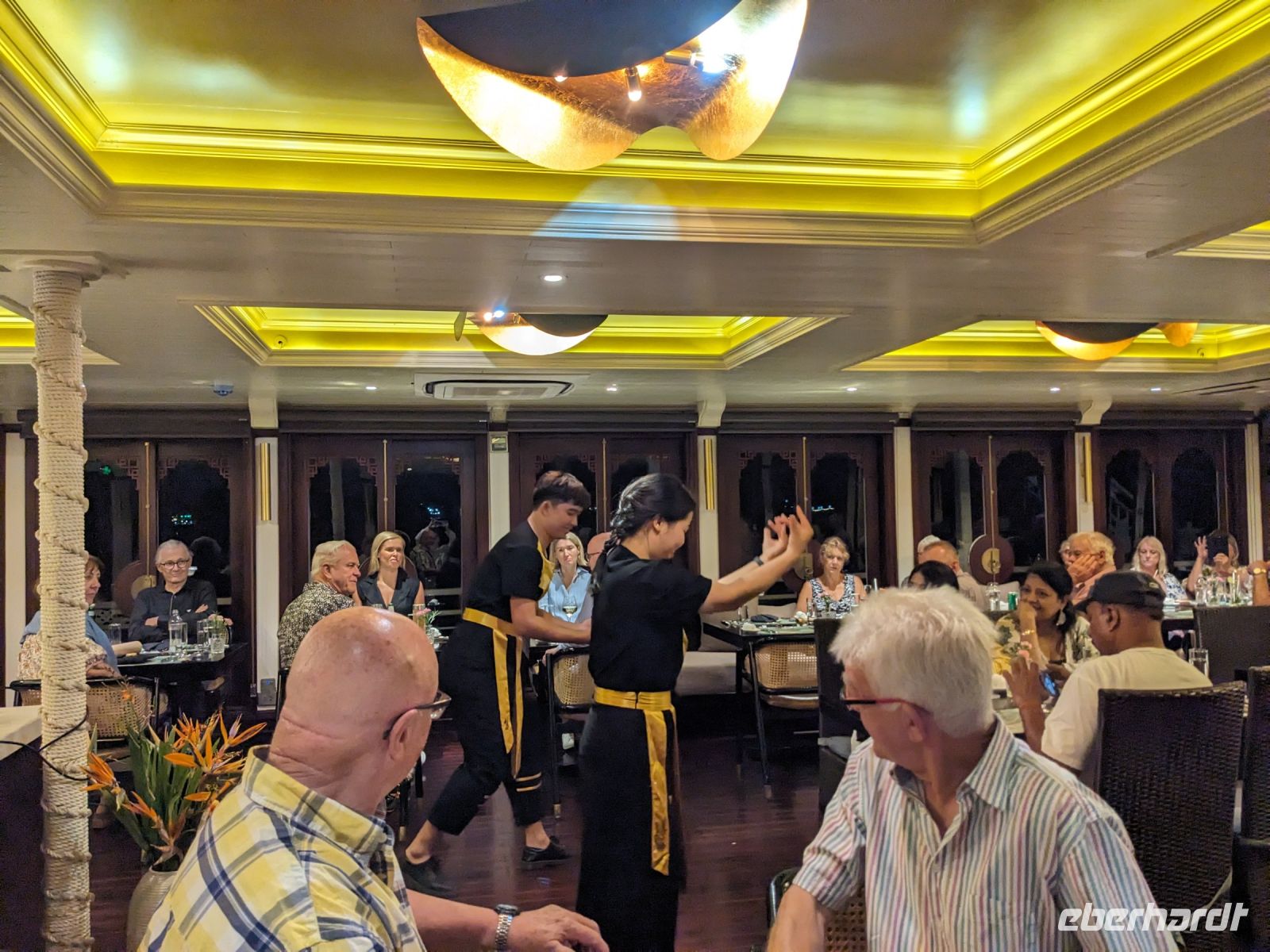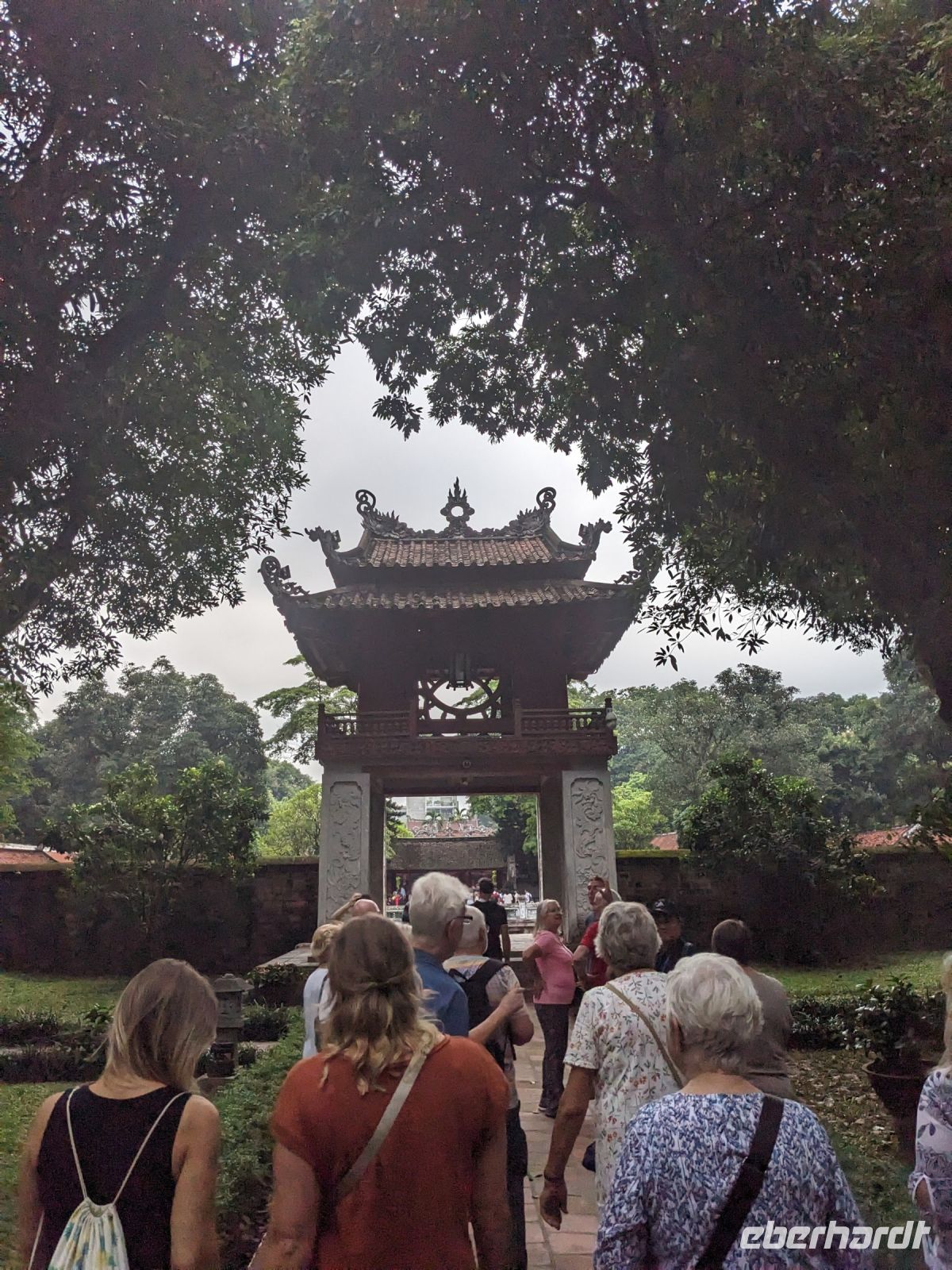 Schon früh am Morgen kamen wir in Hanoi an und fuhren zunächst erstmal zum Hotel, doch aufgrund der frühen Stunde waren unsere Zimmer noch nicht fertig und so machten wir uns nur kurz frisch und zogen dann los auf einen Stadtspaziergang. Noch leicht übermüdet von dem langen Flug kamen hier sehr viele Eindrücke zusammen: der Verkehr, die Wärme, die Gerüche - wo waren wir denn hier gelandet? Es musste also erstmal ein Eierkaffee, eine vietnamesische Spezialität, her. Am Hoan-Kiem-See dann ein Menschenauflauf - und alle in rot. Unser Reiseleiter Lang erklärte uns, dass hier gerade ein Festival stattfindet. In der Innenstadt bestand auch die Möglichkeit für diejenigen, die noch nicht Geld getauscht hatten, dies hier zu tun - als mehrfache Multimillionäre verließen wir dann die Wechselstube - ein schönes Gefühl. Zurück im Hotel blieb noch etwas Wartezeit und schließlich konnten wir unsere Zimmer beziehen - eine Wohltat nach der Anreise! Am Abend trafen wir uns zum Abendessen wieder und anschließend suchten wir noch eine Gasse auf. Aber keine gewöhnliche Gasse natürlich! Hier führten Bahnschienen entlang und bei einem Getränk im Namen von Eberhardt TRAVEL rauschte der Zug nur wenige Zentimeter an uns vorbei - eine unbeschreibliche Erfahrung und wäre hier in Deutschland auf jeden Fall niemals zulässig. Aber genau für solche Momente verreisen wir ja, nicht wahr?