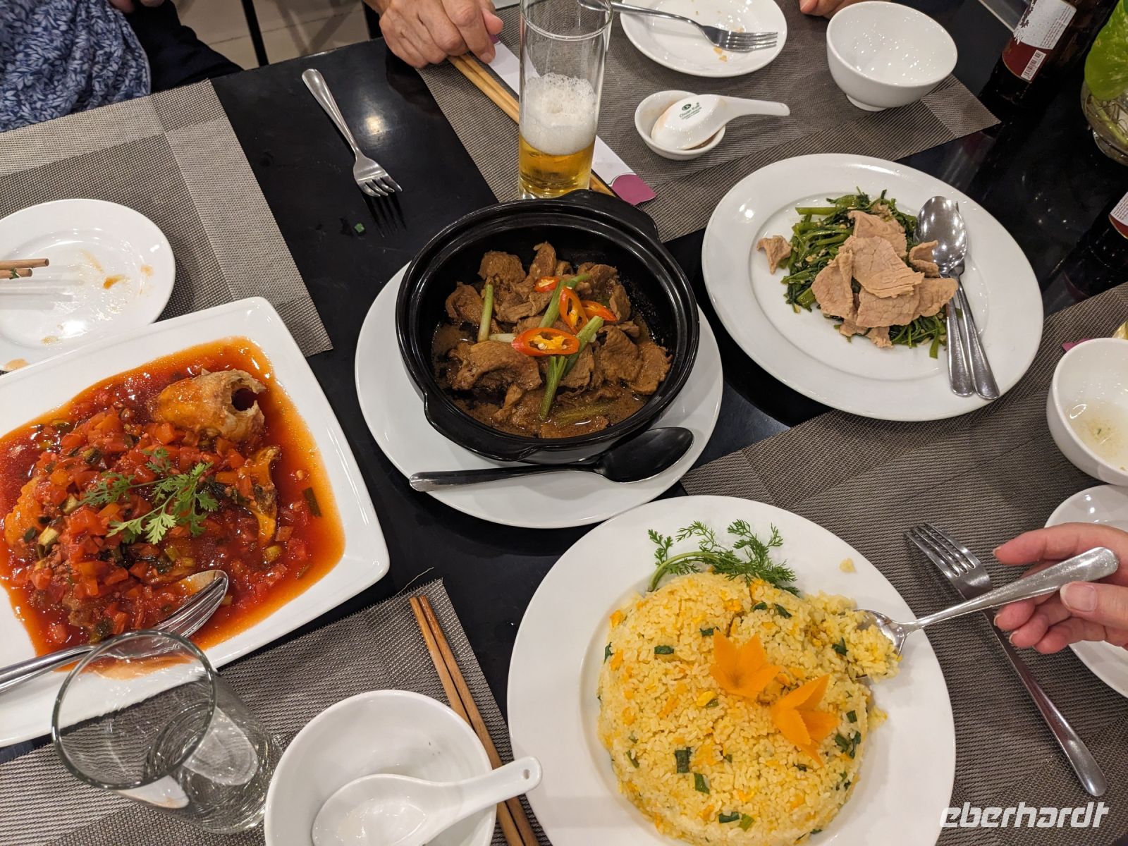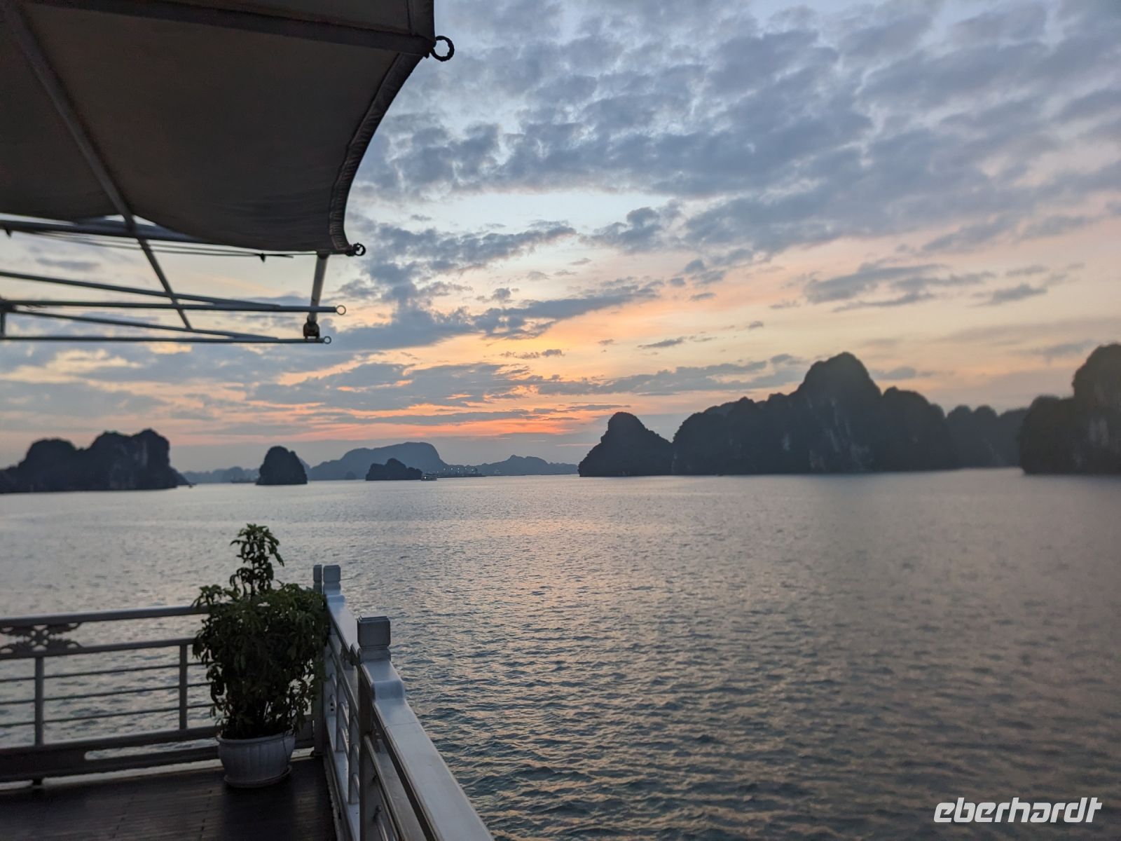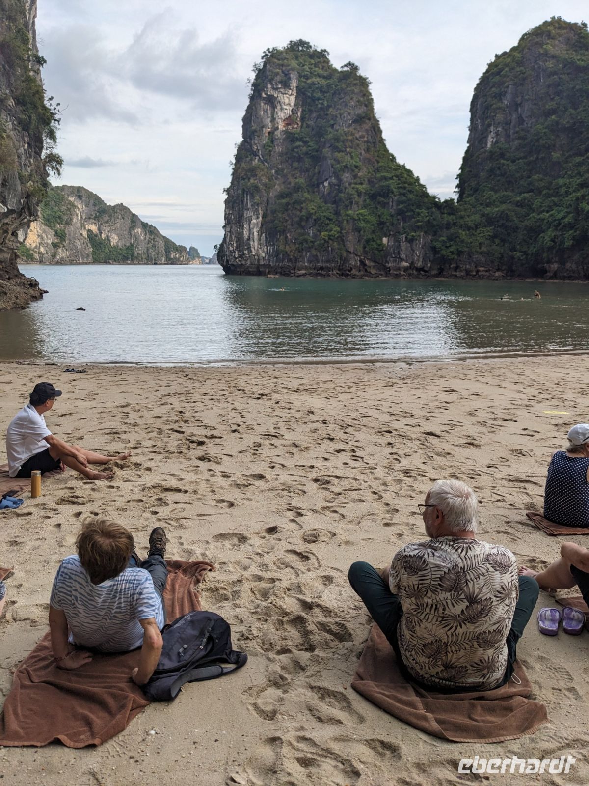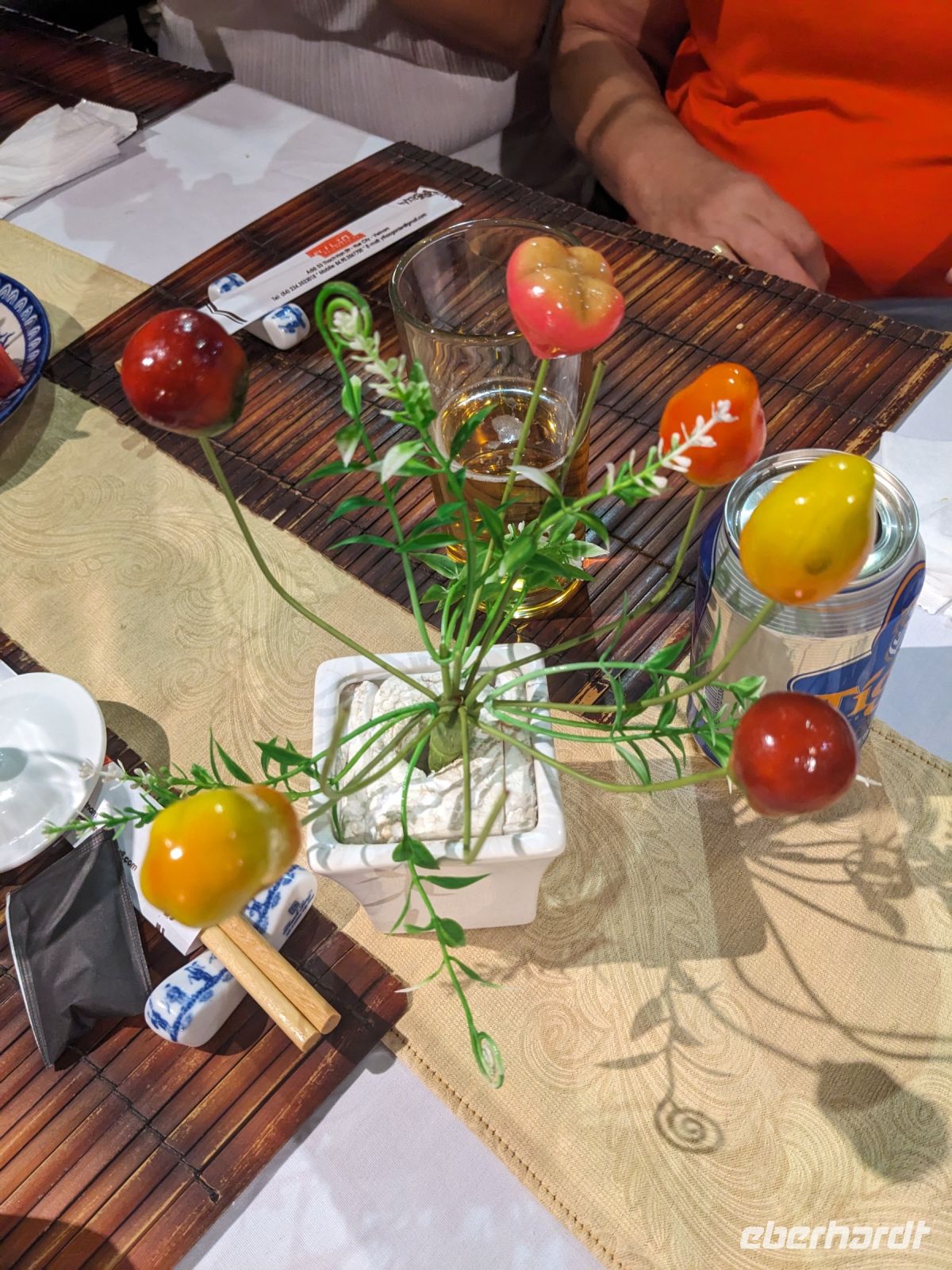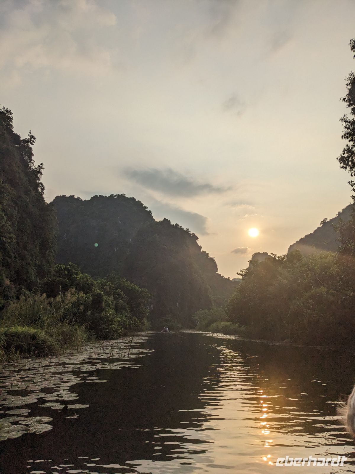 Schon früh am Morgen kamen wir in Hanoi an und fuhren zunächst erstmal zum Hotel, doch aufgrund der frühen Stunde waren unsere Zimmer noch nicht fertig und so machten wir uns nur kurz frisch und zogen dann los auf einen Stadtspaziergang. Noch leicht übermüdet von dem langen Flug kamen hier sehr viele Eindrücke zusammen: der Verkehr, die Wärme, die Gerüche - wo waren wir denn hier gelandet? Es musste also erstmal ein Eierkaffee, eine vietnamesische Spezialität, her. Am Hoan-Kiem-See dann ein Menschenauflauf - und alle in rot. Unser Reiseleiter Lang erklärte uns, dass hier gerade ein Festival stattfindet. In der Innenstadt bestand auch die Möglichkeit für diejenigen, die noch nicht Geld getauscht hatten, dies hier zu tun - als mehrfache Multimillionäre verließen wir dann die Wechselstube - ein schönes Gefühl. Zurück im Hotel blieb noch etwas Wartezeit und schließlich konnten wir unsere Zimmer beziehen - eine Wohltat nach der Anreise! Am Abend trafen wir uns zum Abendessen wieder und anschließend suchten wir noch eine Gasse auf. Aber keine gewöhnliche Gasse natürlich! Hier führten Bahnschienen entlang und bei einem Getränk im Namen von Eberhardt TRAVEL rauschte der Zug nur wenige Zentimeter an uns vorbei - eine unbeschreibliche Erfahrung und wäre hier in Deutschland auf jeden Fall niemals zulässig. Aber genau für solche Momente verreisen wir ja, nicht wahr?