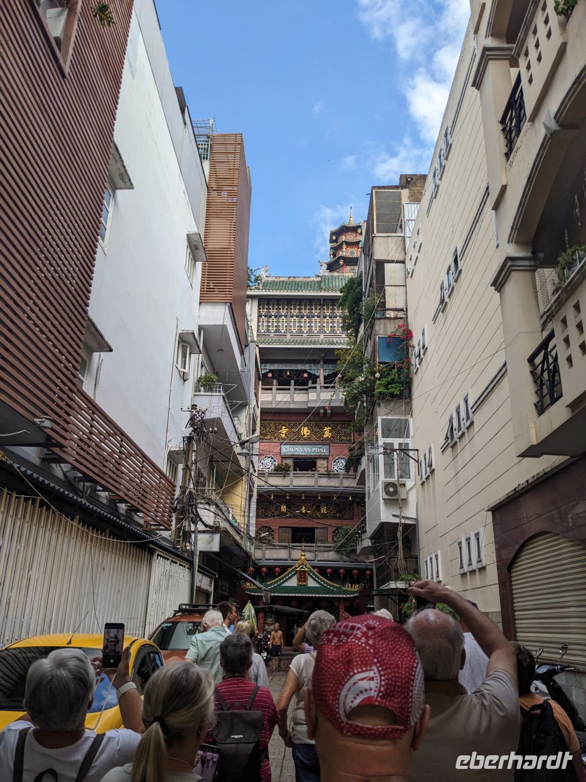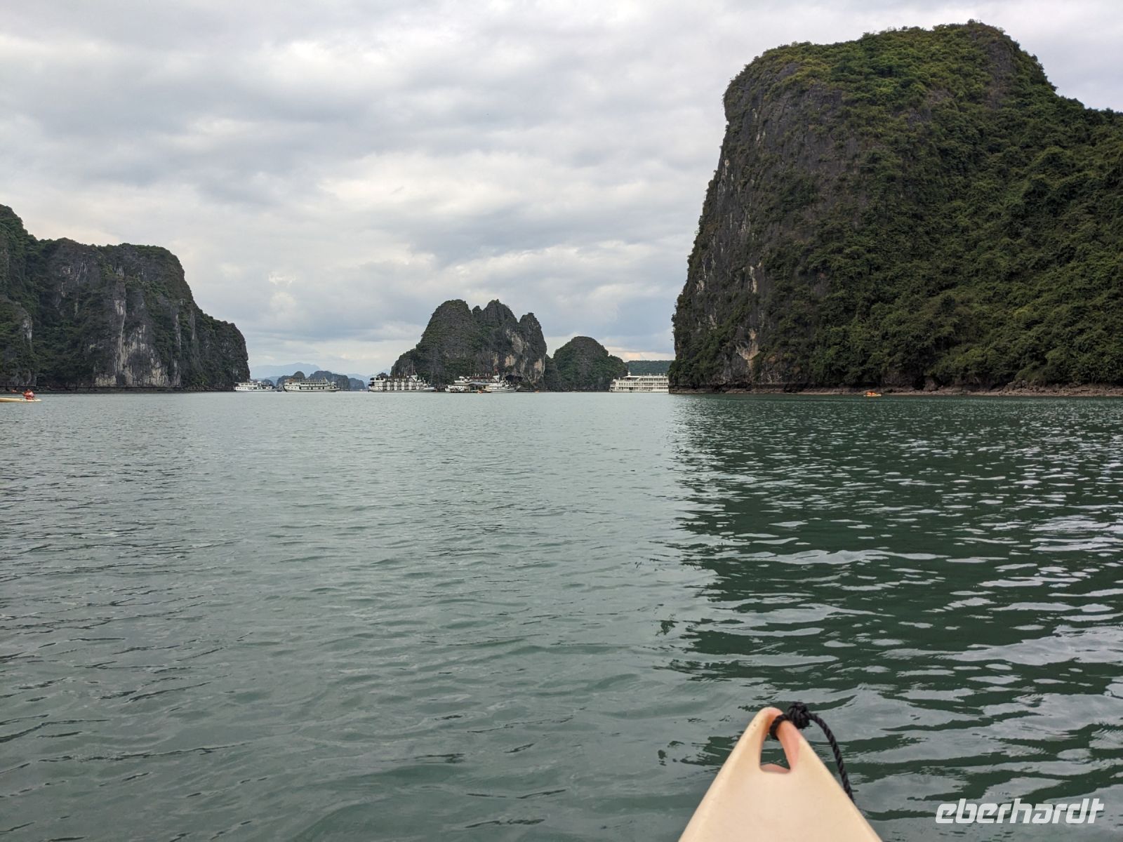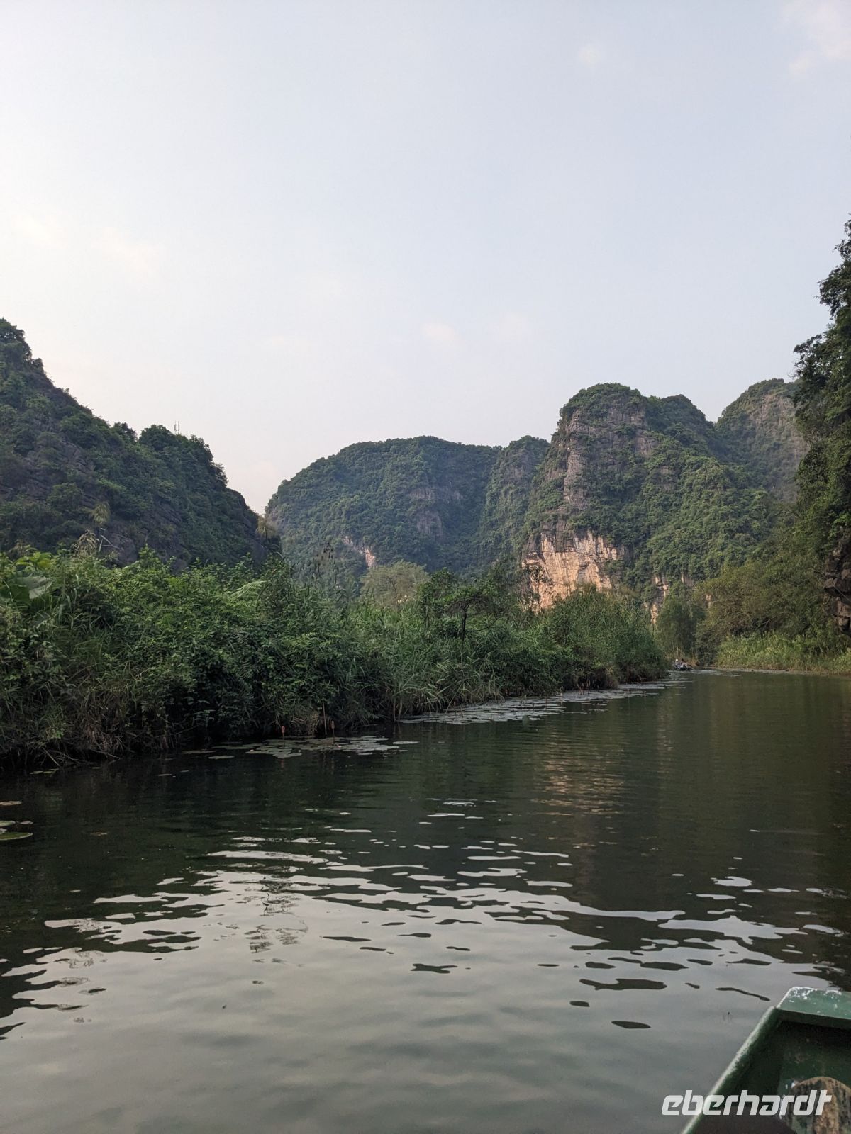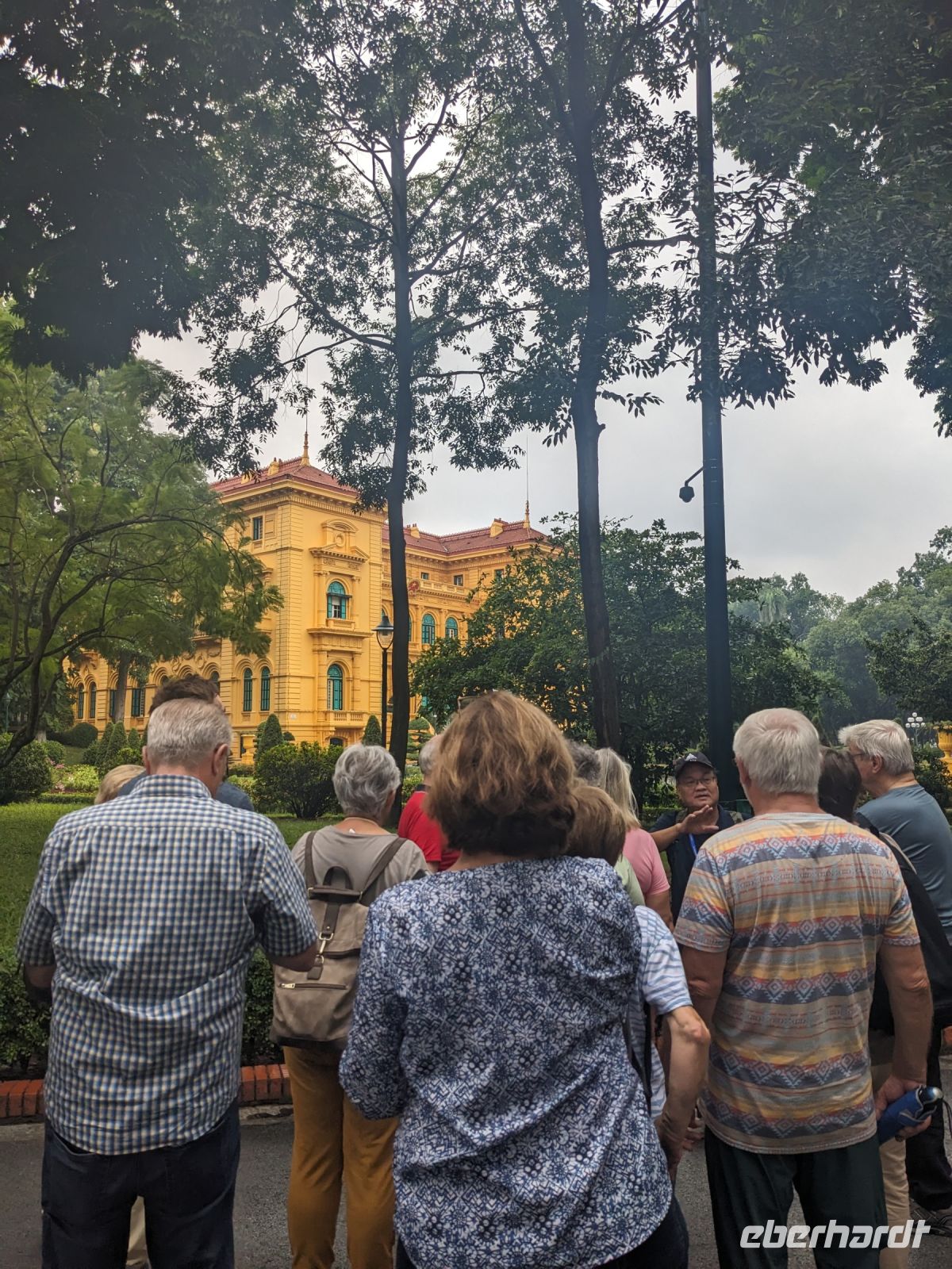 Schon früh am Morgen kamen wir in Hanoi an und fuhren zunächst erstmal zum Hotel, doch aufgrund der frühen Stunde waren unsere Zimmer noch nicht fertig und so machten wir uns nur kurz frisch und zogen dann los auf einen Stadtspaziergang. Noch leicht übermüdet von dem langen Flug kamen hier sehr viele Eindrücke zusammen: der Verkehr, die Wärme, die Gerüche - wo waren wir denn hier gelandet? Es musste also erstmal ein Eierkaffee, eine vietnamesische Spezialität, her. Am Hoan-Kiem-See dann ein Menschenauflauf - und alle in rot. Unser Reiseleiter Lang erklärte uns, dass hier gerade ein Festival stattfindet. In der Innenstadt bestand auch die Möglichkeit für diejenigen, die noch nicht Geld getauscht hatten, dies hier zu tun - als mehrfache Multimillionäre verließen wir dann die Wechselstube - ein schönes Gefühl. Zurück im Hotel blieb noch etwas Wartezeit und schließlich konnten wir unsere Zimmer beziehen - eine Wohltat nach der Anreise! Am Abend trafen wir uns zum Abendessen wieder und anschließend suchten wir noch eine Gasse auf. Aber keine gewöhnliche Gasse natürlich! Hier führten Bahnschienen entlang und bei einem Getränk im Namen von Eberhardt TRAVEL rauschte der Zug nur wenige Zentimeter an uns vorbei - eine unbeschreibliche Erfahrung und wäre hier in Deutschland auf jeden Fall niemals zulässig. Aber genau für solche Momente verreisen wir ja, nicht wahr?