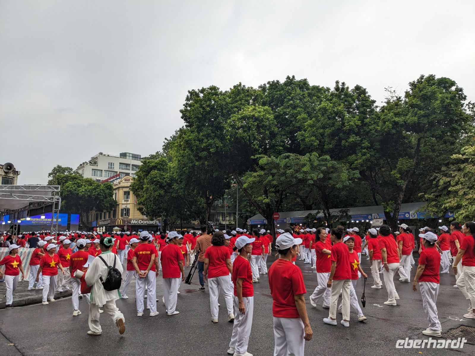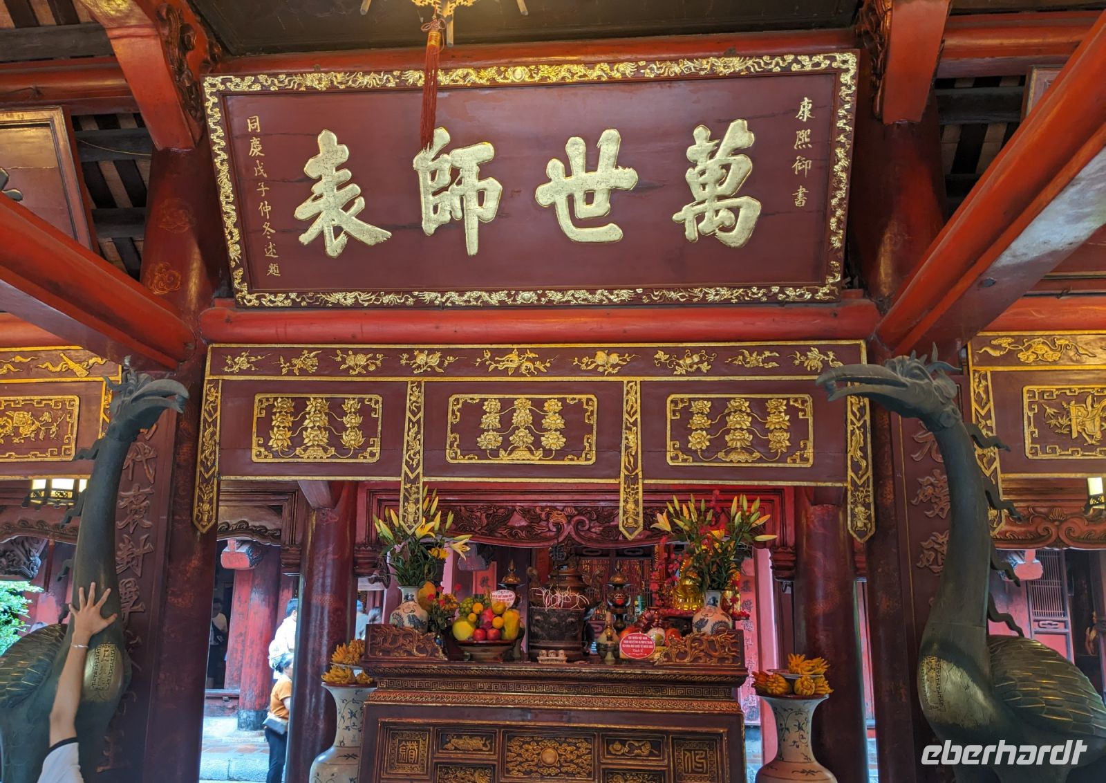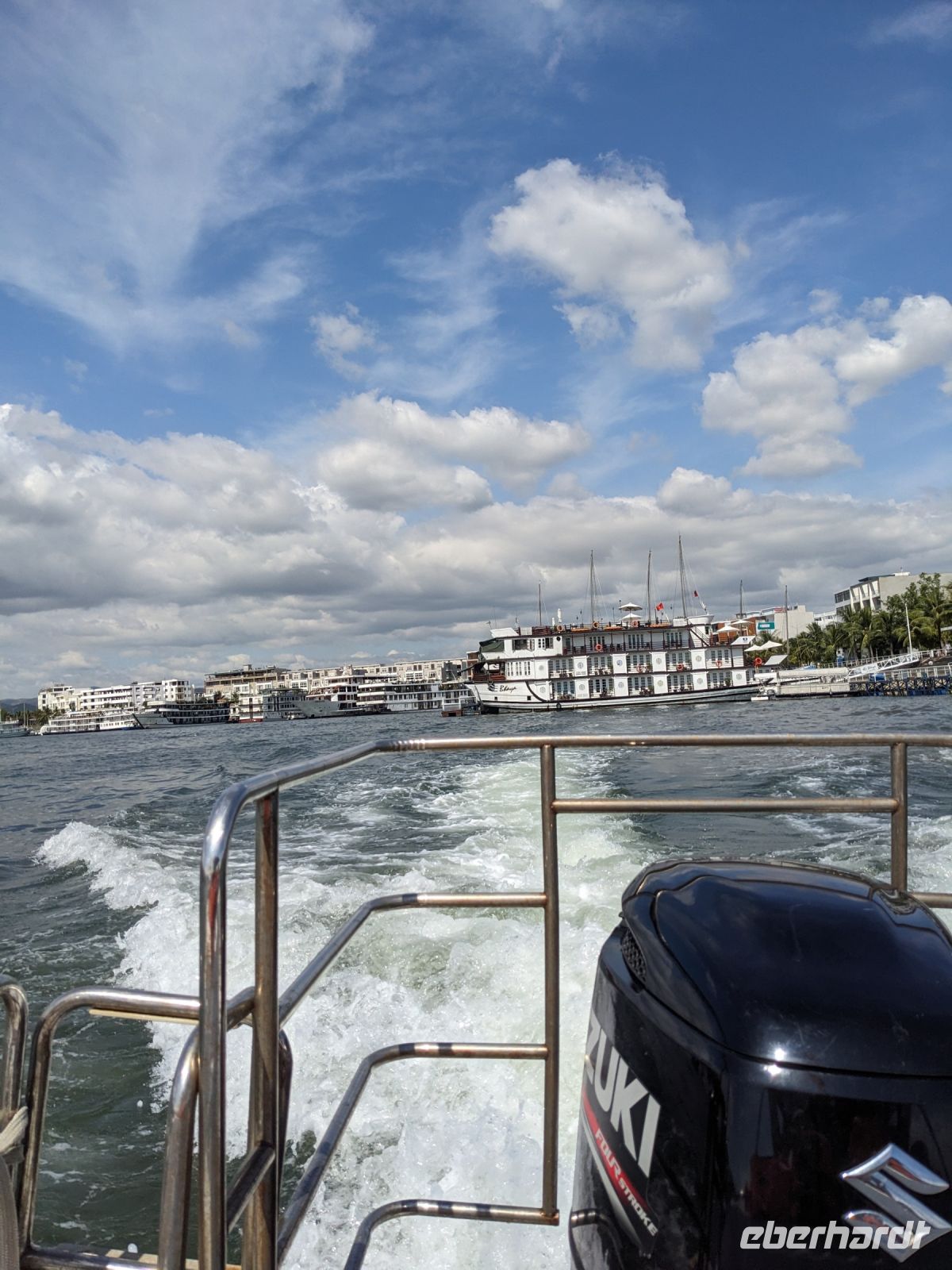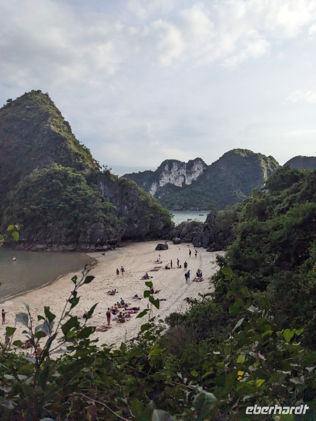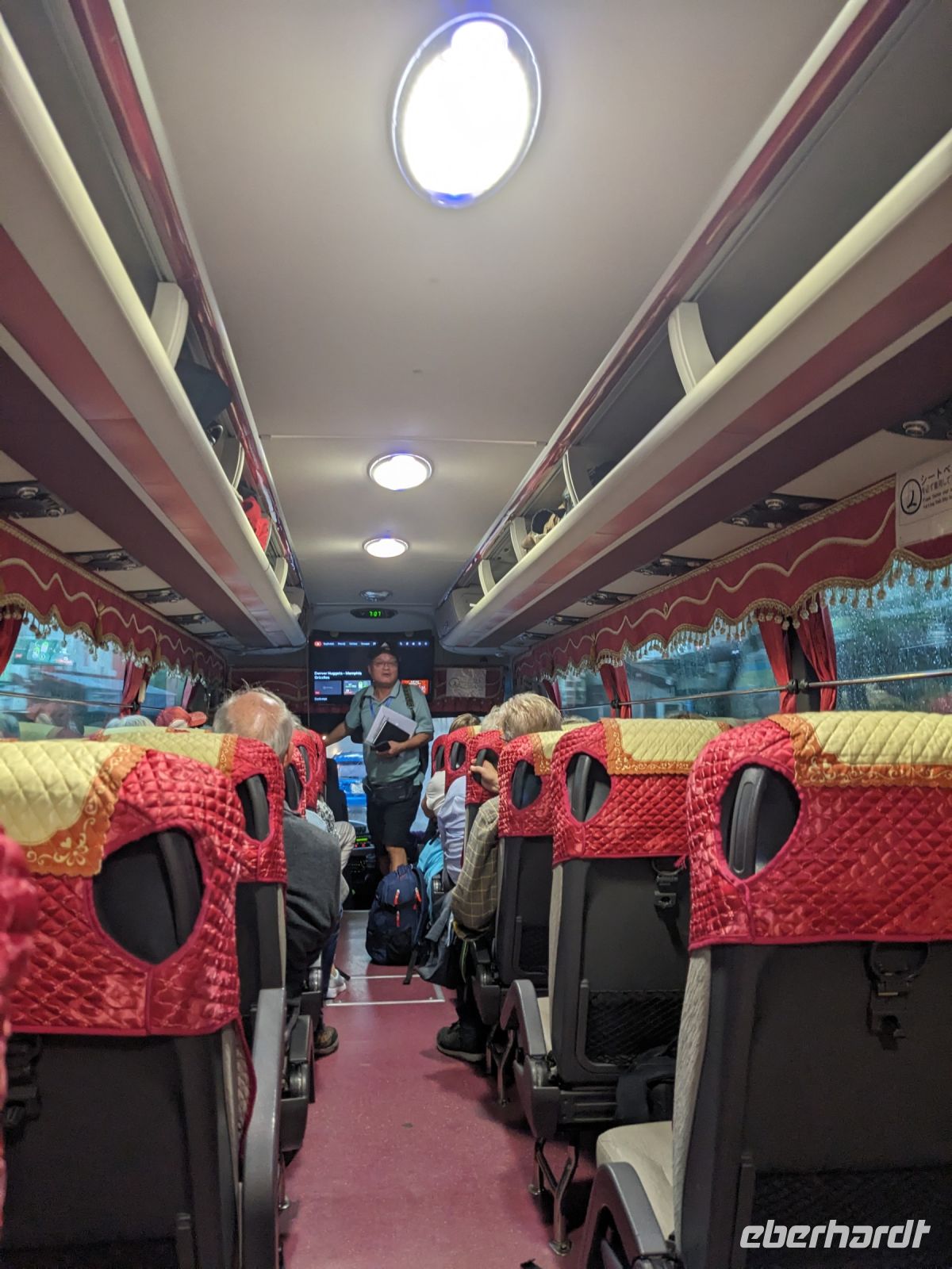 Schon früh am Morgen kamen wir in Hanoi an und fuhren zunächst erstmal zum Hotel, doch aufgrund der frühen Stunde waren unsere Zimmer noch nicht fertig und so machten wir uns nur kurz frisch und zogen dann los auf einen Stadtspaziergang. Noch leicht übermüdet von dem langen Flug kamen hier sehr viele Eindrücke zusammen: der Verkehr, die Wärme, die Gerüche - wo waren wir denn hier gelandet? Es musste also erstmal ein Eierkaffee, eine vietnamesische Spezialität, her. Am Hoan-Kiem-See dann ein Menschenauflauf - und alle in rot. Unser Reiseleiter Lang erklärte uns, dass hier gerade ein Festival stattfindet. In der Innenstadt bestand auch die Möglichkeit für diejenigen, die noch nicht Geld getauscht hatten, dies hier zu tun - als mehrfache Multimillionäre verließen wir dann die Wechselstube - ein schönes Gefühl. Zurück im Hotel blieb noch etwas Wartezeit und schließlich konnten wir unsere Zimmer beziehen - eine Wohltat nach der Anreise! Am Abend trafen wir uns zum Abendessen wieder und anschließend suchten wir noch eine Gasse auf. Aber keine gewöhnliche Gasse natürlich! Hier führten Bahnschienen entlang und bei einem Getränk im Namen von Eberhardt TRAVEL rauschte der Zug nur wenige Zentimeter an uns vorbei - eine unbeschreibliche Erfahrung und wäre hier in Deutschland auf jeden Fall niemals zulässig. Aber genau für solche Momente verreisen wir ja, nicht wahr?