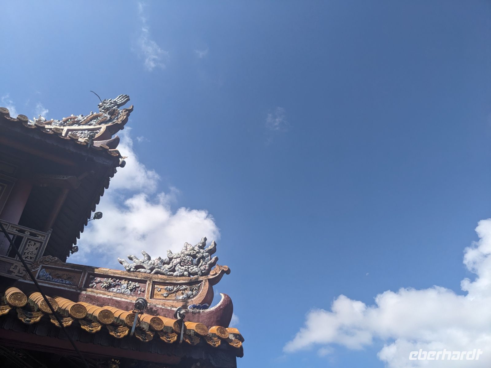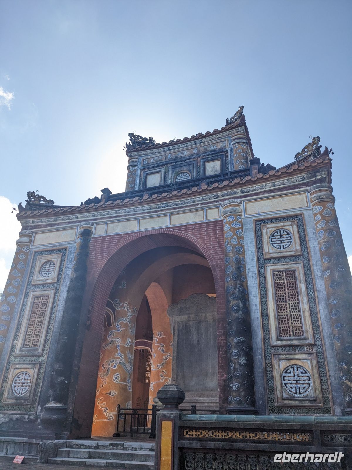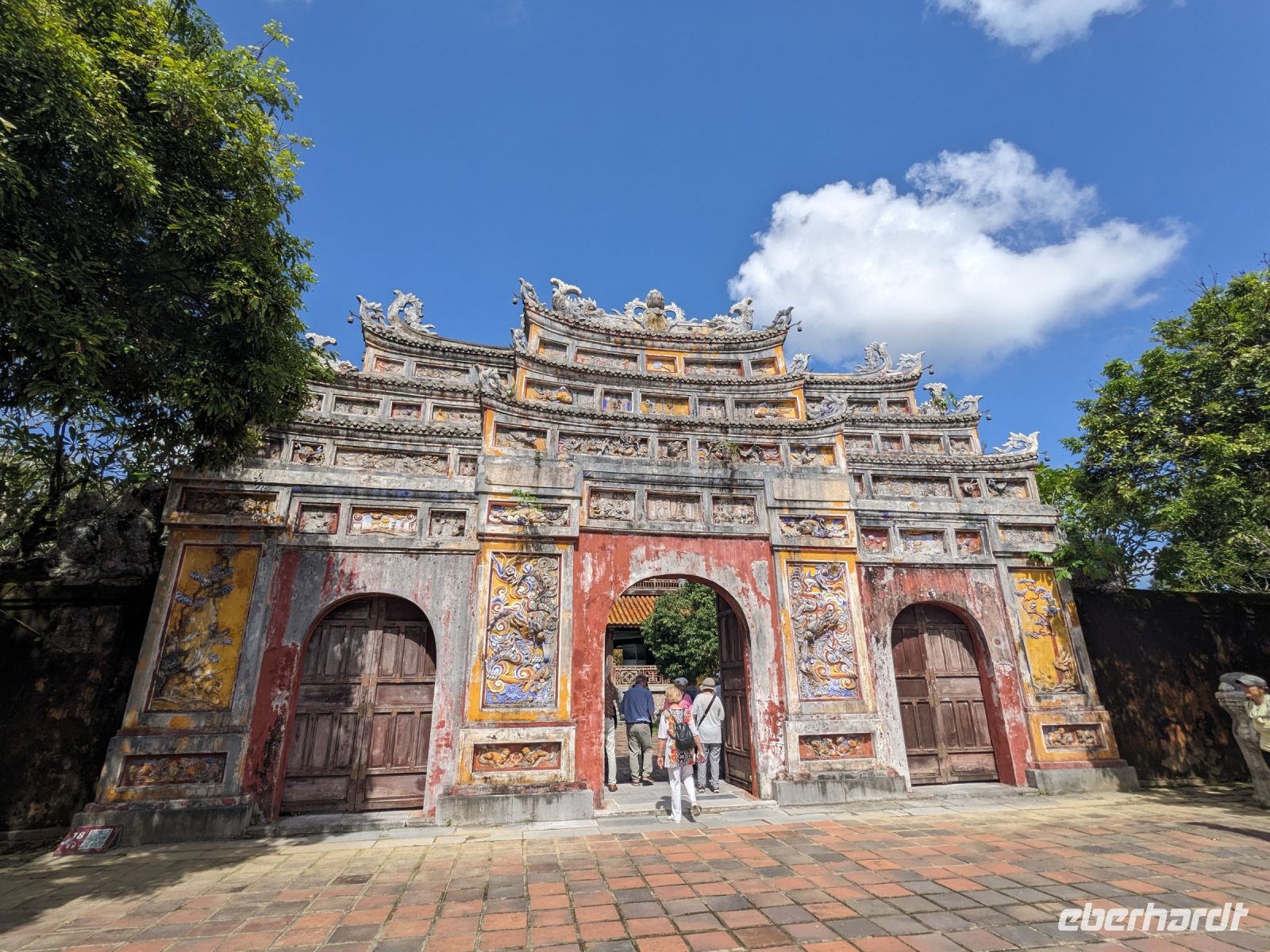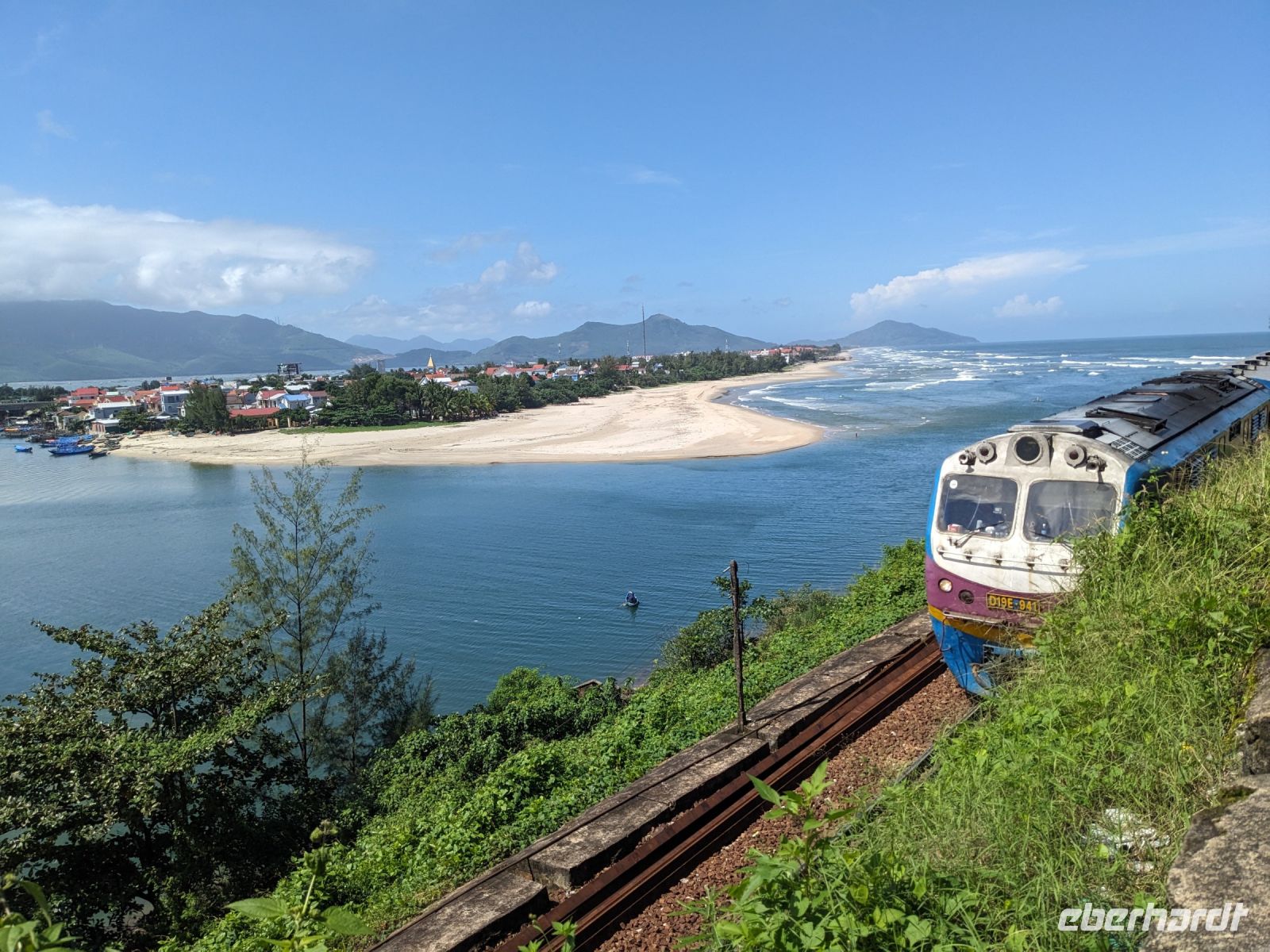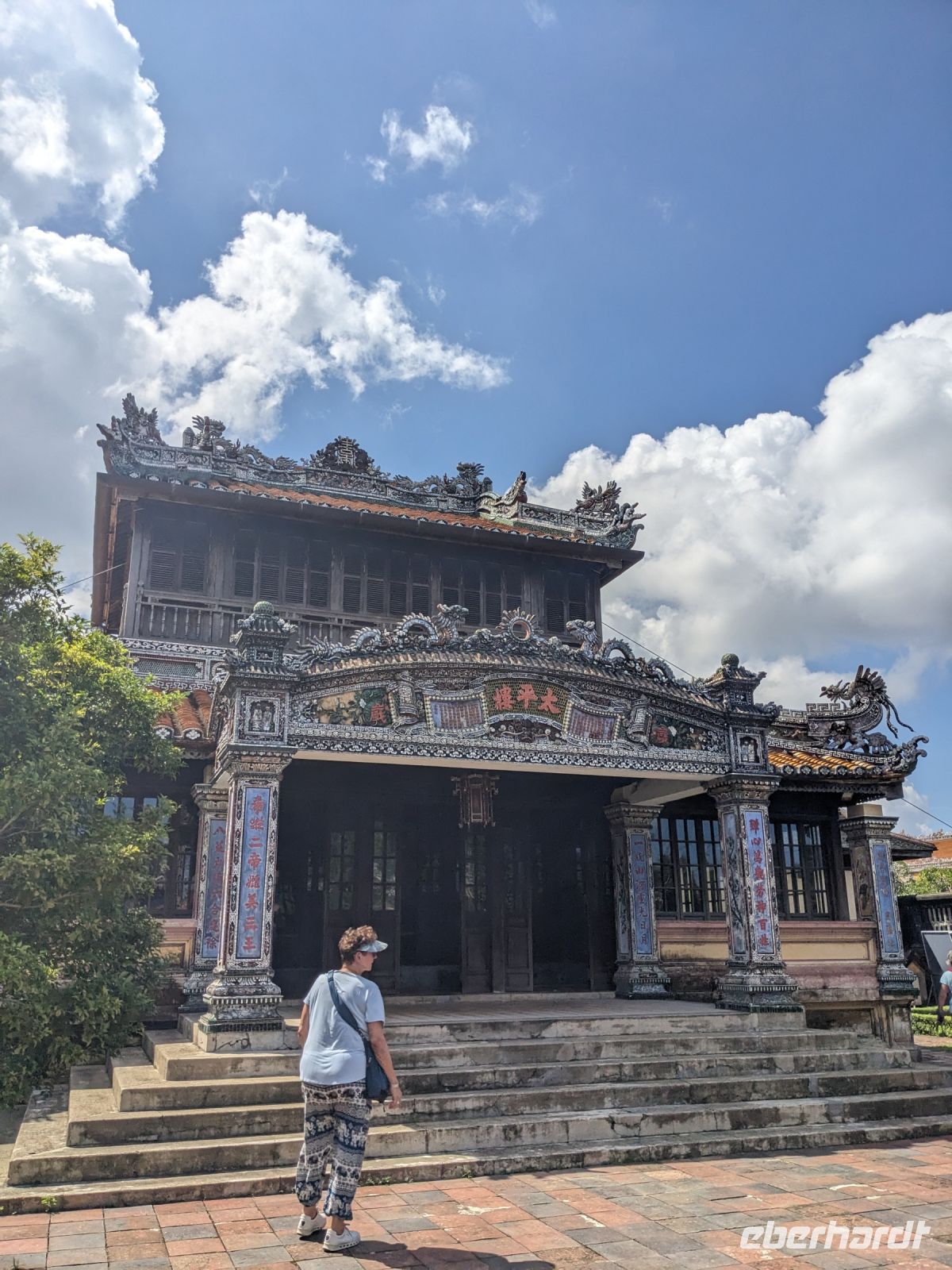 Auf dem Weg zum Wolkenpass legten wir noch einen Zwischenstopp am Strand von Lang Co ein - dort war es sehr paradiesisch und einige von uns wagten sich auch mit den Füßen in das angenehm erfrischende Wasser. Die Anblicke bei der Überfahrt des Wolkenpasses konnten sich auch sehen lassen. Es waren zudem Bahnschienen auszumachen und später rauschte ein Zug an uns vorbei - im Hintergrund eine idyllische Bucht. Angekommen in Hue besuchten wir zunächst die Thien-Mu Pagode, eine schöne Anlage inmitten der Stadt. Anschließend machten wir, ganz nach meinem Motto: Was wäre ein Besuch eines neues Ortes ohne Bootsfahrt, eine kleine Tour mit einem Drachenboot über den Fluss. Dabei konnten wir schon unser morgiges Ziel, den Königspalast, erahnen. Schließlich brachte uns unser Bus von der Anlegestelle zum naheliegenden Hotel. Zum Abendessen besuchten wir ein sehr gutes Restaurant, welches seine Speisen auf künstlerische Art und Weise servierte.