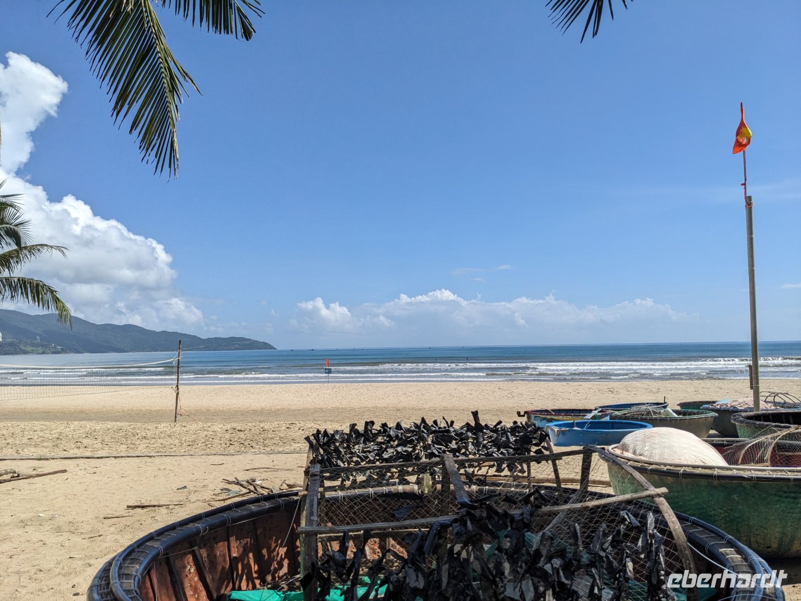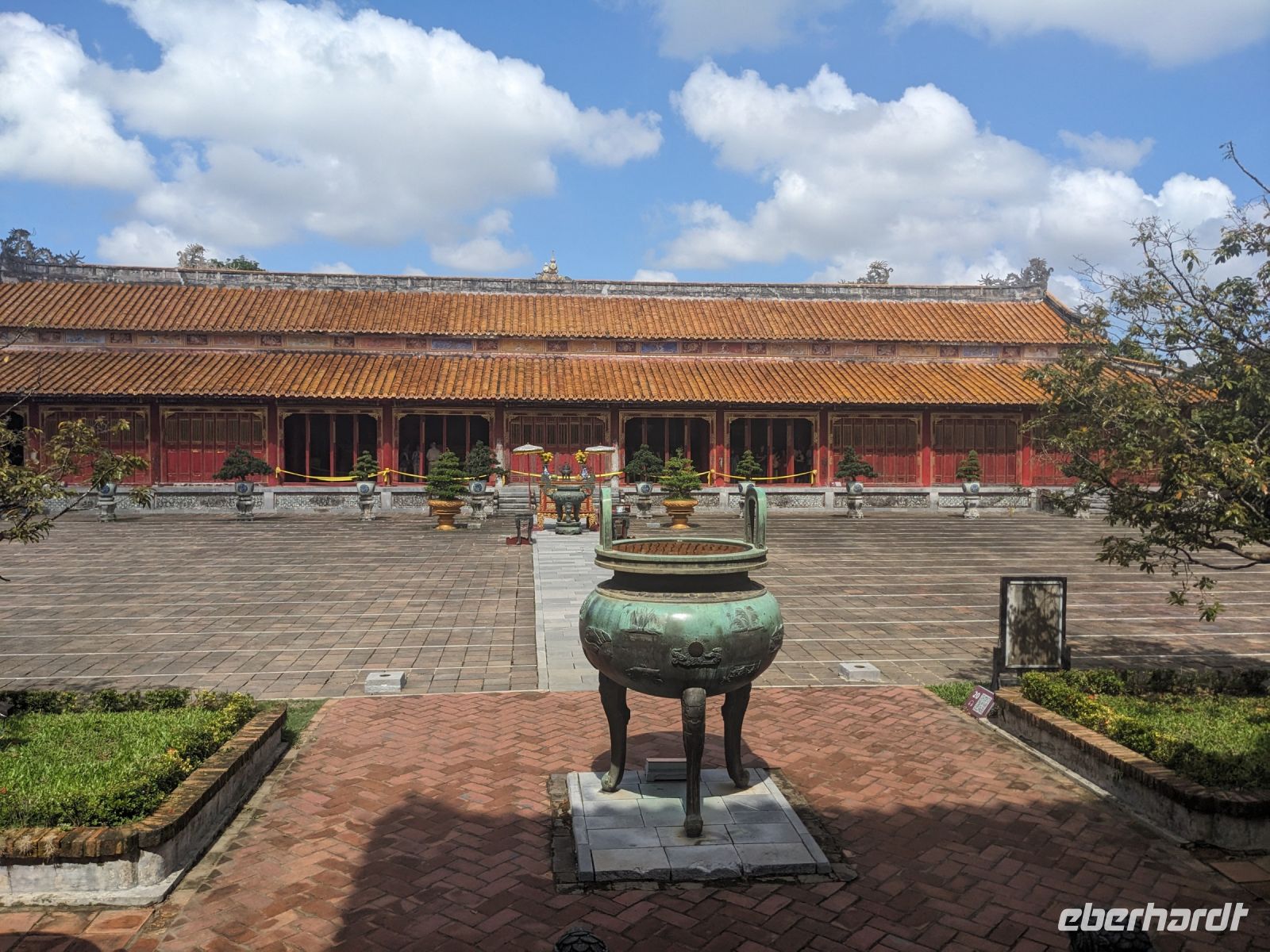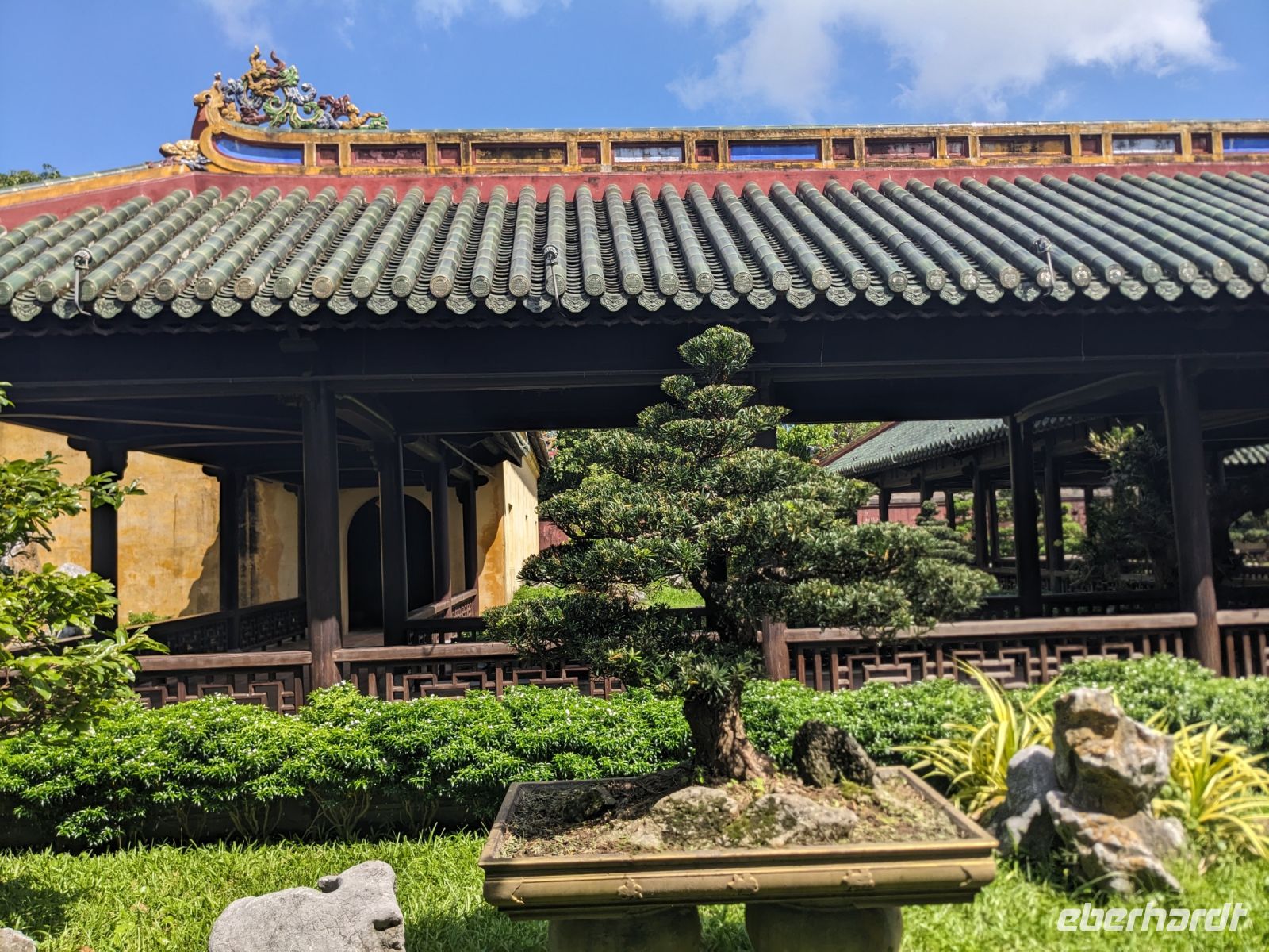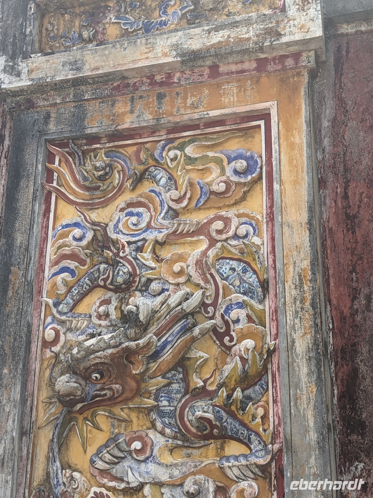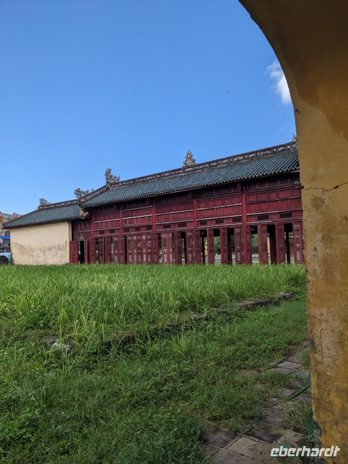 Auf dem Weg zum Wolkenpass legten wir noch einen Zwischenstopp am Strand von Lang Co ein - dort war es sehr paradiesisch und einige von uns wagten sich auch mit den Füßen in das angenehm erfrischende Wasser. Die Anblicke bei der Überfahrt des Wolkenpasses konnten sich auch sehen lassen. Es waren zudem Bahnschienen auszumachen und später rauschte ein Zug an uns vorbei - im Hintergrund eine idyllische Bucht. Angekommen in Hue besuchten wir zunächst die Thien-Mu Pagode, eine schöne Anlage inmitten der Stadt. Anschließend machten wir, ganz nach meinem Motto: Was wäre ein Besuch eines neues Ortes ohne Bootsfahrt, eine kleine Tour mit einem Drachenboot über den Fluss. Dabei konnten wir schon unser morgiges Ziel, den Königspalast, erahnen. Schließlich brachte uns unser Bus von der Anlegestelle zum naheliegenden Hotel. Zum Abendessen besuchten wir ein sehr gutes Restaurant, welches seine Speisen auf künstlerische Art und Weise servierte.