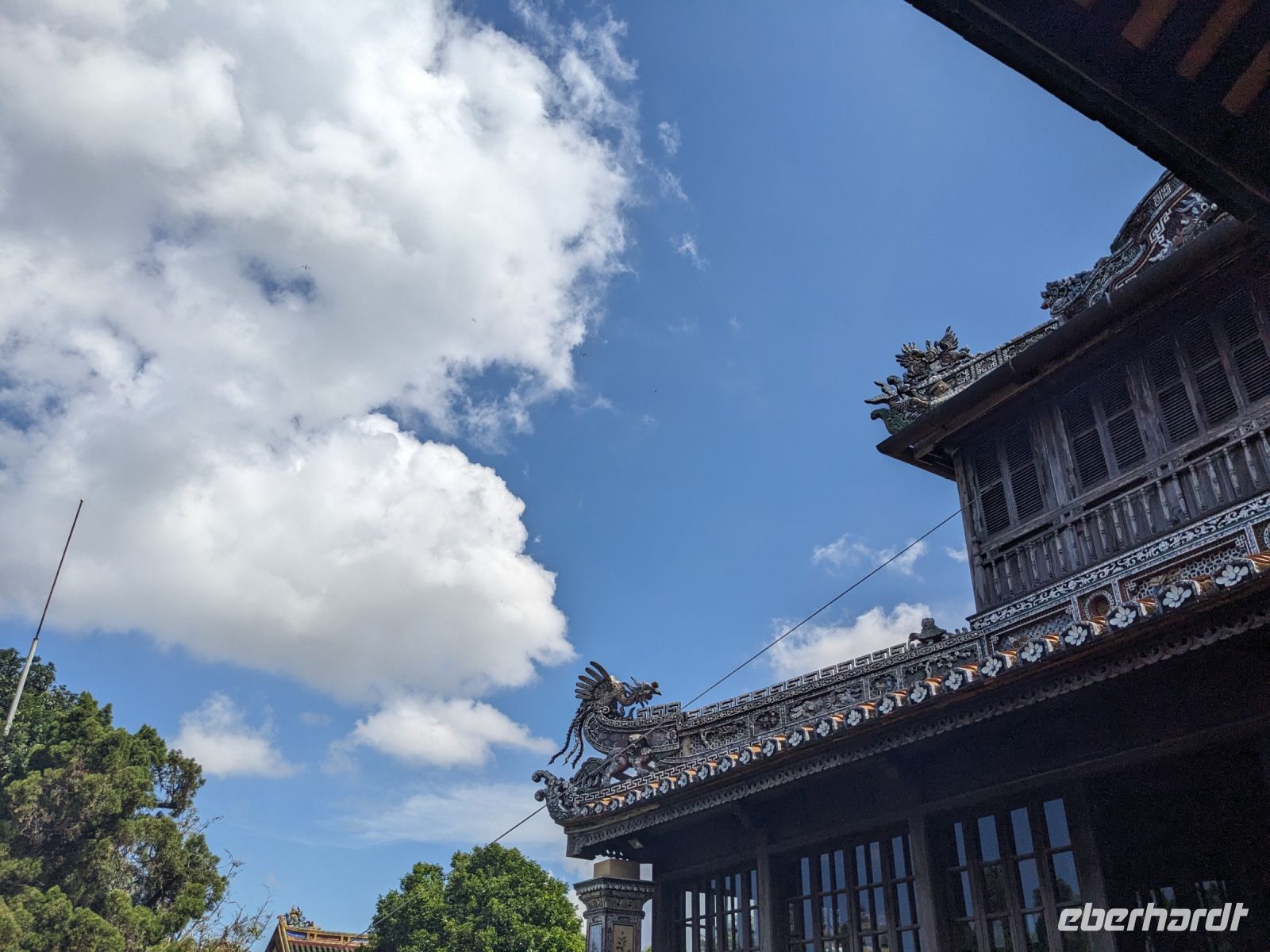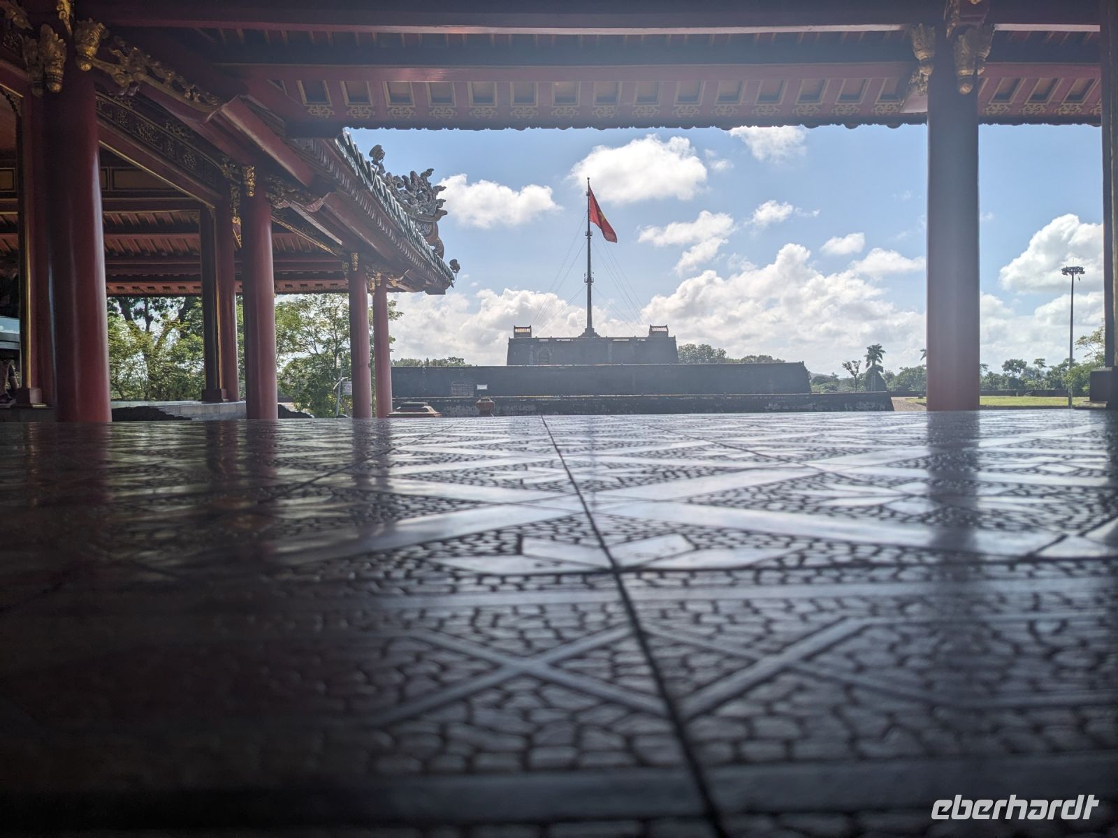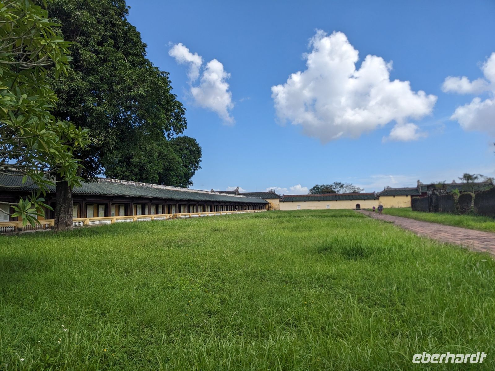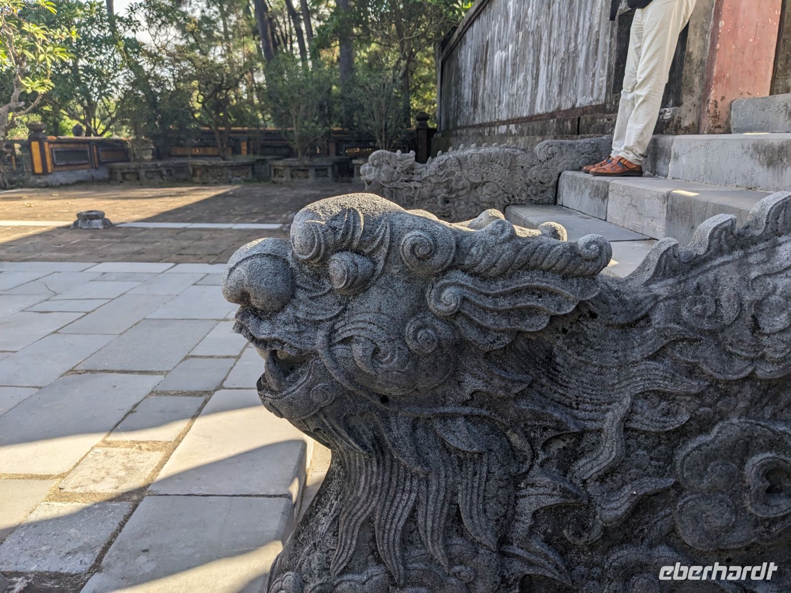 Auf dem Weg zum Wolkenpass legten wir noch einen Zwischenstopp am Strand von Lang Co ein - dort war es sehr paradiesisch und einige von uns wagten sich auch mit den Füßen in das angenehm erfrischende Wasser. Die Anblicke bei der Überfahrt des Wolkenpasses konnten sich auch sehen lassen. Es waren zudem Bahnschienen auszumachen und später rauschte ein Zug an uns vorbei - im Hintergrund eine idyllische Bucht. Angekommen in Hue besuchten wir zunächst die Thien-Mu Pagode, eine schöne Anlage inmitten der Stadt. Anschließend machten wir, ganz nach meinem Motto: Was wäre ein Besuch eines neues Ortes ohne Bootsfahrt, eine kleine Tour mit einem Drachenboot über den Fluss. Dabei konnten wir schon unser morgiges Ziel, den Königspalast, erahnen. Schließlich brachte uns unser Bus von der Anlegestelle zum naheliegenden Hotel. Zum Abendessen besuchten wir ein sehr gutes Restaurant, welches seine Speisen auf künstlerische Art und Weise servierte.