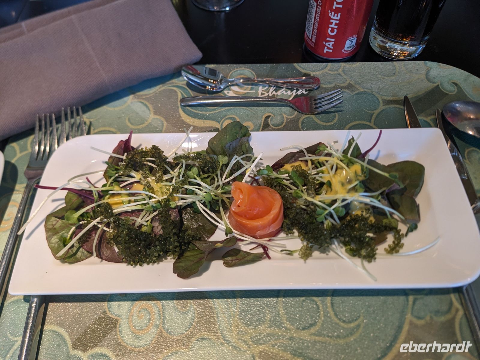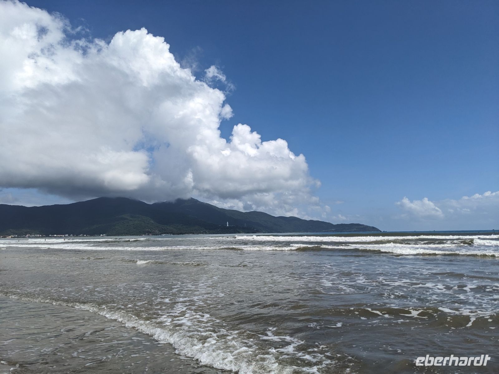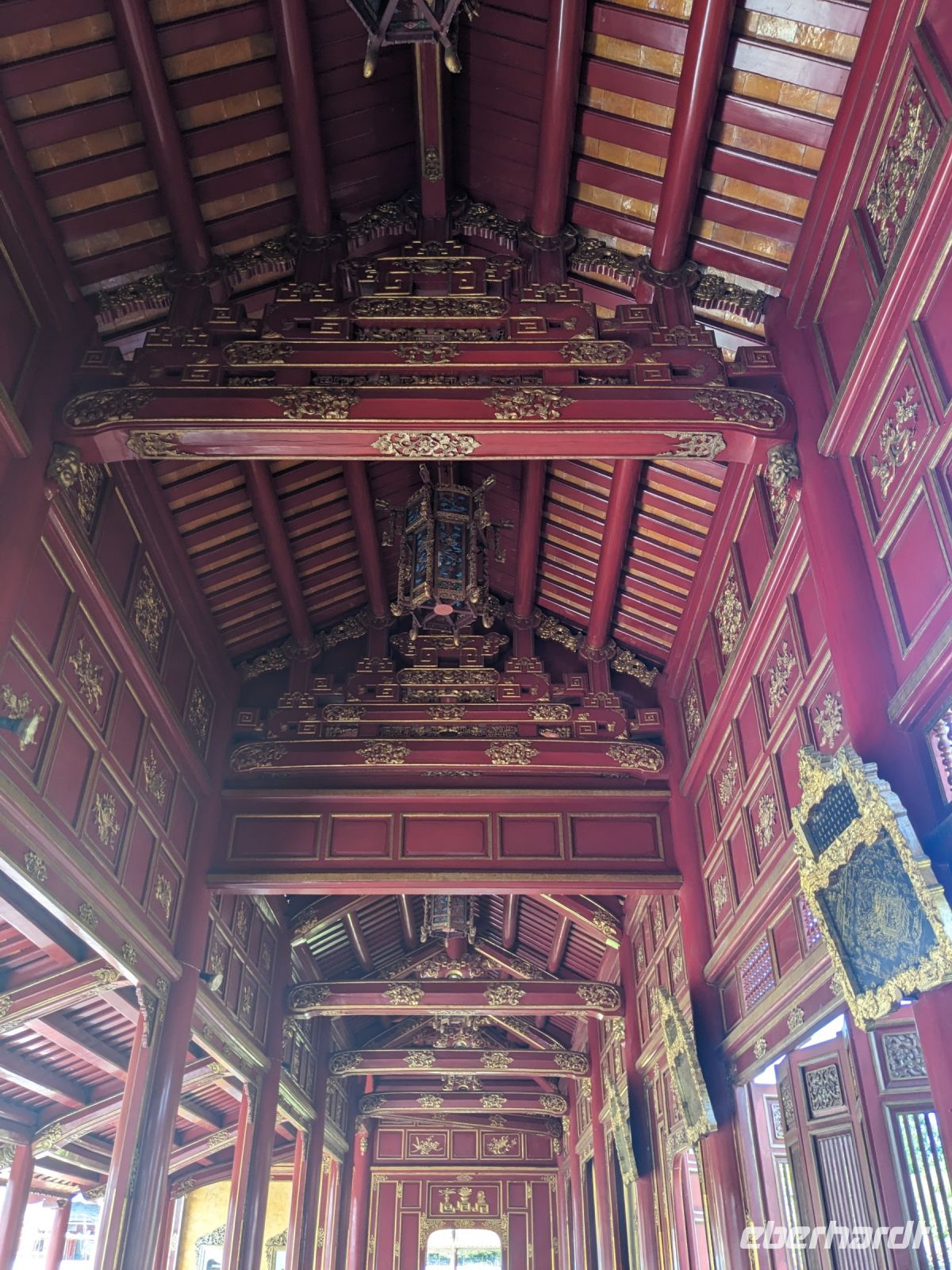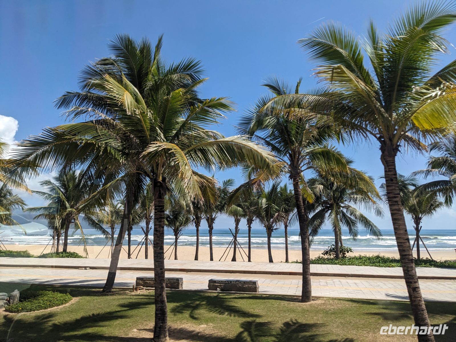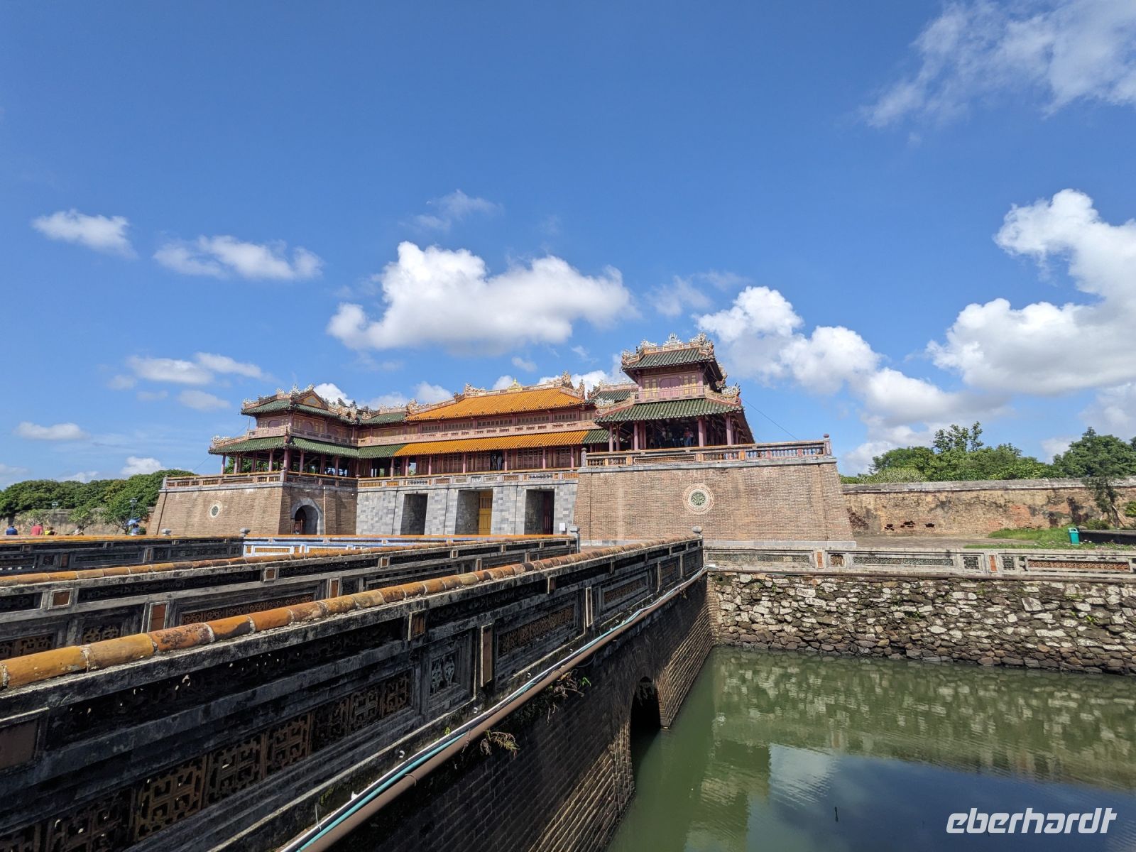 Auf dem Weg zum Wolkenpass legten wir noch einen Zwischenstopp am Strand von Lang Co ein - dort war es sehr paradiesisch und einige von uns wagten sich auch mit den Füßen in das angenehm erfrischende Wasser. Die Anblicke bei der Überfahrt des Wolkenpasses konnten sich auch sehen lassen. Es waren zudem Bahnschienen auszumachen und später rauschte ein Zug an uns vorbei - im Hintergrund eine idyllische Bucht. Angekommen in Hue besuchten wir zunächst die Thien-Mu Pagode, eine schöne Anlage inmitten der Stadt. Anschließend machten wir, ganz nach meinem Motto: Was wäre ein Besuch eines neues Ortes ohne Bootsfahrt, eine kleine Tour mit einem Drachenboot über den Fluss. Dabei konnten wir schon unser morgiges Ziel, den Königspalast, erahnen. Schließlich brachte uns unser Bus von der Anlegestelle zum naheliegenden Hotel. Zum Abendessen besuchten wir ein sehr gutes Restaurant, welches seine Speisen auf künstlerische Art und Weise servierte.