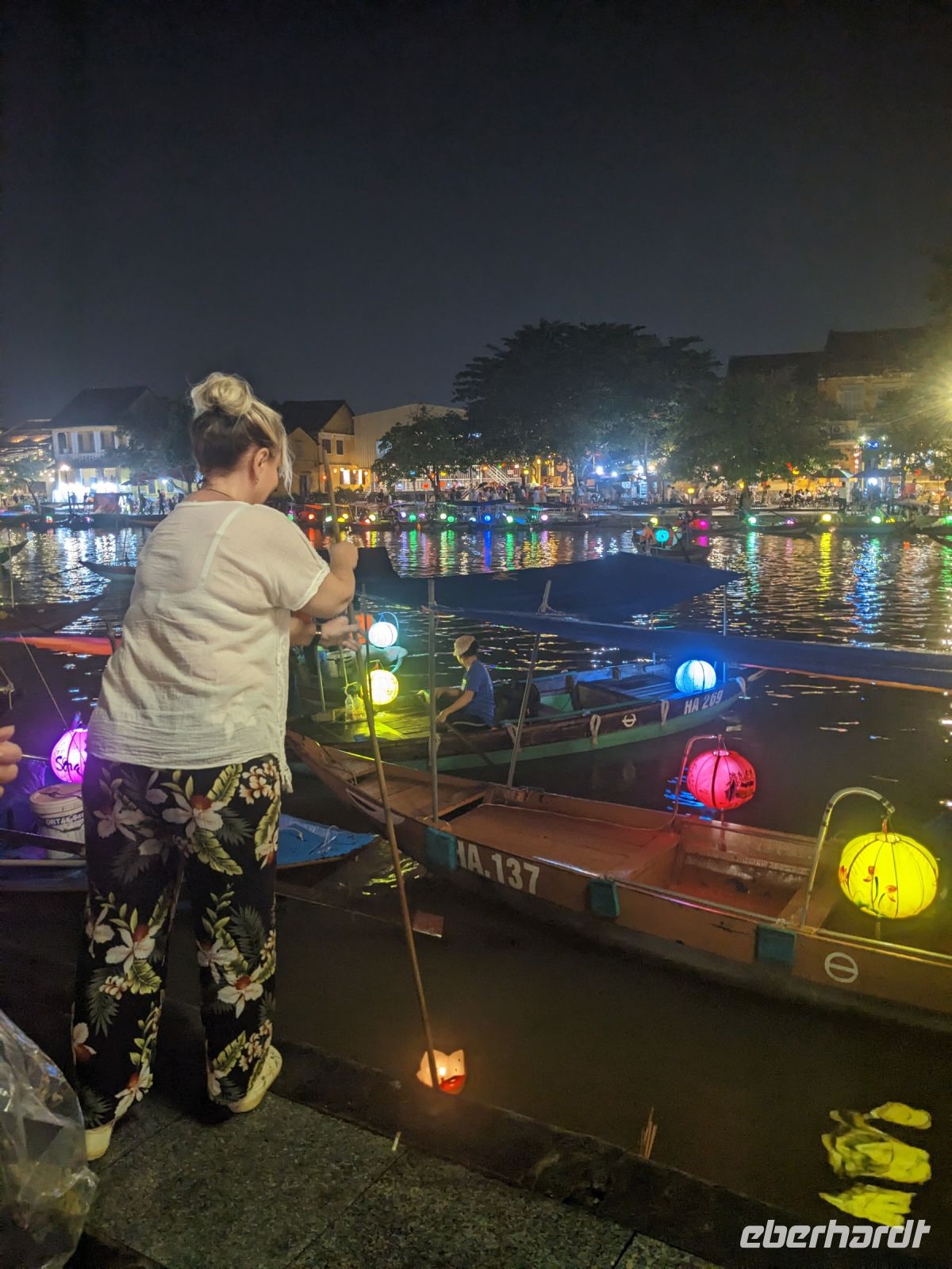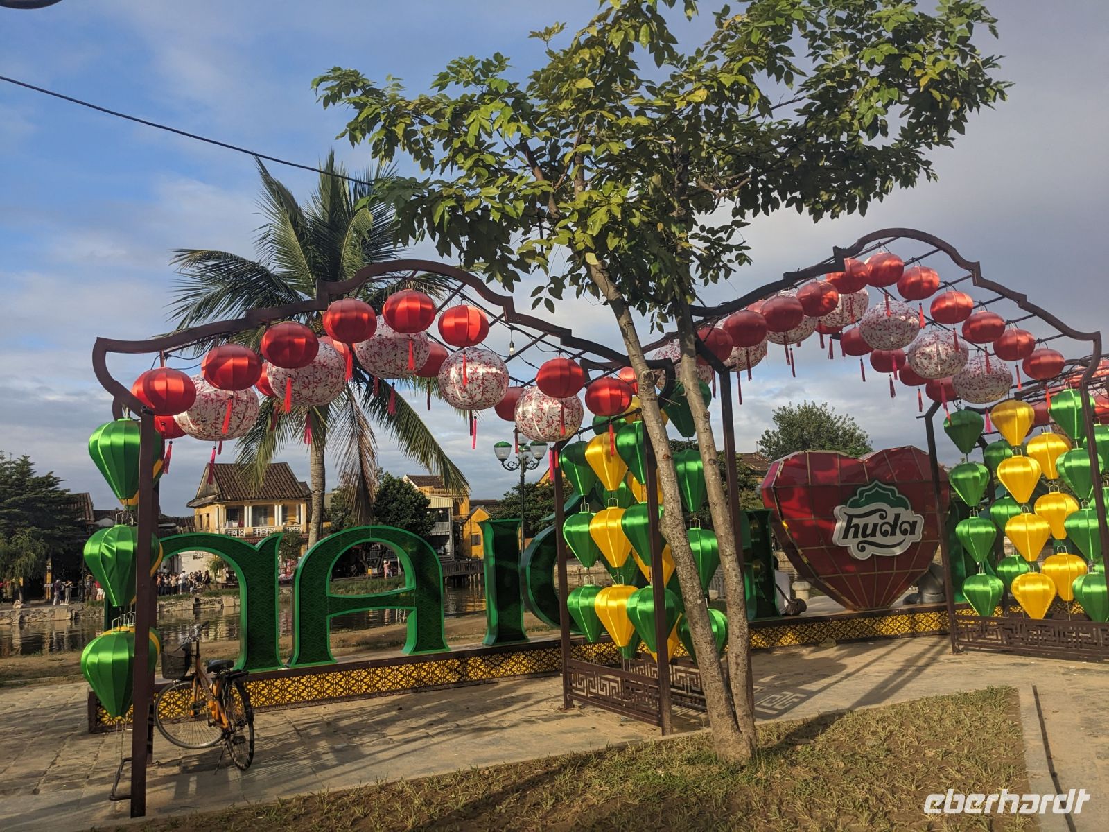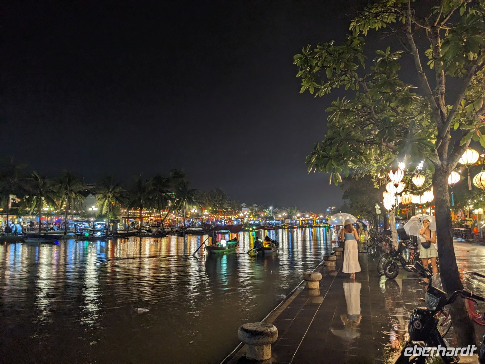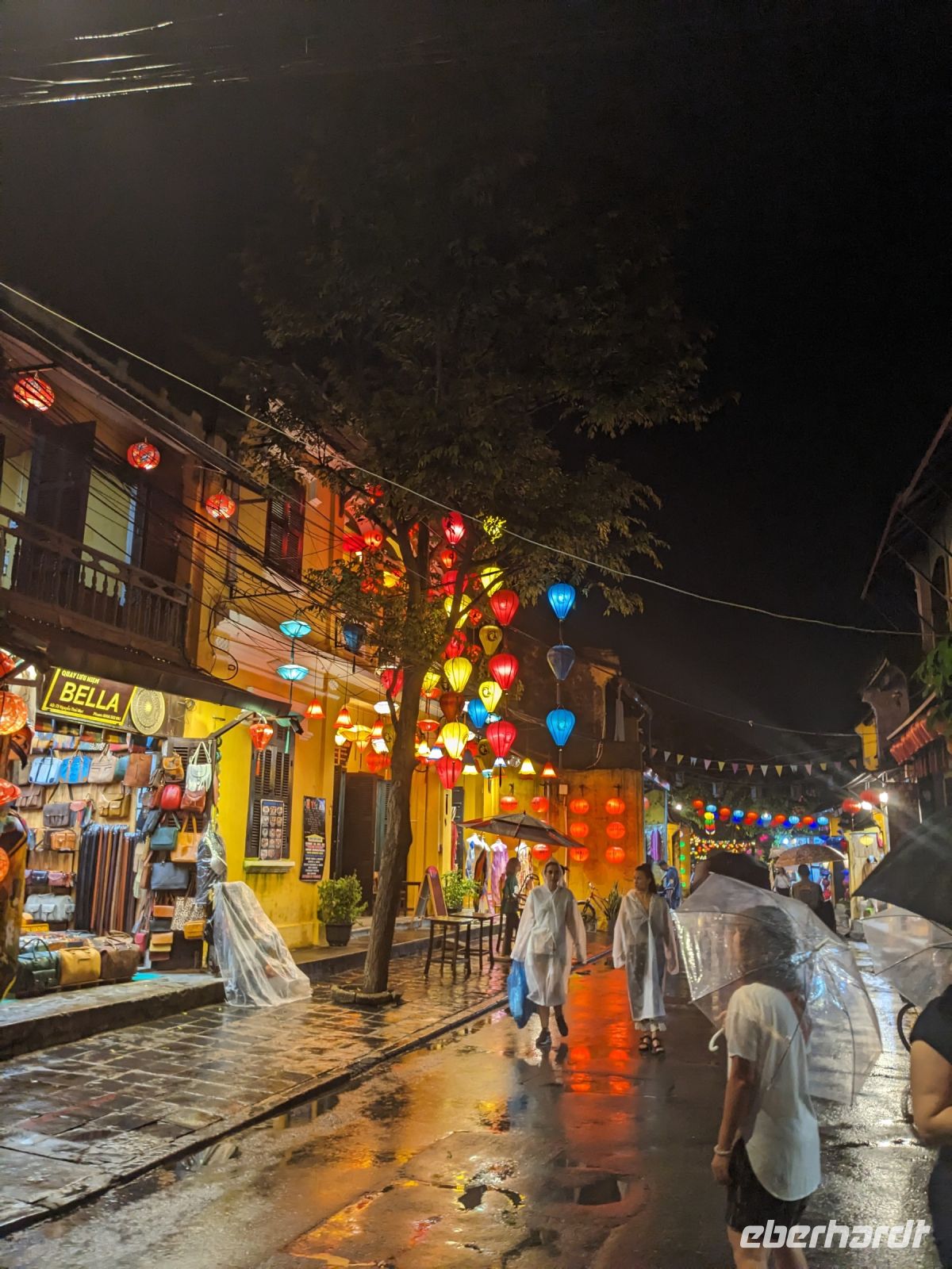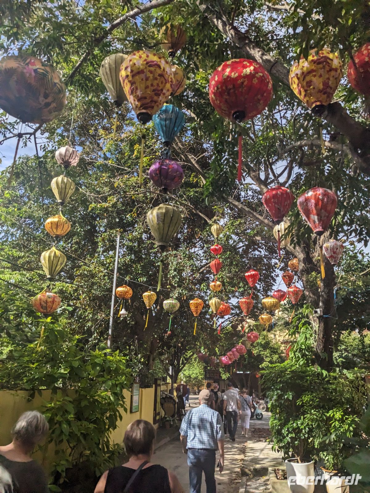 Am Vormittag erwartete uns ein besonderes Highlight: die Fahrt mit runden Bambusbooten. Ein sehr lustiges Unterfangen in dieser runden Halbkugel über den Fluss zu schippern. Aufgrund der starken Sonneneinstrahlung halfen uns die umsichtigen Bootsführer mit Hüten und Sonnenschirmen aus - so ließ es sich gut aushalten. Entertainer sorgten zu stimmungsvoller Musik mit beeindruckenden Kunststücken zwischendurch für Unterhaltung und wir entdeckten sogar in unseren Reihen einen wahren Gesangskünstler. Anschließend ging es zurück in die Innenstadt von Hoi An, wo wir einen Rundgang unternahmen, bei dem wir uns unter anderem ein traditionelles Wohnhaus, ein Museum, eine chinesische Versammlungshalle und eine Seidenmanufaktur anschauten. Die Stadt ist insgesamt sehr schön hergerichtet und wir konnten schon zahlreiche Lampions erspähen. Wie es hier wohl abends aussieht? Nach dem Rundgang hatten wir noch etwas Freizeit. Manche nutzten die Zeit für eine Fahrt zum Strand, während andere noch durch die Stadt zogen oder sich im Hotel ausruhten. Zum Abendessen trafen wir uns dann wieder - hier kamen unsere Regencapes und -jacken zum Einsatz, denn eine regelrechte Sintflut prasselte auf uns herab. Doch zum Glück hörte es dann pünktlich für unseren abendlichen Spaziergang wieder auf. Mit einem Teil der Gruppe zogen wir noch ein bisschen durch die Straßen, vor allem auf der Suche nach einem Lampion zum Mitnehmen für Zuhause. Und auch meine vorherige Frage klärte sich hier: Abends hatte die Stadt nochmal ein ganz besonderes Flair durch die vielen schönen Lichter in den Baumwipfeln - eine tolle Atmosphäre.