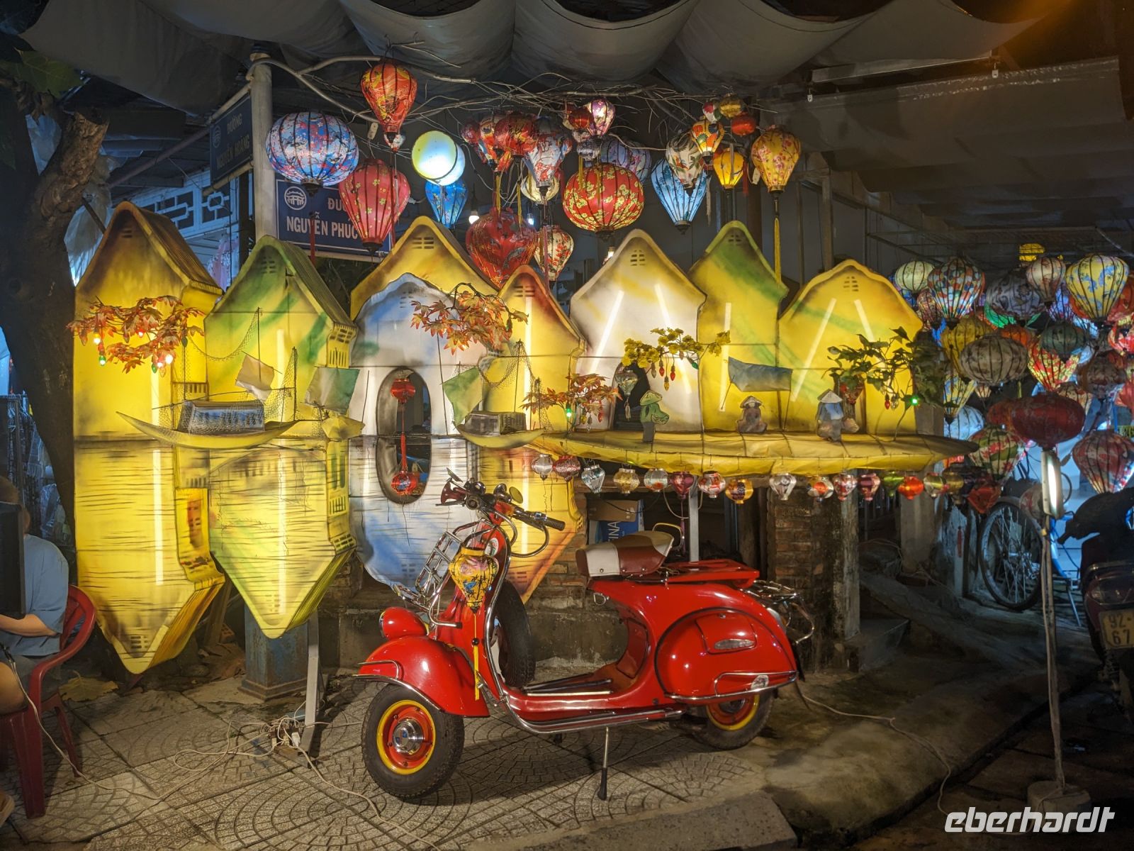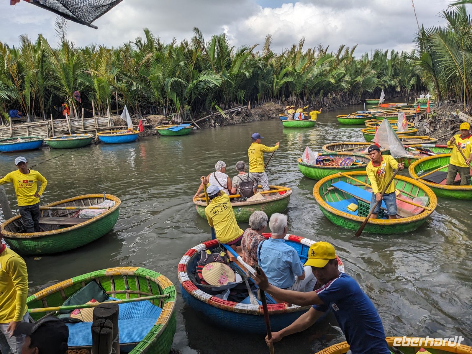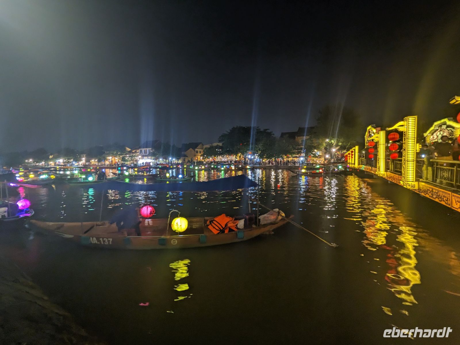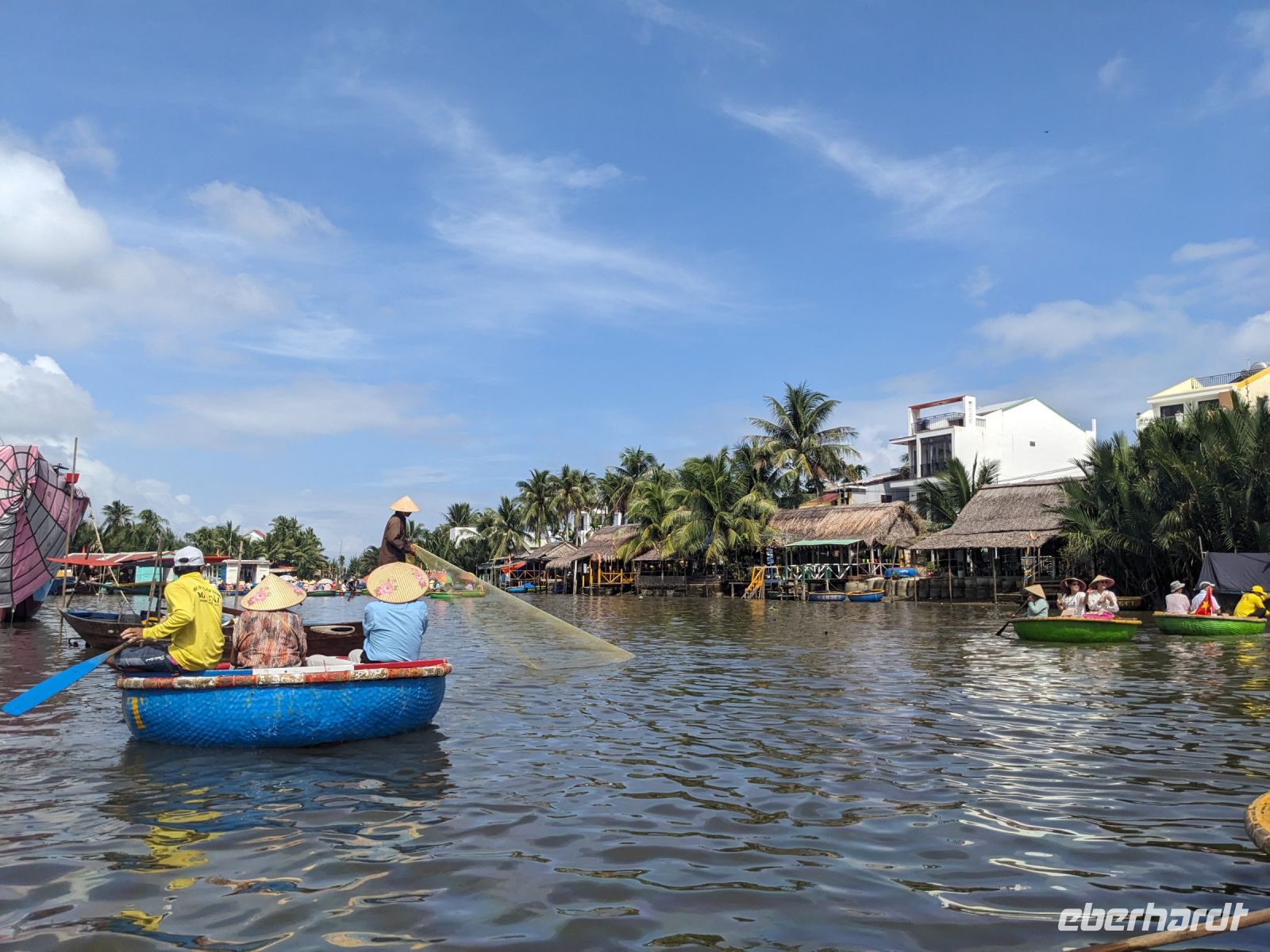 Am Vormittag erwartete uns ein besonderes Highlight: die Fahrt mit runden Bambusbooten. Ein sehr lustiges Unterfangen in dieser runden Halbkugel über den Fluss zu schippern. Aufgrund der starken Sonneneinstrahlung halfen uns die umsichtigen Bootsführer mit Hüten und Sonnenschirmen aus - so ließ es sich gut aushalten. Entertainer sorgten zu stimmungsvoller Musik mit beeindruckenden Kunststücken zwischendurch für Unterhaltung und wir entdeckten sogar in unseren Reihen einen wahren Gesangskünstler. Anschließend ging es zurück in die Innenstadt von Hoi An, wo wir einen Rundgang unternahmen, bei dem wir uns unter anderem ein traditionelles Wohnhaus, ein Museum, eine chinesische Versammlungshalle und eine Seidenmanufaktur anschauten. Die Stadt ist insgesamt sehr schön hergerichtet und wir konnten schon zahlreiche Lampions erspähen. Wie es hier wohl abends aussieht? Nach dem Rundgang hatten wir noch etwas Freizeit. Manche nutzten die Zeit für eine Fahrt zum Strand, während andere noch durch die Stadt zogen oder sich im Hotel ausruhten. Zum Abendessen trafen wir uns dann wieder - hier kamen unsere Regencapes und -jacken zum Einsatz, denn eine regelrechte Sintflut prasselte auf uns herab. Doch zum Glück hörte es dann pünktlich für unseren abendlichen Spaziergang wieder auf. Mit einem Teil der Gruppe zogen wir noch ein bisschen durch die Straßen, vor allem auf der Suche nach einem Lampion zum Mitnehmen für Zuhause. Und auch meine vorherige Frage klärte sich hier: Abends hatte die Stadt nochmal ein ganz besonderes Flair durch die vielen schönen Lichter in den Baumwipfeln - eine tolle Atmosphäre.
