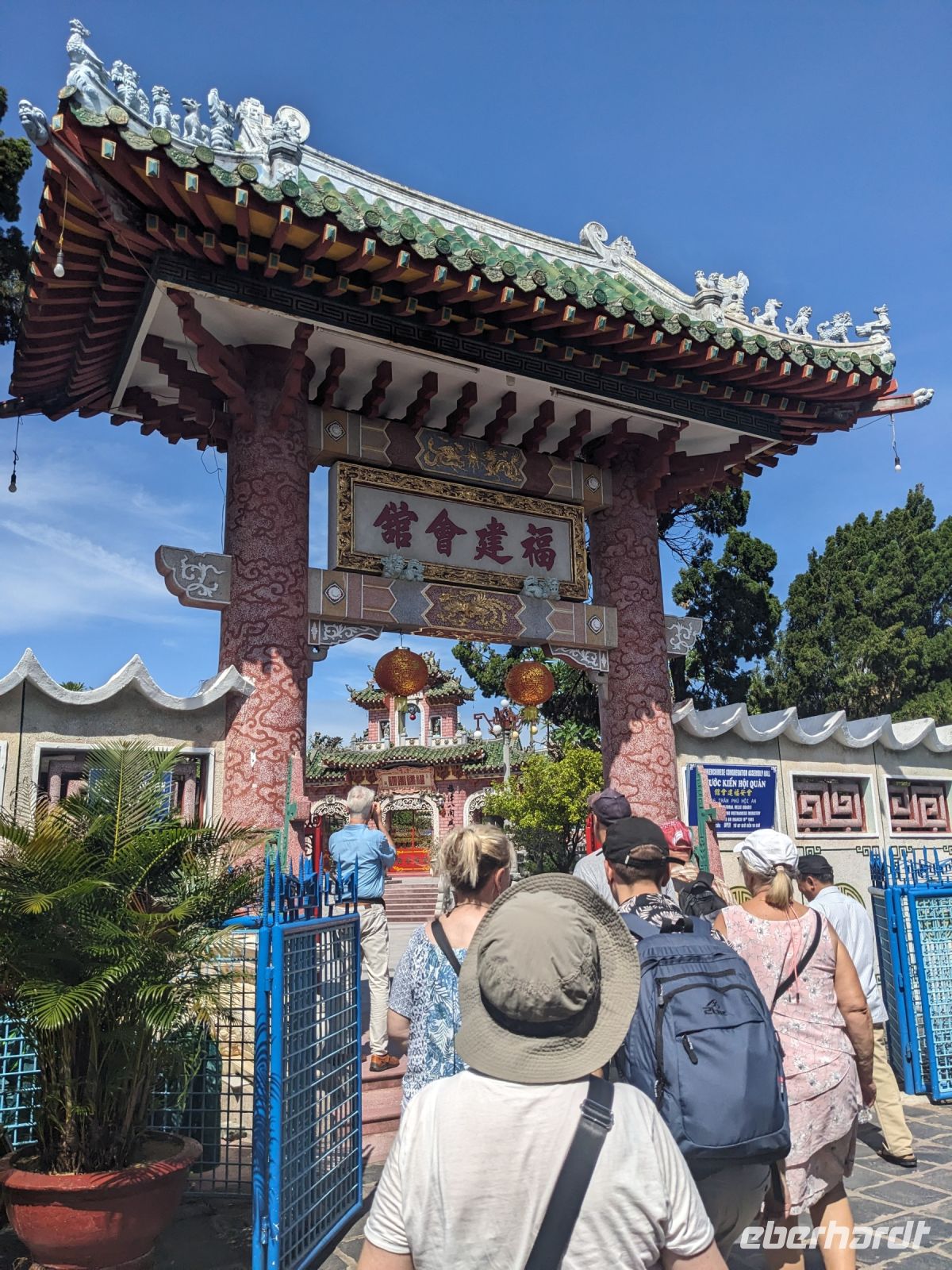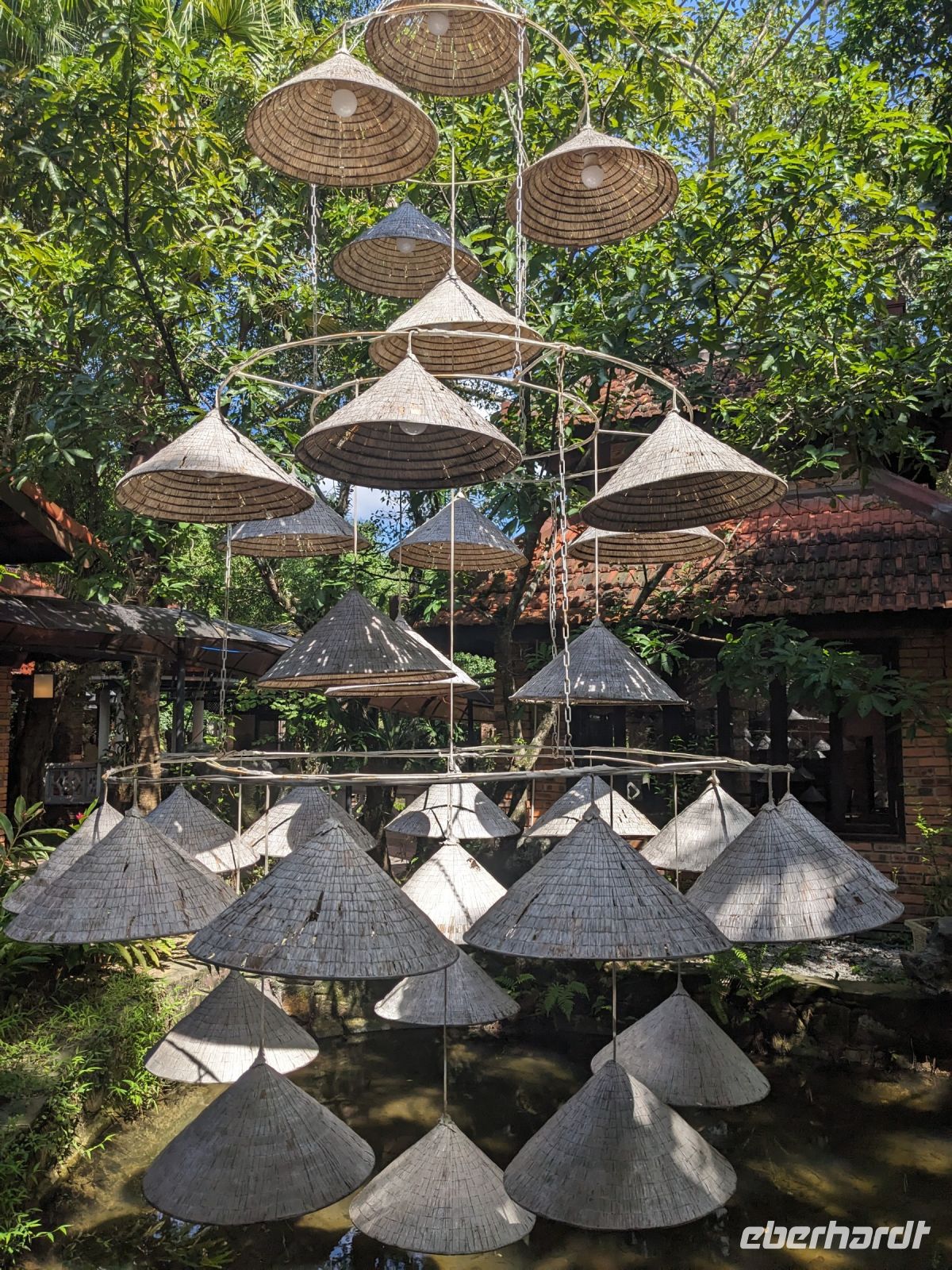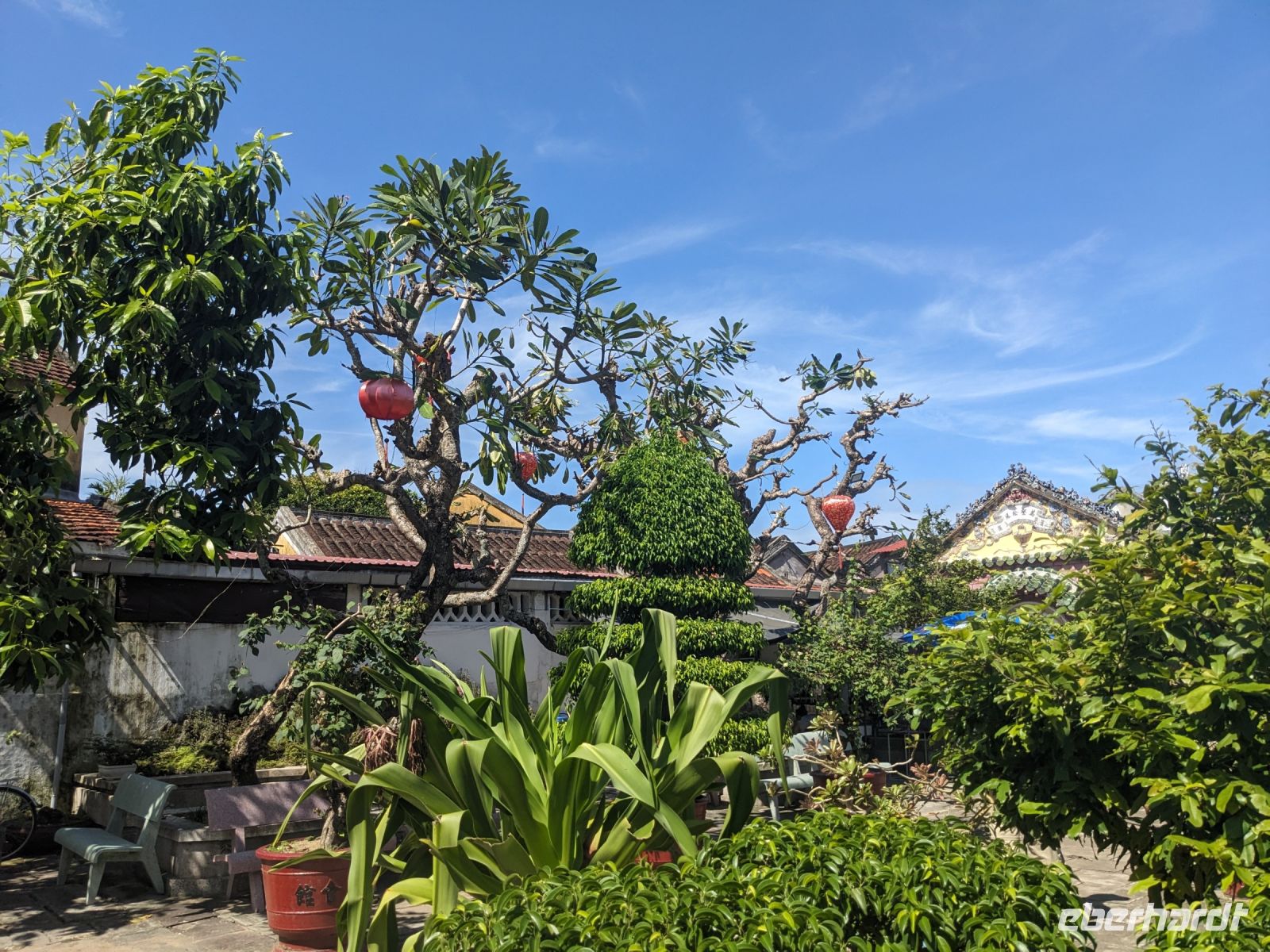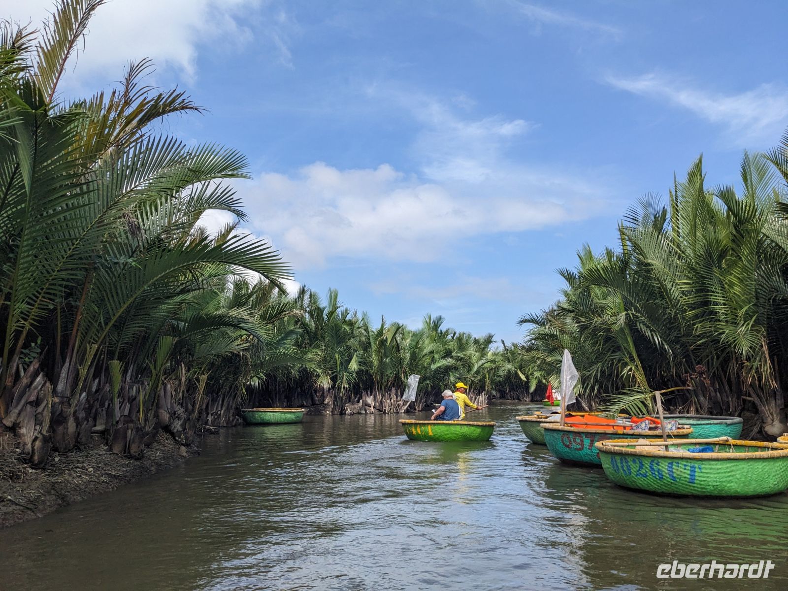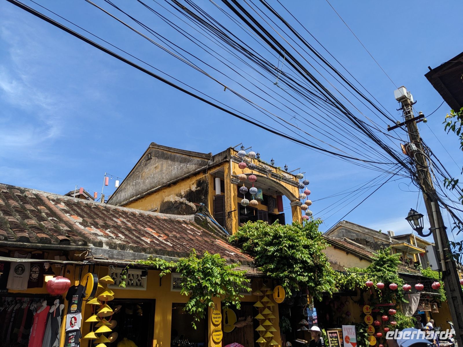 Am Vormittag erwartete uns ein besonderes Highlight: die Fahrt mit runden Bambusbooten. Ein sehr lustiges Unterfangen in dieser runden Halbkugel über den Fluss zu schippern. Aufgrund der starken Sonneneinstrahlung halfen uns die umsichtigen Bootsführer mit Hüten und Sonnenschirmen aus - so ließ es sich gut aushalten. Entertainer sorgten zu stimmungsvoller Musik mit beeindruckenden Kunststücken zwischendurch für Unterhaltung und wir entdeckten sogar in unseren Reihen einen wahren Gesangskünstler. Anschließend ging es zurück in die Innenstadt von Hoi An, wo wir einen Rundgang unternahmen, bei dem wir uns unter anderem ein traditionelles Wohnhaus, ein Museum, eine chinesische Versammlungshalle und eine Seidenmanufaktur anschauten. Die Stadt ist insgesamt sehr schön hergerichtet und wir konnten schon zahlreiche Lampions erspähen. Wie es hier wohl abends aussieht? Nach dem Rundgang hatten wir noch etwas Freizeit. Manche nutzten die Zeit für eine Fahrt zum Strand, während andere noch durch die Stadt zogen oder sich im Hotel ausruhten. Zum Abendessen trafen wir uns dann wieder - hier kamen unsere Regencapes und -jacken zum Einsatz, denn eine regelrechte Sintflut prasselte auf uns herab. Doch zum Glück hörte es dann pünktlich für unseren abendlichen Spaziergang wieder auf. Mit einem Teil der Gruppe zogen wir noch ein bisschen durch die Straßen, vor allem auf der Suche nach einem Lampion zum Mitnehmen für Zuhause. Und auch meine vorherige Frage klärte sich hier: Abends hatte die Stadt nochmal ein ganz besonderes Flair durch die vielen schönen Lichter in den Baumwipfeln - eine tolle Atmosphäre.