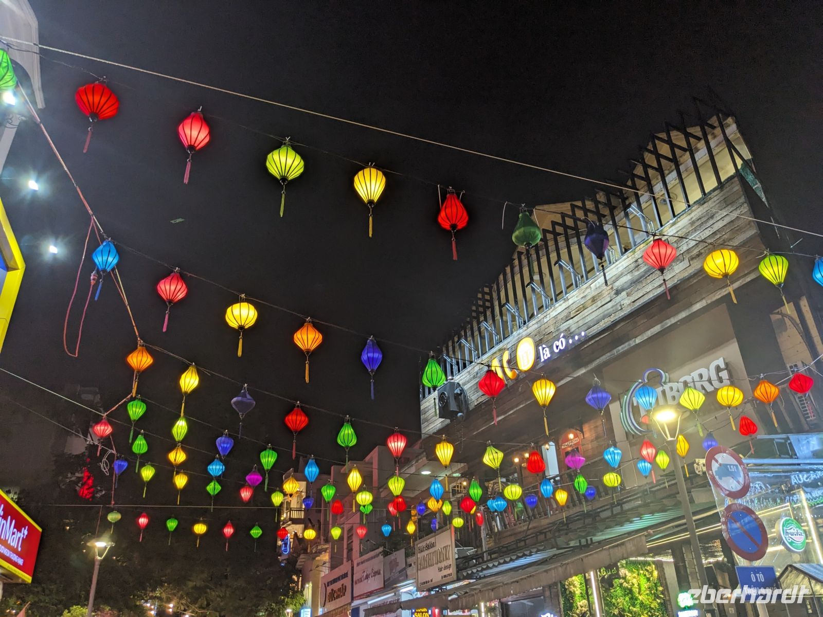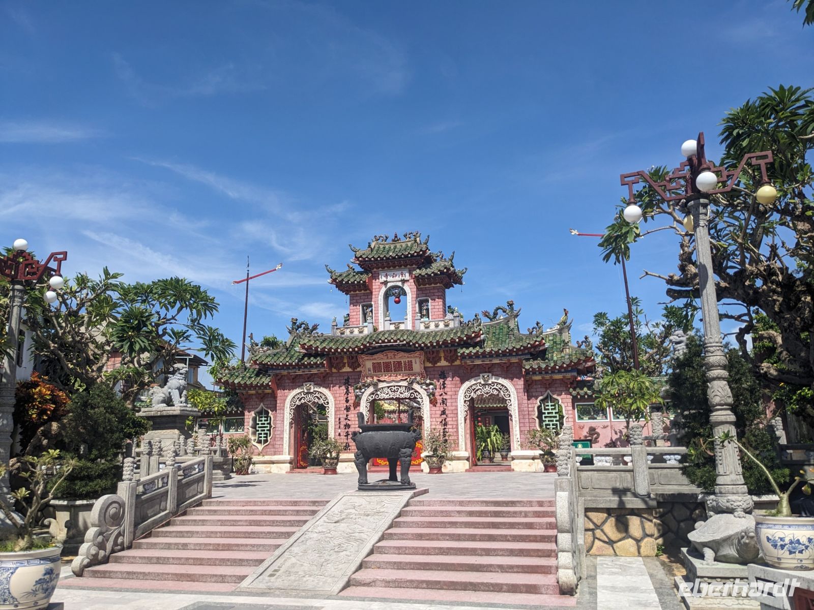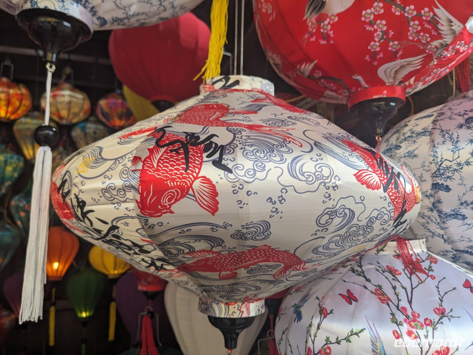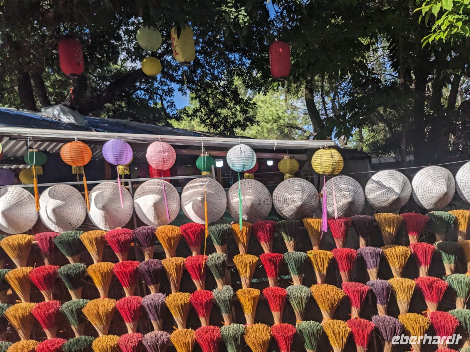 Am Vormittag erwartete uns ein besonderes Highlight: die Fahrt mit runden Bambusbooten. Ein sehr lustiges Unterfangen in dieser runden Halbkugel über den Fluss zu schippern. Aufgrund der starken Sonneneinstrahlung halfen uns die umsichtigen Bootsführer mit Hüten und Sonnenschirmen aus - so ließ es sich gut aushalten. Entertainer sorgten zu stimmungsvoller Musik mit beeindruckenden Kunststücken zwischendurch für Unterhaltung und wir entdeckten sogar in unseren Reihen einen wahren Gesangskünstler. Anschließend ging es zurück in die Innenstadt von Hoi An, wo wir einen Rundgang unternahmen, bei dem wir uns unter anderem ein traditionelles Wohnhaus, ein Museum, eine chinesische Versammlungshalle und eine Seidenmanufaktur anschauten. Die Stadt ist insgesamt sehr schön hergerichtet und wir konnten schon zahlreiche Lampions erspähen. Wie es hier wohl abends aussieht? Nach dem Rundgang hatten wir noch etwas Freizeit. Manche nutzten die Zeit für eine Fahrt zum Strand, während andere noch durch die Stadt zogen oder sich im Hotel ausruhten. Zum Abendessen trafen wir uns dann wieder - hier kamen unsere Regencapes und -jacken zum Einsatz, denn eine regelrechte Sintflut prasselte auf uns herab. Doch zum Glück hörte es dann pünktlich für unseren abendlichen Spaziergang wieder auf. Mit einem Teil der Gruppe zogen wir noch ein bisschen durch die Straßen, vor allem auf der Suche nach einem Lampion zum Mitnehmen für Zuhause. Und auch meine vorherige Frage klärte sich hier: Abends hatte die Stadt nochmal ein ganz besonderes Flair durch die vielen schönen Lichter in den Baumwipfeln - eine tolle Atmosphäre.