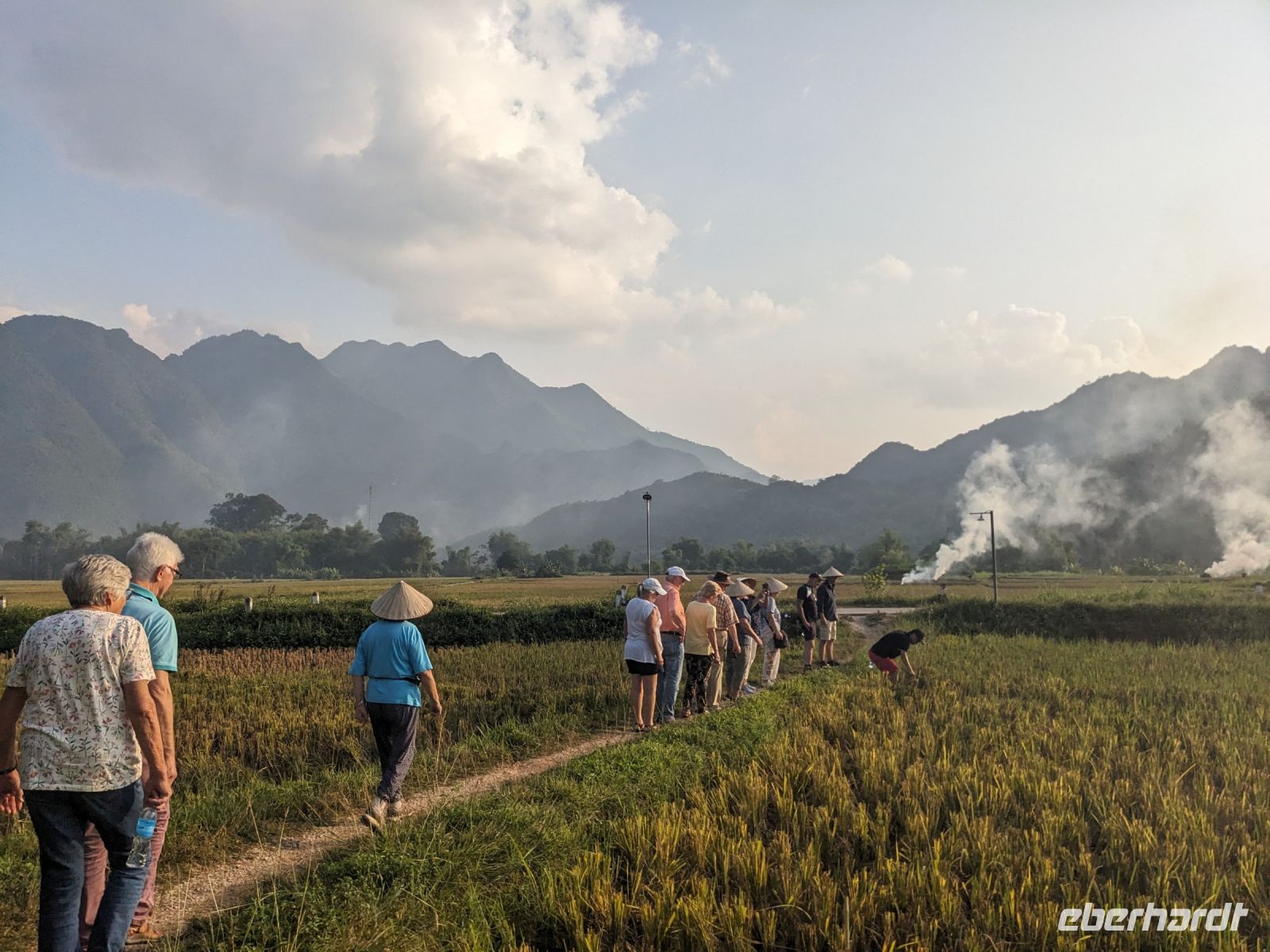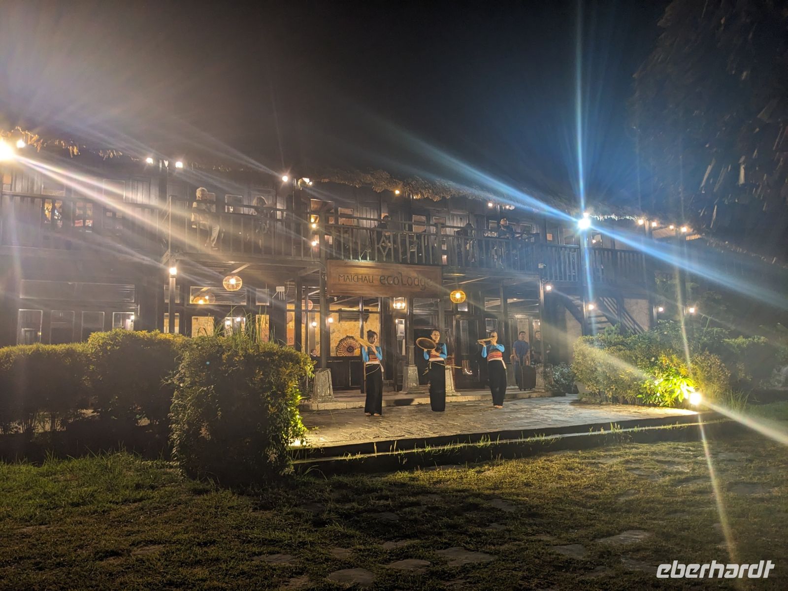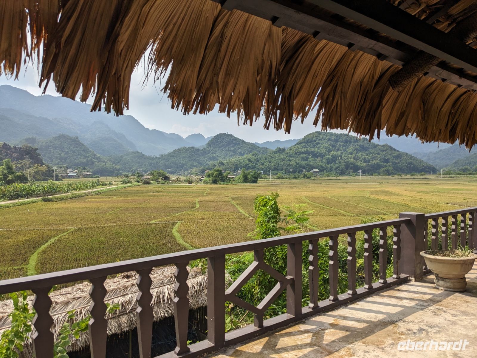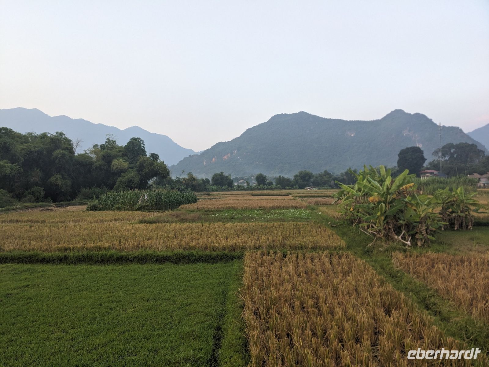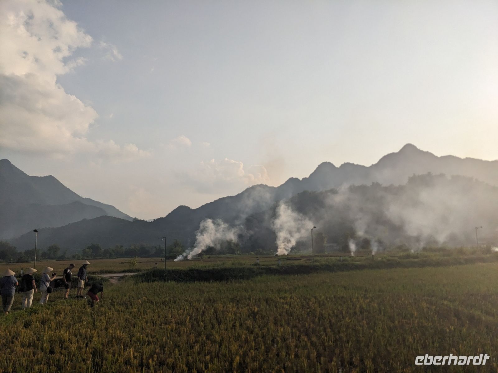 Zum Glück konnten wir heute morgen ein bisschen ausschlafen und uns noch etwas auf der Anlage umsehen, bevor es weiterging. Gut gestärkt von einem wirklich großen Frühstücksangebot starteten wir in den Tag. Unsere Rundreise führte uns in das Bergdorf Mai Chau. Die Ecolodge lag ganz idyllisch umgeben von Reisfeldern. Im Hintergrund ragten die Berge auf. Die Vögel sangen. Der Himmel war blau. Ein wahrhaft schöner Tag. Jeder von uns war in einem kleinen Bungalow untergebracht. Nach einer kurzen Verschnaufpause für ein Mittagessen, einen Sprung in den Pool oder ein kleines Schläfchen trafen wir uns erneut für einen Spaziergang entlang der Reisefelder und durch das Dorf. Dieses war wie ausgestorben. Viele Einwohner besuchten ein Fußballspiel - die Stimmung: ausgelassen. Dafür hatten wir das Dorf fast ganz für uns allein. Lang erzählte, dass es hier am Wochenende ganz schön voll werden würde - Glück gehabt! Wir kehrten schließlich noch in einer Bierstube ein und traten dann bei Dämmerlicht den Heimweg ein. Im Hotel erwartete uns dann ein leckeres Abendessen mit einer anschließenden Tanzvorführung. So fand der Abend einen schönen Ausklang.