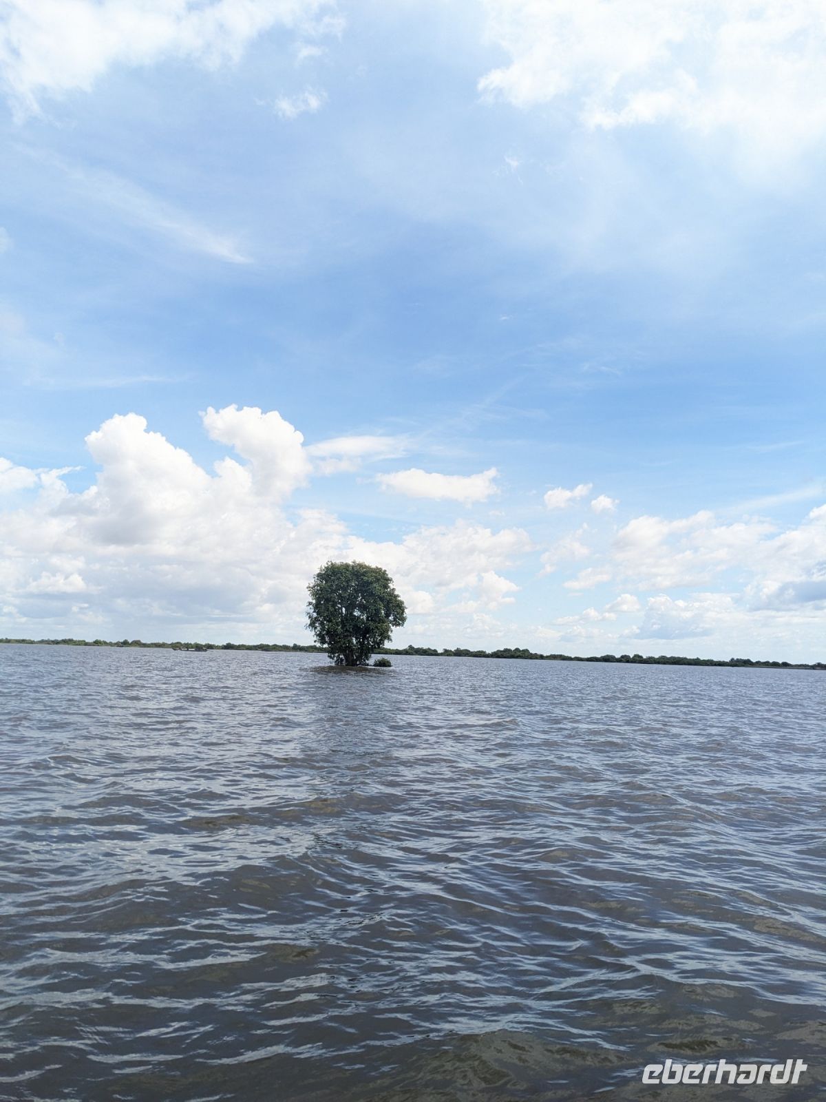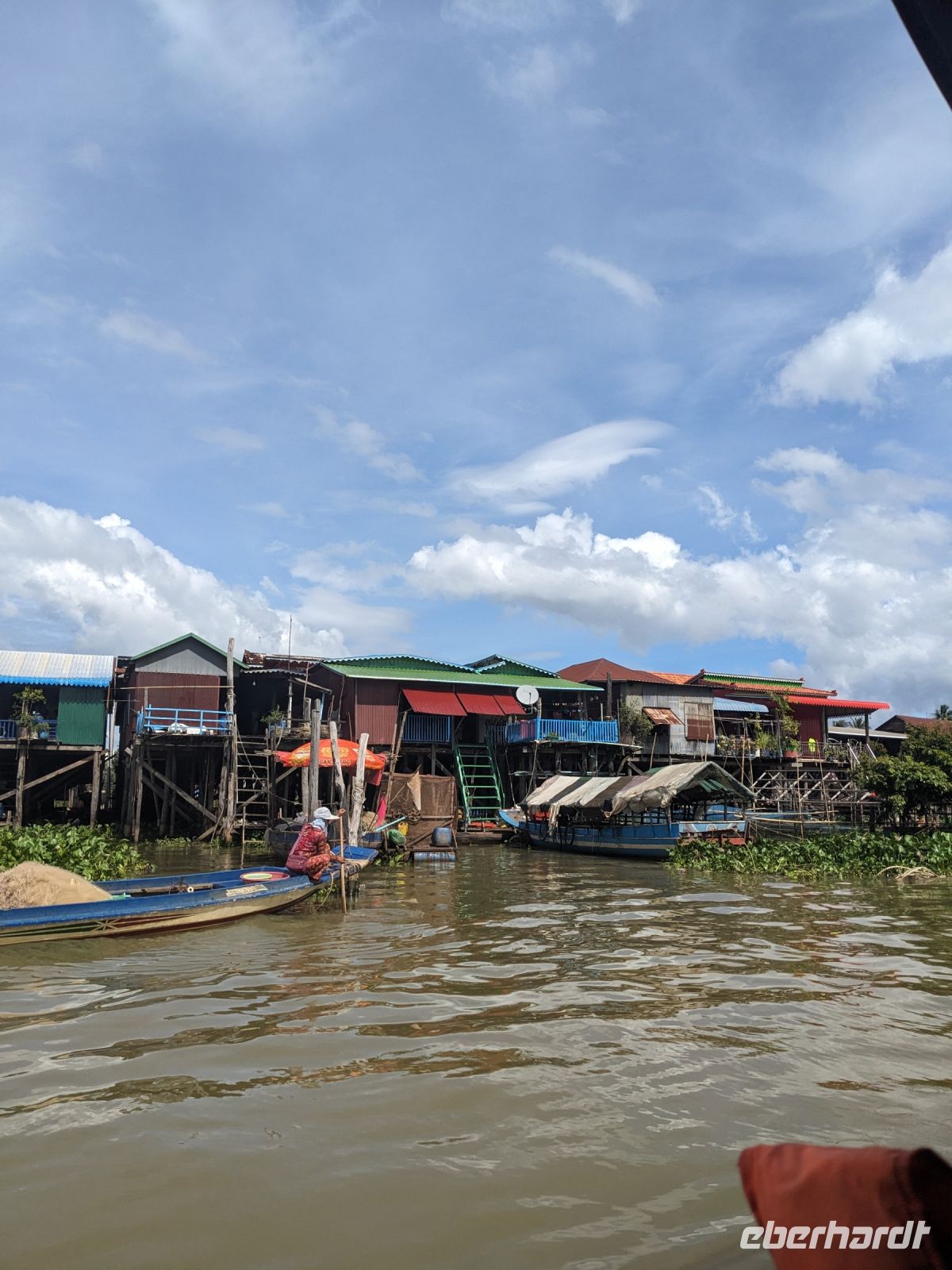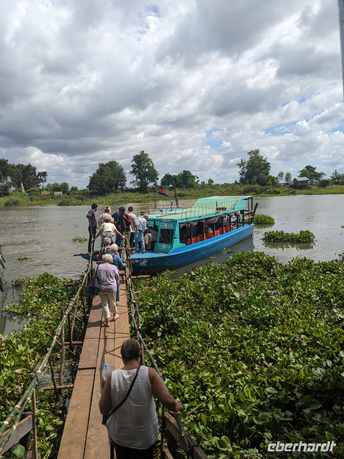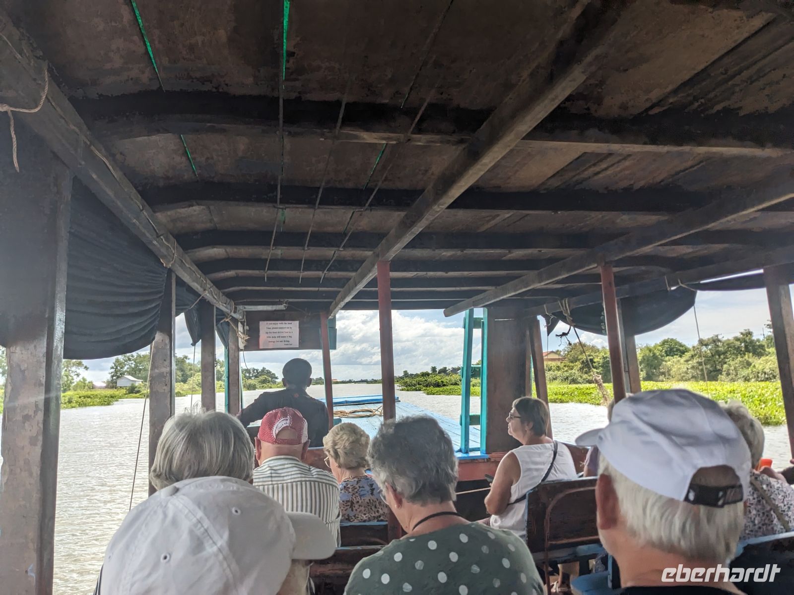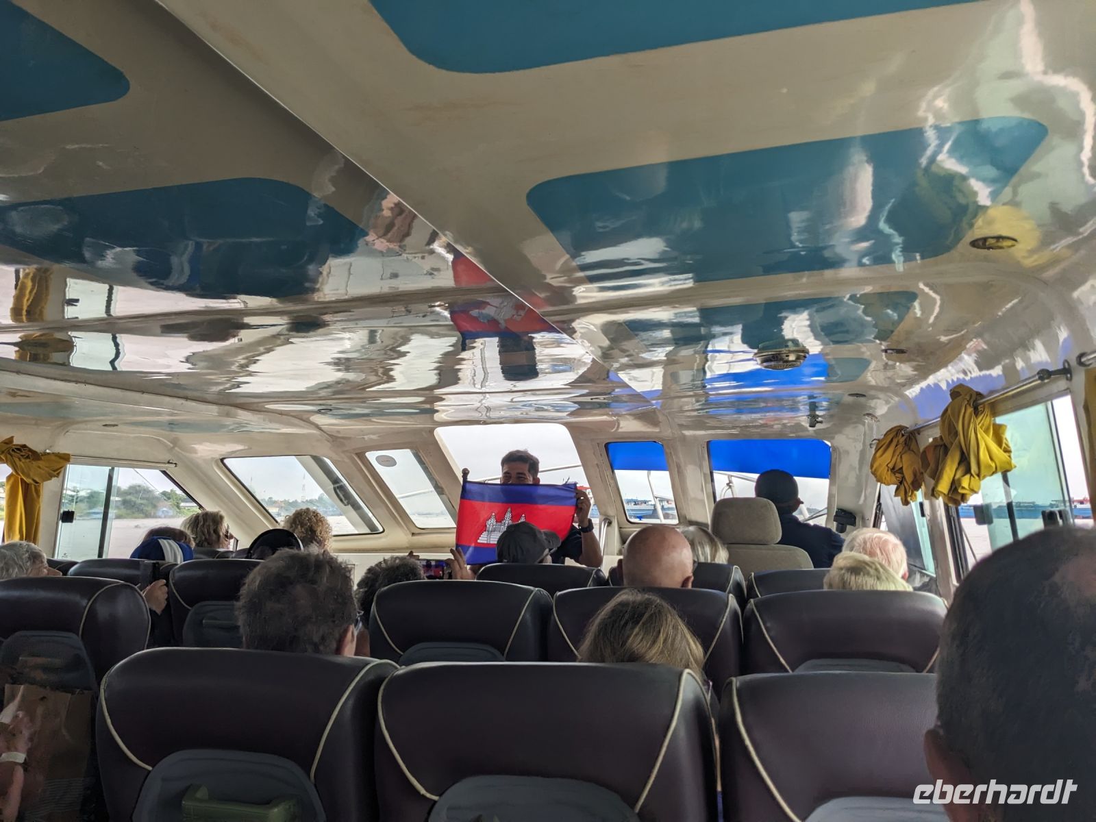 Nach einem letzten ausgiebigen Frühstück, genug Zeit zum Koffer packen und zur Nutzung der Annehmlichkeiten des Hotels fuhren wir dann los in Richtung des größten Binnensees Südostasiens, dem Tonle Sap - ein schöner Reiseabschluss mit zahlreichen Eindrücken. Denn bevor wir den eigentlichen See erreichten, durchfuhren wir zunächst ein Gebiet mit Stelzenhäusern, kleinen Inseln, auf denen beispielsweise Tempel gebaut waren und schließlich eröffnete sich uns der Blick in eine uneingeschränkte Weite. So weit wir auch blickten, es war kein Ende des Sees am Horizont zu sehen. Wieder zurück an der Anlegestelle war es mit dem Bus von dort nur ein kurzes Stück zum Flughafen von Siem Reap. Auf der Fahrt gab es von mir noch im Namen von Eberhardt TRAVEL einen kleinen Glücksbringer für zukünftige Reisen. Der Flughafen ist noch nicht mal zwei Monate alt gewesen zum, Zeitpunkt unseres Rückflugs und sehr eindrucksvoll gebaut. Alles hat ohne große Vorkommnisse funktioniert. Unser erstes Ziel war Ho Chi Minh Stadt und von dort ging es dann zurück in Richtung Frankfurt.