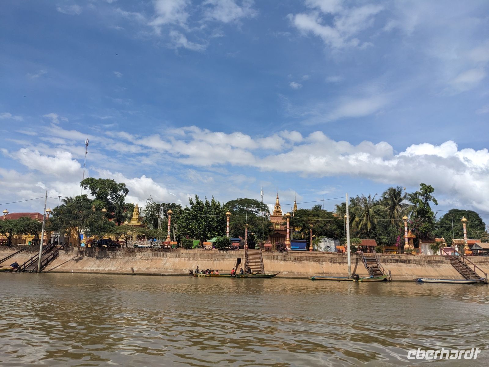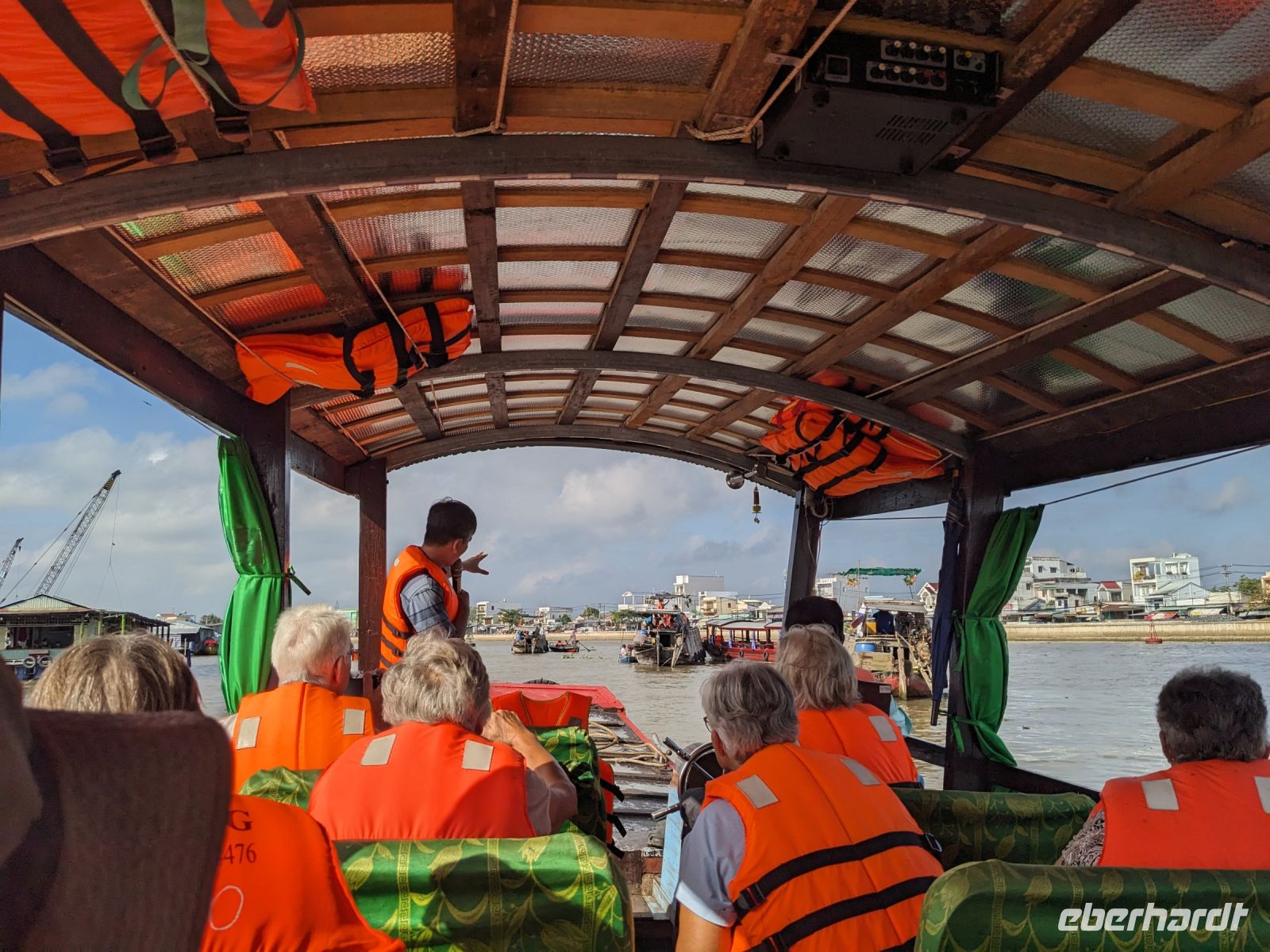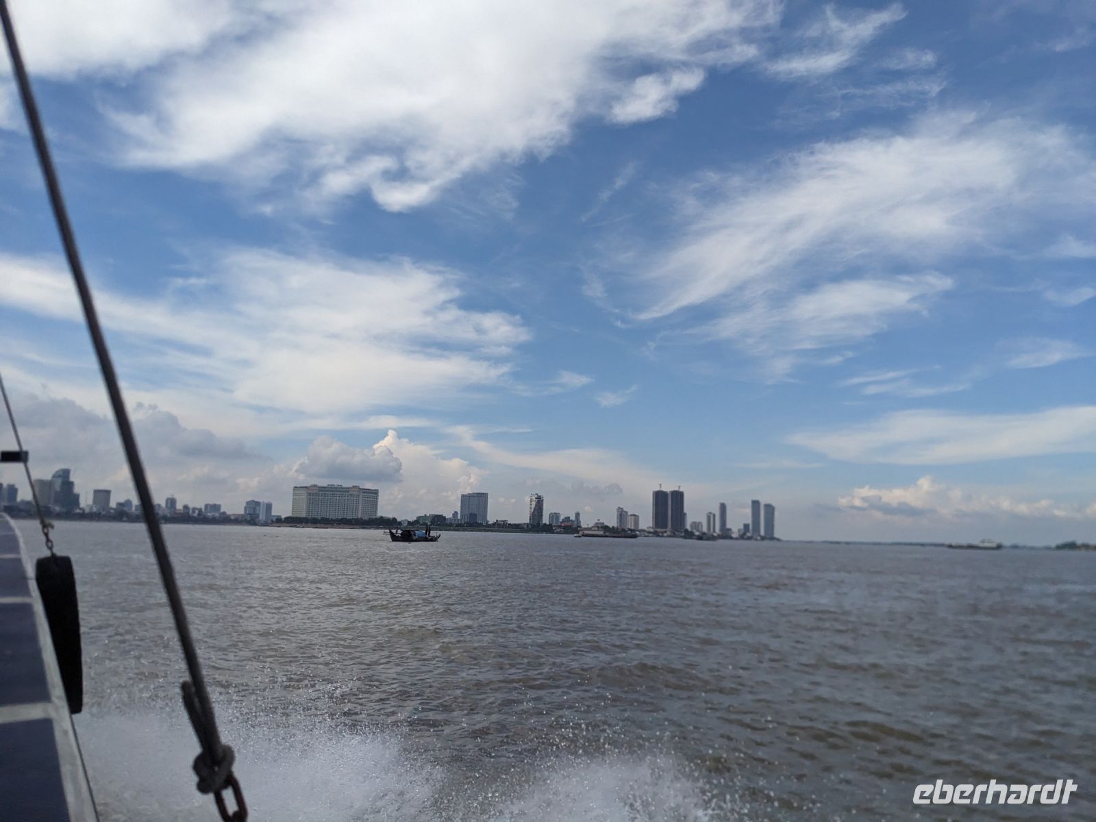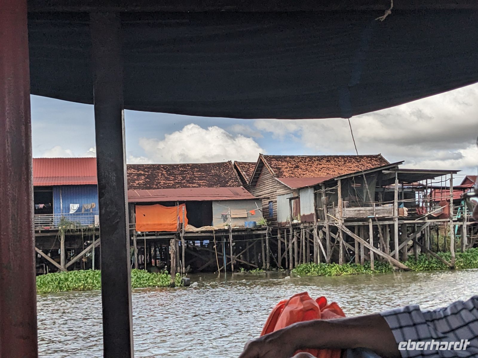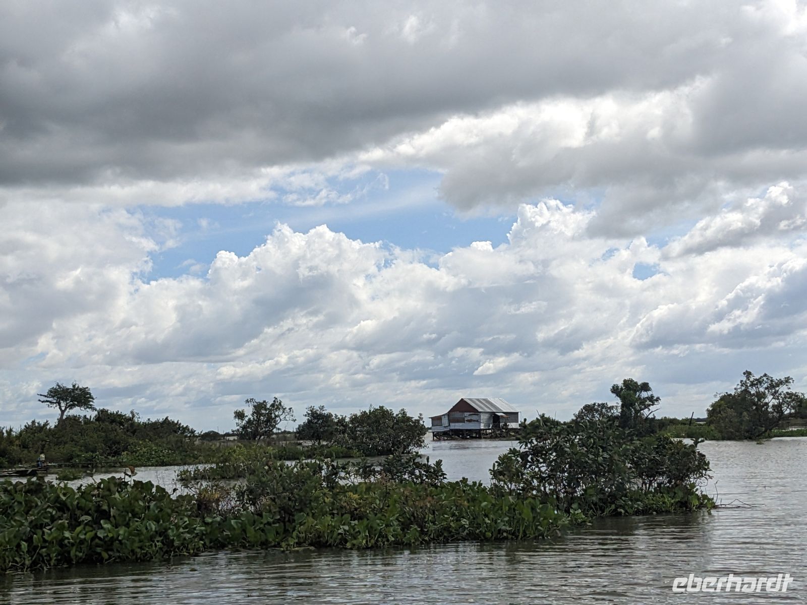 Nach einem letzten ausgiebigen Frühstück, genug Zeit zum Koffer packen und zur Nutzung der Annehmlichkeiten des Hotels fuhren wir dann los in Richtung des größten Binnensees Südostasiens, dem Tonle Sap - ein schöner Reiseabschluss mit zahlreichen Eindrücken. Denn bevor wir den eigentlichen See erreichten, durchfuhren wir zunächst ein Gebiet mit Stelzenhäusern, kleinen Inseln, auf denen beispielsweise Tempel gebaut waren und schließlich eröffnete sich uns der Blick in eine uneingeschränkte Weite. So weit wir auch blickten, es war kein Ende des Sees am Horizont zu sehen. Wieder zurück an der Anlegestelle war es mit dem Bus von dort nur ein kurzes Stück zum Flughafen von Siem Reap. Auf der Fahrt gab es von mir noch im Namen von Eberhardt TRAVEL einen kleinen Glücksbringer für zukünftige Reisen. Der Flughafen ist noch nicht mal zwei Monate alt gewesen zum, Zeitpunkt unseres Rückflugs und sehr eindrucksvoll gebaut. Alles hat ohne große Vorkommnisse funktioniert. Unser erstes Ziel war Ho Chi Minh Stadt und von dort ging es dann zurück in Richtung Frankfurt.