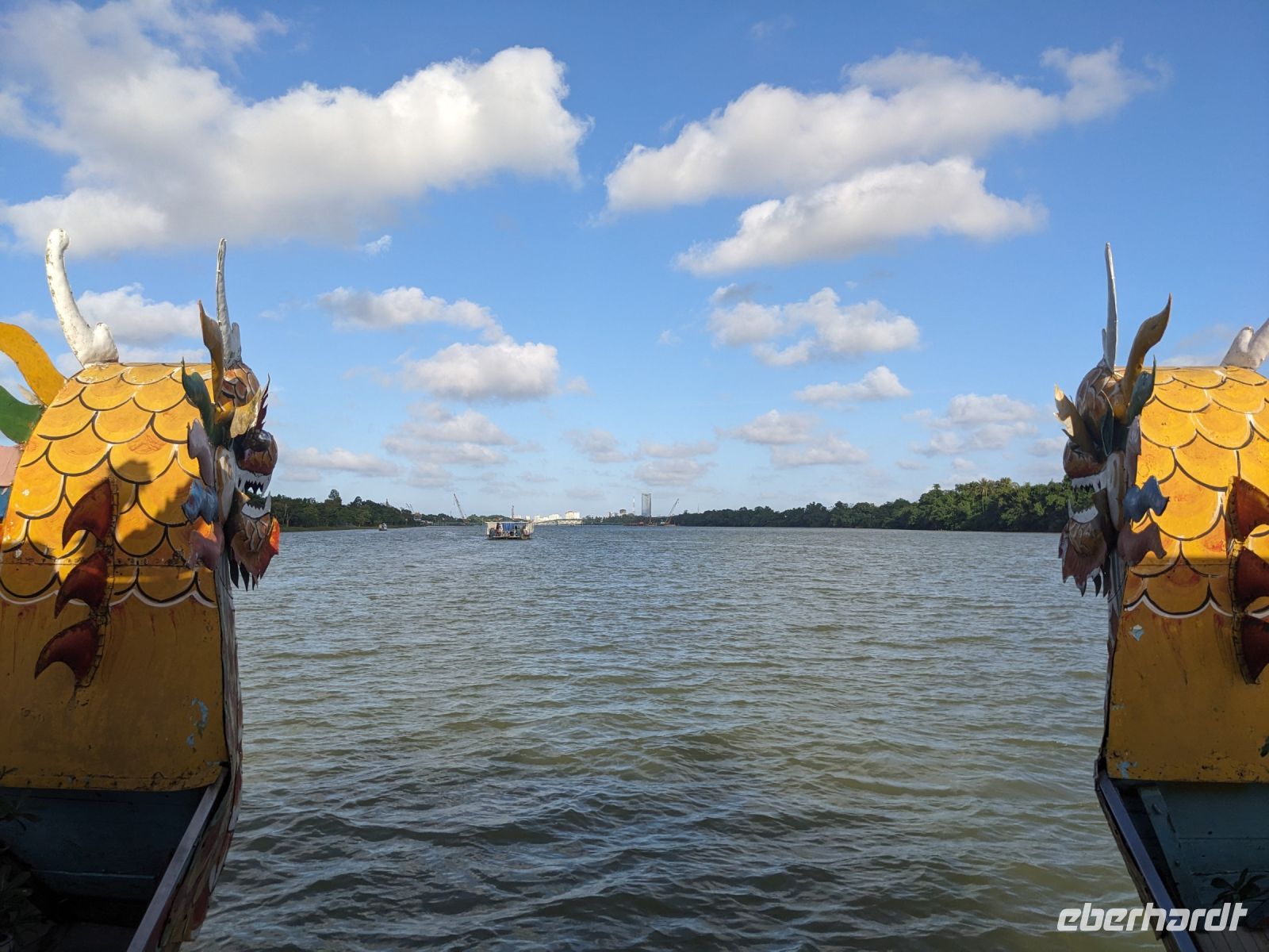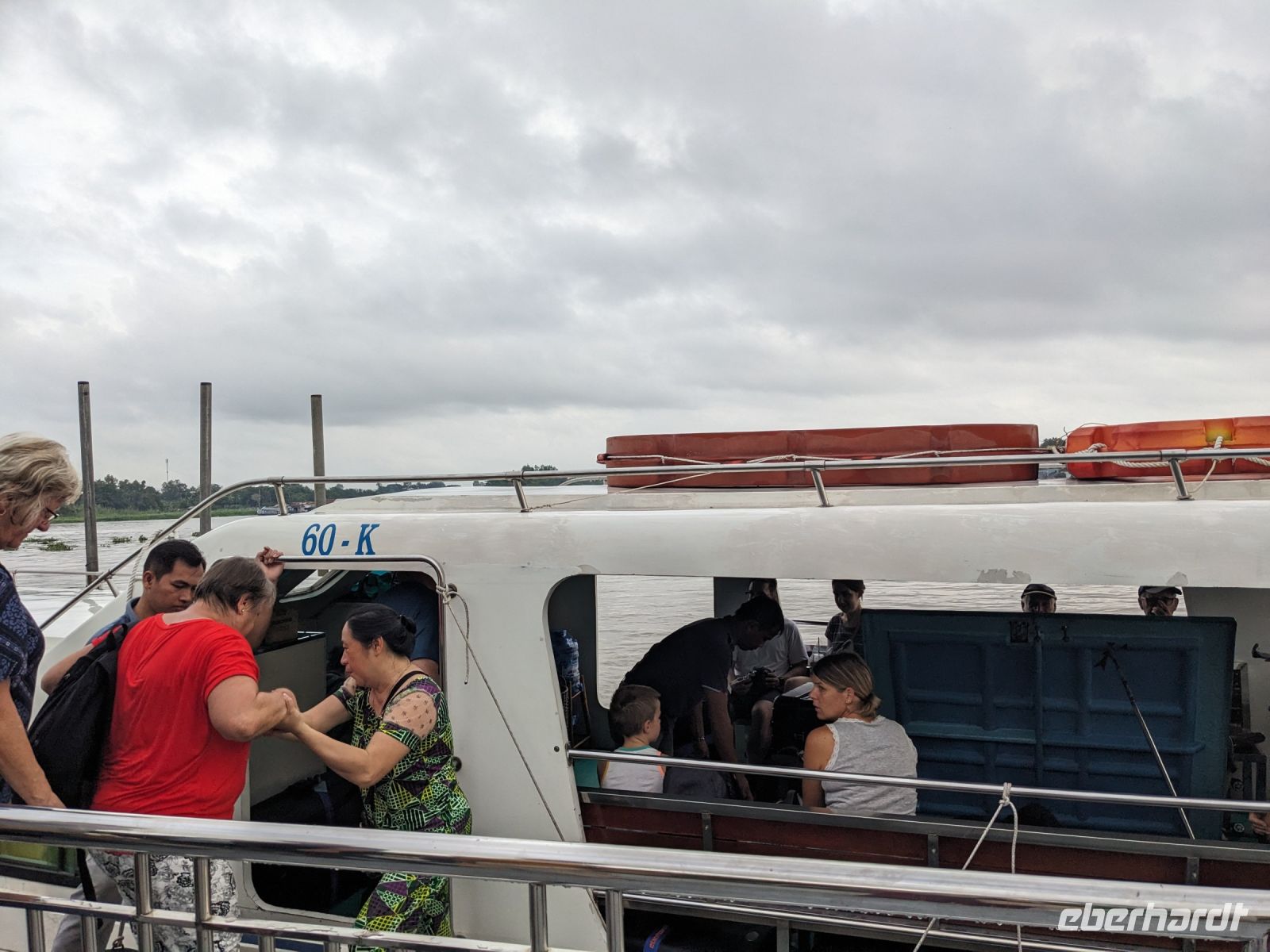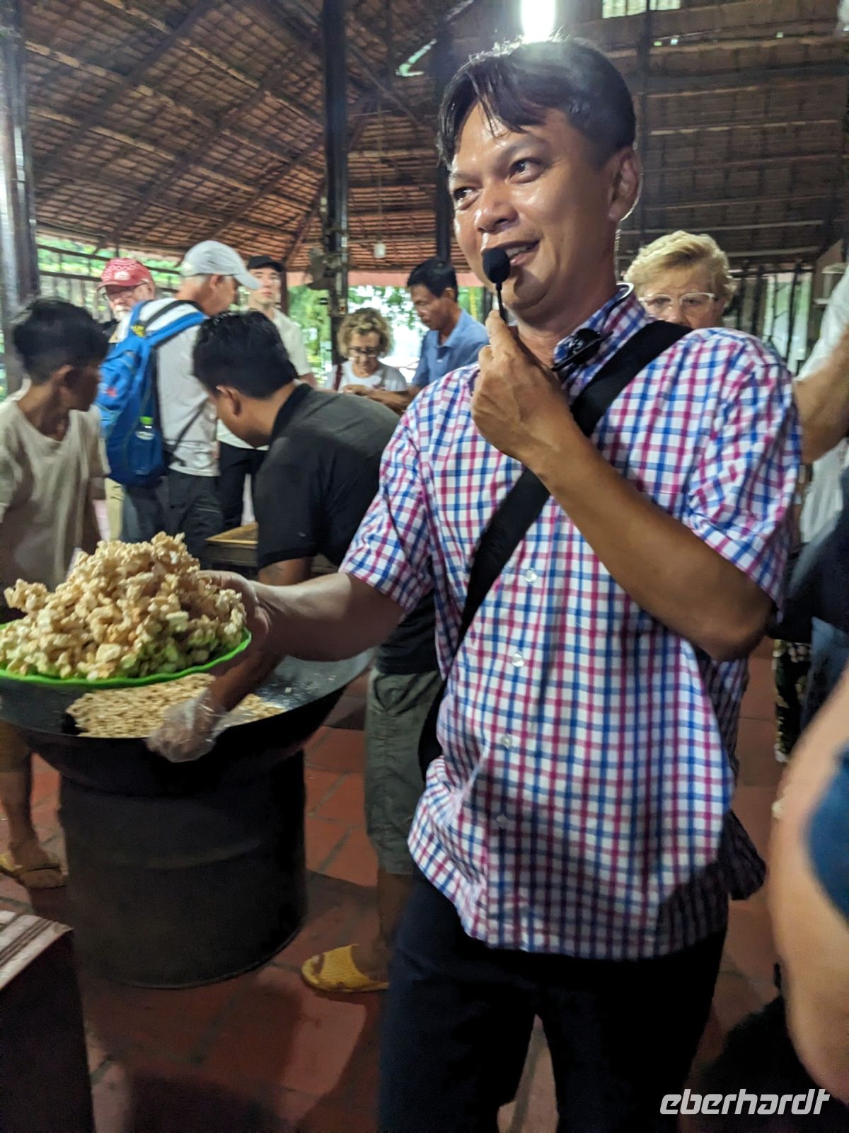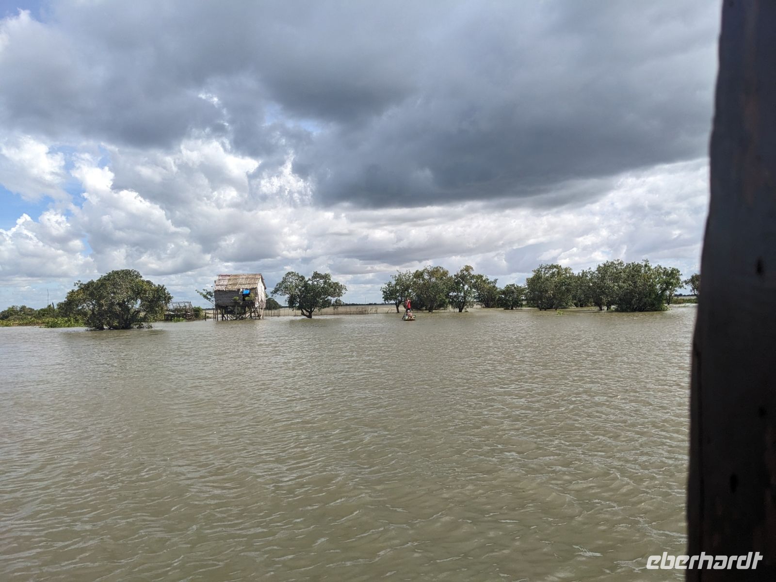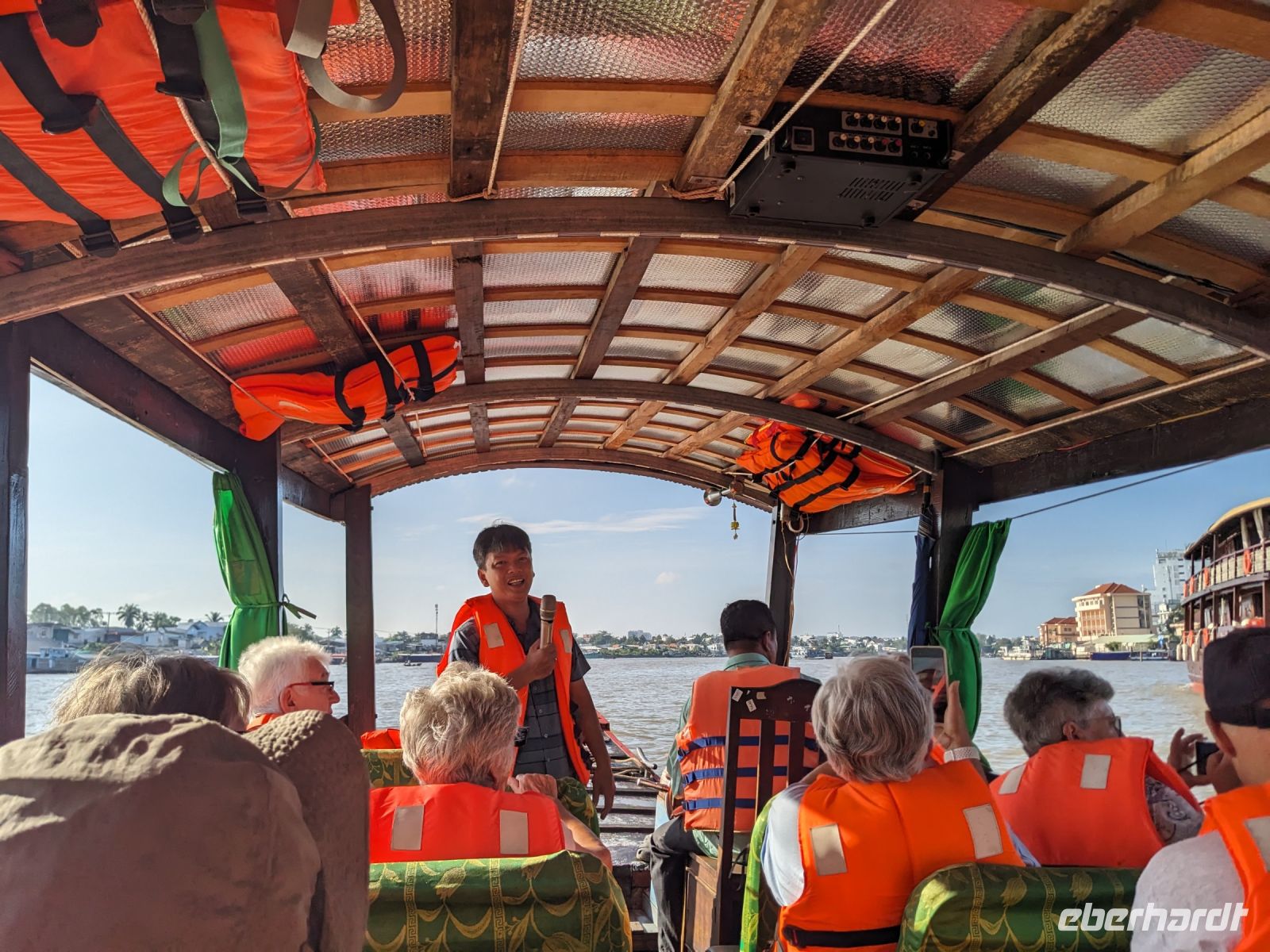 Nach einem letzten ausgiebigen Frühstück, genug Zeit zum Koffer packen und zur Nutzung der Annehmlichkeiten des Hotels fuhren wir dann los in Richtung des größten Binnensees Südostasiens, dem Tonle Sap - ein schöner Reiseabschluss mit zahlreichen Eindrücken. Denn bevor wir den eigentlichen See erreichten, durchfuhren wir zunächst ein Gebiet mit Stelzenhäusern, kleinen Inseln, auf denen beispielsweise Tempel gebaut waren und schließlich eröffnete sich uns der Blick in eine uneingeschränkte Weite. So weit wir auch blickten, es war kein Ende des Sees am Horizont zu sehen. Wieder zurück an der Anlegestelle war es mit dem Bus von dort nur ein kurzes Stück zum Flughafen von Siem Reap. Auf der Fahrt gab es von mir noch im Namen von Eberhardt TRAVEL einen kleinen Glücksbringer für zukünftige Reisen. Der Flughafen ist noch nicht mal zwei Monate alt gewesen zum, Zeitpunkt unseres Rückflugs und sehr eindrucksvoll gebaut. Alles hat ohne große Vorkommnisse funktioniert. Unser erstes Ziel war Ho Chi Minh Stadt und von dort ging es dann zurück in Richtung Frankfurt.