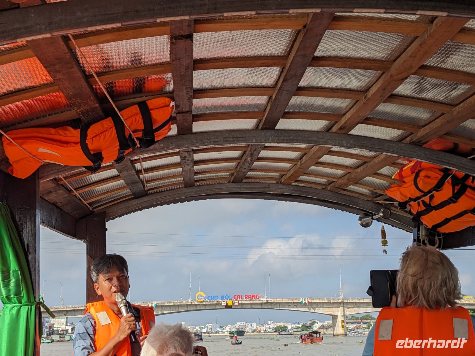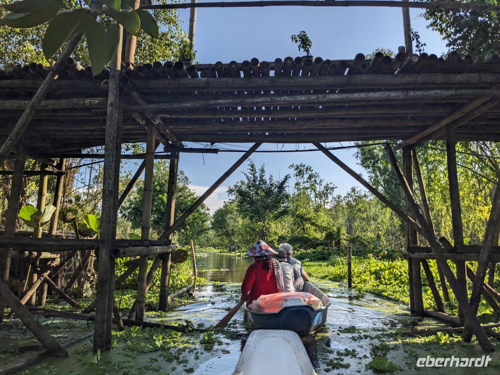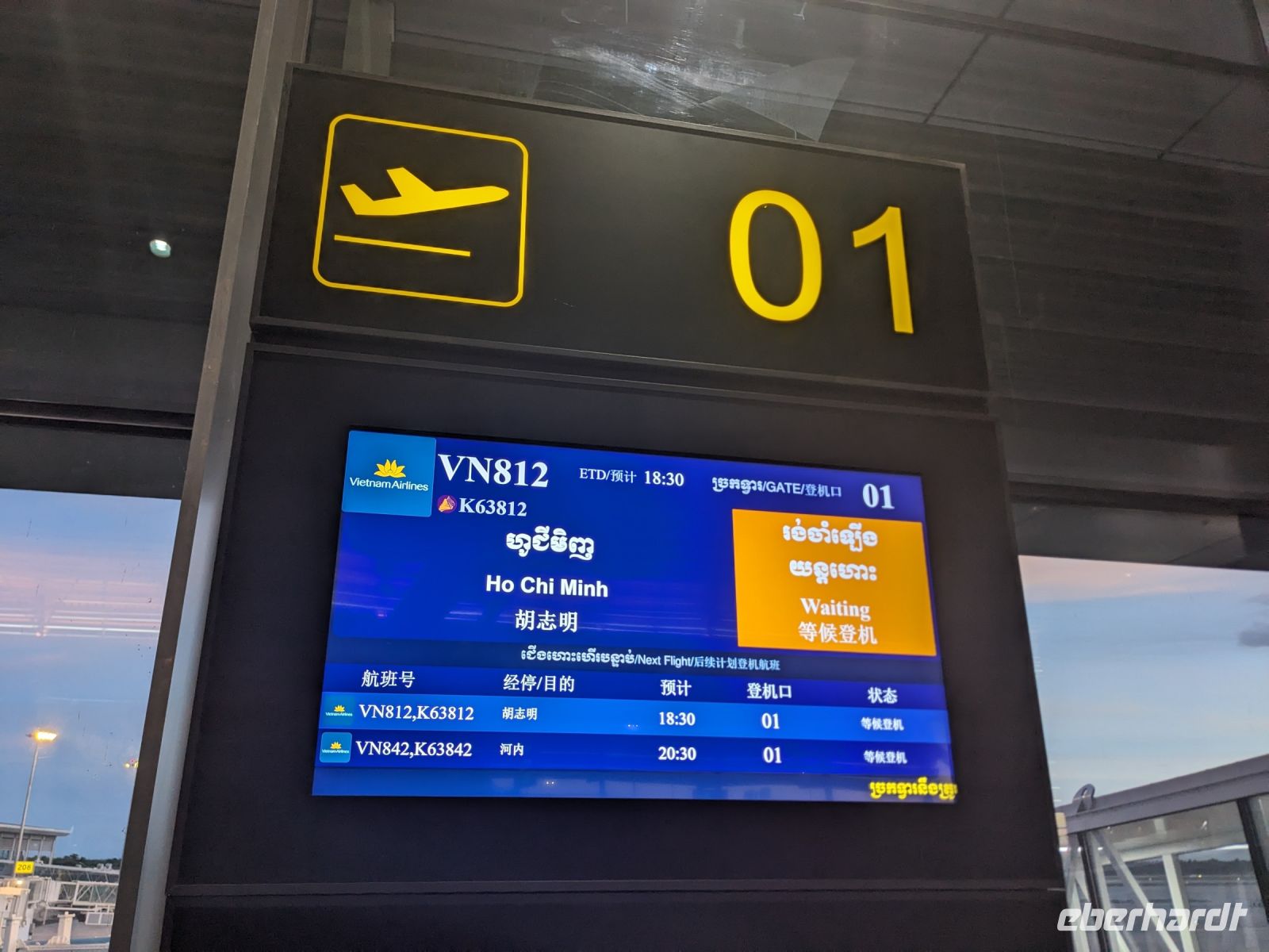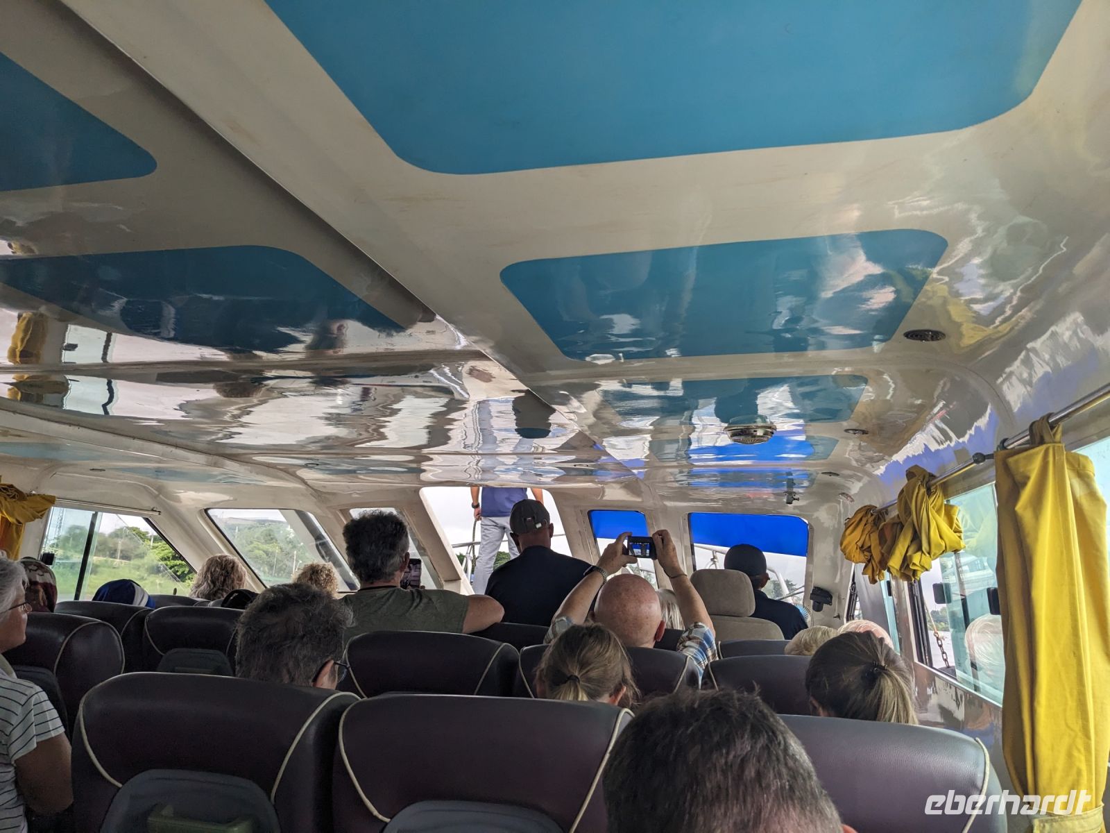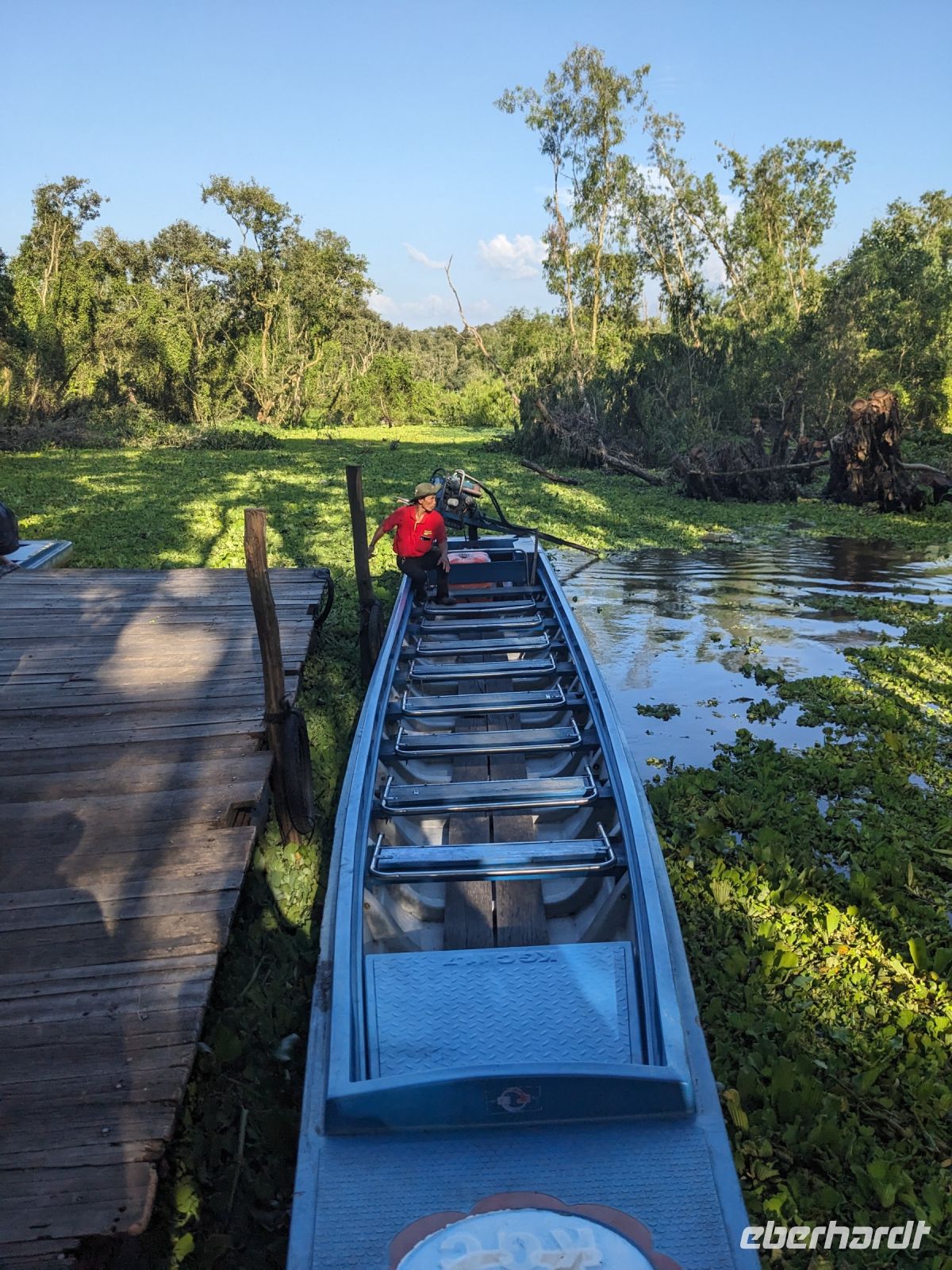 Nach einem letzten ausgiebigen Frühstück, genug Zeit zum Koffer packen und zur Nutzung der Annehmlichkeiten des Hotels fuhren wir dann los in Richtung des größten Binnensees Südostasiens, dem Tonle Sap - ein schöner Reiseabschluss mit zahlreichen Eindrücken. Denn bevor wir den eigentlichen See erreichten, durchfuhren wir zunächst ein Gebiet mit Stelzenhäusern, kleinen Inseln, auf denen beispielsweise Tempel gebaut waren und schließlich eröffnete sich uns der Blick in eine uneingeschränkte Weite. So weit wir auch blickten, es war kein Ende des Sees am Horizont zu sehen. Wieder zurück an der Anlegestelle war es mit dem Bus von dort nur ein kurzes Stück zum Flughafen von Siem Reap. Auf der Fahrt gab es von mir noch im Namen von Eberhardt TRAVEL einen kleinen Glücksbringer für zukünftige Reisen. Der Flughafen ist noch nicht mal zwei Monate alt gewesen zum, Zeitpunkt unseres Rückflugs und sehr eindrucksvoll gebaut. Alles hat ohne große Vorkommnisse funktioniert. Unser erstes Ziel war Ho Chi Minh Stadt und von dort ging es dann zurück in Richtung Frankfurt.