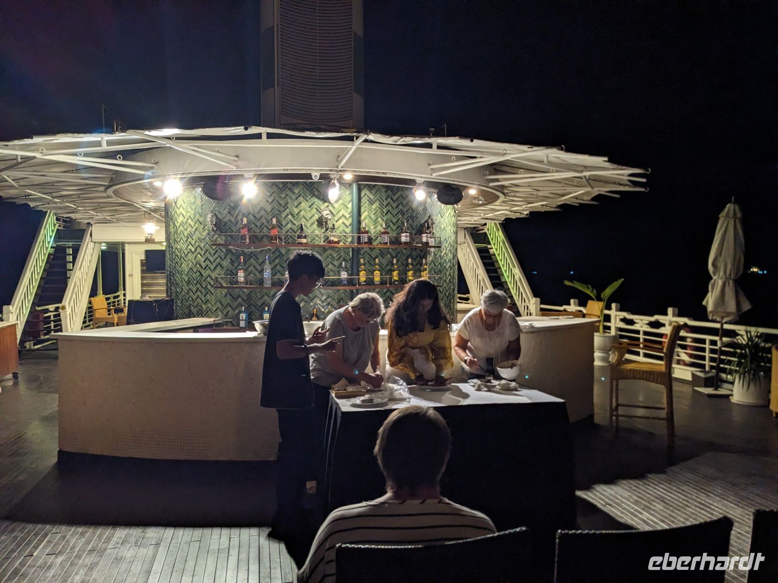Als ich bei einigen am Ende der Reise nochmal nach Highlights gefragt hatte, kam ganz oft: Ha Long Bucht und ich kann es nur zu gut verstehen. Auf unserem schwimmenden Hotel konnten wir es uns wahrhaft gut gehen lassen und vor allem der Ausblick war einmalig. Überall, wohin man auch blickte, sah man aus dem Wasser ragende Felsformationen. Nach einem leckeren Mittagsmenü konnten wir mit Kajaks fahren und/oder zum Strand gehen. Bei einem Workshop an Bord lernten wir dann, Frühlingsrollen zu machen und auch die Happy Hour der Bar zog viele an. Abends gab es wieder leckeres Essen verbunden mit einer Tanzvorführung. Anschließend verkosteten wir Reiswein und probierten uns schließlich noch im Fischen, wobei Letzteres leider erfolglos blieb. Aufgrund der starken Bewölkung war der Sonnenuntergang sowie der Sternenhimmel leider nur bedingt zu sehen. Trotzdem stellte die Ha Long Bucht ein absolutes Highlight der Reise dar und wurde noch versüßt durch den tollen Service an Bord unseres kleinen Kreuzfahrtschiffes.