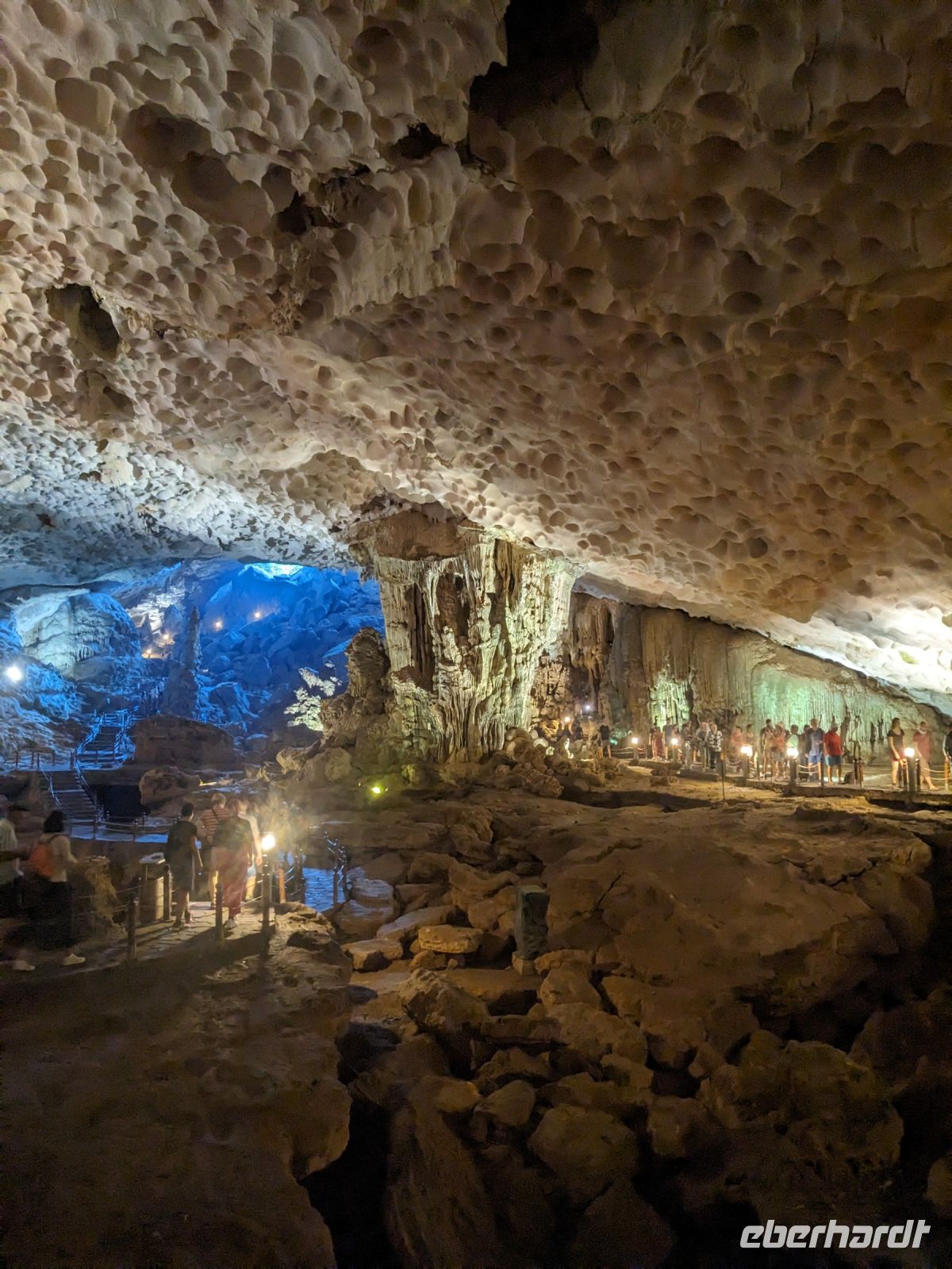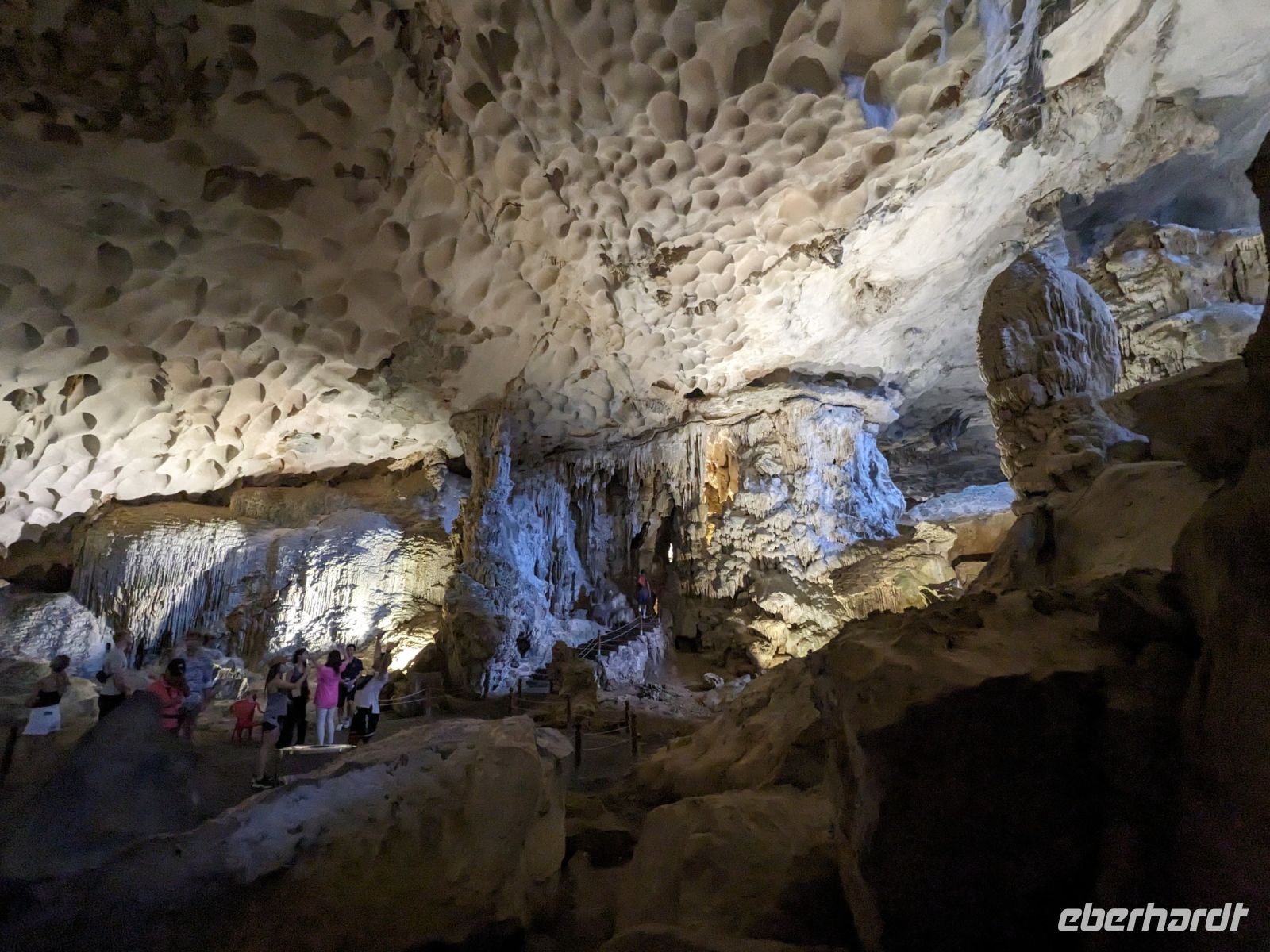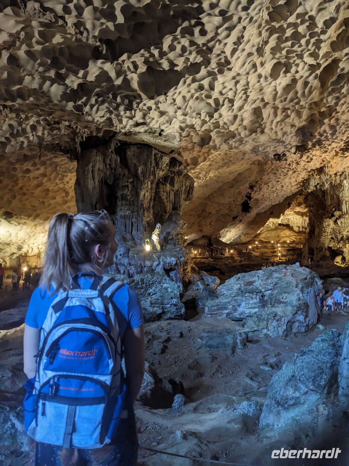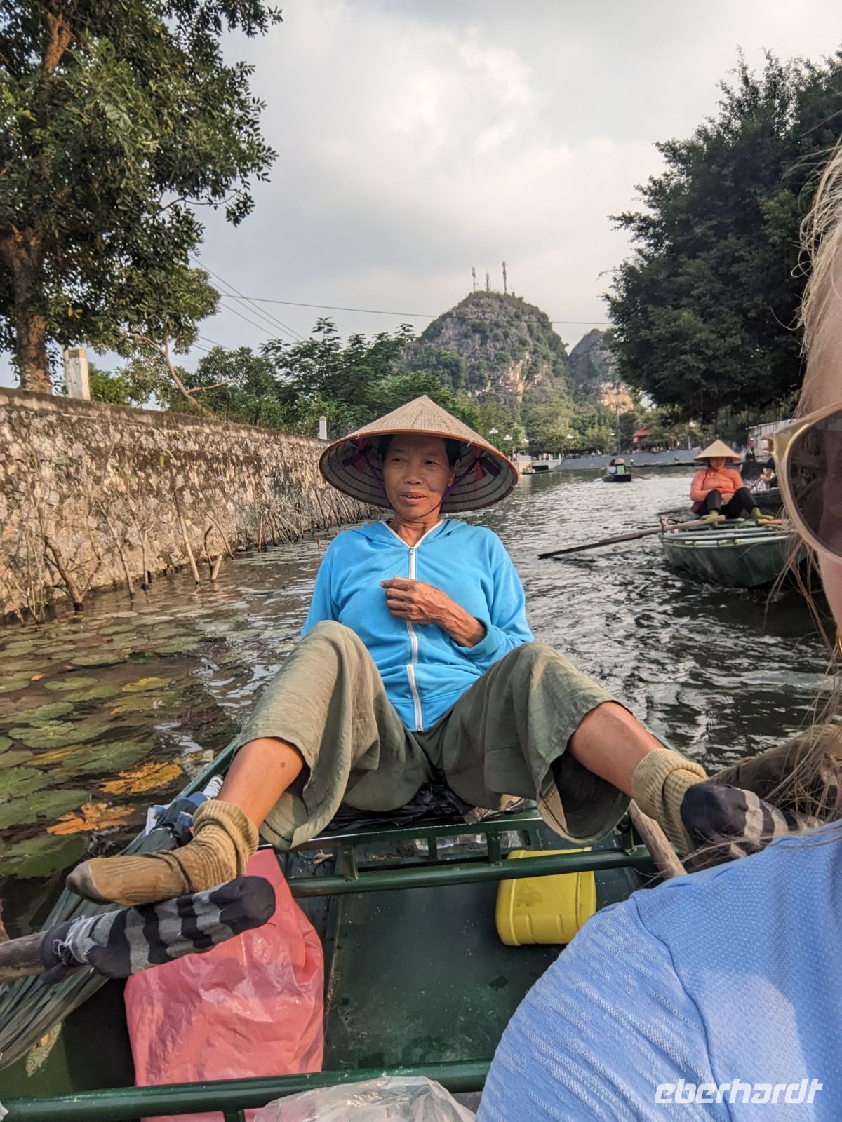 Bei einer Runde Tai Chi auf dem Oberdeck starteten einige Frühaufsteher unter uns in den Tag. Während wir die Posen unter Anleitung nachmachten, zog die wunderschöne Landschaft der Ha Long Bucht an uns vorbei. Nach einem kleinen Morgensnack brachen wir dann zur Höhlenerkundung auf. Die sogenannte Überraschungshöhle war wirklich sehenswert. Insgesamt drei Kammern durchliefen wir - eine größer als die andere. Anschließend ging es zurück an Bord und während eines umfangreichen Brunchbuffets fuhren wir zurück in den Hafen. Dort sammelte uns unser Bus ein. Er brachte uns zur trockenen Ha Long Bucht, wo wir eine Bootsfahrt unternahmen. Zu zweit bzw. zu dritt saßen wir in den Ruderbooten, welche die Frauen mit den Füßen bewegten. Unglaublich wie geschickt sie das machten, als es beispielsweise auch durch flache Höhlen ging. Hier musste selbst ich, mit meinen 1,63m, ab und zu den Kopf einziehen! Nach einer kurzen Verkaufspause ruderten sie uns wieder zurück und wir fuhren weiter in unser Hotel - eine wahrhaft königliche Anlage. Leider stand uns hier insgesamt nicht viel Zeit zur Verfügung, aber schön war es trotzdem.