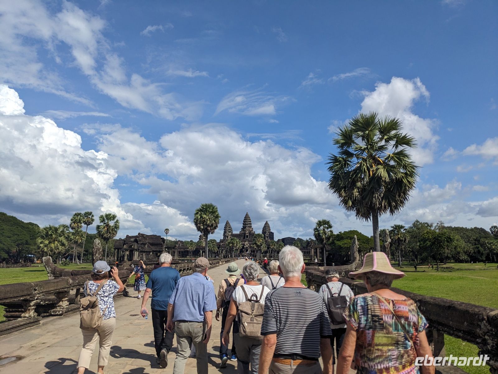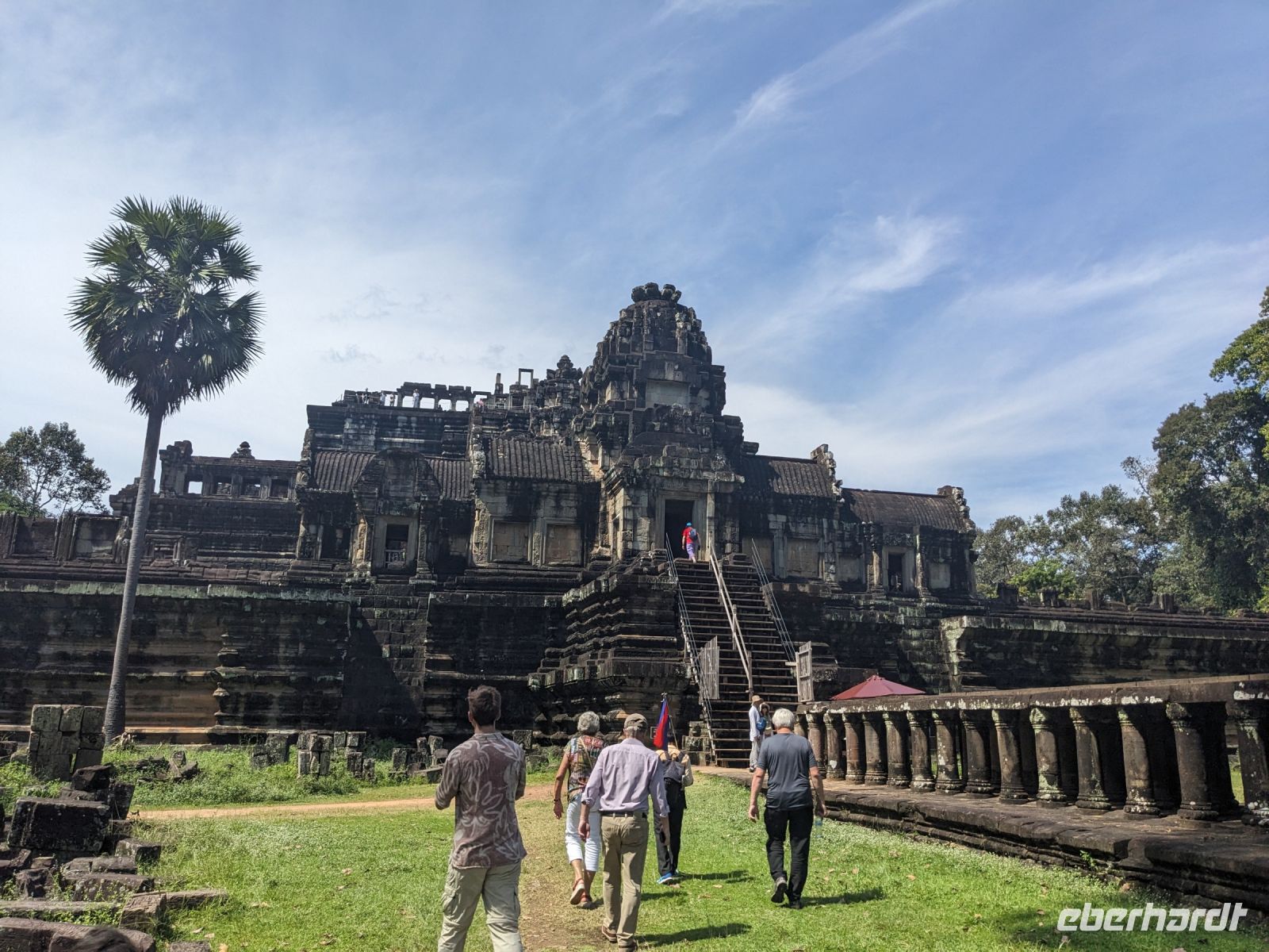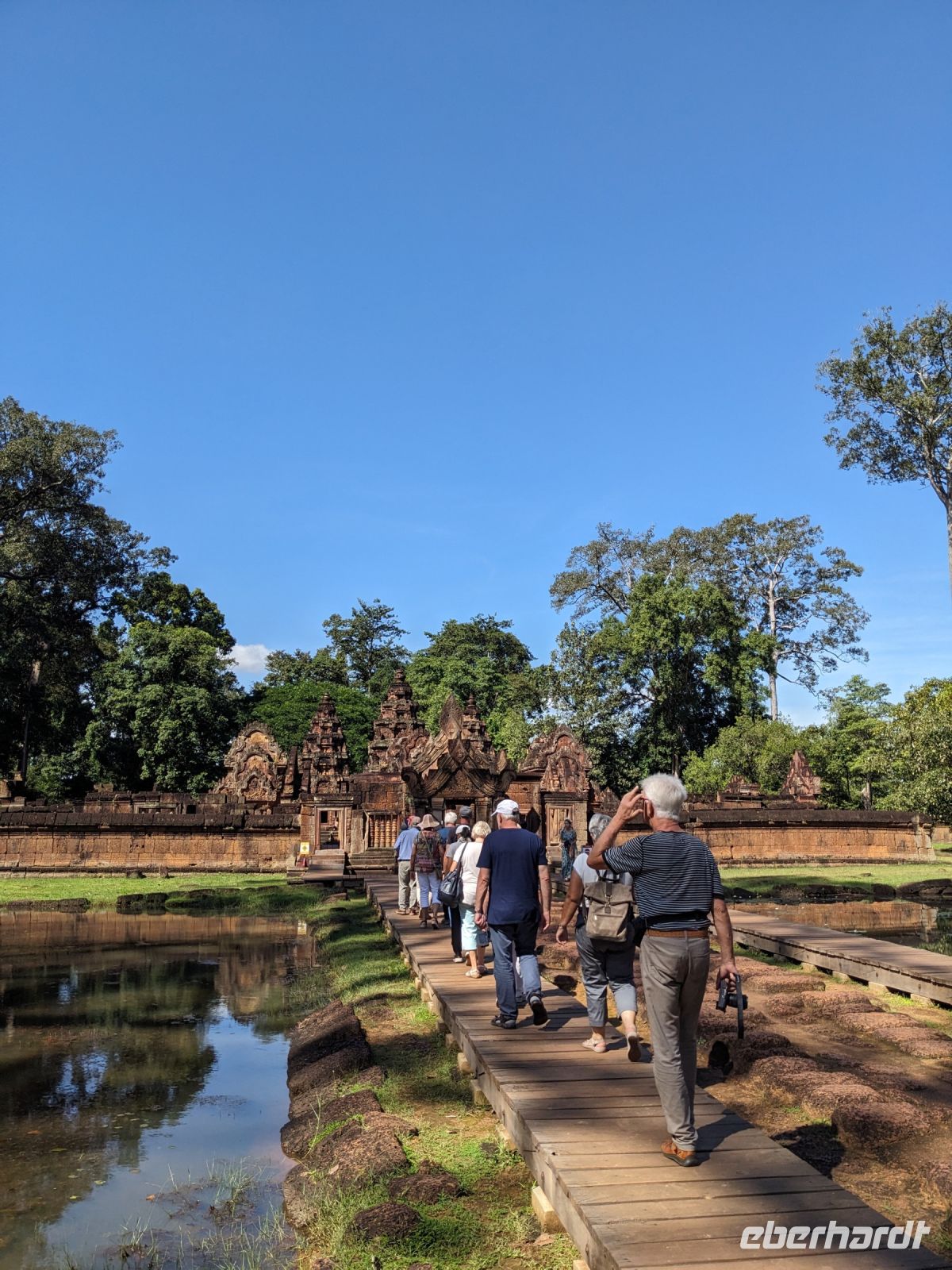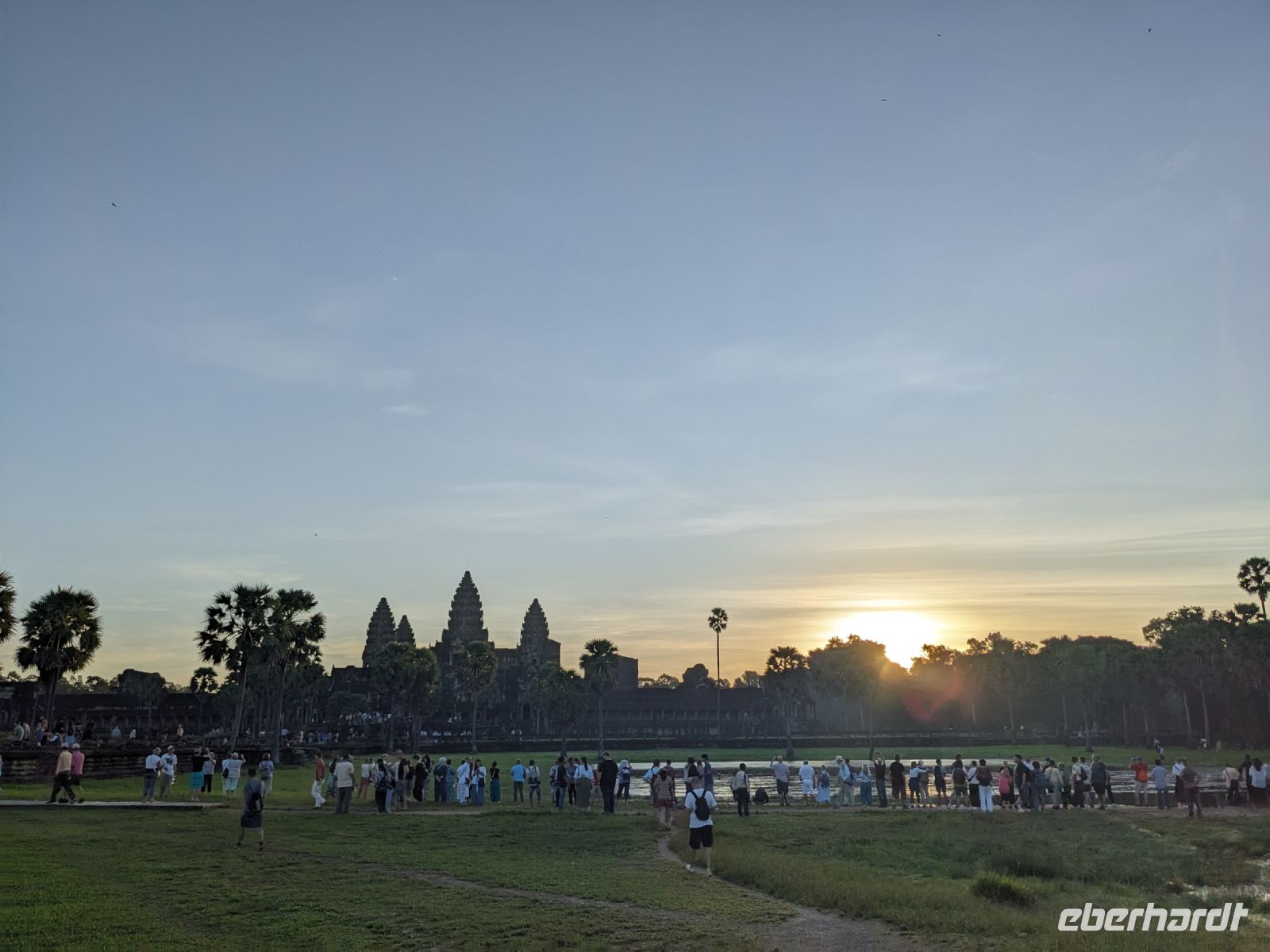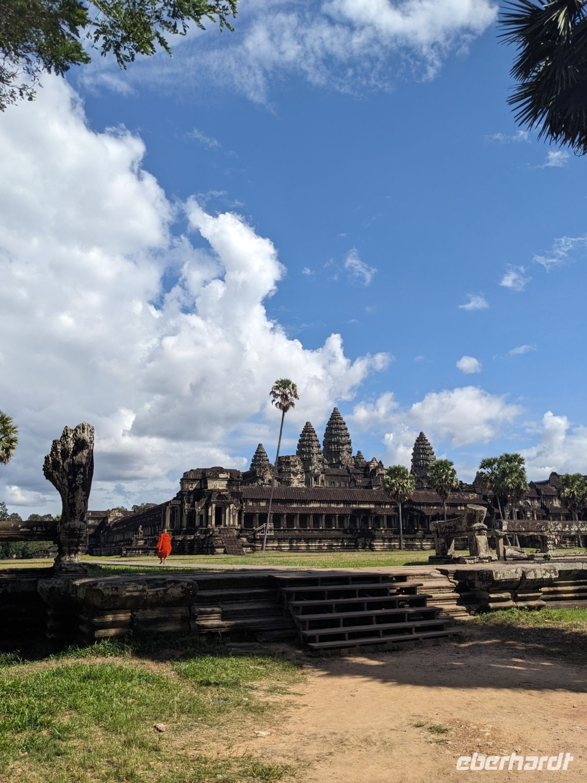 Der letzte volle Reisetag war angebrochen und was wäre ein besserer Abschluss als Angkor Wat selbst. Ein Großteil der Gruppe traf sich bereits zur Bestaunung des Sonnenaufgangs auf der Anlage. Langsam, Stück für Stück, schlich die Sonne immer weiter nach oben und tauchte schließlich über den Wäldern neben dem Haupttempel auf. Es gibt zwei Tage im Jahr (einmal im März und einmal im September), wo die Sonne direkt mittig über dem Tempel aufgeht. Anschließend ging es zurück ins Hotel zum Frühstücken, wo wir auf den Rest der Gruppe trafen. Gemeinsam zogen wir los zum Banteay Schrein, ein sehr kleiner Tempel mit vielen detailreichen Verzierungen. Auf dem Rückweg stoppten wir bei einem Palmzuckerverarbeiter. Hier konnten wir auch probieren und bei der Herstellung zuschauen. Fast jeder fand ein schönes Mitbringsel für Zuhause. Im Namen von Eberhardt TRAVEL gab es dann eine typisch kambodschanische Nudelsuppe zum Mittag und gut gestärkt, erkundeten wir schließlich Angkor Wat. Anders als am Morgen gingen wir in die Tempelanlage hinein und Lim machte mit uns eine ausführliche Tour. Im Haupttempel stieß der Großteil der Gruppe bis auf die dritte Etage hoch - doch die steilen Stufen waren es wert - von oben hatten wir einen tollen Ausblick auf die Umgebung. Am Abend erwartete uns dann unser letzten gemeinsames Abendessen in einem wirklich sehr schön gestalteten Restaurant, was wir ganz für uns allein hatten.