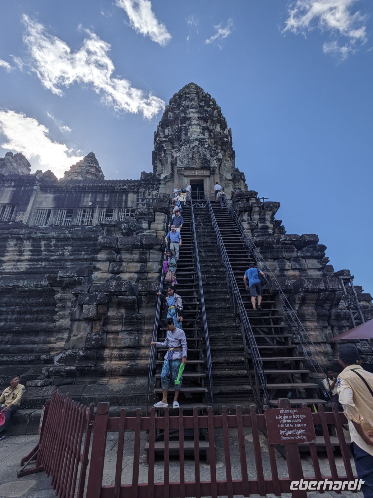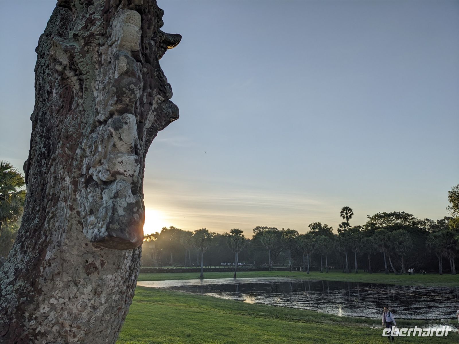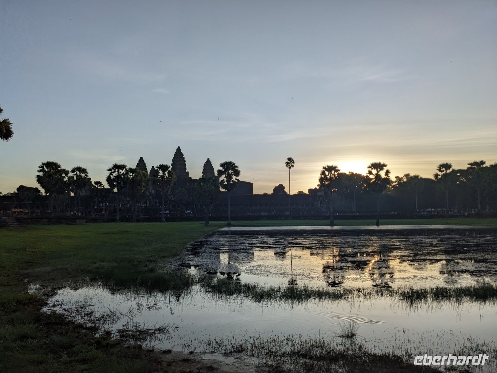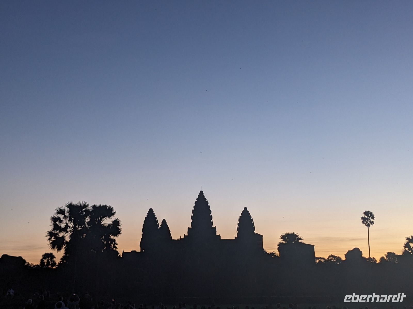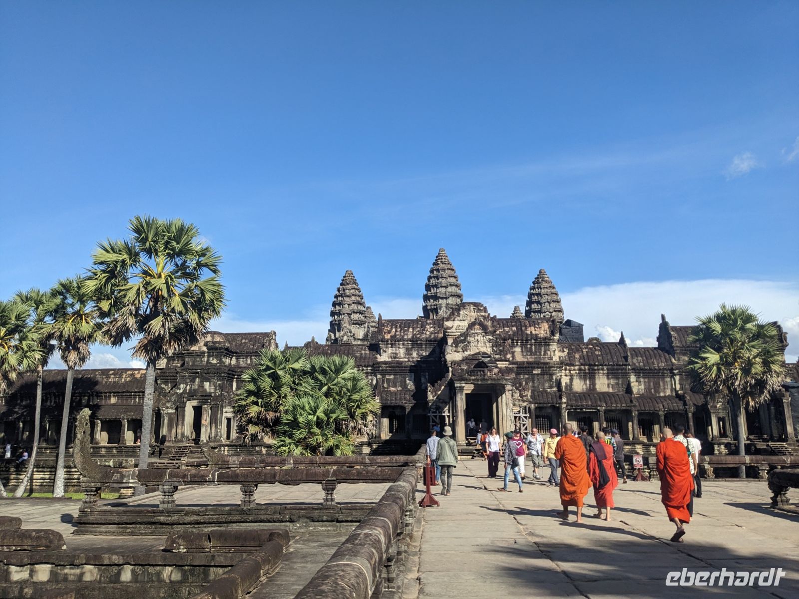 Der letzte volle Reisetag war angebrochen und was wäre ein besserer Abschluss als Angkor Wat selbst. Ein Großteil der Gruppe traf sich bereits zur Bestaunung des Sonnenaufgangs auf der Anlage. Langsam, Stück für Stück, schlich die Sonne immer weiter nach oben und tauchte schließlich über den Wäldern neben dem Haupttempel auf. Es gibt zwei Tage im Jahr (einmal im März und einmal im September), wo die Sonne direkt mittig über dem Tempel aufgeht. Anschließend ging es zurück ins Hotel zum Frühstücken, wo wir auf den Rest der Gruppe trafen. Gemeinsam zogen wir los zum Banteay Schrein, ein sehr kleiner Tempel mit vielen detailreichen Verzierungen. Auf dem Rückweg stoppten wir bei einem Palmzuckerverarbeiter. Hier konnten wir auch probieren und bei der Herstellung zuschauen. Fast jeder fand ein schönes Mitbringsel für Zuhause. Im Namen von Eberhardt TRAVEL gab es dann eine typisch kambodschanische Nudelsuppe zum Mittag und gut gestärkt, erkundeten wir schließlich Angkor Wat. Anders als am Morgen gingen wir in die Tempelanlage hinein und Lim machte mit uns eine ausführliche Tour. Im Haupttempel stieß der Großteil der Gruppe bis auf die dritte Etage hoch - doch die steilen Stufen waren es wert - von oben hatten wir einen tollen Ausblick auf die Umgebung. Am Abend erwartete uns dann unser letzten gemeinsames Abendessen in einem wirklich sehr schön gestalteten Restaurant, was wir ganz für uns allein hatten.