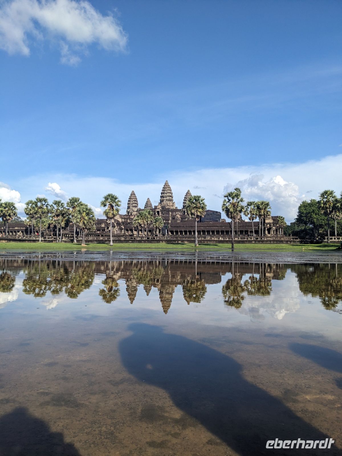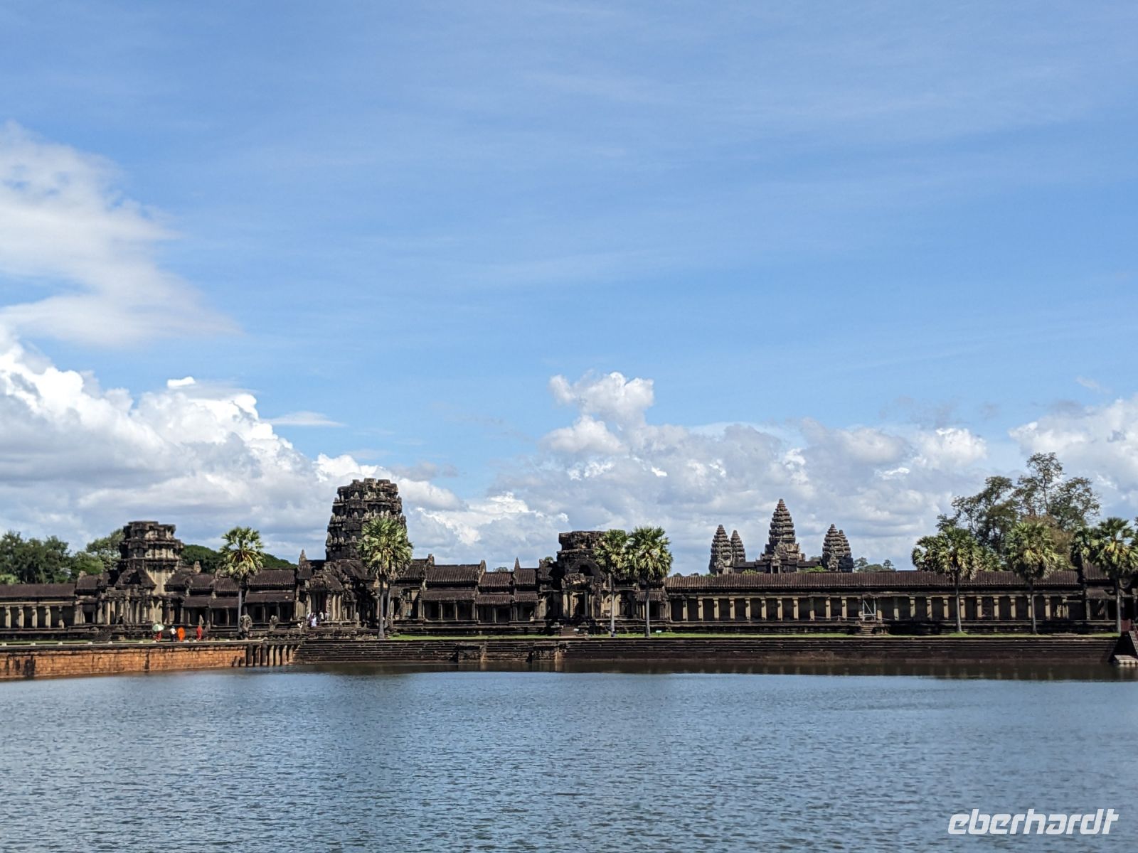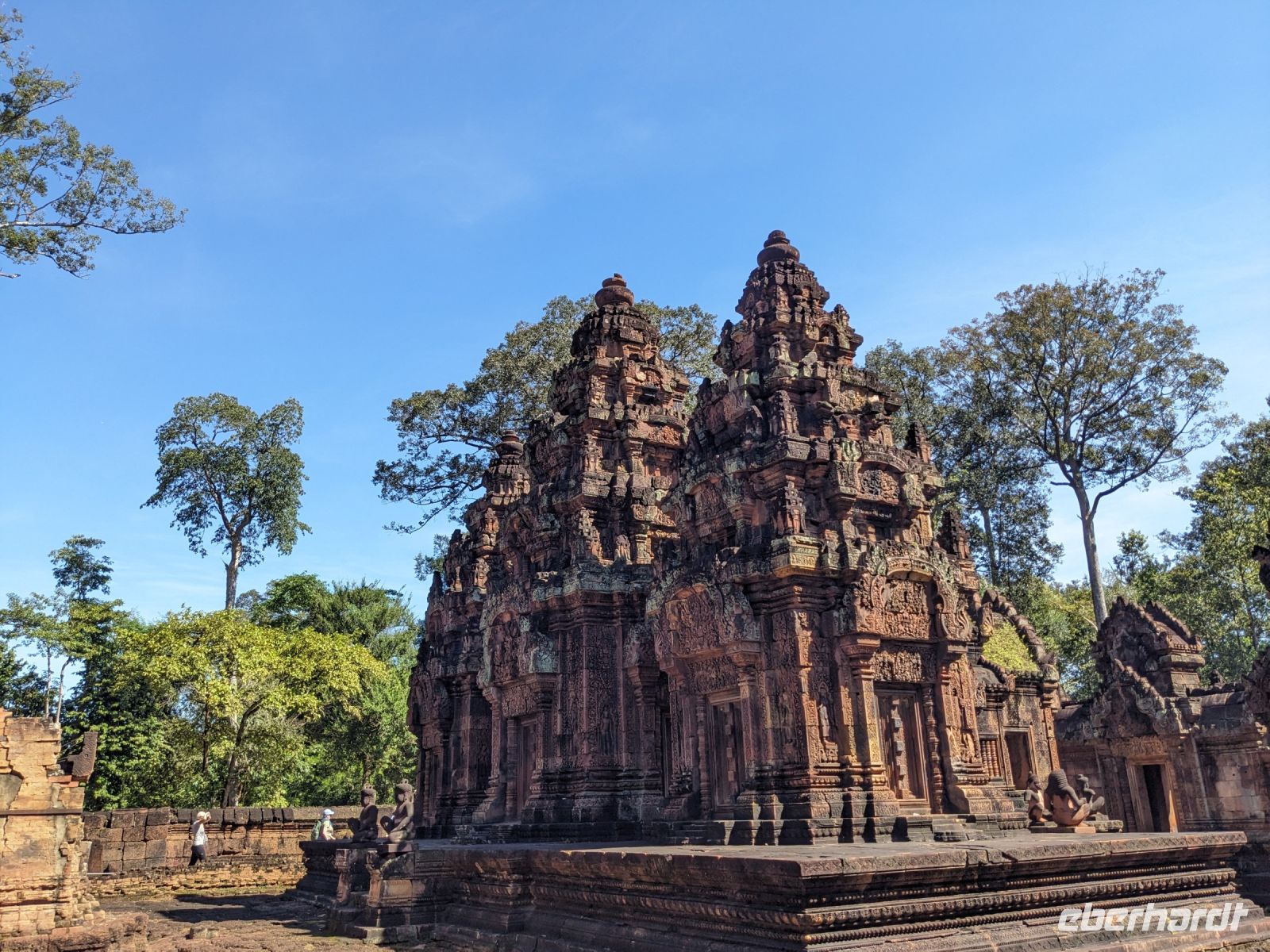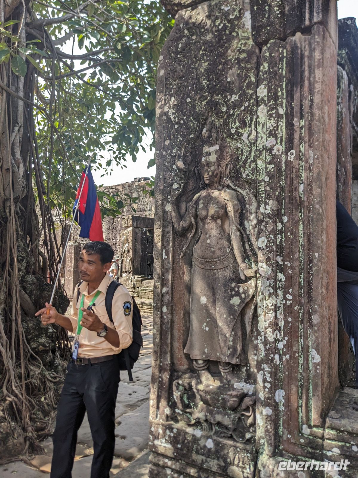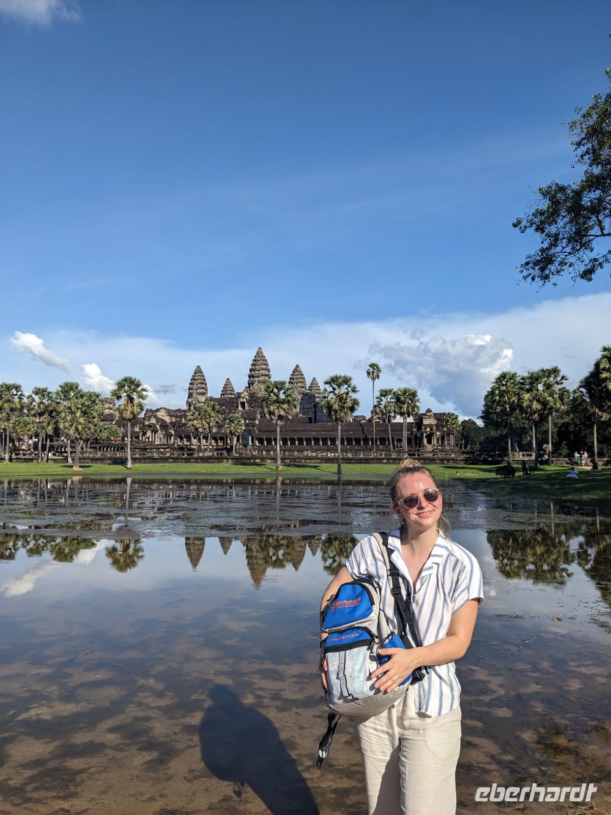 Der letzte volle Reisetag war angebrochen und was wäre ein besserer Abschluss als Angkor Wat selbst. Ein Großteil der Gruppe traf sich bereits zur Bestaunung des Sonnenaufgangs auf der Anlage. Langsam, Stück für Stück, schlich die Sonne immer weiter nach oben und tauchte schließlich über den Wäldern neben dem Haupttempel auf. Es gibt zwei Tage im Jahr (einmal im März und einmal im September), wo die Sonne direkt mittig über dem Tempel aufgeht. Anschließend ging es zurück ins Hotel zum Frühstücken, wo wir auf den Rest der Gruppe trafen. Gemeinsam zogen wir los zum Banteay Schrein, ein sehr kleiner Tempel mit vielen detailreichen Verzierungen. Auf dem Rückweg stoppten wir bei einem Palmzuckerverarbeiter. Hier konnten wir auch probieren und bei der Herstellung zuschauen. Fast jeder fand ein schönes Mitbringsel für Zuhause. Im Namen von Eberhardt TRAVEL gab es dann eine typisch kambodschanische Nudelsuppe zum Mittag und gut gestärkt, erkundeten wir schließlich Angkor Wat. Anders als am Morgen gingen wir in die Tempelanlage hinein und Lim machte mit uns eine ausführliche Tour. Im Haupttempel stieß der Großteil der Gruppe bis auf die dritte Etage hoch - doch die steilen Stufen waren es wert - von oben hatten wir einen tollen Ausblick auf die Umgebung. Am Abend erwartete uns dann unser letzten gemeinsames Abendessen in einem wirklich sehr schön gestalteten Restaurant, was wir ganz für uns allein hatten.