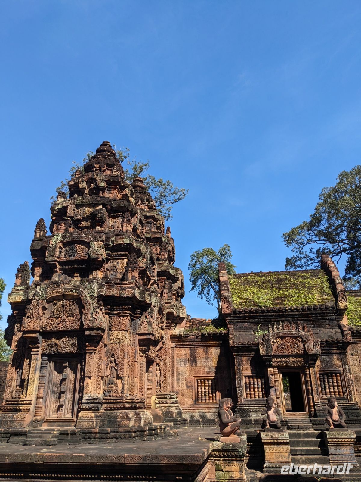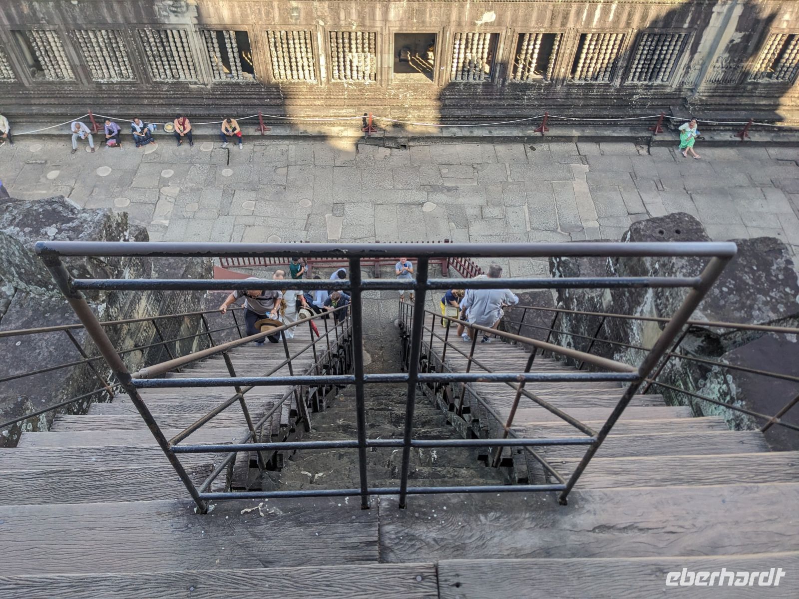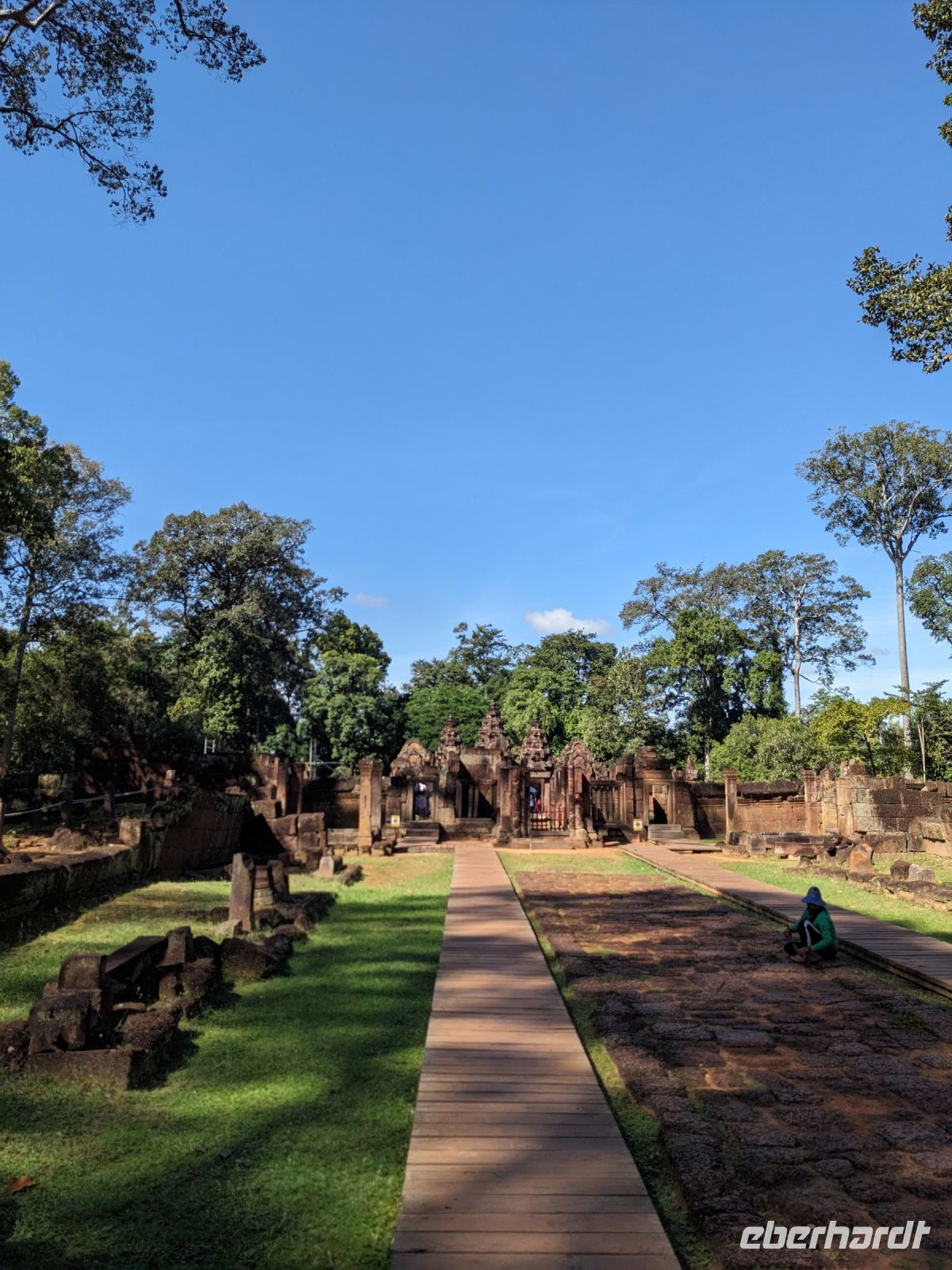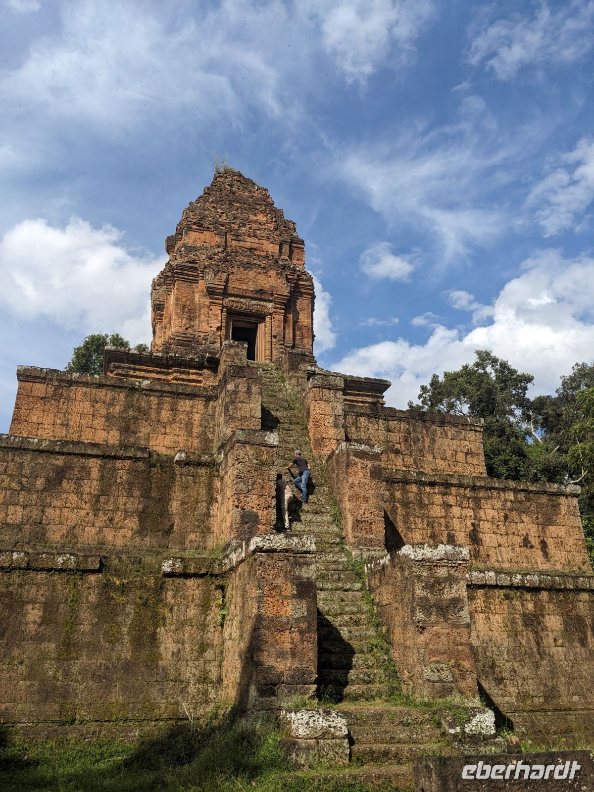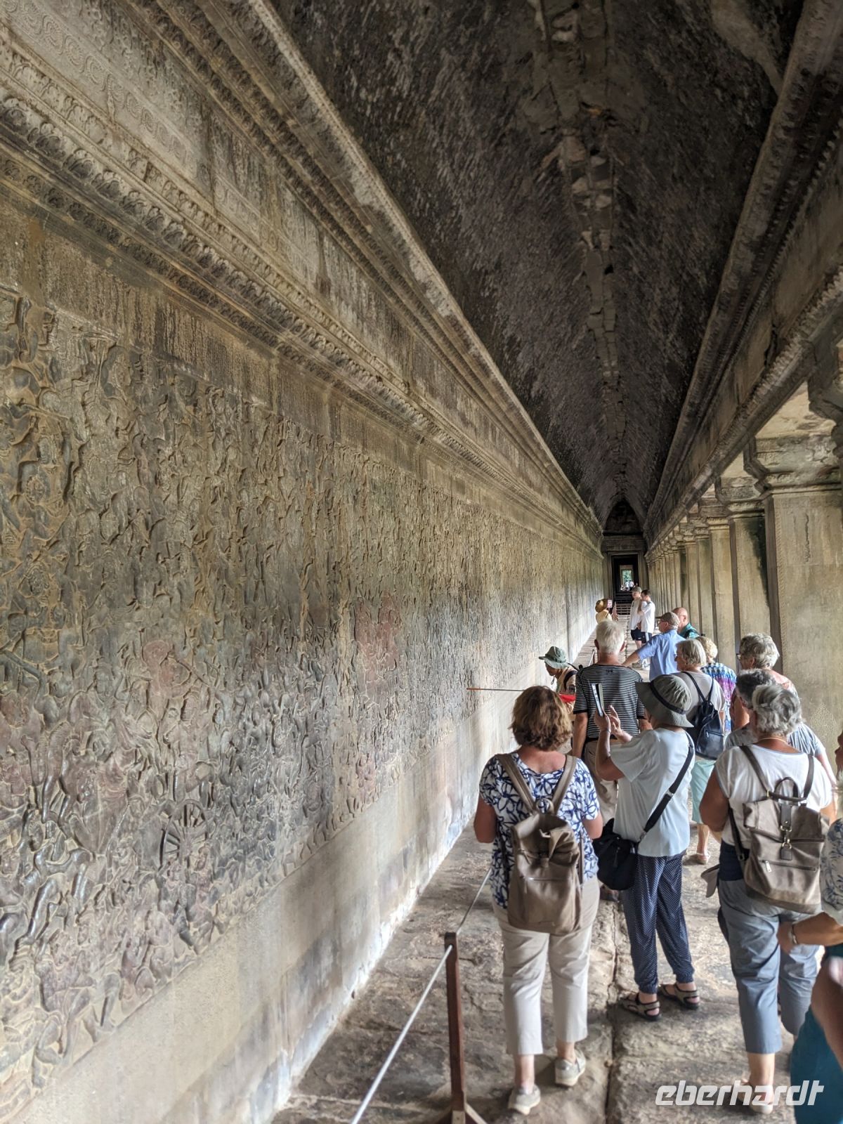 Der letzte volle Reisetag war angebrochen und was wäre ein besserer Abschluss als Angkor Wat selbst. Ein Großteil der Gruppe traf sich bereits zur Bestaunung des Sonnenaufgangs auf der Anlage. Langsam, Stück für Stück, schlich die Sonne immer weiter nach oben und tauchte schließlich über den Wäldern neben dem Haupttempel auf. Es gibt zwei Tage im Jahr (einmal im März und einmal im September), wo die Sonne direkt mittig über dem Tempel aufgeht. Anschließend ging es zurück ins Hotel zum Frühstücken, wo wir auf den Rest der Gruppe trafen. Gemeinsam zogen wir los zum Banteay Schrein, ein sehr kleiner Tempel mit vielen detailreichen Verzierungen. Auf dem Rückweg stoppten wir bei einem Palmzuckerverarbeiter. Hier konnten wir auch probieren und bei der Herstellung zuschauen. Fast jeder fand ein schönes Mitbringsel für Zuhause. Im Namen von Eberhardt TRAVEL gab es dann eine typisch kambodschanische Nudelsuppe zum Mittag und gut gestärkt, erkundeten wir schließlich Angkor Wat. Anders als am Morgen gingen wir in die Tempelanlage hinein und Lim machte mit uns eine ausführliche Tour. Im Haupttempel stieß der Großteil der Gruppe bis auf die dritte Etage hoch - doch die steilen Stufen waren es wert - von oben hatten wir einen tollen Ausblick auf die Umgebung. Am Abend erwartete uns dann unser letzten gemeinsames Abendessen in einem wirklich sehr schön gestalteten Restaurant, was wir ganz für uns allein hatten.