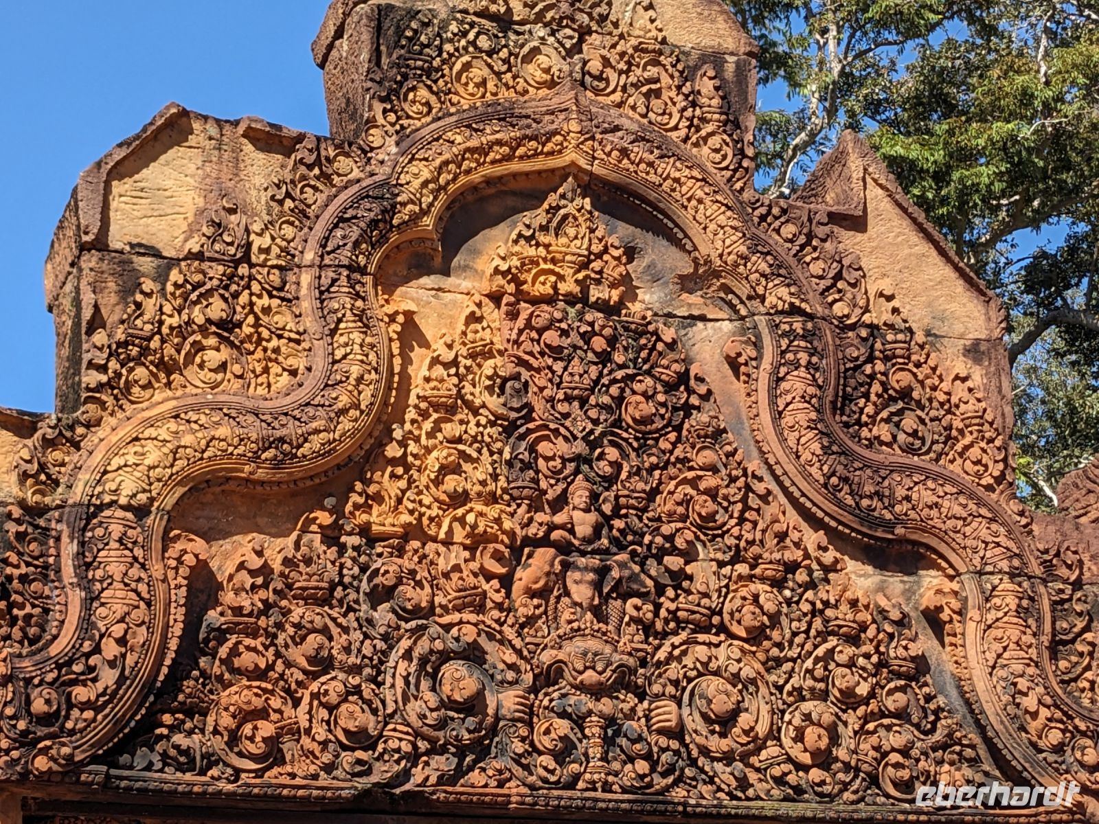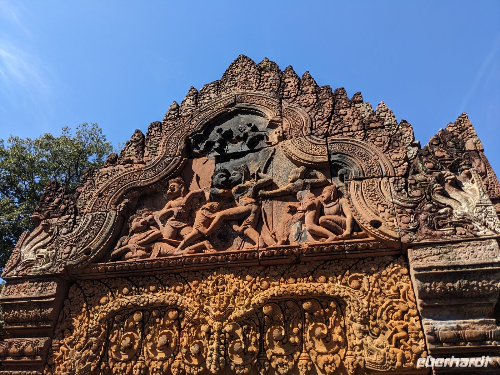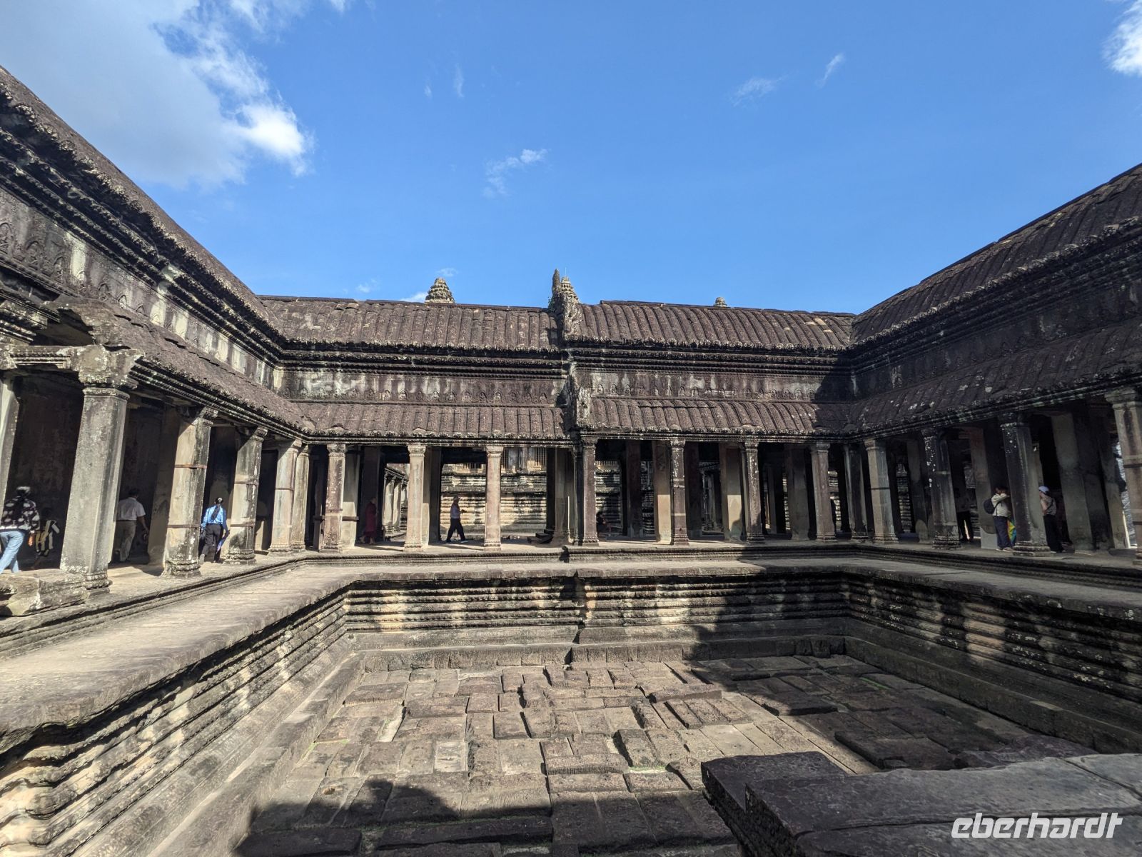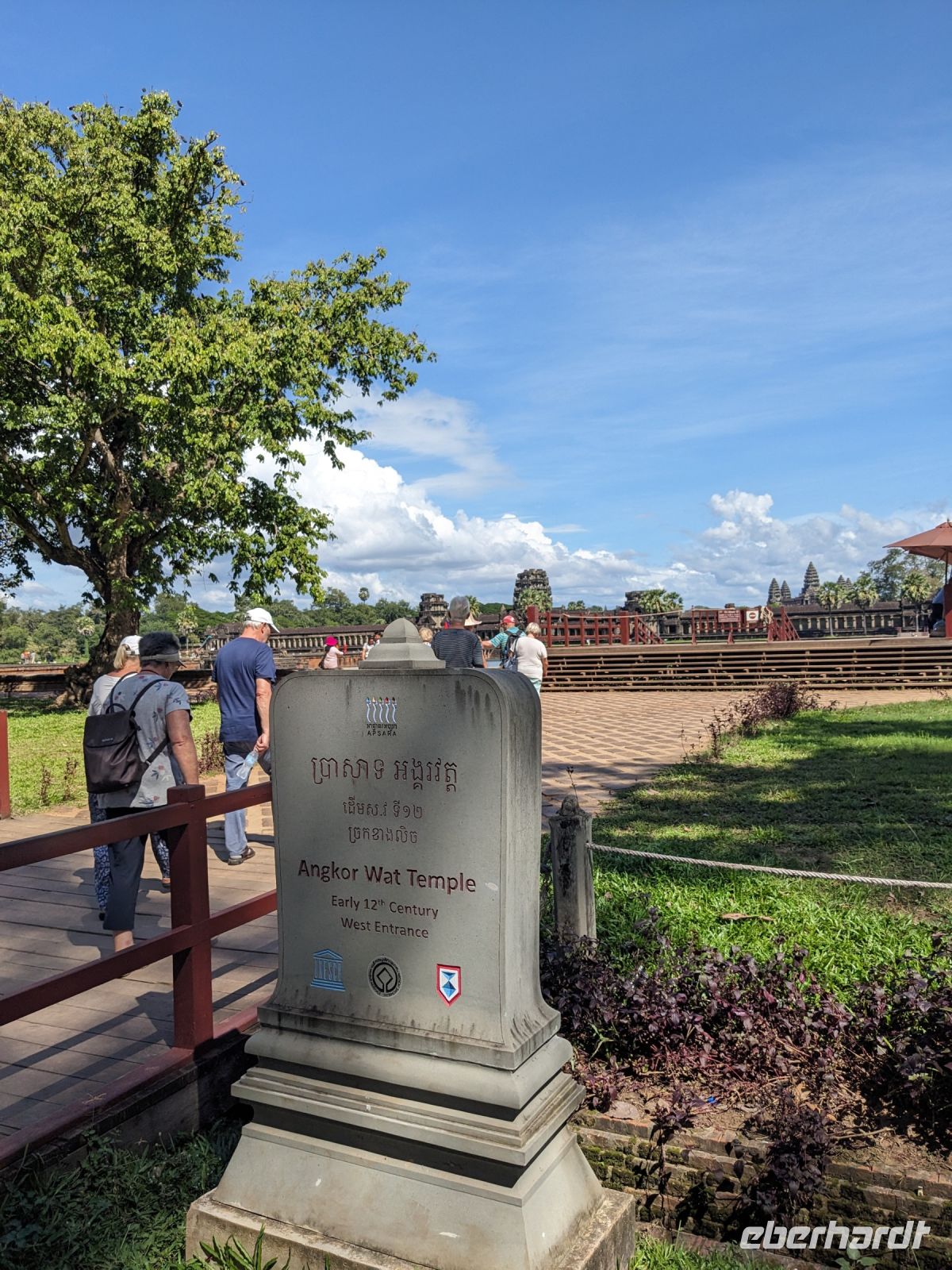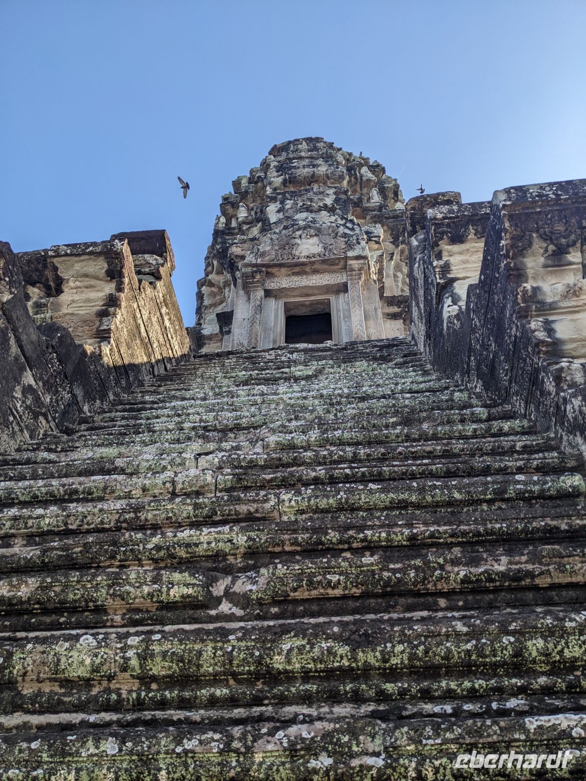 Der letzte volle Reisetag war angebrochen und was wäre ein besserer Abschluss als Angkor Wat selbst. Ein Großteil der Gruppe traf sich bereits zur Bestaunung des Sonnenaufgangs auf der Anlage. Langsam, Stück für Stück, schlich die Sonne immer weiter nach oben und tauchte schließlich über den Wäldern neben dem Haupttempel auf. Es gibt zwei Tage im Jahr (einmal im März und einmal im September), wo die Sonne direkt mittig über dem Tempel aufgeht. Anschließend ging es zurück ins Hotel zum Frühstücken, wo wir auf den Rest der Gruppe trafen. Gemeinsam zogen wir los zum Banteay Schrein, ein sehr kleiner Tempel mit vielen detailreichen Verzierungen. Auf dem Rückweg stoppten wir bei einem Palmzuckerverarbeiter. Hier konnten wir auch probieren und bei der Herstellung zuschauen. Fast jeder fand ein schönes Mitbringsel für Zuhause. Im Namen von Eberhardt TRAVEL gab es dann eine typisch kambodschanische Nudelsuppe zum Mittag und gut gestärkt, erkundeten wir schließlich Angkor Wat. Anders als am Morgen gingen wir in die Tempelanlage hinein und Lim machte mit uns eine ausführliche Tour. Im Haupttempel stieß der Großteil der Gruppe bis auf die dritte Etage hoch - doch die steilen Stufen waren es wert - von oben hatten wir einen tollen Ausblick auf die Umgebung. Am Abend erwartete uns dann unser letzten gemeinsames Abendessen in einem wirklich sehr schön gestalteten Restaurant, was wir ganz für uns allein hatten.
