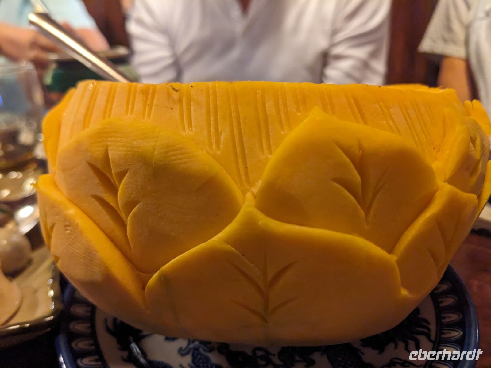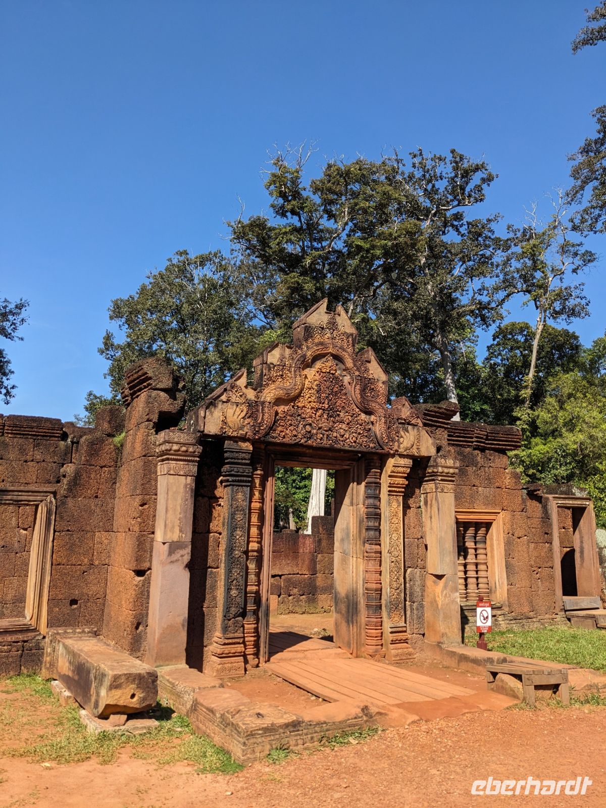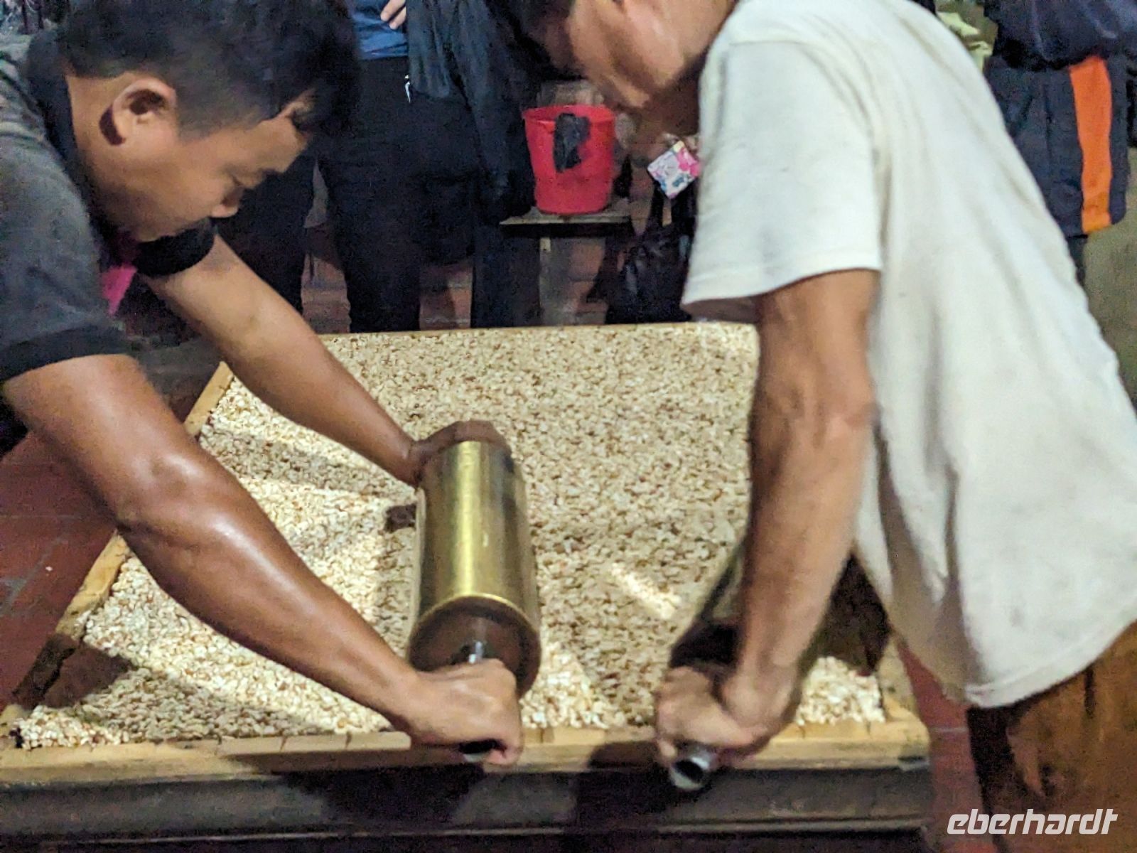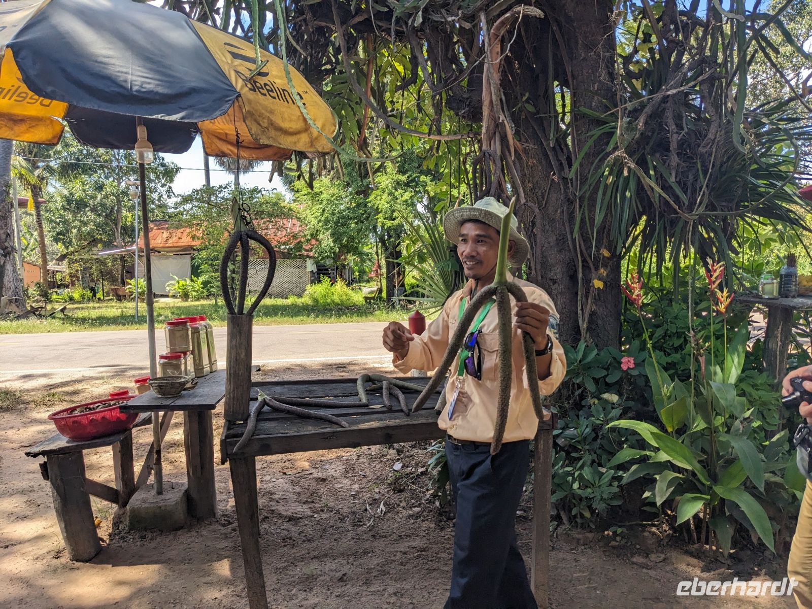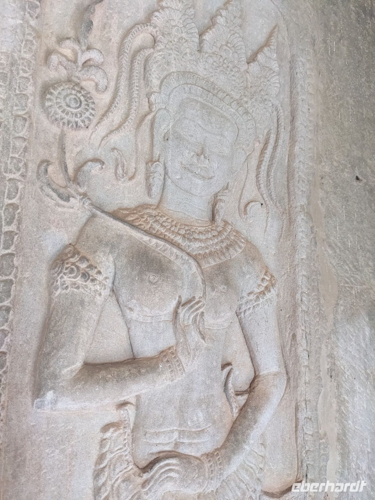 Der letzte volle Reisetag war angebrochen und was wäre ein besserer Abschluss als Angkor Wat selbst. Ein Großteil der Gruppe traf sich bereits zur Bestaunung des Sonnenaufgangs auf der Anlage. Langsam, Stück für Stück, schlich die Sonne immer weiter nach oben und tauchte schließlich über den Wäldern neben dem Haupttempel auf. Es gibt zwei Tage im Jahr (einmal im März und einmal im September), wo die Sonne direkt mittig über dem Tempel aufgeht. Anschließend ging es zurück ins Hotel zum Frühstücken, wo wir auf den Rest der Gruppe trafen. Gemeinsam zogen wir los zum Banteay Schrein, ein sehr kleiner Tempel mit vielen detailreichen Verzierungen. Auf dem Rückweg stoppten wir bei einem Palmzuckerverarbeiter. Hier konnten wir auch probieren und bei der Herstellung zuschauen. Fast jeder fand ein schönes Mitbringsel für Zuhause. Im Namen von Eberhardt TRAVEL gab es dann eine typisch kambodschanische Nudelsuppe zum Mittag und gut gestärkt, erkundeten wir schließlich Angkor Wat. Anders als am Morgen gingen wir in die Tempelanlage hinein und Lim machte mit uns eine ausführliche Tour. Im Haupttempel stieß der Großteil der Gruppe bis auf die dritte Etage hoch - doch die steilen Stufen waren es wert - von oben hatten wir einen tollen Ausblick auf die Umgebung. Am Abend erwartete uns dann unser letzten gemeinsames Abendessen in einem wirklich sehr schön gestalteten Restaurant, was wir ganz für uns allein hatten.