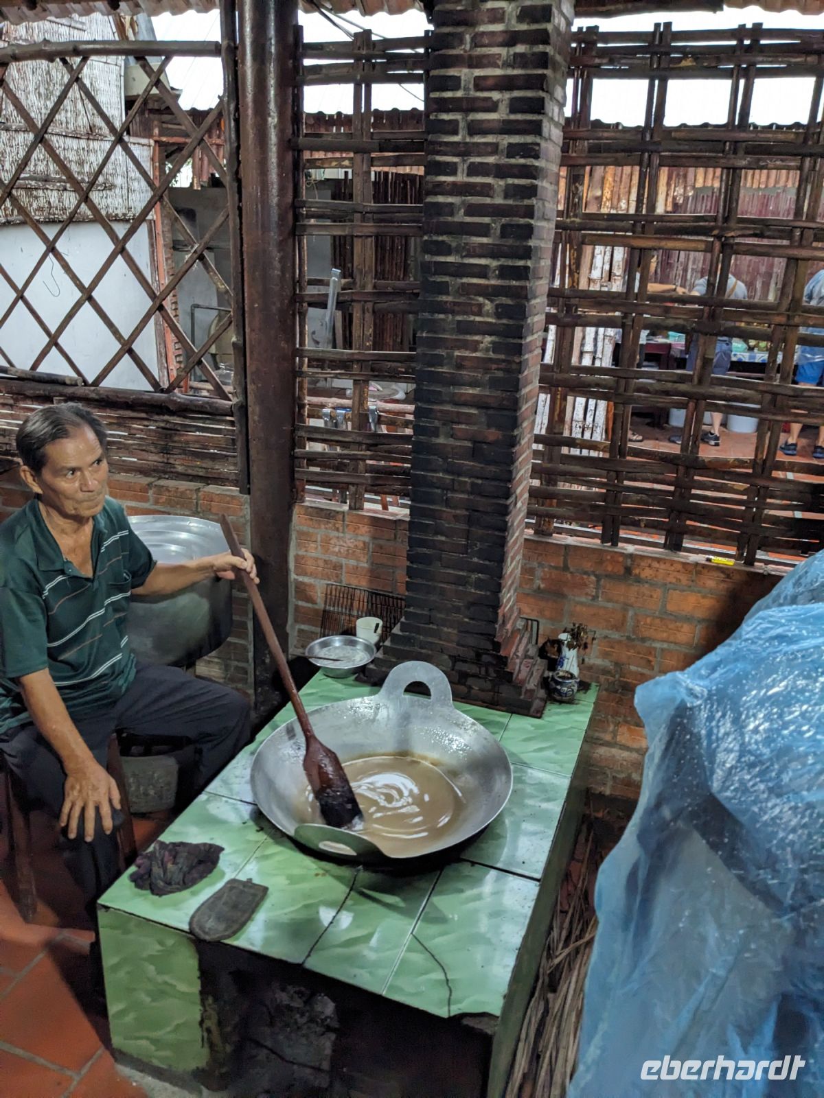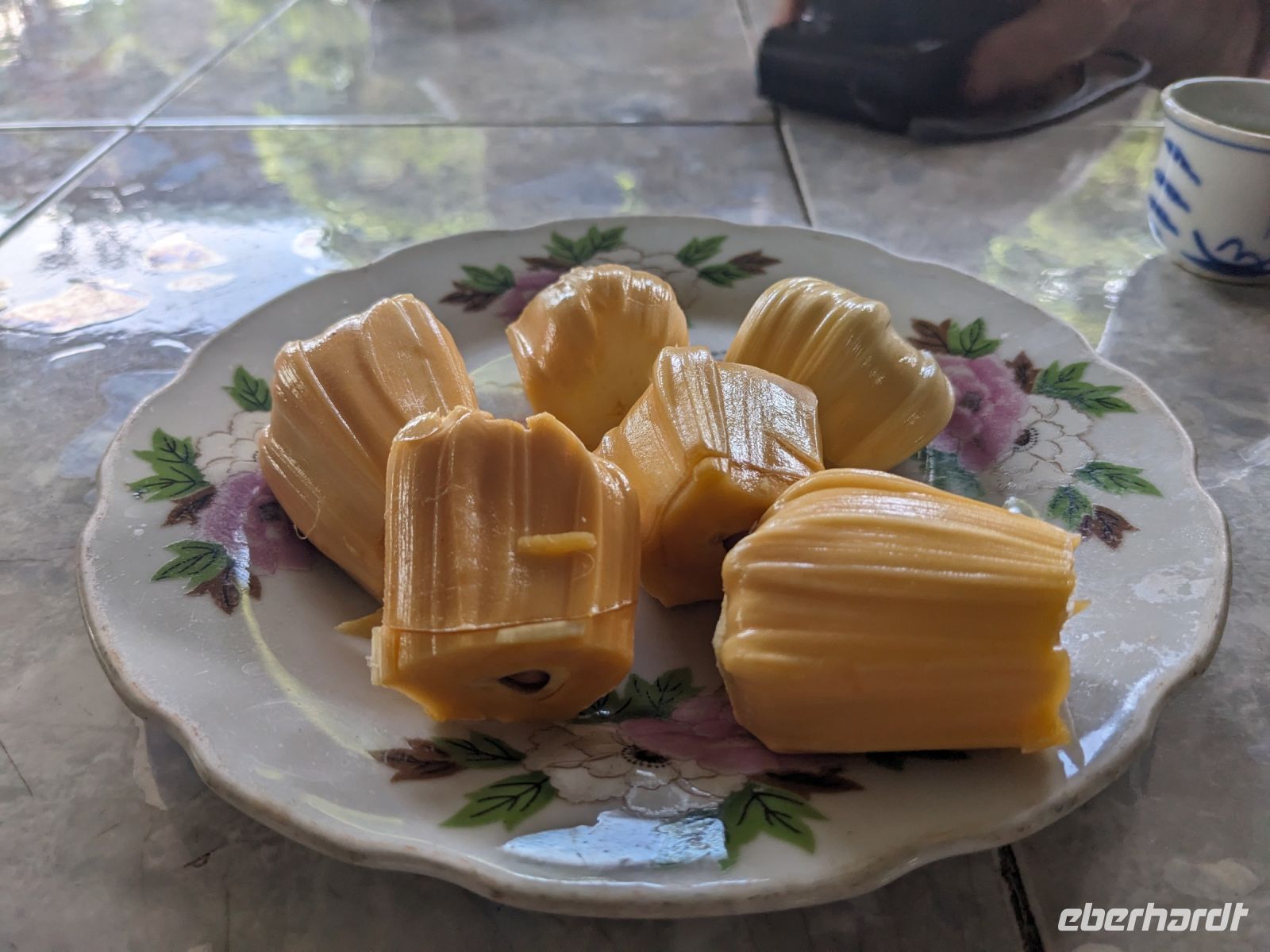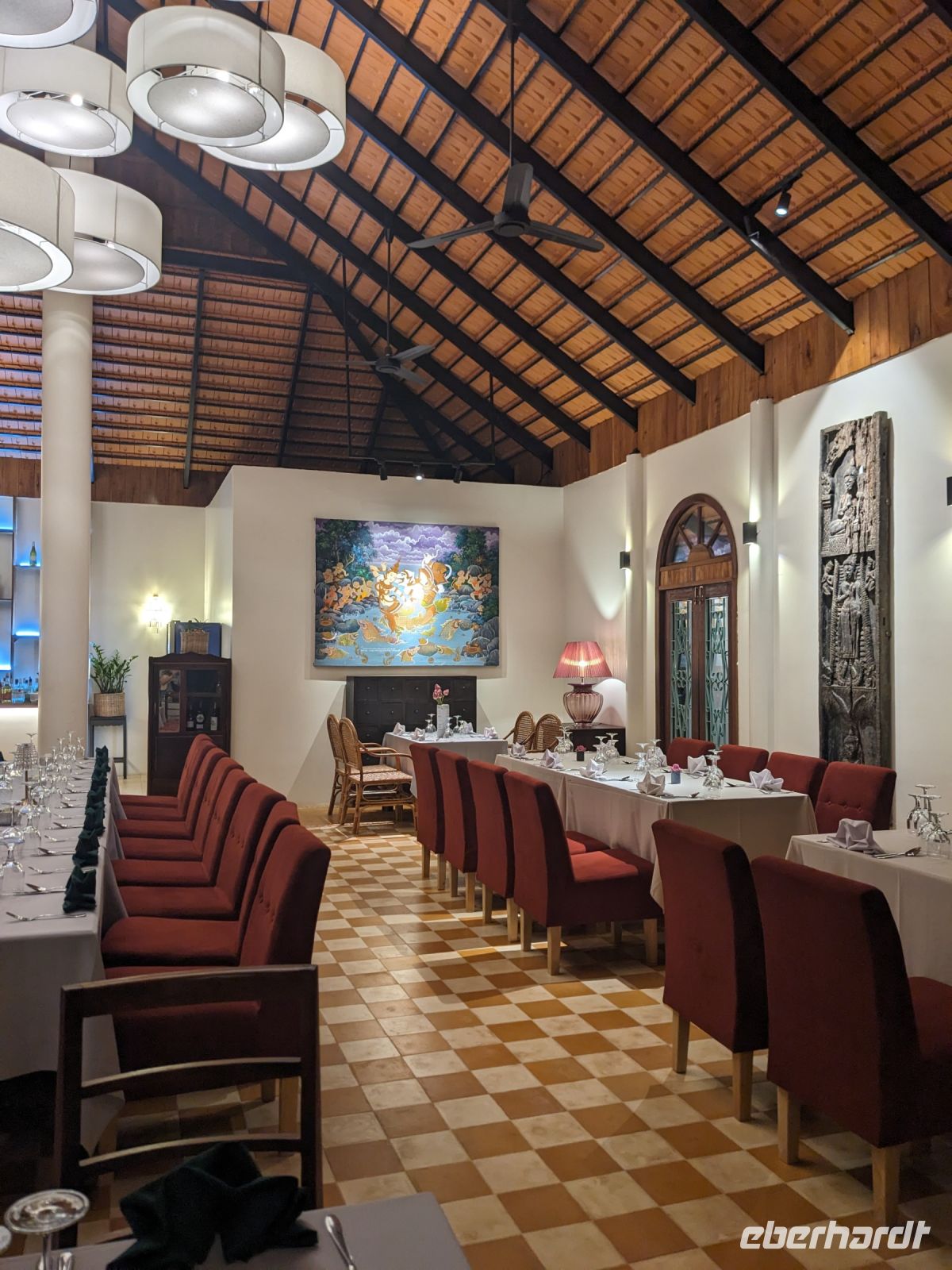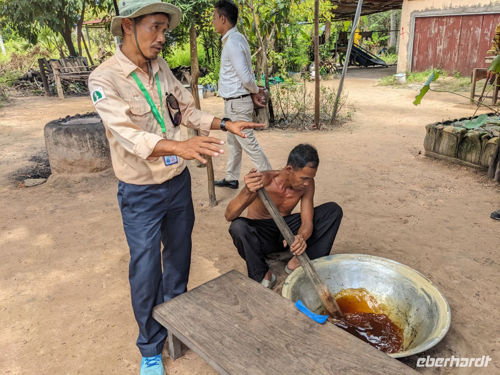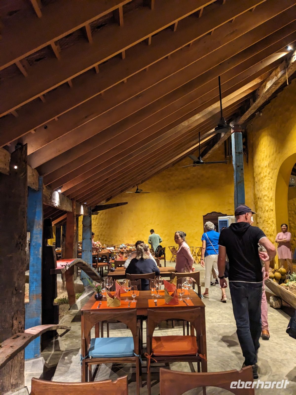 Der letzte volle Reisetag war angebrochen und was wäre ein besserer Abschluss als Angkor Wat selbst. Ein Großteil der Gruppe traf sich bereits zur Bestaunung des Sonnenaufgangs auf der Anlage. Langsam, Stück für Stück, schlich die Sonne immer weiter nach oben und tauchte schließlich über den Wäldern neben dem Haupttempel auf. Es gibt zwei Tage im Jahr (einmal im März und einmal im September), wo die Sonne direkt mittig über dem Tempel aufgeht. Anschließend ging es zurück ins Hotel zum Frühstücken, wo wir auf den Rest der Gruppe trafen. Gemeinsam zogen wir los zum Banteay Schrein, ein sehr kleiner Tempel mit vielen detailreichen Verzierungen. Auf dem Rückweg stoppten wir bei einem Palmzuckerverarbeiter. Hier konnten wir auch probieren und bei der Herstellung zuschauen. Fast jeder fand ein schönes Mitbringsel für Zuhause. Im Namen von Eberhardt TRAVEL gab es dann eine typisch kambodschanische Nudelsuppe zum Mittag und gut gestärkt, erkundeten wir schließlich Angkor Wat. Anders als am Morgen gingen wir in die Tempelanlage hinein und Lim machte mit uns eine ausführliche Tour. Im Haupttempel stieß der Großteil der Gruppe bis auf die dritte Etage hoch - doch die steilen Stufen waren es wert - von oben hatten wir einen tollen Ausblick auf die Umgebung. Am Abend erwartete uns dann unser letzten gemeinsames Abendessen in einem wirklich sehr schön gestalteten Restaurant, was wir ganz für uns allein hatten.