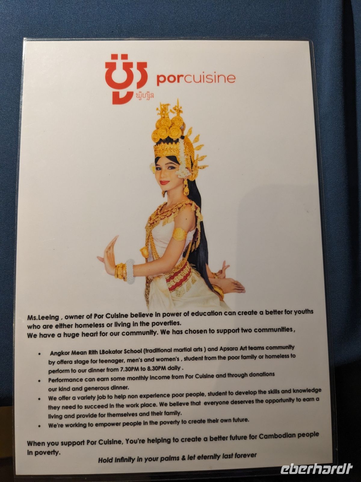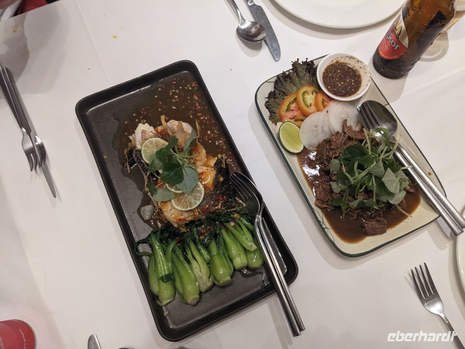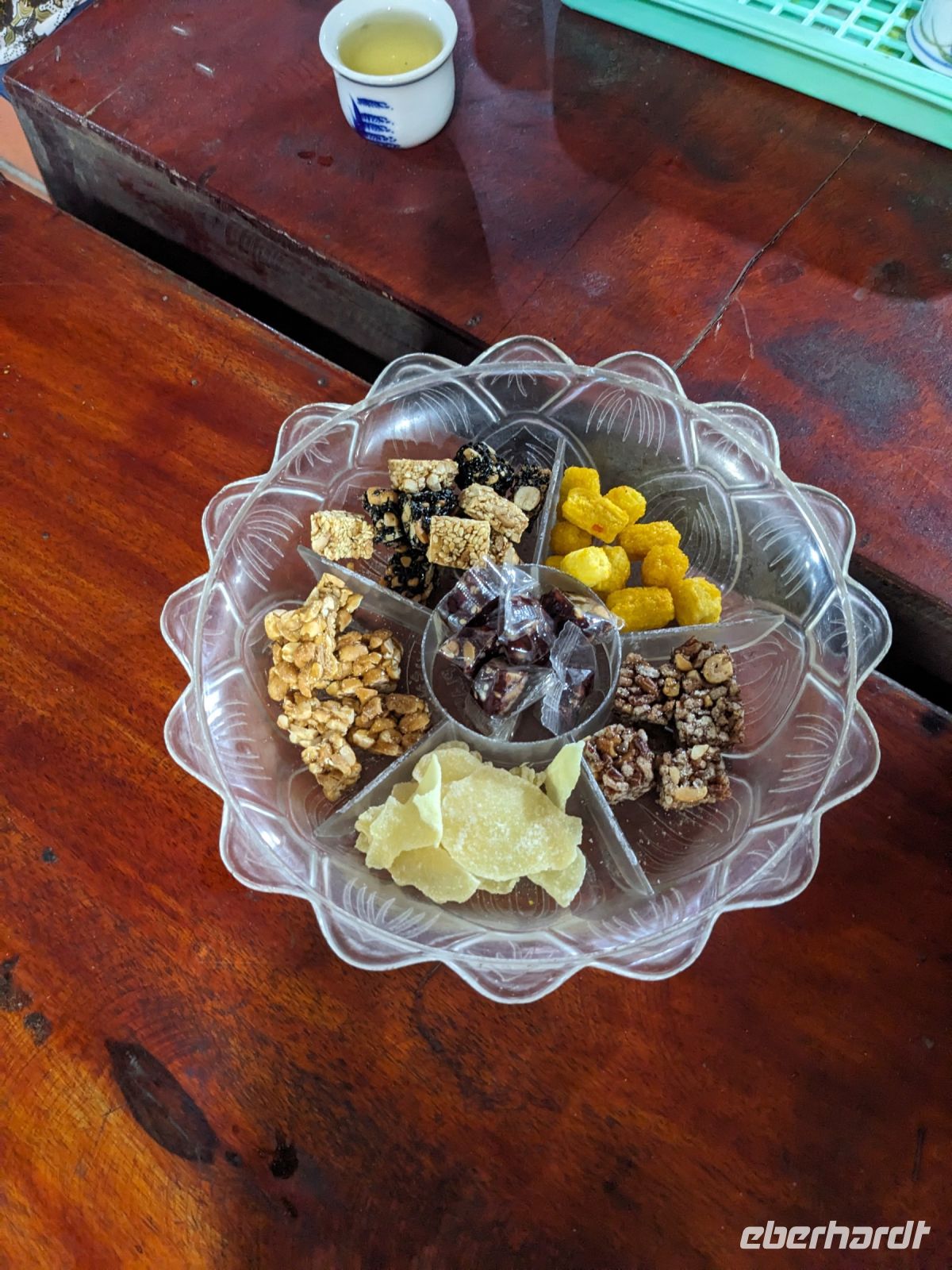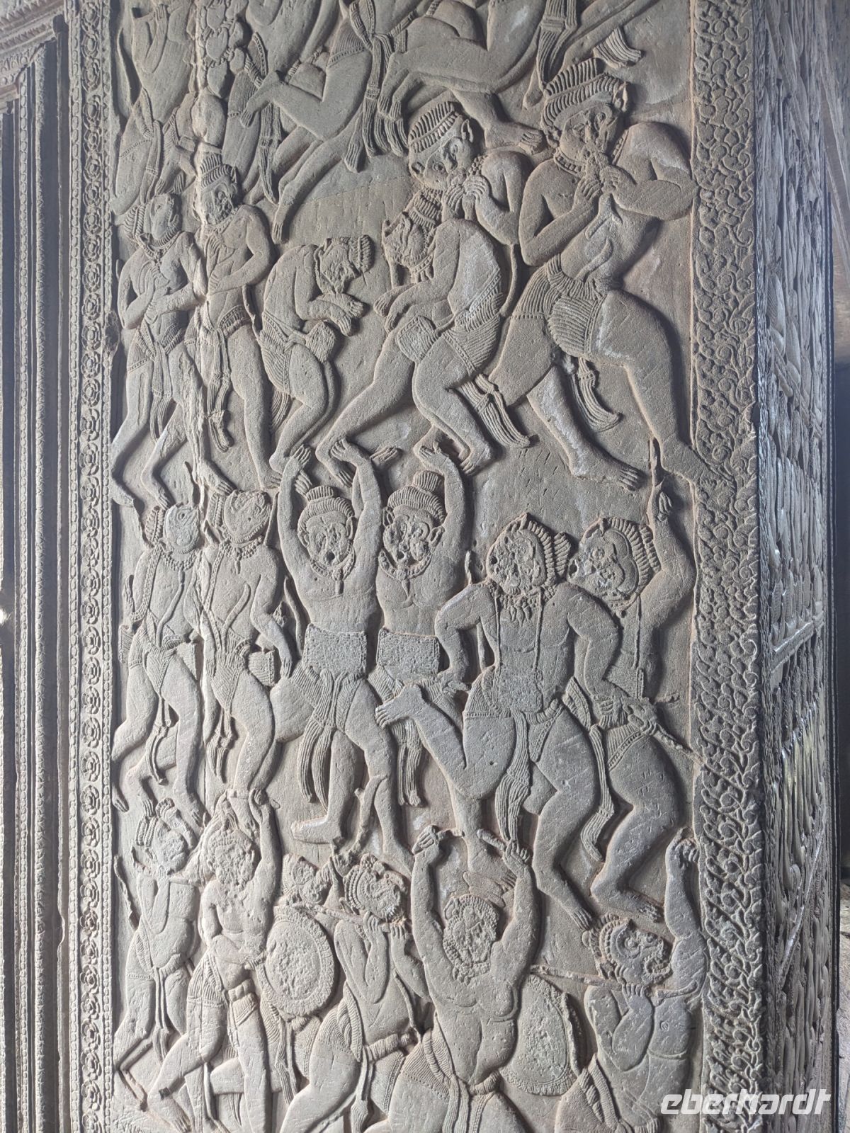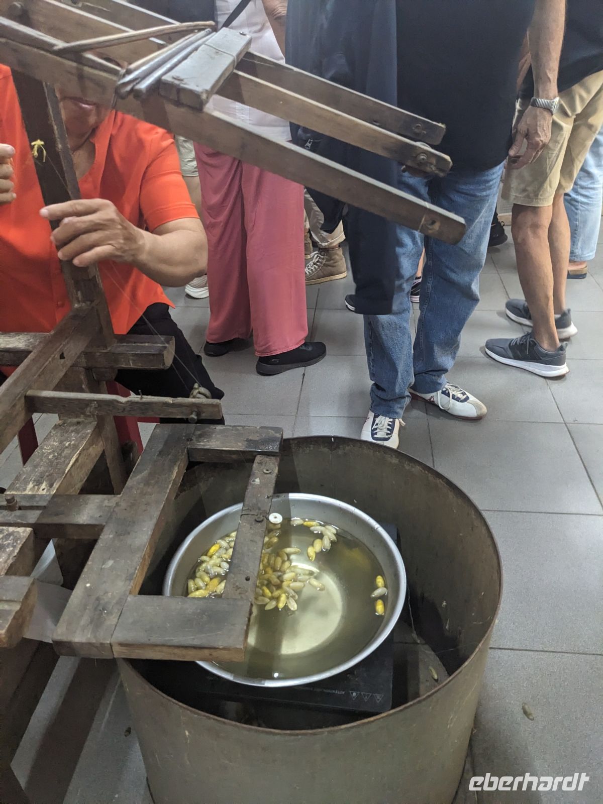 Der letzte volle Reisetag war angebrochen und was wäre ein besserer Abschluss als Angkor Wat selbst. Ein Großteil der Gruppe traf sich bereits zur Bestaunung des Sonnenaufgangs auf der Anlage. Langsam, Stück für Stück, schlich die Sonne immer weiter nach oben und tauchte schließlich über den Wäldern neben dem Haupttempel auf. Es gibt zwei Tage im Jahr (einmal im März und einmal im September), wo die Sonne direkt mittig über dem Tempel aufgeht. Anschließend ging es zurück ins Hotel zum Frühstücken, wo wir auf den Rest der Gruppe trafen. Gemeinsam zogen wir los zum Banteay Schrein, ein sehr kleiner Tempel mit vielen detailreichen Verzierungen. Auf dem Rückweg stoppten wir bei einem Palmzuckerverarbeiter. Hier konnten wir auch probieren und bei der Herstellung zuschauen. Fast jeder fand ein schönes Mitbringsel für Zuhause. Im Namen von Eberhardt TRAVEL gab es dann eine typisch kambodschanische Nudelsuppe zum Mittag und gut gestärkt, erkundeten wir schließlich Angkor Wat. Anders als am Morgen gingen wir in die Tempelanlage hinein und Lim machte mit uns eine ausführliche Tour. Im Haupttempel stieß der Großteil der Gruppe bis auf die dritte Etage hoch - doch die steilen Stufen waren es wert - von oben hatten wir einen tollen Ausblick auf die Umgebung. Am Abend erwartete uns dann unser letzten gemeinsames Abendessen in einem wirklich sehr schön gestalteten Restaurant, was wir ganz für uns allein hatten.