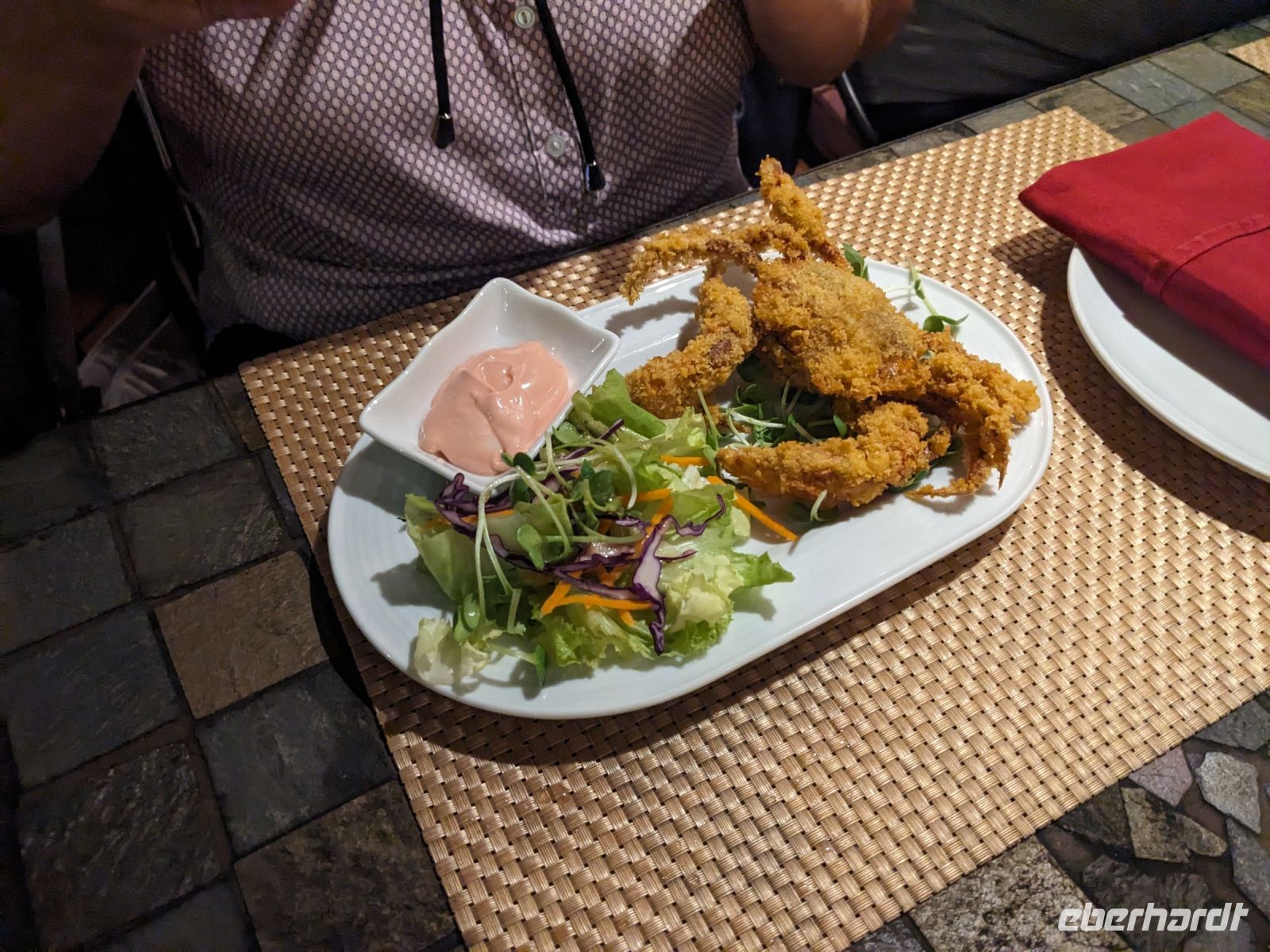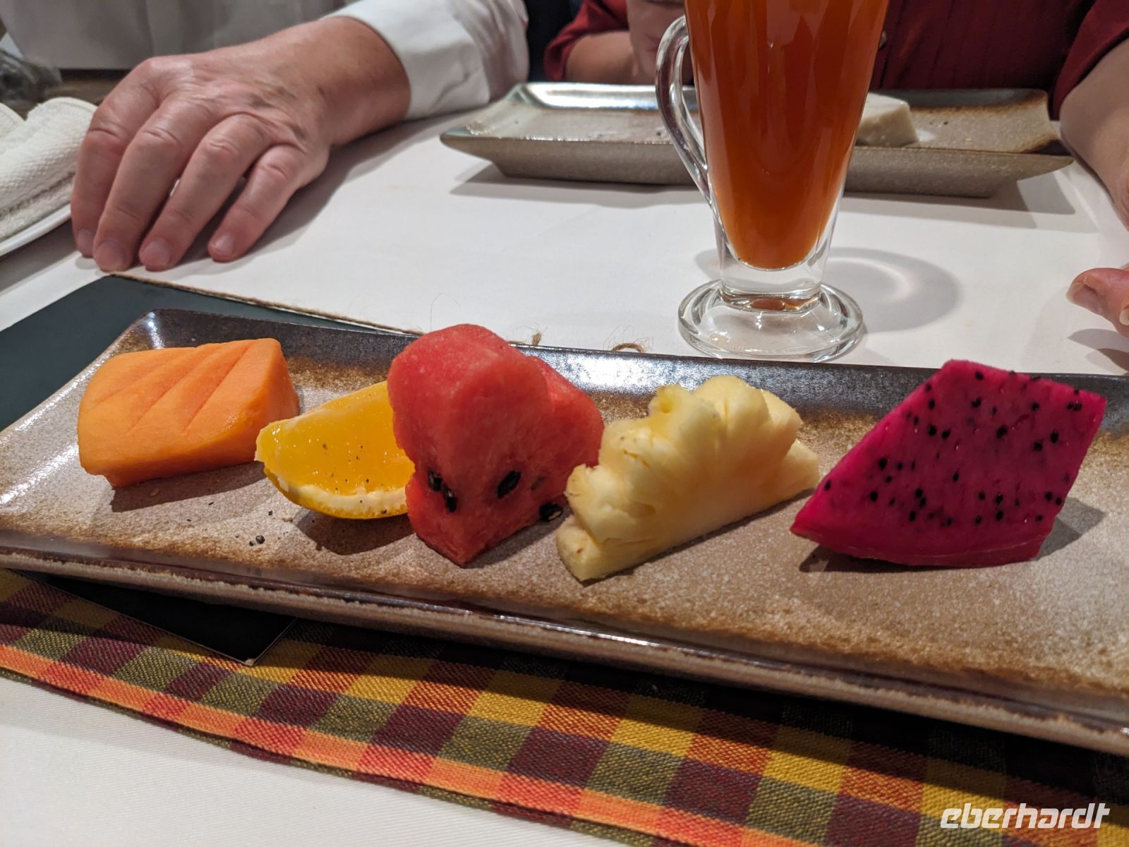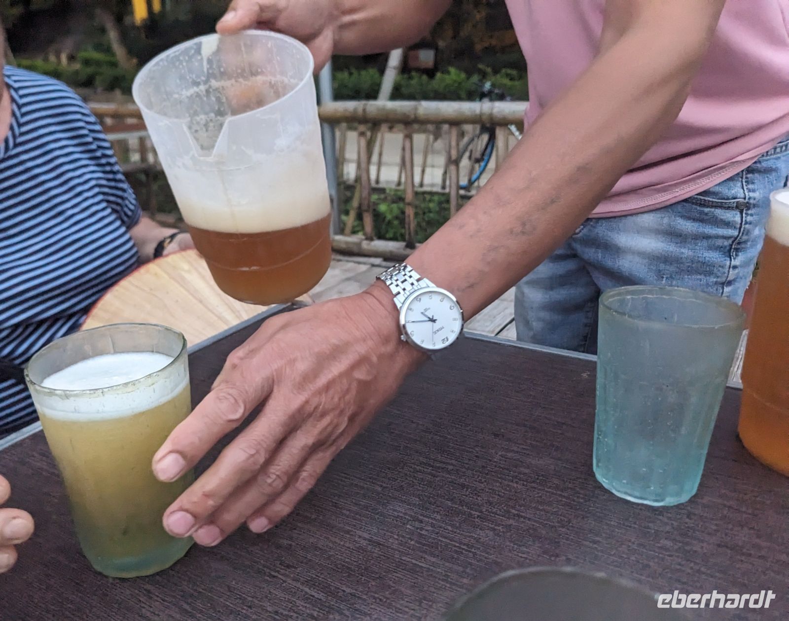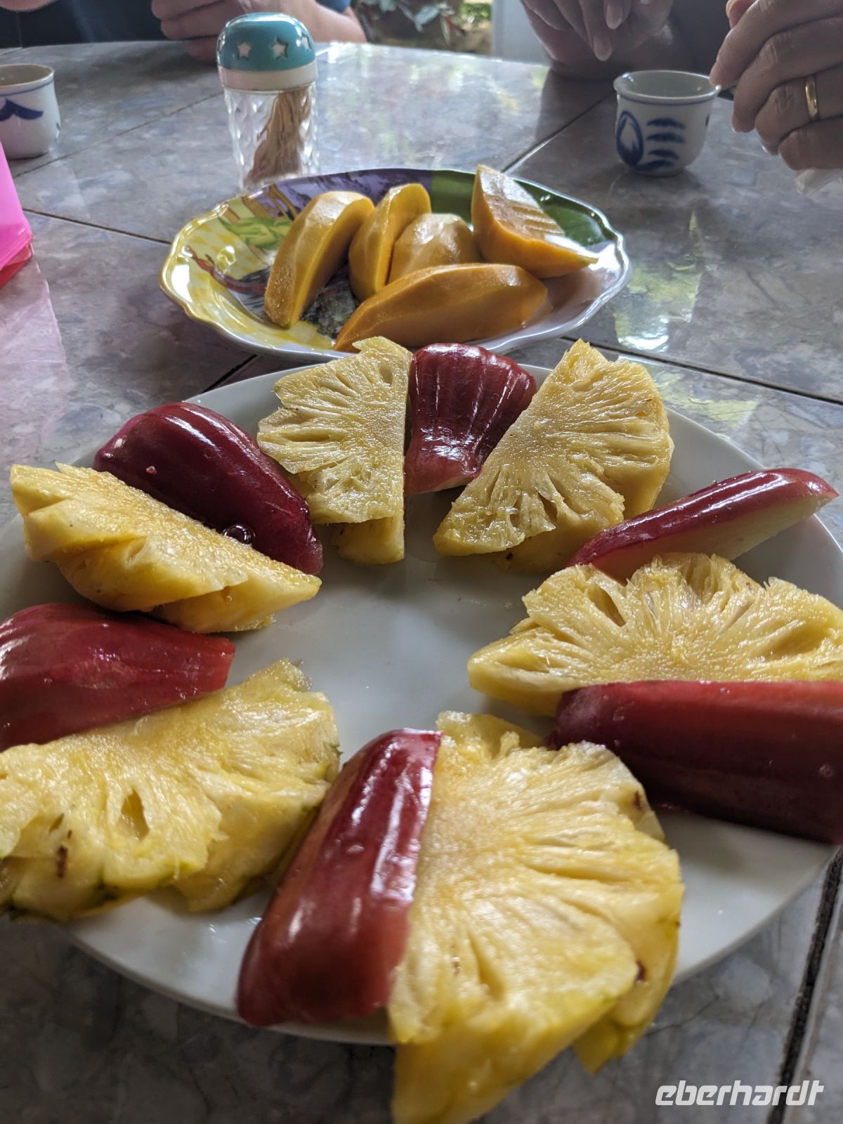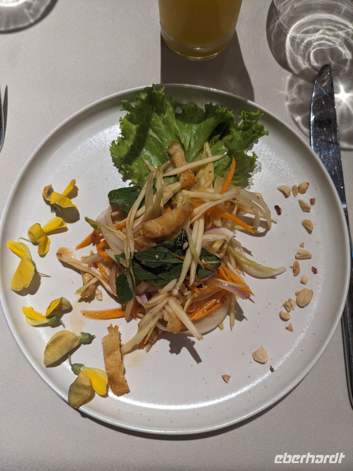 Der letzte volle Reisetag war angebrochen und was wäre ein besserer Abschluss als Angkor Wat selbst. Ein Großteil der Gruppe traf sich bereits zur Bestaunung des Sonnenaufgangs auf der Anlage. Langsam, Stück für Stück, schlich die Sonne immer weiter nach oben und tauchte schließlich über den Wäldern neben dem Haupttempel auf. Es gibt zwei Tage im Jahr (einmal im März und einmal im September), wo die Sonne direkt mittig über dem Tempel aufgeht. Anschließend ging es zurück ins Hotel zum Frühstücken, wo wir auf den Rest der Gruppe trafen. Gemeinsam zogen wir los zum Banteay Schrein, ein sehr kleiner Tempel mit vielen detailreichen Verzierungen. Auf dem Rückweg stoppten wir bei einem Palmzuckerverarbeiter. Hier konnten wir auch probieren und bei der Herstellung zuschauen. Fast jeder fand ein schönes Mitbringsel für Zuhause. Im Namen von Eberhardt TRAVEL gab es dann eine typisch kambodschanische Nudelsuppe zum Mittag und gut gestärkt, erkundeten wir schließlich Angkor Wat. Anders als am Morgen gingen wir in die Tempelanlage hinein und Lim machte mit uns eine ausführliche Tour. Im Haupttempel stieß der Großteil der Gruppe bis auf die dritte Etage hoch - doch die steilen Stufen waren es wert - von oben hatten wir einen tollen Ausblick auf die Umgebung. Am Abend erwartete uns dann unser letzten gemeinsames Abendessen in einem wirklich sehr schön gestalteten Restaurant, was wir ganz für uns allein hatten.