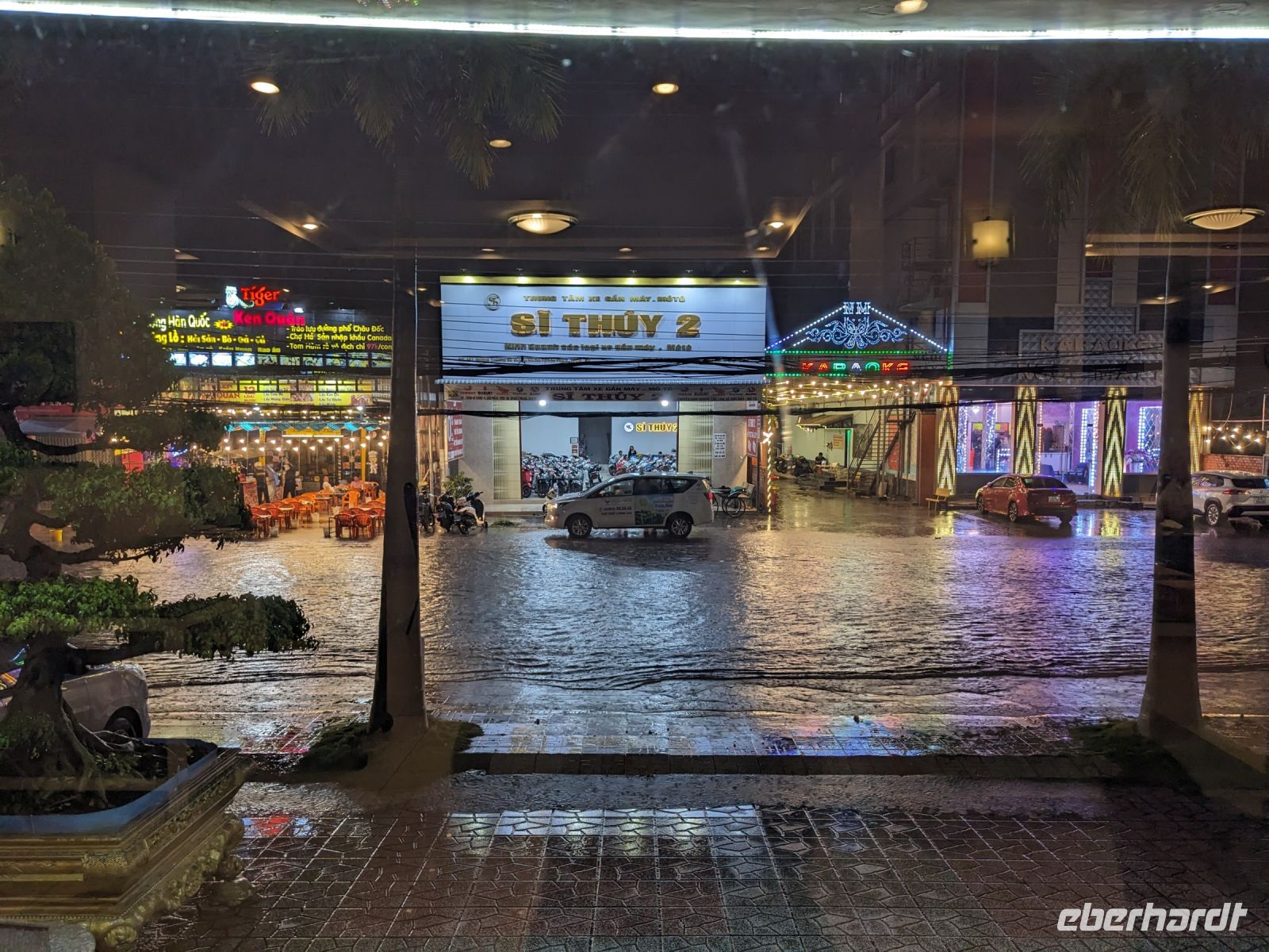 Ein Motorboot brachte uns zu einem der schwimmenden Märkte der Region. An den langen Stäben auf jedem Boot waren die Produkte befestigt, die dort verkauft wurden, sodass man sie schon von Weitem sehen konnte. Faszinierender als die Lebensmittel fand ich jedoch den Einblick in die Lebensweise der Leute dort - ein Leben so fernab von dem, wie wir es kennen - der Fluss als Lebenselixier. Hier wird abgewaschen, gebaden, das Geschäft verrichtet ... Wir drehten mit unserem Boot eine Runde und legten dann an. Um zurück zum Bus zu kommen, liefen wir über einen riesigen Markt. Hier wurde einem das Herz schwer beim Anblick der Tierhaltung - viele Eindrücke prasselten auf uns ein und wir waren froh, als wir den Markt schließlich hinter uns gelassen hatten. Doch auch das gehört zum Land dazu! Trong erklärte uns, dass es sich hierbei um einen typischen lokalen Markt handelt und alles, was wir gesehen haben, dem Alltag in Vietnam angehört. Unsere Rundreise führte uns dann weiter in den Nationalpark Tra Su, wo wir den wunderschönen Eukalyptus- und Mangrovenwald vom Boot aus bestaunen konnten. Erst ging es mit Ruderbooten durch die eindrucksvolle Landschaft. Hier waren unzählige Vögel auszumachen - eine wirklich tolle Kulisse. Auch der Orchideengarten an der Anlegestelle sorgte bei uns für Begeisterung. Die wunderschön gepflegte Anlage bot eine erstaunliche Vielfalt. Mit Motorbooten erlebten wir dann noch die Fahrt zu einem Aussichtsturm, von dem aus wir von oben einen Blick auf den Park werfen konnten. Nach diesem tollen Erlebnis fuhren wir in unser Hotel in Chau Doc und bereiteten uns für den Grenzübertritt nach Kambodscha am Folgetag vor. Eine Besonderheit an diesem Abend war noch der starke Regenguss zum Abendessen, sodass das Hotelrestaurant sogar seine Rollladen runterzog, damit das Wasser nicht reindrückte. Auf der Straße draußen bildete sich aus einem anfänglichen Rinnsal ein ganzer Fluss.