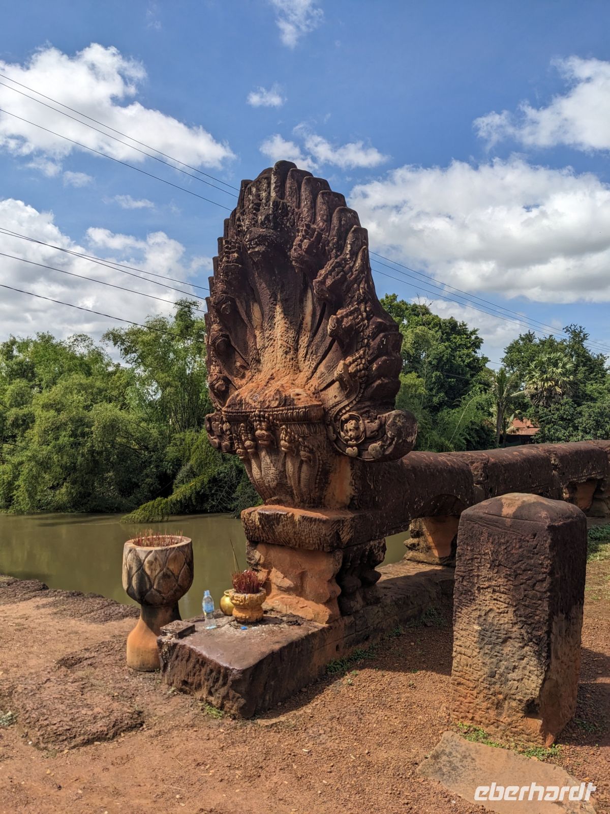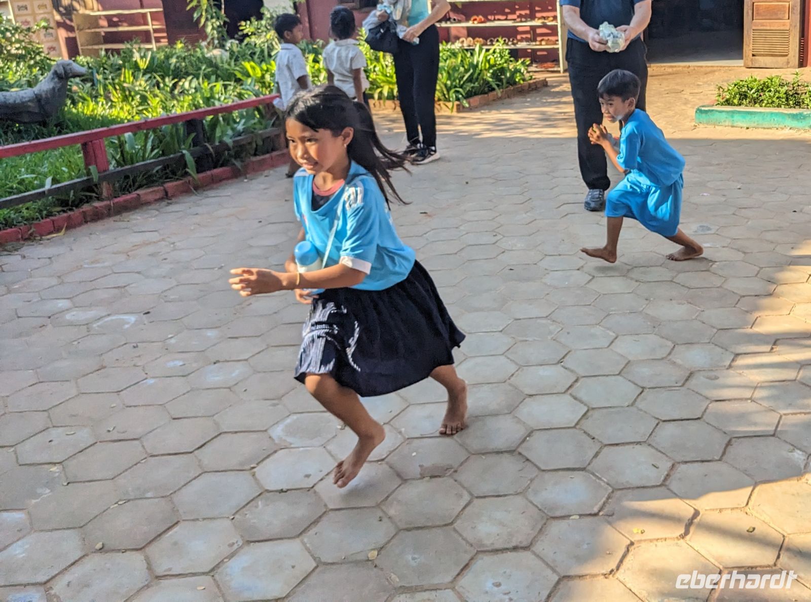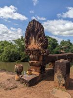 Auf dem langen Weg nach Siem Reap nutzte Chhim die Chance uns mehr über die Gewaltherrschaft der Roten Khmer zu erzählen, welche er selbst als Kind miterlebt hat. Eine unglaublich bewegende Geschichte mit dem Einfluss persönlicher Erlebnisse folgte. Als jemand, der selbst zum Glück noch nie so etwas miterleben musste, fällt es einem schwer, nachzuvollziehen, wie Menschen zu solchen Gräueltaten in der Lage sind. Tief bewegt, machten wir unseren ersten Stopp an der Naga-Brücke aus dem 12. Jahrhundert. Anschließend fuhren wir weiter zu einer Grundschule in der Nähe von Siem Reap und statteten den Kindern hier einen Besuch ab. Bei einer kurzen Einführung in einem leeren Klassenraum gab uns der Direktor nähere Informationen zur Schule und es bestand auch die Möglichkeit Fragen zu stellen. Anschließend besuchten wir zwei Klassenräume, die Kinder führten uns etwas vor, man lächelte sich vorsichtig an, Süßigkeiten sowie andere Mitbringsel wurden verteilt. Leider bekam hier nicht jeder etwas ab. Die Schule insgesamt machte einen guten Eindruck. Hier trafen wir dann auch auf unseren letzten Reiseleiter Lim. Angekommen im Hotel in Siem Reap verabschiedeten wir uns schweren Herzens von Chhim, welche wieder zurück nach Phnom Penh fuhr und verabredeten uns mit Lim zum Abendessen.