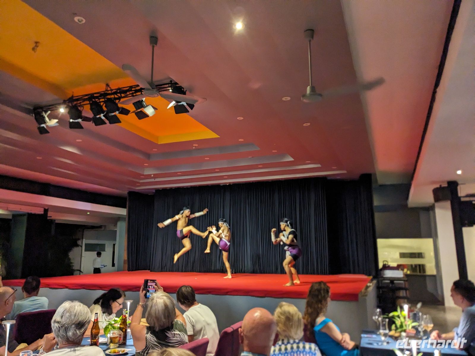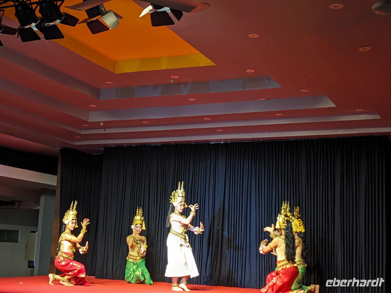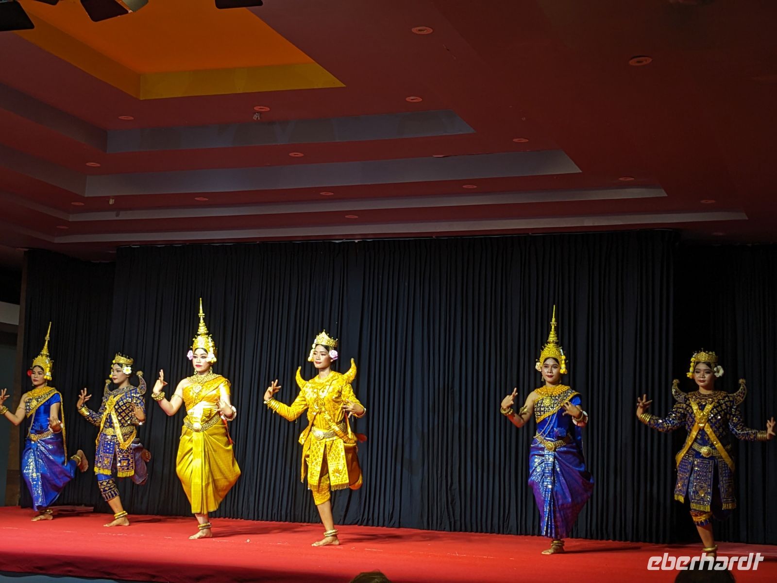 Aufgrund eines Feiertags hatte sich hier das ursprüngliche Programm etwas verändert, was dem Ganzen aber keinen Abbruch tat. Zunächst ging es für uns erstmal Tickets holen, wofür wir freundlich in die Kamera lächeln durften. Anschließend konnten wir die Anlage erkunden. Der Bus brachte uns zunächst auf das Gelände des Angkor Thoms zum Königspalast Bayon, wo uns Lim die vielfältigen Wandverzierungen in Form eines Reliefs und ihre Bedeutung erklärte. Hier waren unter anderem auch viele Himmelstänzer dargestellt. Auf dem Weg zur Elefantenterrasse begegneten uns dann zahlreiche Affen. Die Terrasse selbst war teilweise im Baugerüst, doch konnte man trotzdem gut die steinernen Riesen ausmachen. Mit dem Bus fuhren wir dann weiter, legten eine kurze Mittagspause ein und besichtigten schließlich den Dschungeltempel Ta Phrom. Auf dem Weg zur Anlage trafen wir auf Wasserbüffel, die wir hautnah bestaunen konnten. Am Tempel angekommen, kamen wir aus dem Staunen nicht mehr heraus. Riesige Bäume rankten sich in und um das Gemäuer und gaben der Anlage einen einzigartigen Look. Jeder Durchgang brachte uns zu einem neuen Innenhof - einer eindrucksvoller als der andere. Nach einem ausgiebigen Spaziergang traten wir den Rückweg an und nutzten die Zeit, um im Hotel zu entspannen. Für den heutigen Abend erwartete uns etwas ganz Besonderes: ein Abendessen mit einer Show von Himmelstänzern, eben jene, die es, beruhend auf dem Relief, auch schon zur damaligen Zeit gab. Die Aufführung war sehr eindrucksvoll, vor allem die zweite Darstellung der Krieger wirkte sehr kraftvoll und mitreißend, aber auch die ruhigen Tänze hatten ihre Magie durch die unterstützende Livemusik. Wir haben im Nachhinein teilweise versucht, die Handbewegungen nachzumachen, doch hier steckt jahrelange Übung dahinter - ein toller Tagesabschluss.