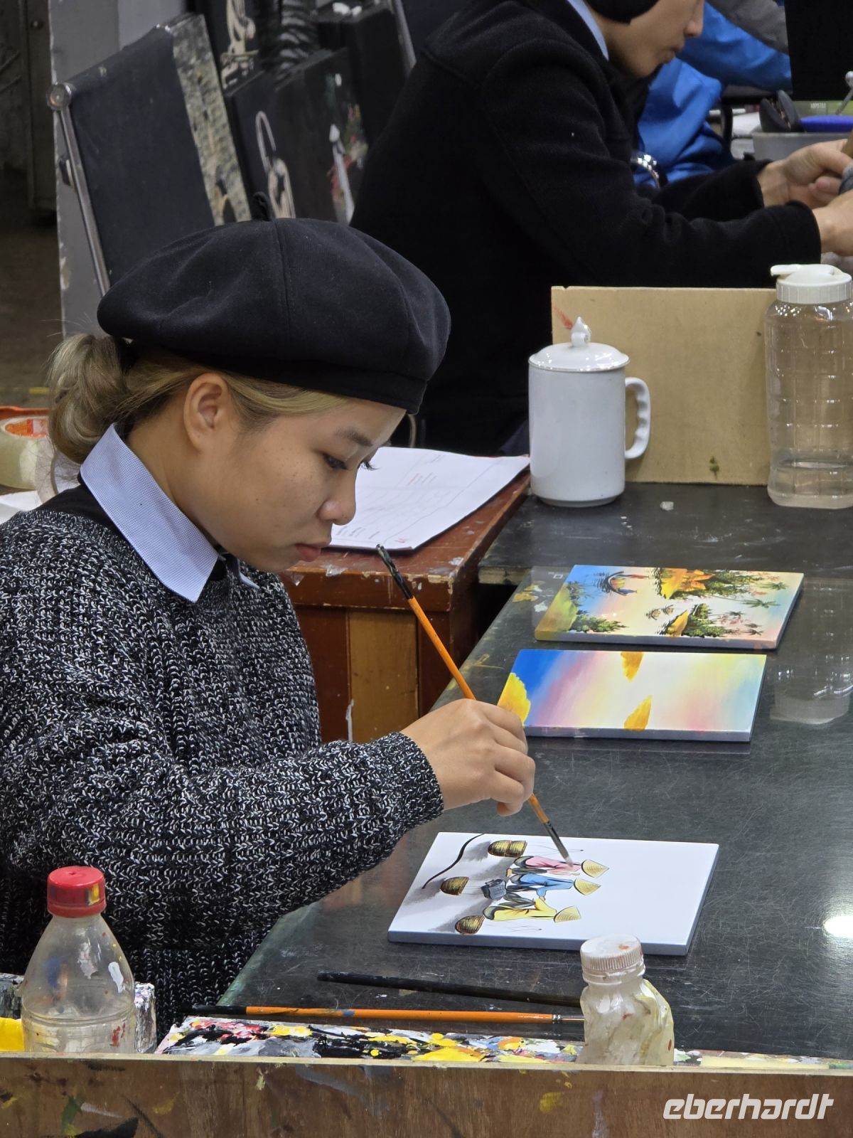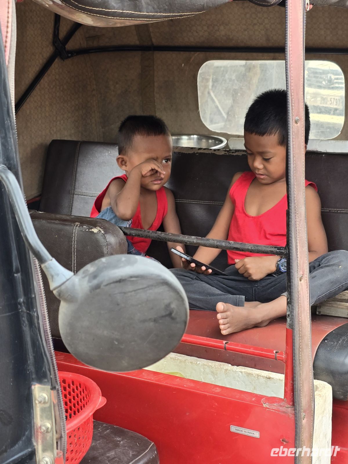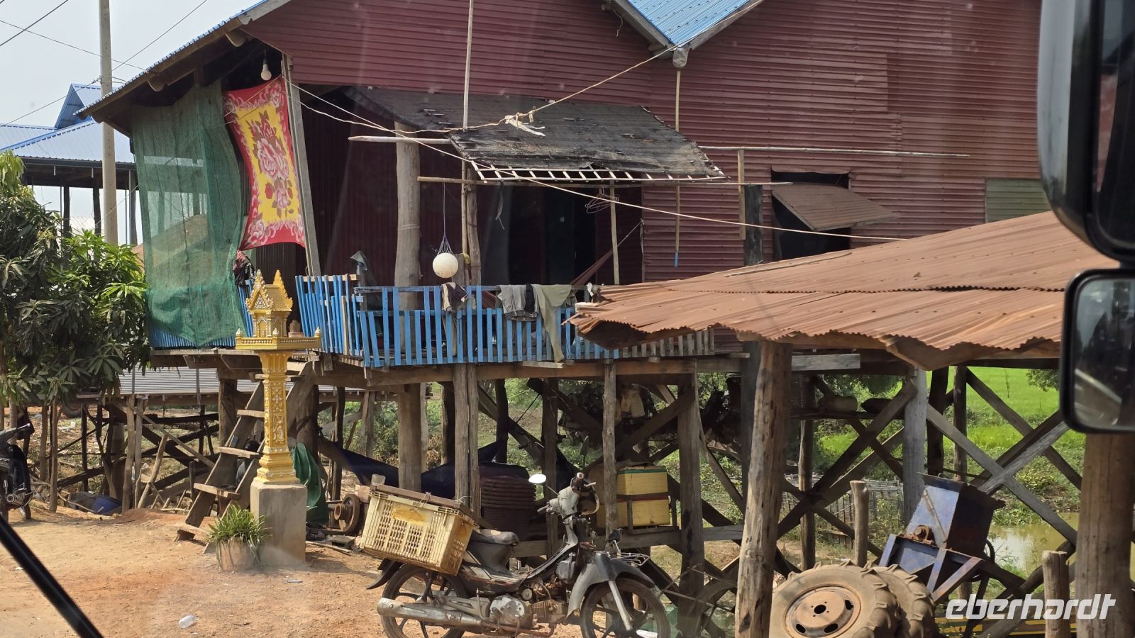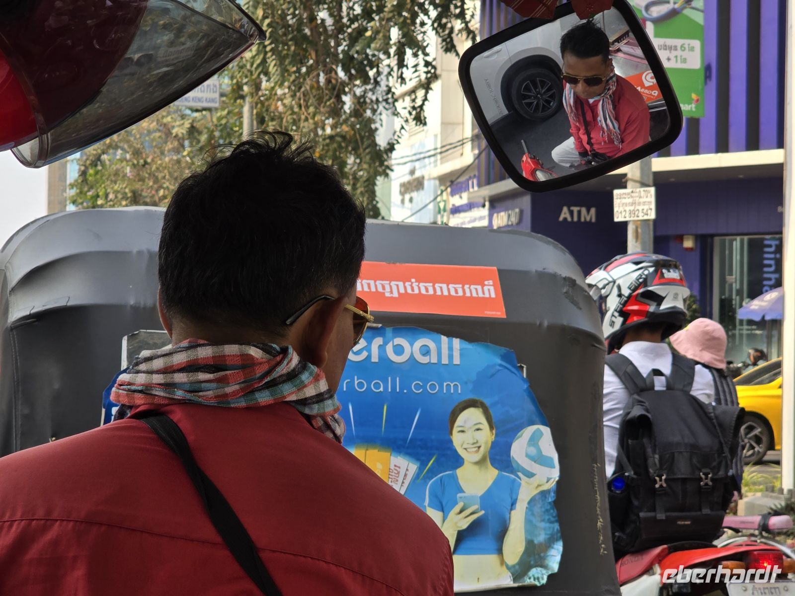 In der Vorstadt ist das Leben anders, nicht so hoch poliert, wie im Zentrum von Phnom Penh. Hier findet man sehr viel Kleinstindustrie, wie zum Beispiel Handwerker in Garagen die Mopeds repariert oder die Tuk Tuks. Sehr viel Reifen Handel und Montage, oder Produktion von Fensterrahmen die manuell ohne Hilfsmittel auf der Erde montiert werden. Und die Meinung zur Großindustrie trägt ein Arbeiter auf seinem T-Shirt geschrieben „Fuck the Industry“. Gemeint ist, sobald hier eine industrielle Fertigung ansiedelt wird, hier die Kleinen ihre Arbeit und ihre Werkstätten verlieren.