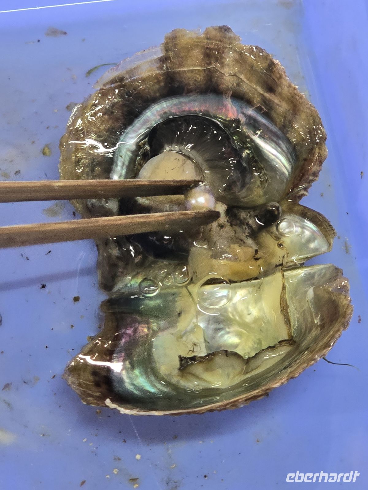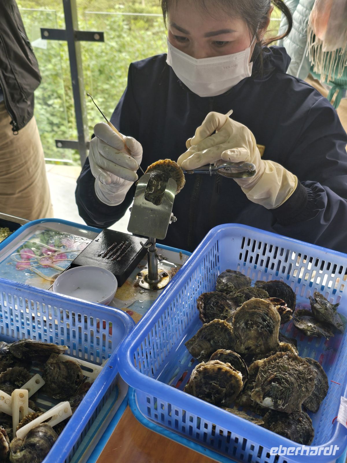 Während der Fahrt erkläre uns Chau die die einzelnen Stadtzentren die sich in der Peripherie von Hanoi, wie unabhängige Zentren neben der Metropole angesiedelt haben. In Richtung, Ha-Long Bucht kommen machen wir kleine Stopps. An einer Seidenspinner Fabrik, die die Herstellung des Stoffes vom Seidencocoon, das Trennen der super feinen Fäden bis zum Weben des Seidenstoffe zeigt. Und wenn die Kunden schon mal im Laden sind, dann wird das Angebot mit einem Süßigkeiten Outlet noch erweitert. Aber für uns war das passend, wir konnten dort einen Toilettenstopp machen und über die Fülle des Angebots staunen. Dann gings weiter und wir kamen für den nächsten Stopp zu einer Perlenzucht. Dort werden nach Japanischem Prinzip, kleine Fragmente, kleine Körnchen. in lebendige Muscheln eingesetzt. Dafür muss die natürliche Dichtung der Muschel aufgebrochen werden und nachher wieder geschlossen und diese Muscheln werden dann in Körben im Meer ausgesetzt und nach 2 bis 3 Jahren, je nach gewünschter Perlengröße auch teilweise erst nach 6 Jahren, hat man dann pro Muschel 2 oder 3 schöne Perlen. Wenn sie einen Durchmesser von ca. 10 mm haben, dann haben diese Perlen einen Preis über 1000 Euro. Es war schön hier reinzuschauen, aber kaufen wollten wir dann doch keine Perlen.