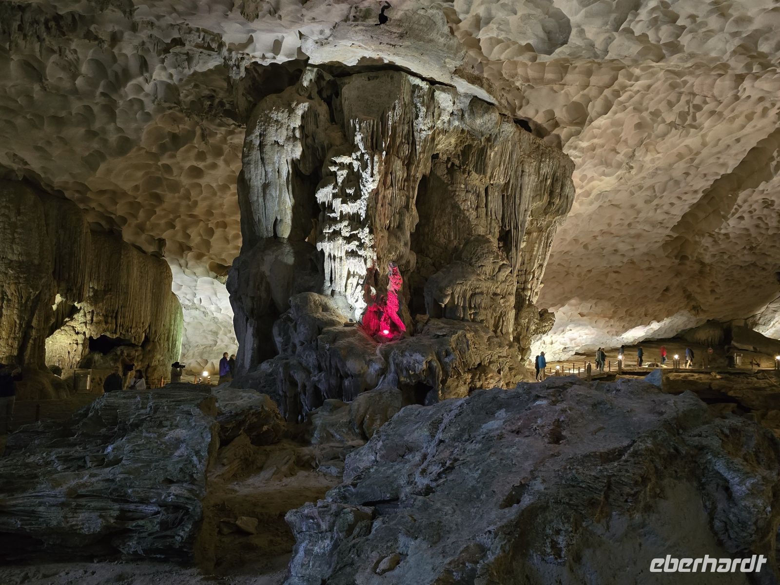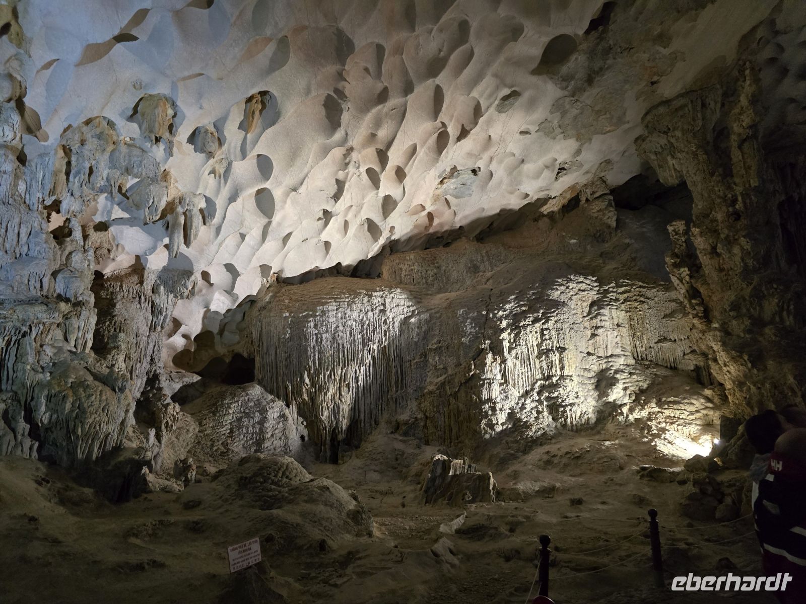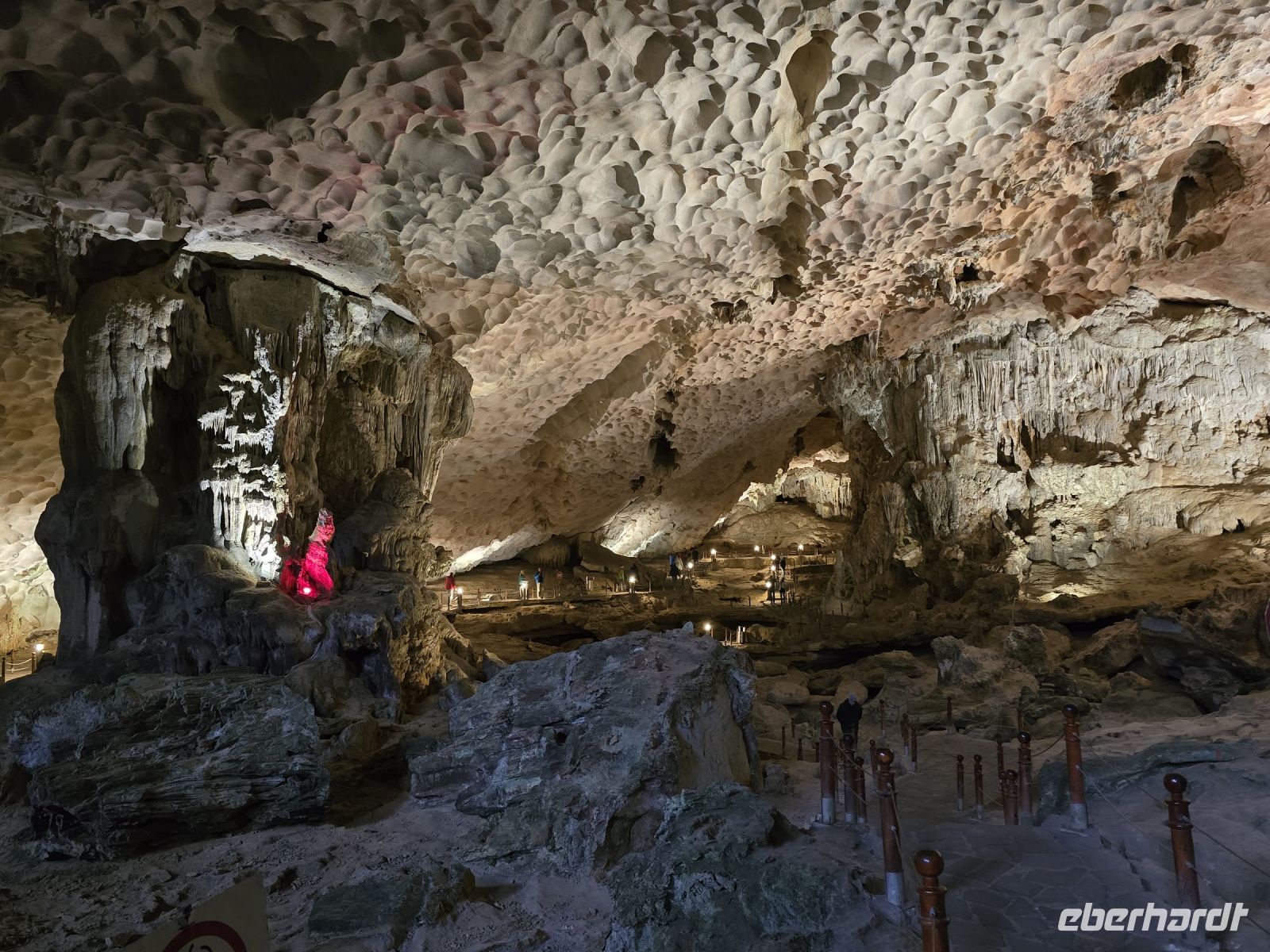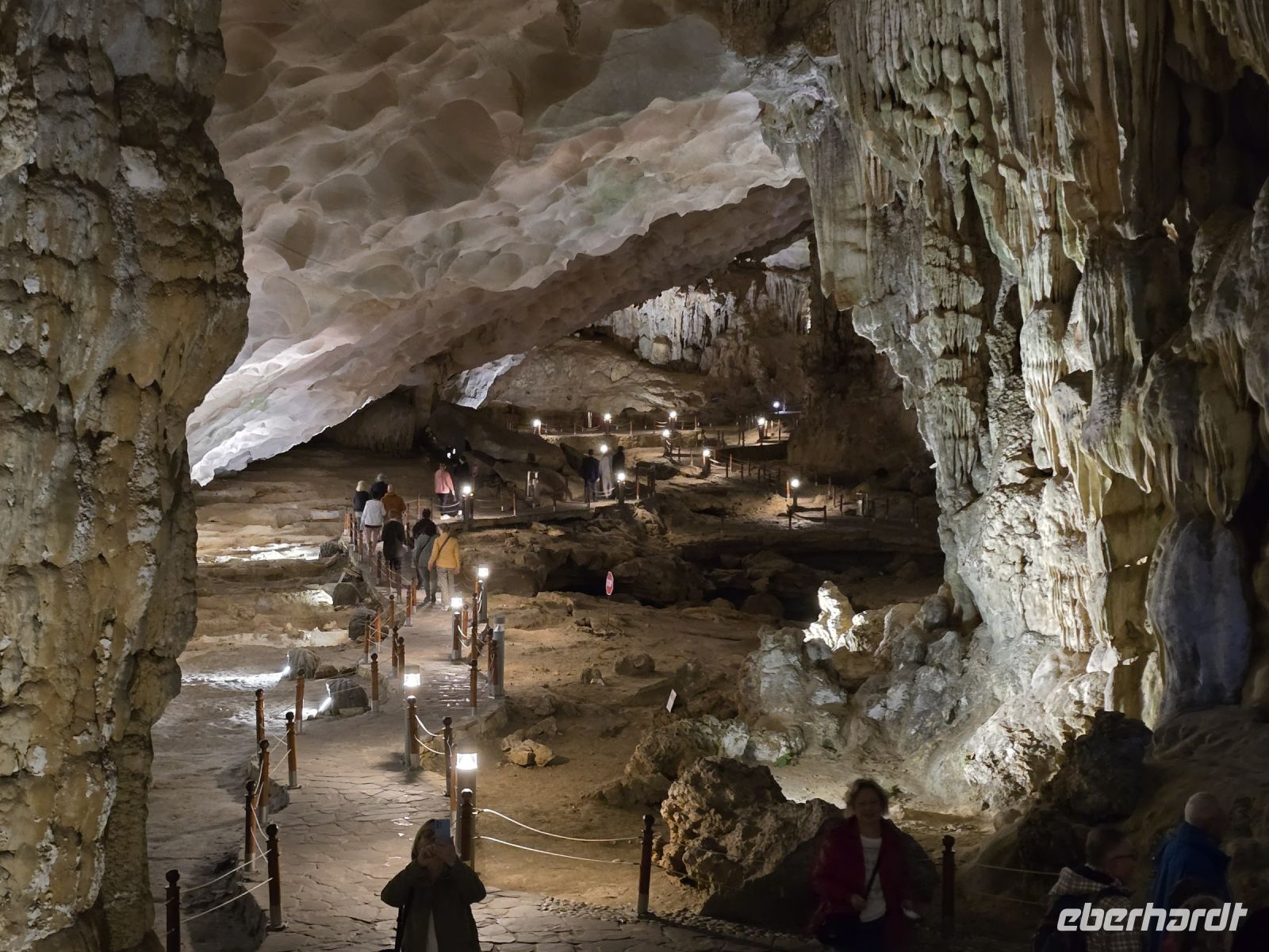 Am frühen Morgen, genau 6:15, trafen wir uns alle am Oberdeck, an der frischen Luft, es war zwar ein bisschen neblig, aber wir hatten Lust auf Tai-Chi. Leider hatte unser Instruktor die Veranstaltung kurzfristig abgesackt wegen der Gefahr auf dem nassen Holzdeck auszurutschen. Aber da wir schonmal wach waren und der Morgen dämmerte schon, da haben wir uns dem ersten Frühstück zugewandt und die Aussicht beim Ablegen des Schiffes genossen. Gleich um 7:15 Uhr waren wir die ersten mit unserer Dschunke am Anlegeplatz vor der Überraschungshöhe, der Hang Sung Sot. Wir setzten mit dem Tenderbot über und waren dann auch einer der ersten Gruppen, die sich die Höhle anschauten. Das war ein spannend, erst mussten wir ca. 50 Höhenmeter auf ein Plateau aufsteigen, wo sich der Eingang der Höhle befand. Von hier oben hatten wir einen freien Blick über die Ha-Long Bucht. Wenn wir in die Höhle blickten, konnten wir tief in die erste Kammer schauen, wo die Tropfsteine ganz bizarre Formen gebildet hatten. Insgesamt ist die Höhe in 3 Kammern geteilt, die mit Gängen verbunden sind. Jede Kammer hat besondere Formationen mit etwas Fantasie kann die Schildkröte mit ihren Eiern entdeckte werden oder eine große Zahl an Drachen sind zu erkennen. Am Ende hängen noch 2 Beine von einem Absatz herunter, so als ob dort an der Felskannte ein Riese sitzt und die Beine herunterhängen lässt. Die Überraschungshöhe kann man wirklich als solches bezeichnen, uns überraschte jede Kammer von neuem.