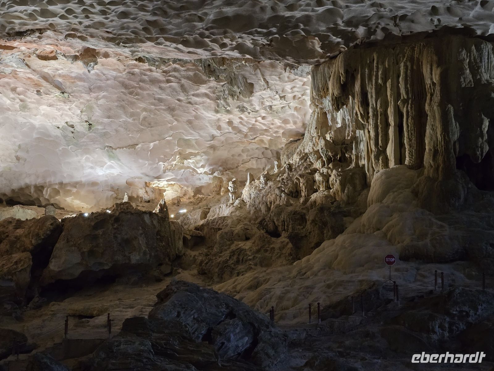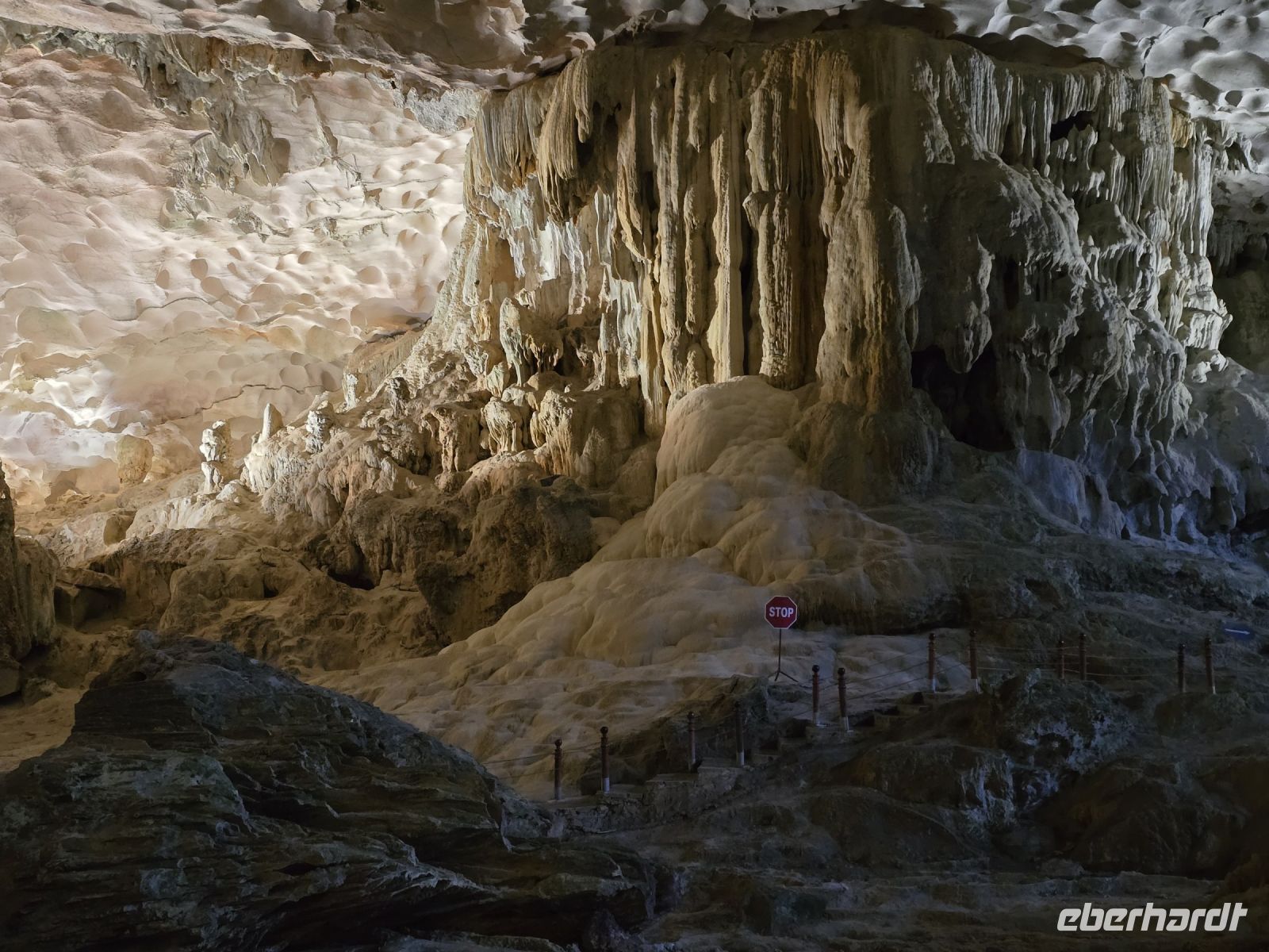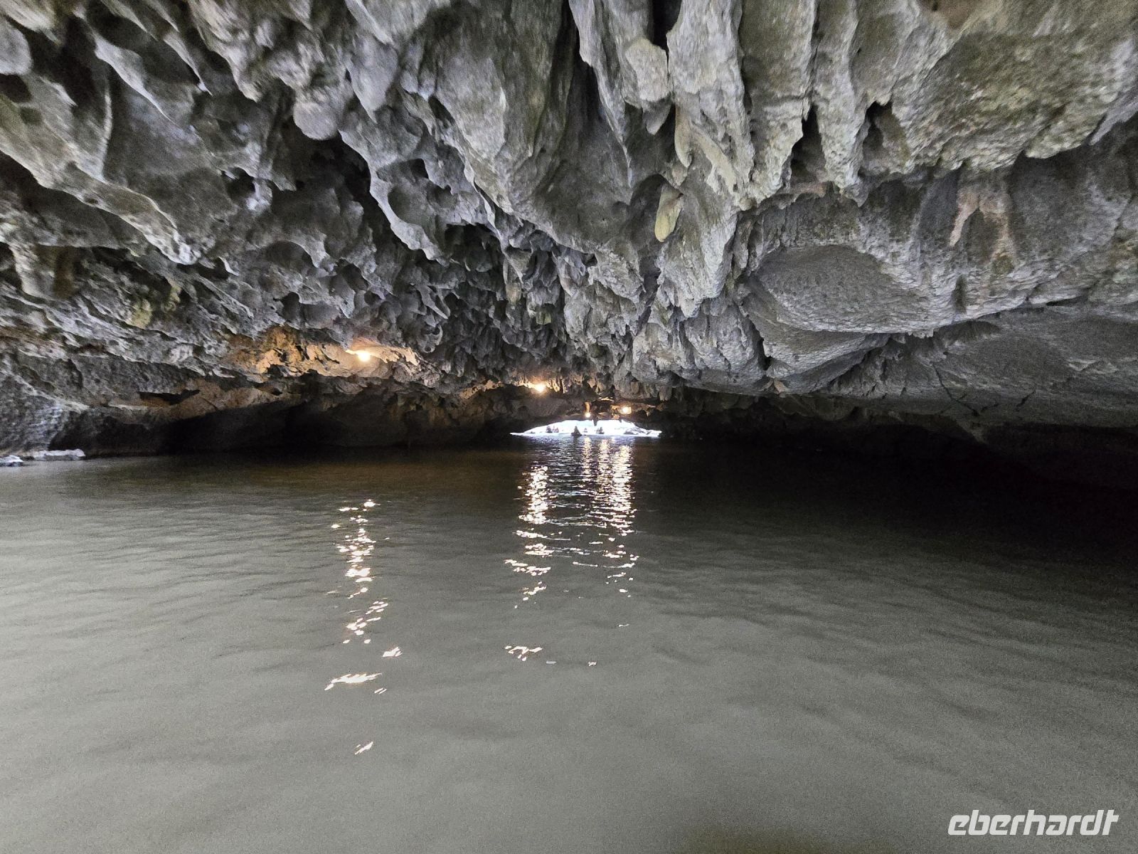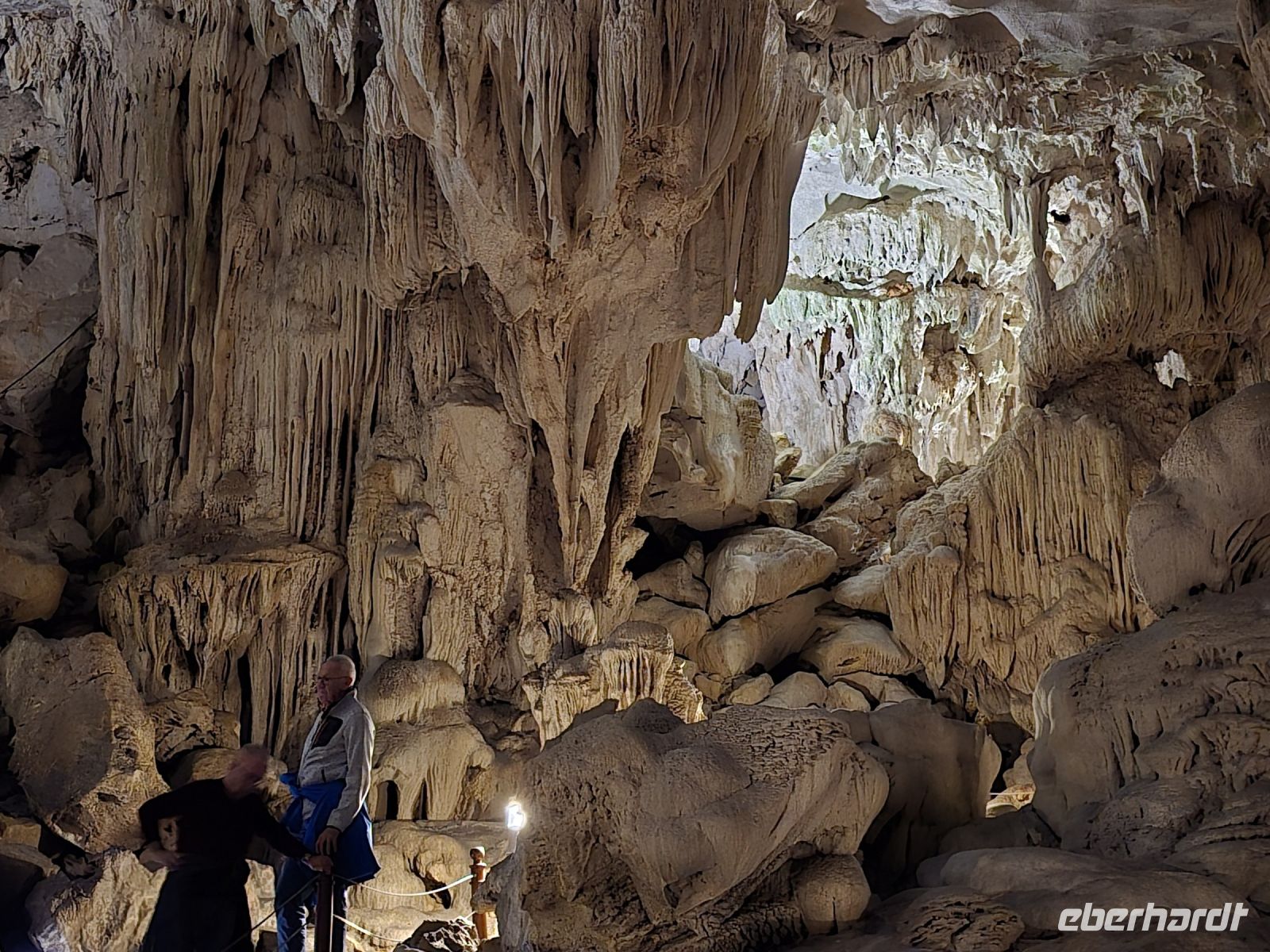 Am frühen Morgen, genau 6:15, trafen wir uns alle am Oberdeck, an der frischen Luft, es war zwar ein bisschen neblig, aber wir hatten Lust auf Tai-Chi. Leider hatte unser Instruktor die Veranstaltung kurzfristig abgesackt wegen der Gefahr auf dem nassen Holzdeck auszurutschen. Aber da wir schonmal wach waren und der Morgen dämmerte schon, da haben wir uns dem ersten Frühstück zugewandt und die Aussicht beim Ablegen des Schiffes genossen. Gleich um 7:15 Uhr waren wir die ersten mit unserer Dschunke am Anlegeplatz vor der Überraschungshöhe, der Hang Sung Sot. Wir setzten mit dem Tenderbot über und waren dann auch einer der ersten Gruppen, die sich die Höhle anschauten. Das war ein spannend, erst mussten wir ca. 50 Höhenmeter auf ein Plateau aufsteigen, wo sich der Eingang der Höhle befand. Von hier oben hatten wir einen freien Blick über die Ha-Long Bucht. Wenn wir in die Höhle blickten, konnten wir tief in die erste Kammer schauen, wo die Tropfsteine ganz bizarre Formen gebildet hatten. Insgesamt ist die Höhe in 3 Kammern geteilt, die mit Gängen verbunden sind. Jede Kammer hat besondere Formationen mit etwas Fantasie kann die Schildkröte mit ihren Eiern entdeckte werden oder eine große Zahl an Drachen sind zu erkennen. Am Ende hängen noch 2 Beine von einem Absatz herunter, so als ob dort an der Felskannte ein Riese sitzt und die Beine herunterhängen lässt. Die Überraschungshöhe kann man wirklich als solches bezeichnen, uns überraschte jede Kammer von neuem.