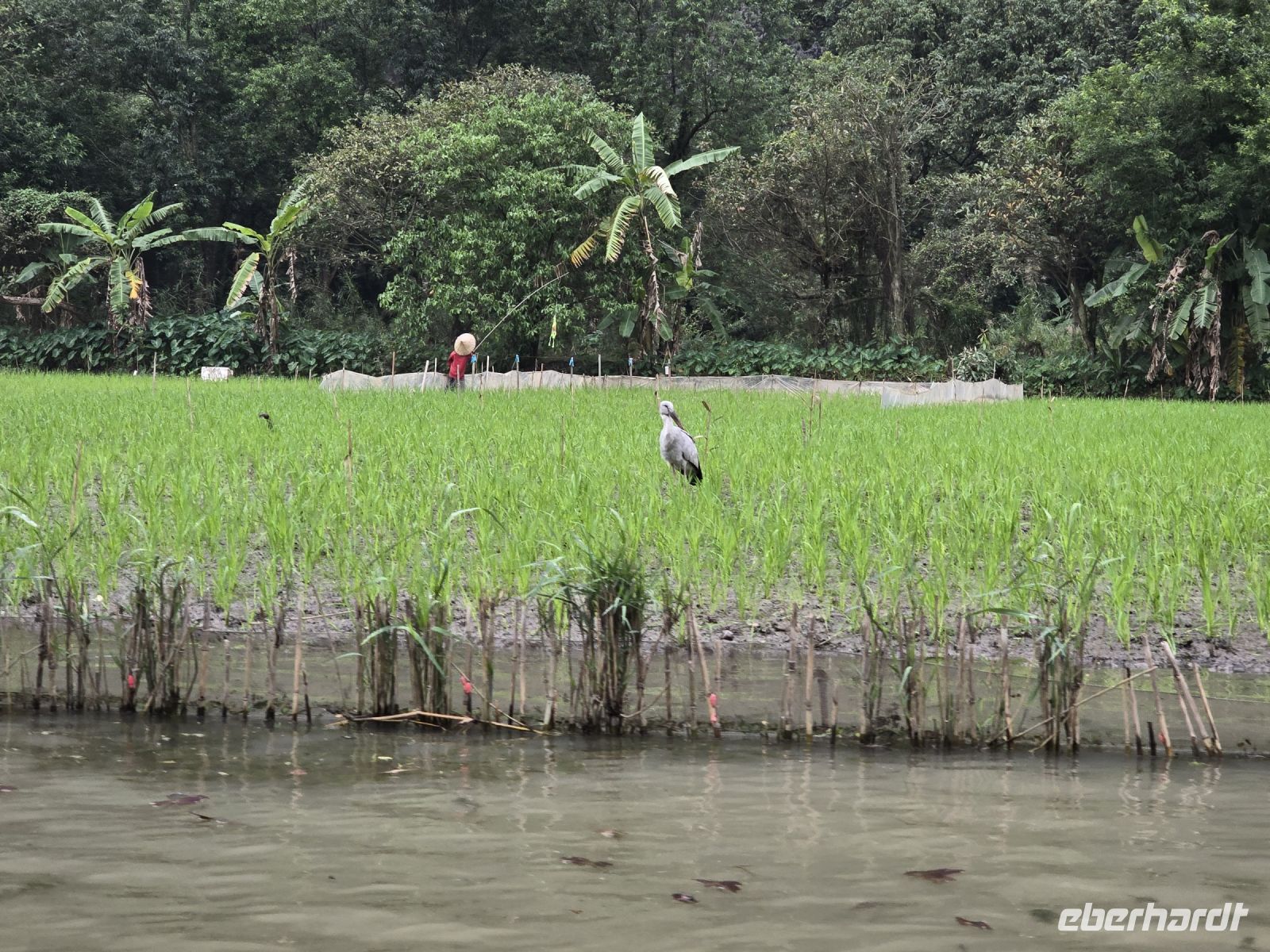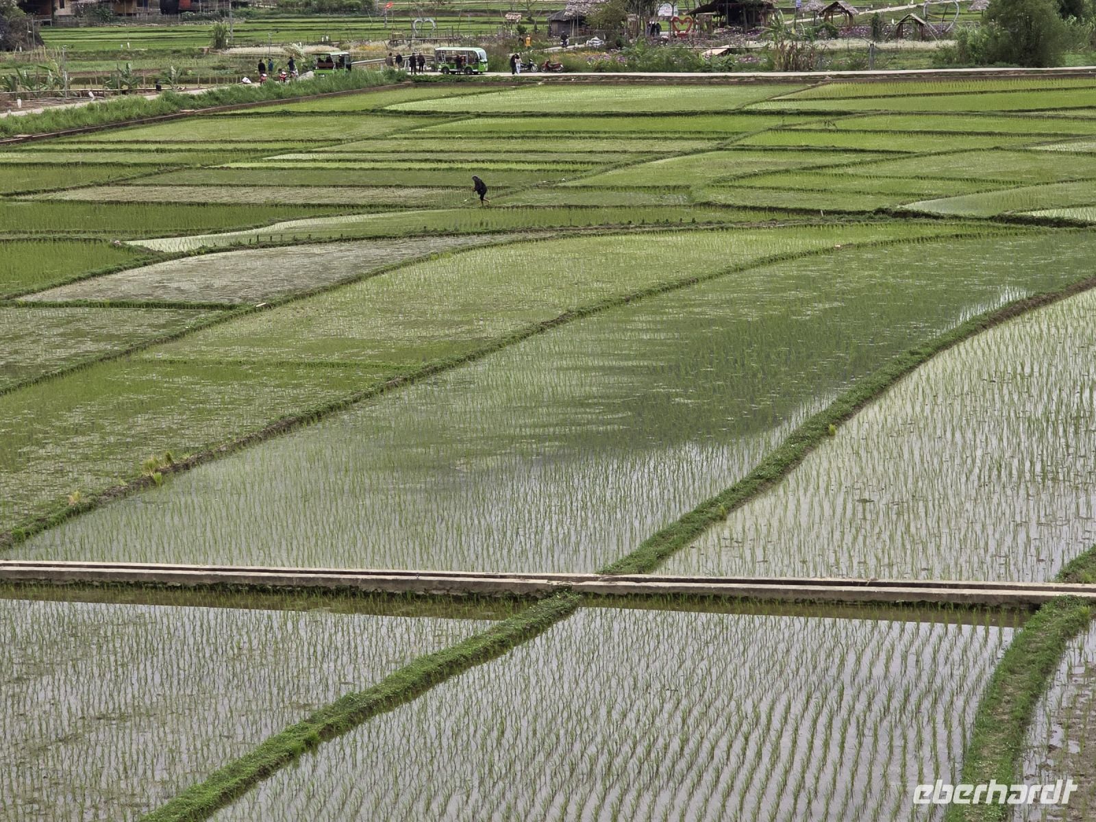 Der Fluss hat sich auf seinem Weg mehrere Tunnel gegraben und links und rechts von ihm liegen Reisfelder.
