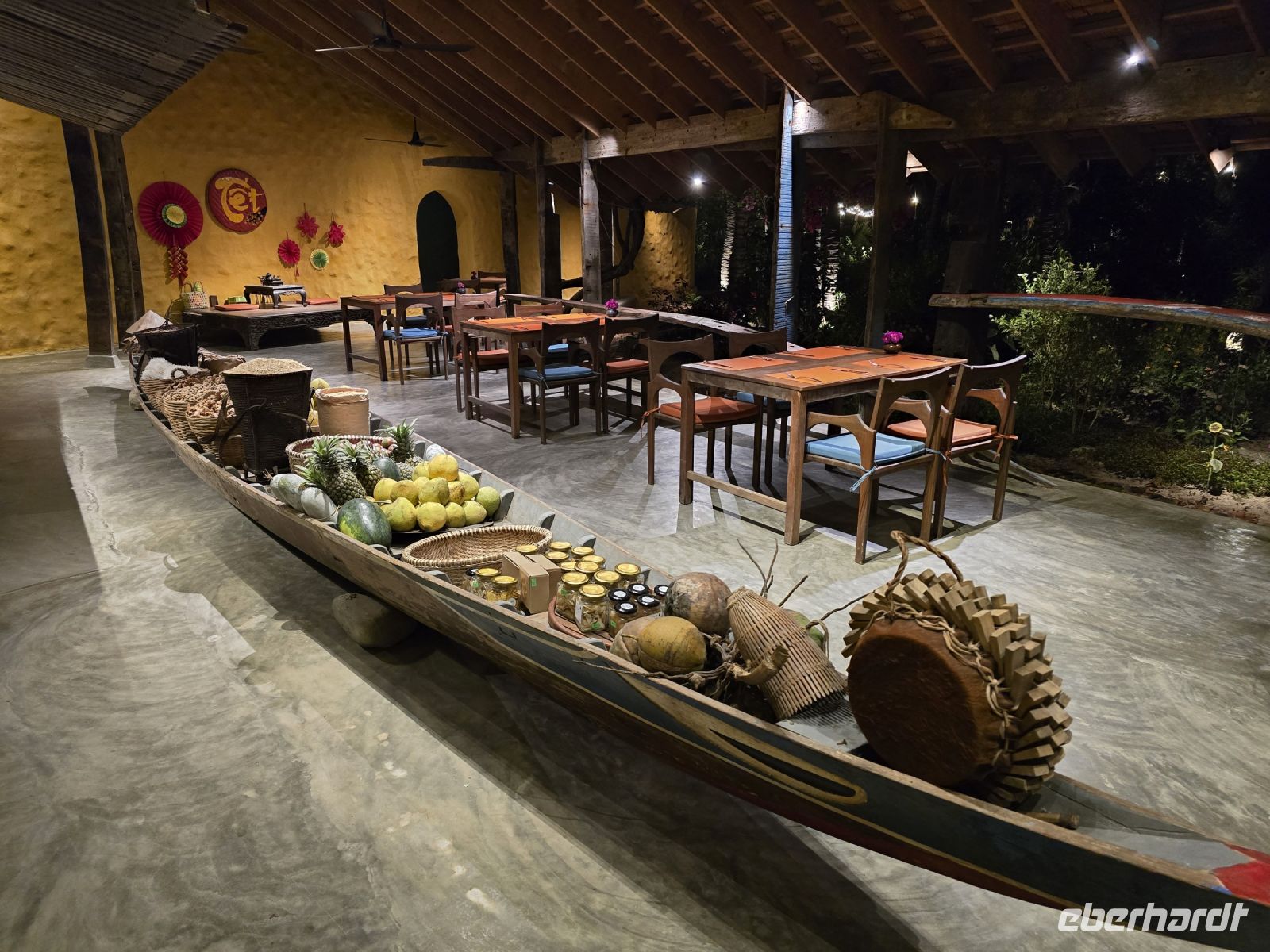 Nach dem einchecken und dem passieren der Sicherheitskontrolle sind wir schon nach einer guten Stunde einstiegsbereit in der Abflughalle. Es geht jetzt weiter nach Da Nang, der größten Stadt in Zentralvietnam mit ca. 1,5 Mill. Einwohnern. Wir werden wieder von einem freundlichen Reiseleiter abgeholt und fahren durch die Stadt in Richtung Hoi An wo unser Hotel ist. Aber zuvor gehen wir noch direkt zum Abendessen, in einer Vorstadt von Hoi An. Die Gassen der Stadt sind so eng das unser Bus keine Chance hat hineinzufahren. Wir steigen um auf kleine Elektrofahrzeuge mit jeweils 8 Sitzplätzen und werden direkt zum Lokal gefahren. Die Überraschung ist groß in der Eingangshalle steht ein großes Langboot, gefüllt mit Früchten, etwas weiter sind unsere gedeckten Tische vorbereitet. Wir werden sehr freundlich empfangen, mit viel Humor werden uns die Speisen vorgeführt wie man sie essen soll und wir sind bester Laune und auch hungrig und genießen dieses tolle 7 gängige Menü. Wir stellen fest das das Essen hier in Zentralvietnam sehr viel leichter und phantasiereicher ist als im Norden. Es wird sehr viele Reisfladen verwendet mit Gemüse und etwas Fleisch gemeinsam gewickelt und das Ganze in Erdnusssauce getaucht und gegessen. Noch weitere phantasiereiche Essenskombinationen lernen wir heute hier kennen.