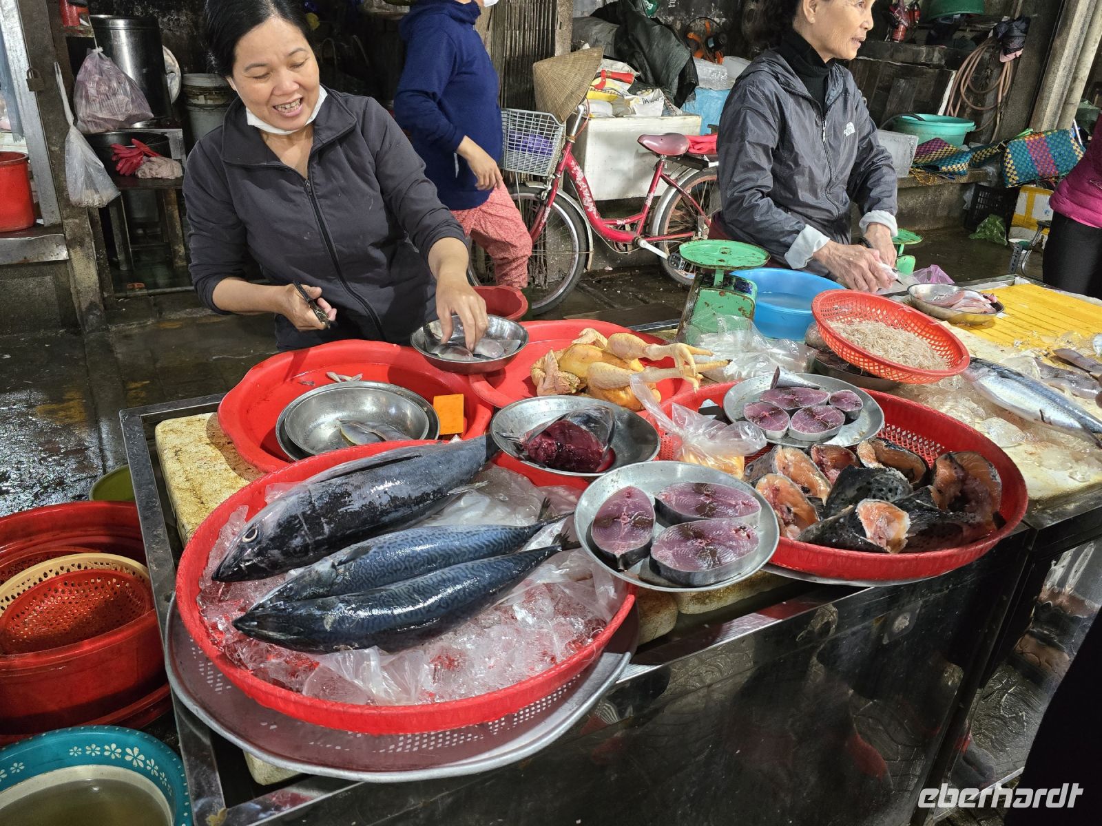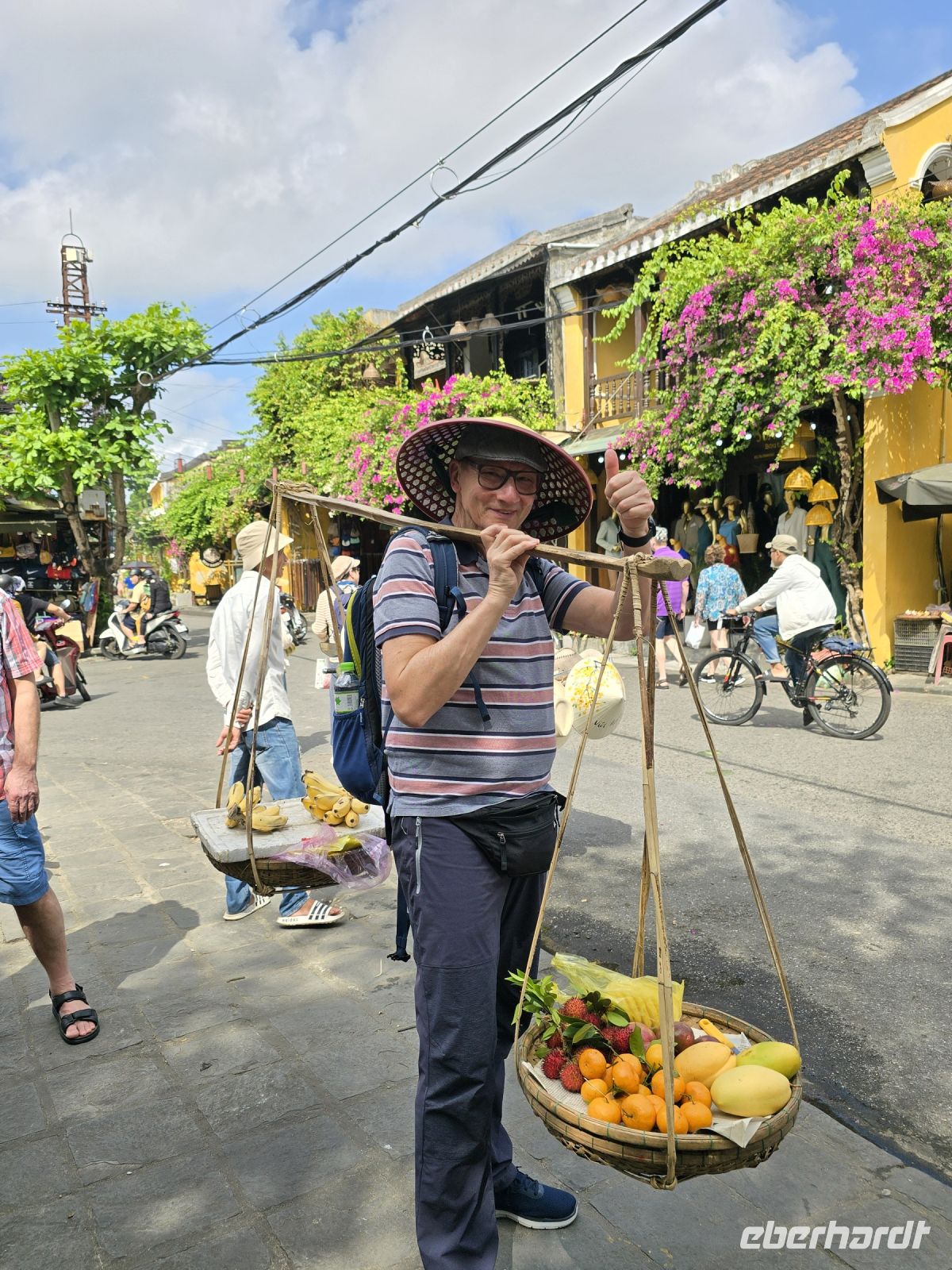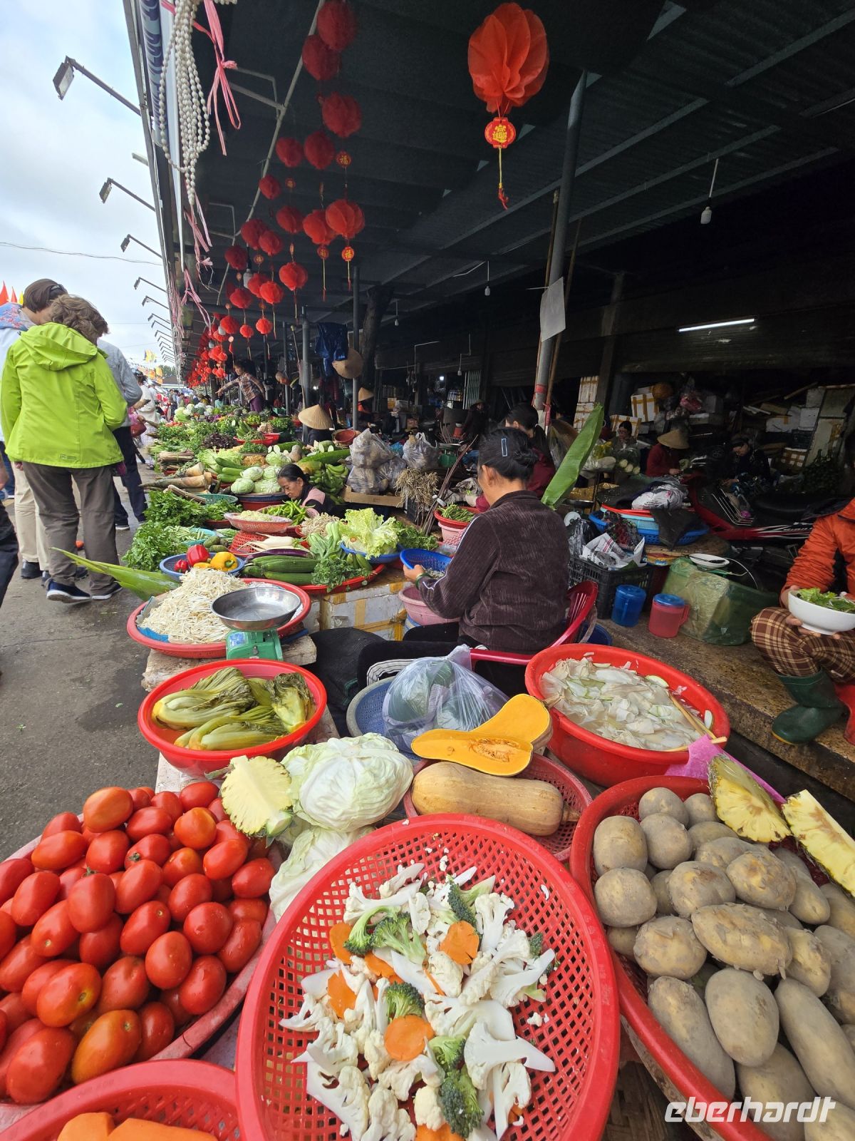 Wir wollen und erstmal die Altstadt von Hoi An anschauen und fahren deswegen mit 2 Elektrobussen hinein in die Altstadt. Von da aus bummeln wir durch die engen Gassen, besuchen den Markt und die Markthalle. Hier gibt es alles zum Essen, Gemüse, Obst, Fleisch in allen Fahr Arten, jedes Teil von den Tieren wird hier angeboten. Mit den frisch gefangenen Fischen was wird nicht zimperlich umgegangen. sie werden in kleinsten Schüsseln lebendig gefangen gehalten, mit nur minimal Wasser in den Schüsseln winden sie sich um sie selbst und der lebendige Knäuel wird durch einen Deckel auf den Schüsseln daran gehindert herauszuspringen.
