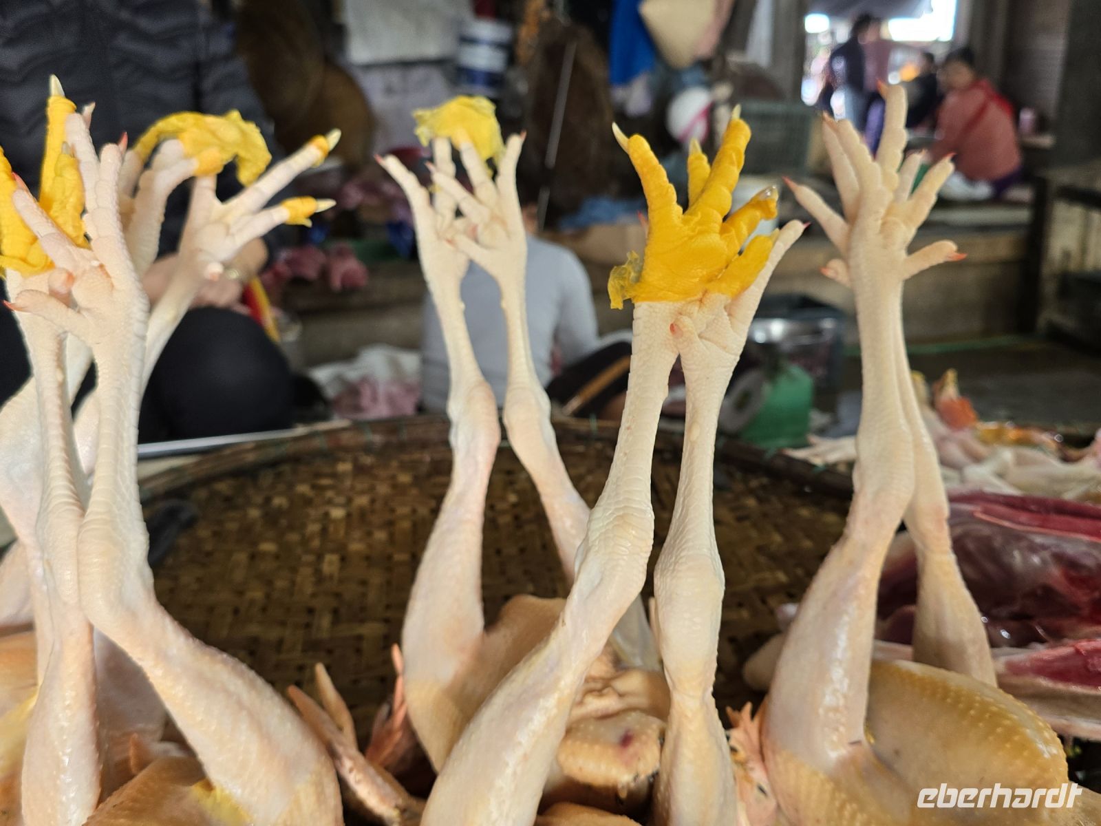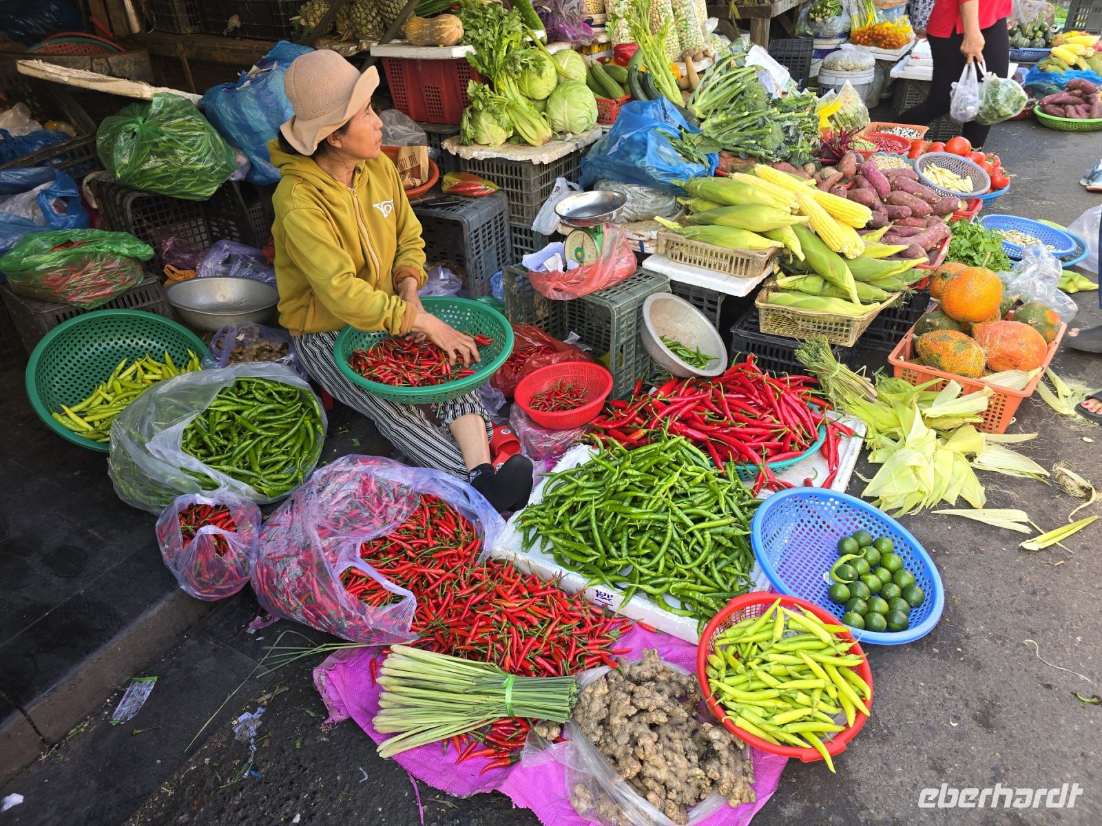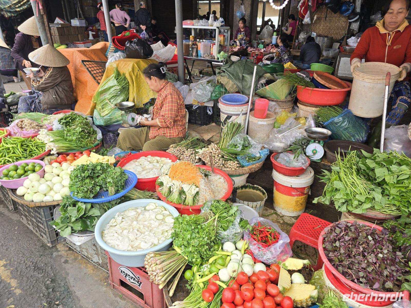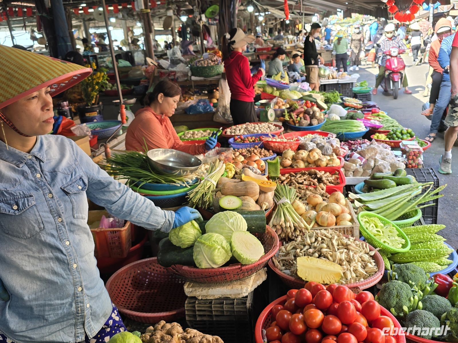 Wir wollen und erstmal die Altstadt von Hoi An anschauen und fahren deswegen mit 2 Elektrobussen hinein in die Altstadt. Von da aus bummeln wir durch die engen Gassen, besuchen den Markt und die Markthalle. Hier gibt es alles zum Essen, Gemüse, Obst, Fleisch in allen Fahr Arten, jedes Teil von den Tieren wird hier angeboten. Mit den frisch gefangenen Fischen was wird nicht zimperlich umgegangen. sie werden in kleinsten Schüsseln lebendig gefangen gehalten, mit nur minimal Wasser in den Schüsseln winden sie sich um sie selbst und der lebendige Knäuel wird durch einen Deckel auf den Schüsseln daran gehindert herauszuspringen.