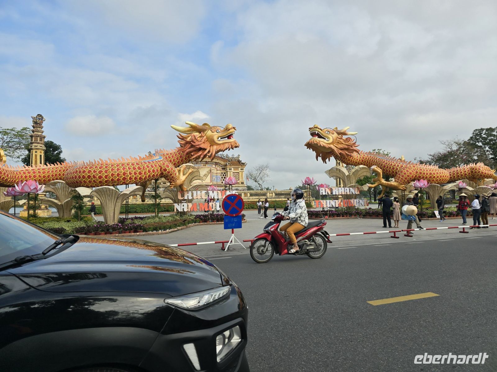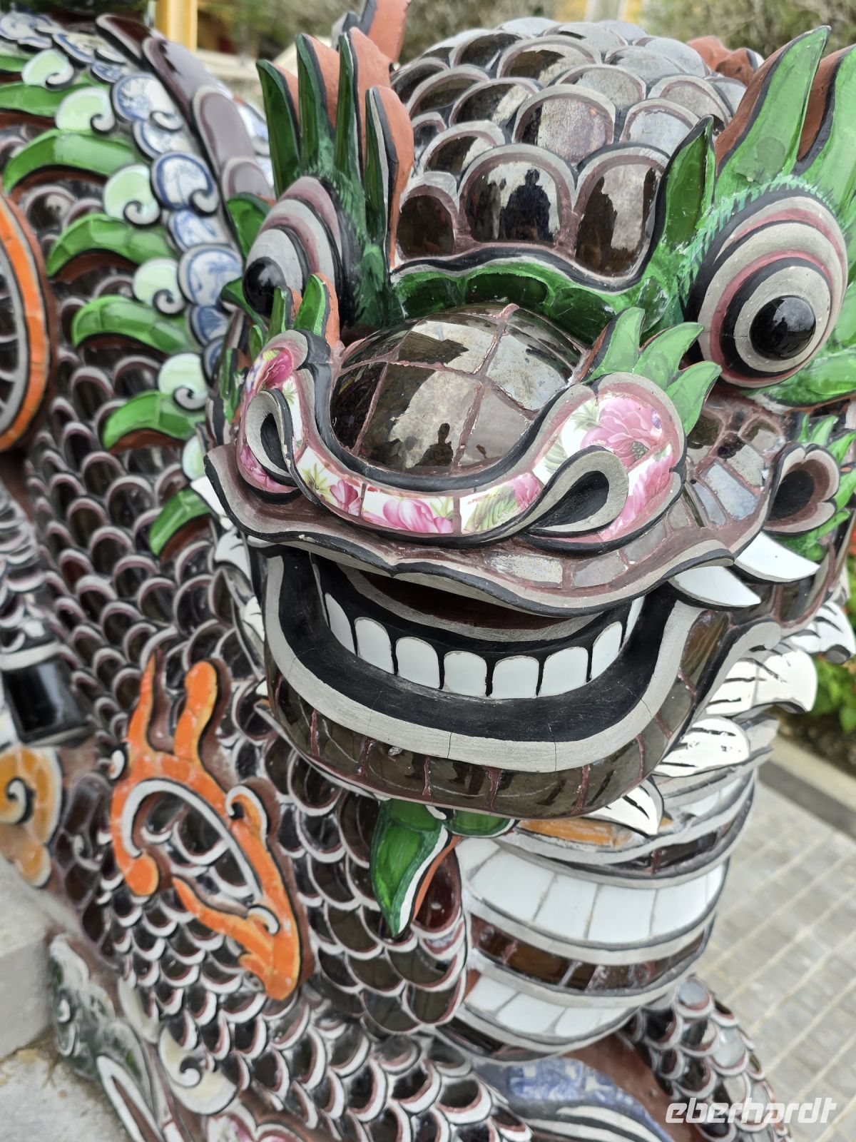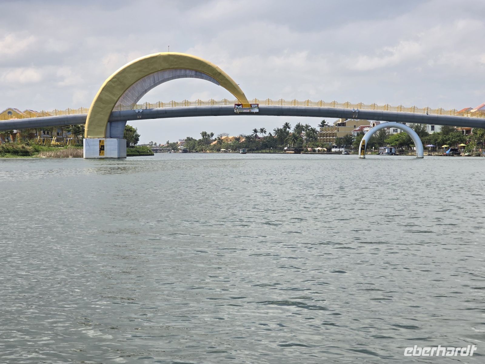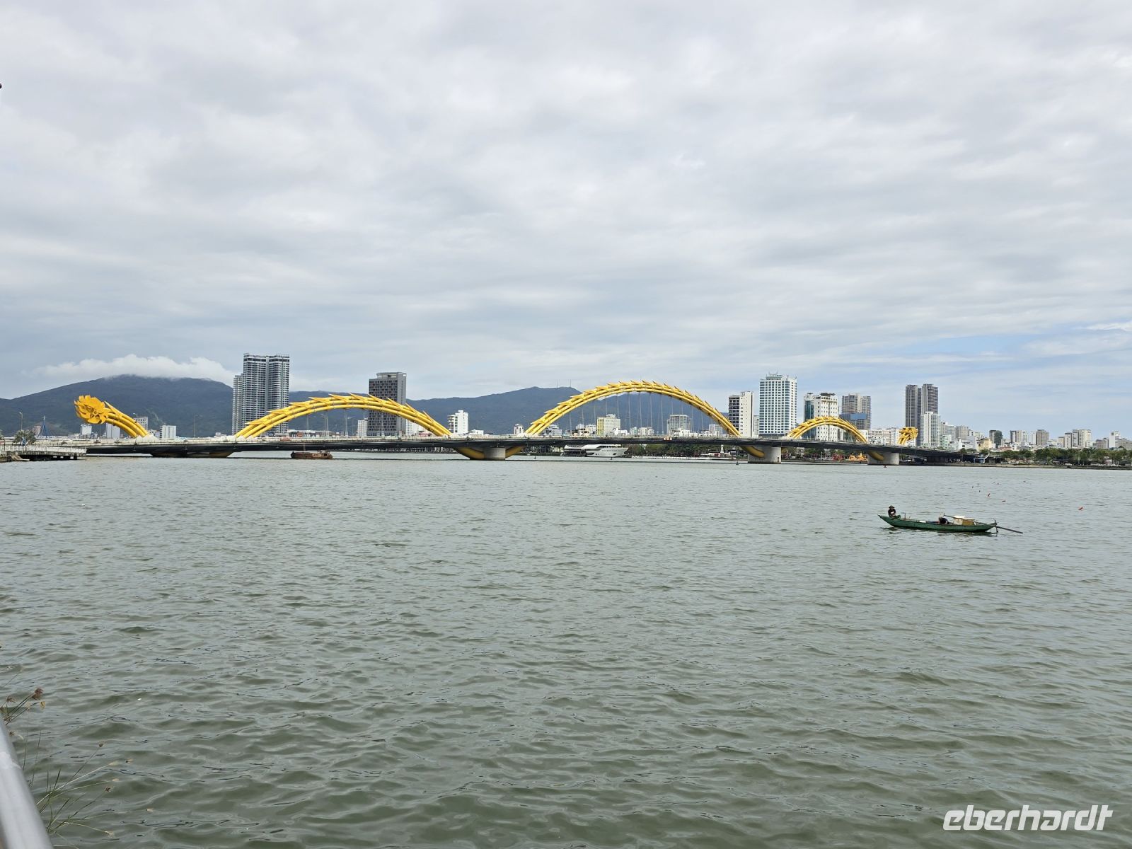 Nächsten Stopp machen wir in einer Marmormanufaktur, hier können Figuren aus Marmor in jeder Größe angeschaut und erworben werden. Für uns ist es eine willkommene Umgebung für eine kleine Pause, bevor wir die Fahrt fortsetzen, um am Ortsende von Da Nang die Drachenbrücke und die Fächerbrücke anzuschauen. Beide Brücken überspannen den Han River und verbindet eine Halbinsel mit dem Festland. Die Drachenbrücke hat einen geschwungenen Drachenkörper und einen feuerspeienden Kopf an der Seite der Brücke als tragendes Element der Brücke eingearbeitet.