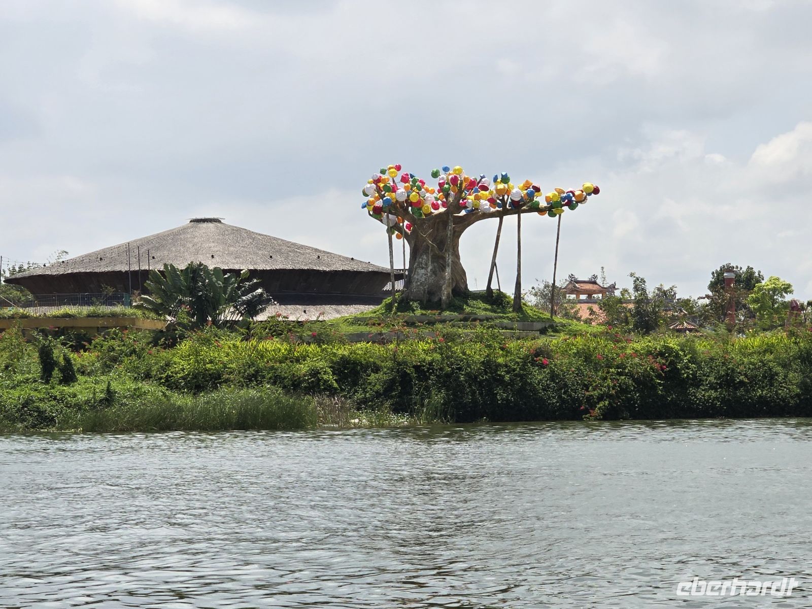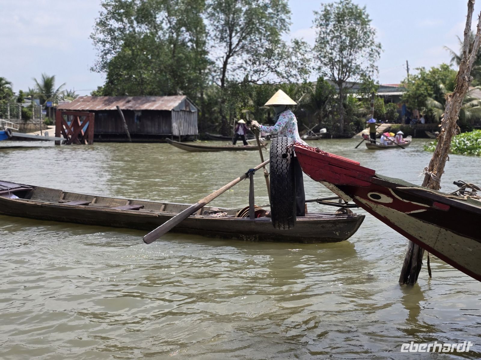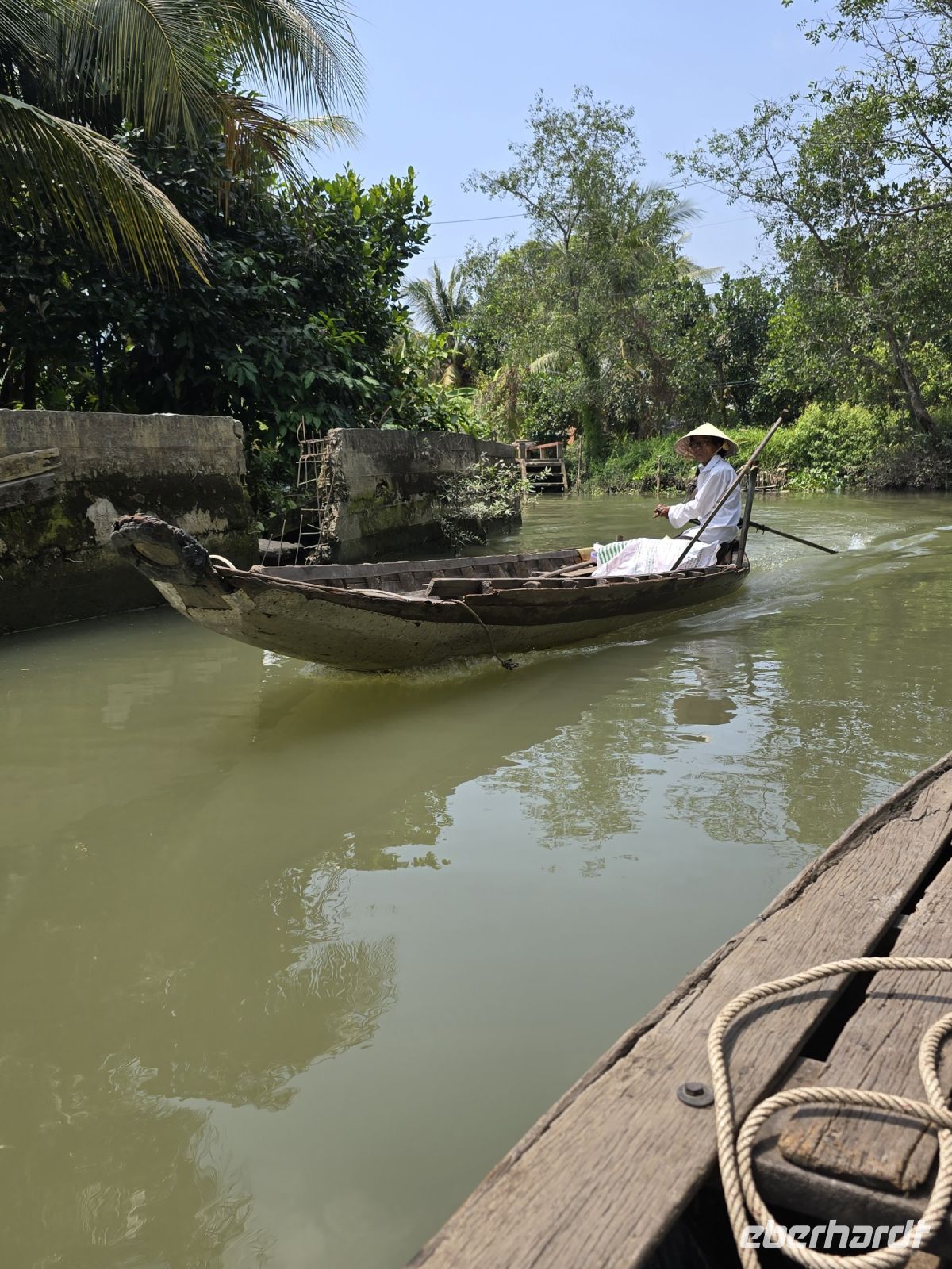 Nun stiegen wir wieder herab von der Pagode und hinein in unseren Bus, denn jetzt machen wir uns auf den Weg in südwestliche Richtung in das Mekong Delta. Um die Stadt zu verlassen benötigen wir noch etwas Zeit und quälten uns durch den dichten Verkehr. Aber sobald wir am Stadtrand ankamen und die Landschaft landwirtschaftlich wurde, lief der Verkehr besser und unsere Spannung auf eine neue Umgebung stieg. Wir kamen an vielen Plantagen vorbei, Bananen Jackobsfrucht, Mangos, Papayas, Litschis alles was wir so vom Markt kannten wuchs in diesem furchtbaren Delta. Aber wir sehen auch einiges neue und kurioses. Immer wieder sahen wir Häuser aus Beton aber komplett ohne Fenster. Wir fragten uns was diese Häuser für eine Funktion haben, Trong erklärte uns, dass das Zuchtanlagen für Schwalben, beziehungsweise für Schwalbennester sind. Schwalbennester sind in der chinesischen Küche, aber auch in der Vietnamesischen sehr begehrt, es werden ihnen heilende Kräfte unterschiedlichster Art nachgesagt. Diese Schwalbennester haben auch einen stolzen Preis über 1000€ für ein Kilo. Und da sich Trong einen Spaß daraus machte uns noch mehr Kurioses zu erzählen berichtete er von Enteneiern, die ebenfalls eine Delikatesse sind, nur deshalb weil sie gegessen werden mit 20 Tage alten Küken die schon komplett entwickelt sind und dann komplett mit dem Ei gekocht werden. Wirklich kurios, da kann einem der Appetit vergehen. Aber der Tag soll noch mehr solche "Igit Igits" bringen. Angekommen an einem Seitenarm des Mekong, stiegen wir um in ein Motorboot das wäre komplett alleine hatten. Es dauerte gar nicht lange und wir legten an einem kleinen Dorf an, und wurden überrascht mit einer Auswahl von lokalen Früchten. Die Jakobsfrucht haben wir schon mehrmals gesehen, aber solch große Oschis noch nicht, die wiegen hier 4 bis 5 Kilo. Mit Musik und Tanz, nach der Tradition des Mekong, wurden wir erfreut und schauten gerne zu. Wir fuhren weiter und schon nach wenigen Flussmetern stoppen wir erneut, und stiegen allesamt in kleine Boote um. Wir befanden uns an der Anlegestelle eines kleinen Dorfes das auf einer Insel des Mekong angesiedelt ist. Durch diese kleinen Wassergassen werden wir gerudert. Wieder einmal sind es überwiegend Frauen die die Boote rudern. Wir haben heute 34 bis 36 Grad und zum Schutz vor der Sonne bekommen wir den typisch vietnamesischen Reis Hut aufgesetzt. Interessiert schauen wir in die Häuser und beobachten die Alltagsarbeit der Dorfbewohner, so interessant es auch ist, in diesem Dorf, aber aussteigen will hier keiner. Wir steigen von den Ruderbooten, wieder um in unser Motorboot und setzen den Weg auf dem Mekong fort. Das nächste Ziel ist mal wieder ein leckeres Essen. Ein Elefantenohr Fisch wurde uns versprochen. Wir mussten gar nicht lange warten und der Fisch wurde senkrecht stehend an unsern Tisch serviert, und wie wir es schon kannten, mit Gemüse zusammen in Reispapier stückeweise eingewickelt und mit den Fingern verzehrt. Um satt zu werden, kamen noch weitere leckere Gänge und am Ende die obligatorische Obstschale.
