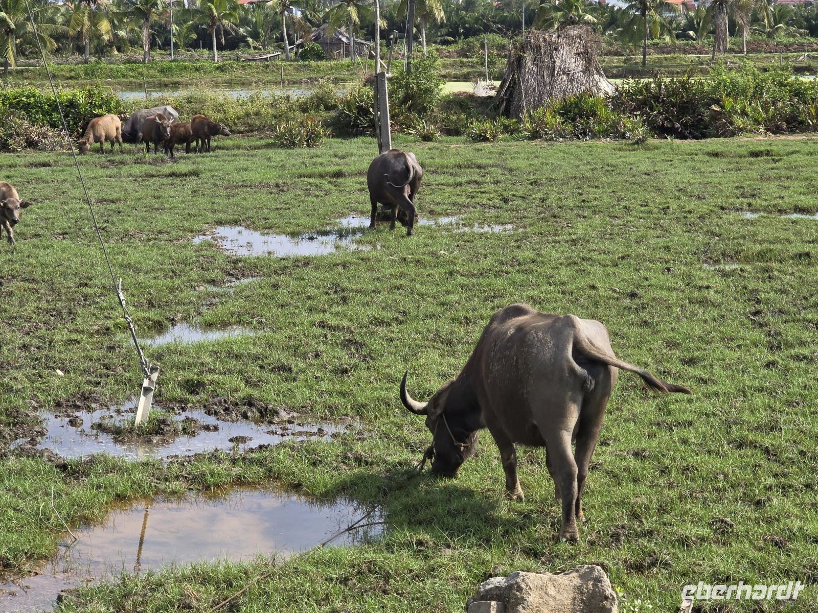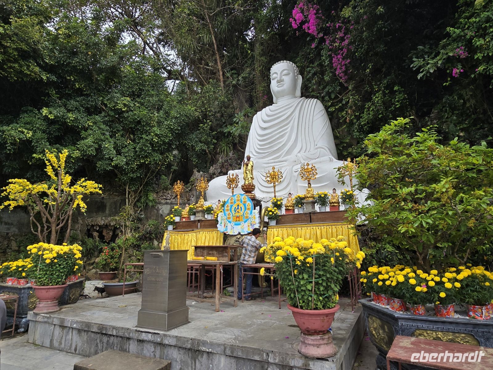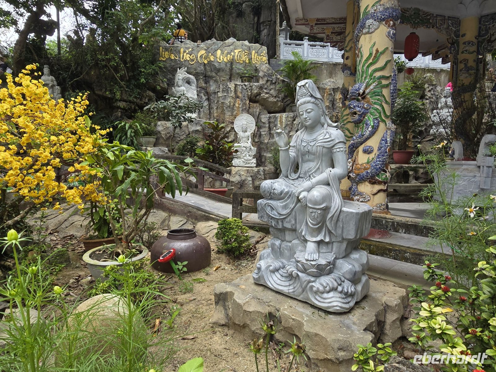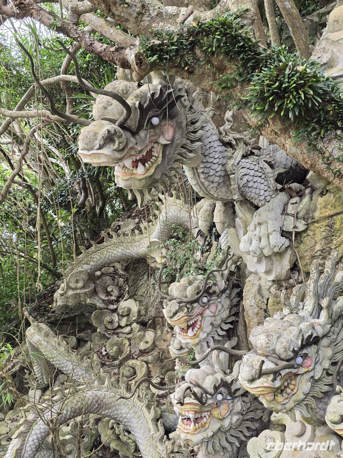 Nach dem schönen Abend in Hoi An geht es heute Morgen mit dem Bus über den Wolkenpass zu der Stadt Hue. Und auf der Fahrt legen wir mehrere Besichtigungsstopp ein. Der erste Stopp ist gleich am Ortsausgang bei den Wasserbüffeln, die standen so nah an der Straße, dass wir einfach einen Fotostopp machen mussten. Der nächste Stopp ist der Marmorberg. Hier fahren wir mit dem Fahrstuhl hoch auf den Bergrücken zirka 80 Meter und oben finden wir buddhistische und hinduistische Heiligenstätten.