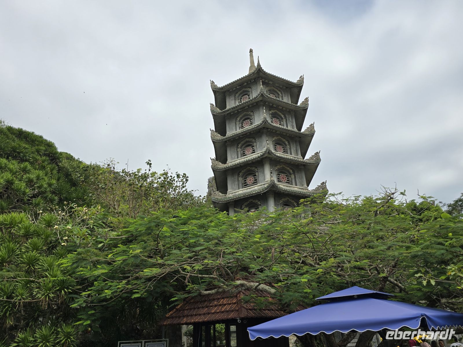 Eine siebenstöckige Pagode gefertigt aus Marmorstein, auch geschmückt mit Drachen aus Marmor. Weiter hinten eine hinduistische Tempelanlage mit einem sehr großen weißen Buddha, ebenfalls aus Marmor genauso wie alle anderen Skulpturen in dieser Anlage.