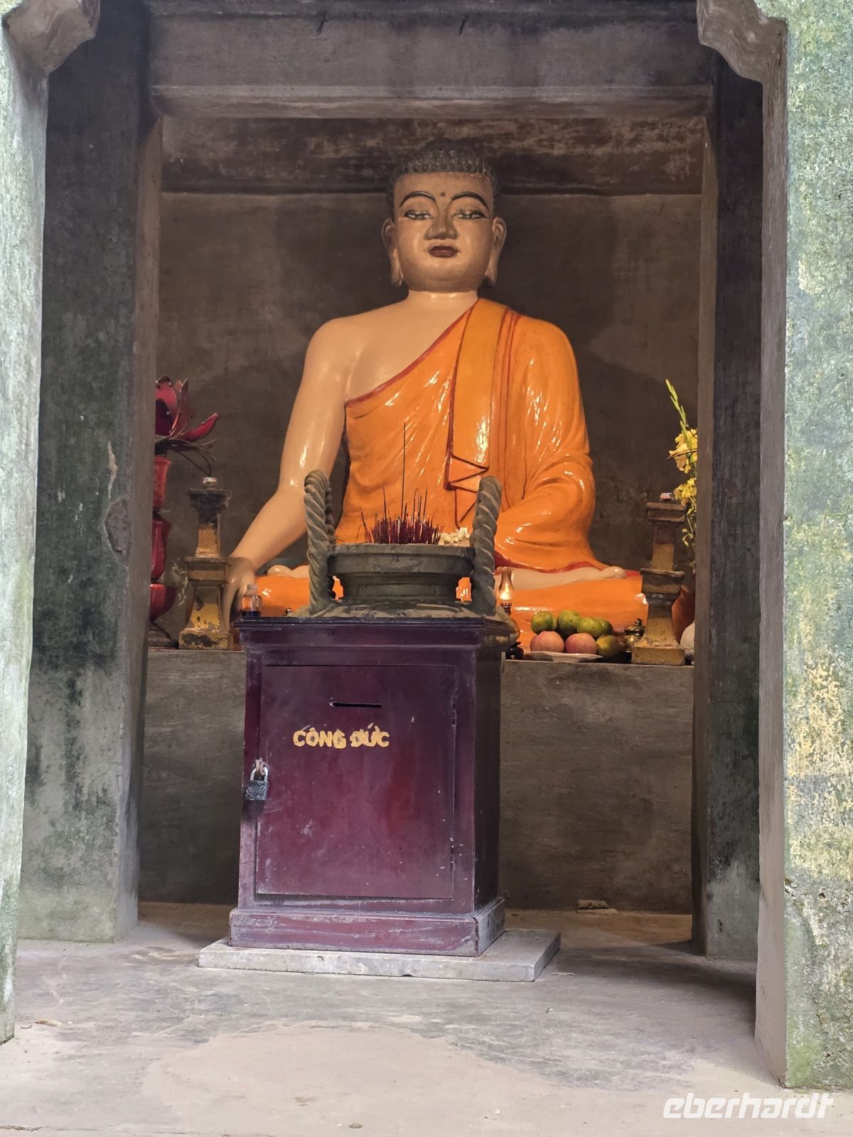 Als letzten Besichtigungsort an diesem Tag schauen wir uns noch die Frauen Pagode an. Hinter der Frauen Pagode befindet sich ein Männerkloster in dem der Klosterbetrieb mit den Mönchen noch aktiv ist. Von hier aus begann die Protestwelle gegen die Unterdrückung der buddhistischen Mönche durch den Kaiser Diem, in der Zeit der Kolonialherrschaft. Das Auto mit dem die Fahrt nach Saigon zu der Protestaktion und zur Selbstverbrennung des Mönchs gemacht wurde, steht noch in einem Unterstand zur Besichtigung.