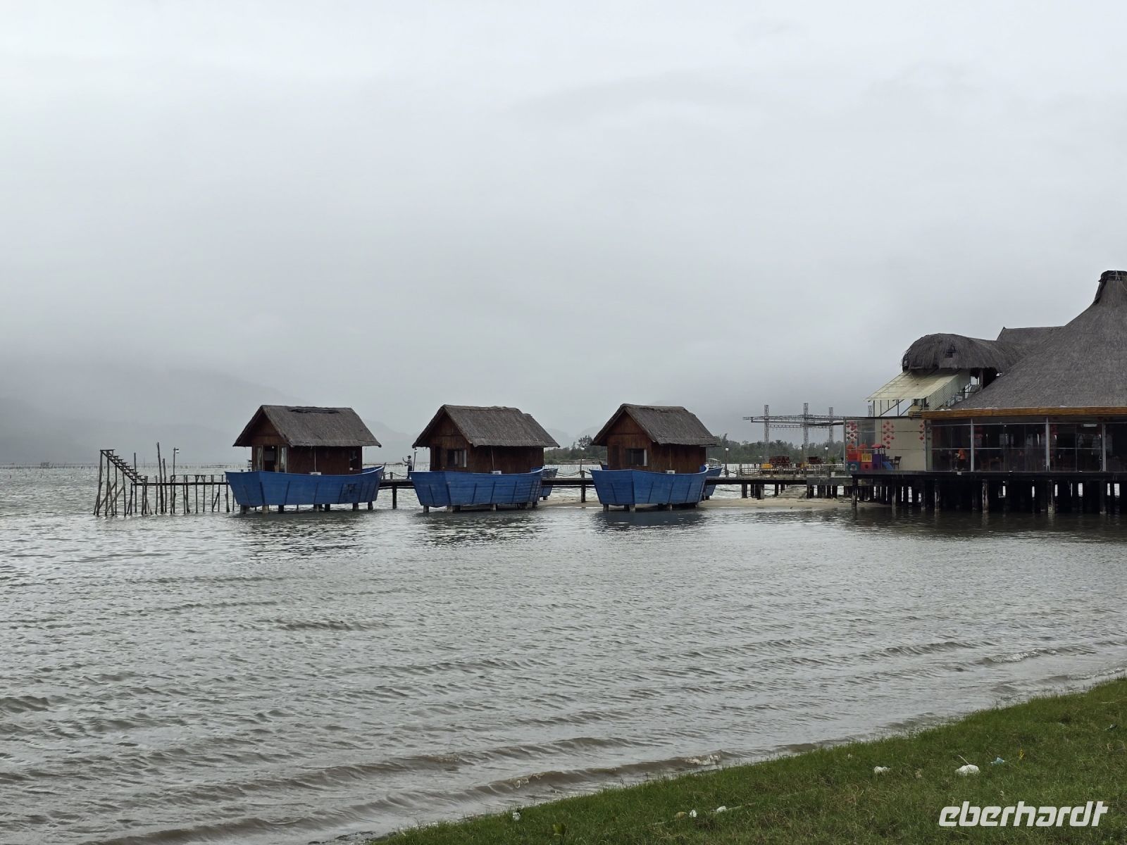 Nach dieser eindrucksvollen Bootsfahrt und den Einblicken in das Kalksteingebirge, geht es nun zu unserem Hotel dem Resort Emeralda. Eine großzügige Anlage mit einzelnen weitverteilten Häuschen in einem sehr weitläufigen Park. Restaurant und Swimmingpool bildet das Zentrum der Anlage, wo wir auch unser Abendessen serviert bekommen. Wir sind durch die lange Ruderaktion doch ganz schön hungrig geworden, oder vielleicht freuen wir uns auch nur auf die fantasiereiche vietnamesische Küche.
