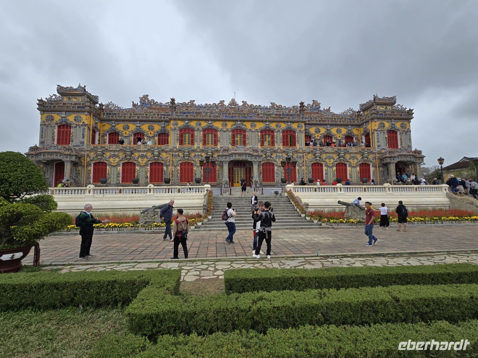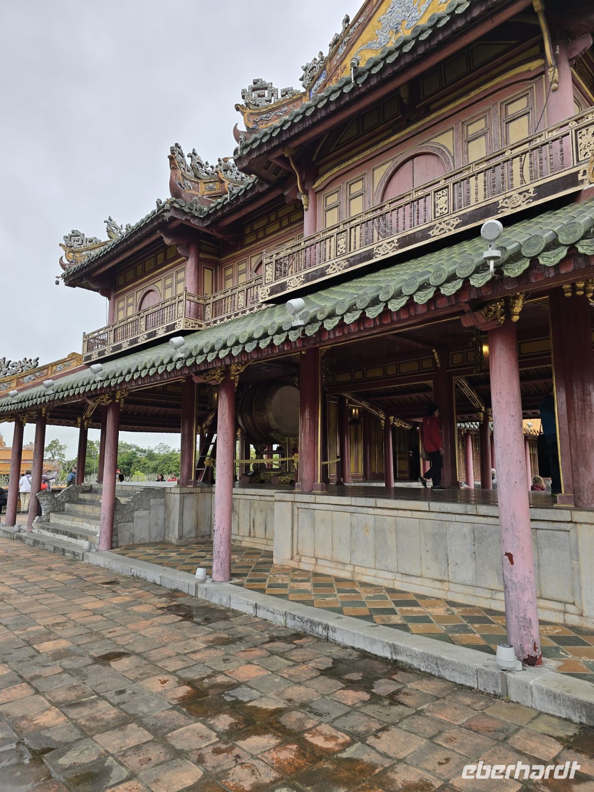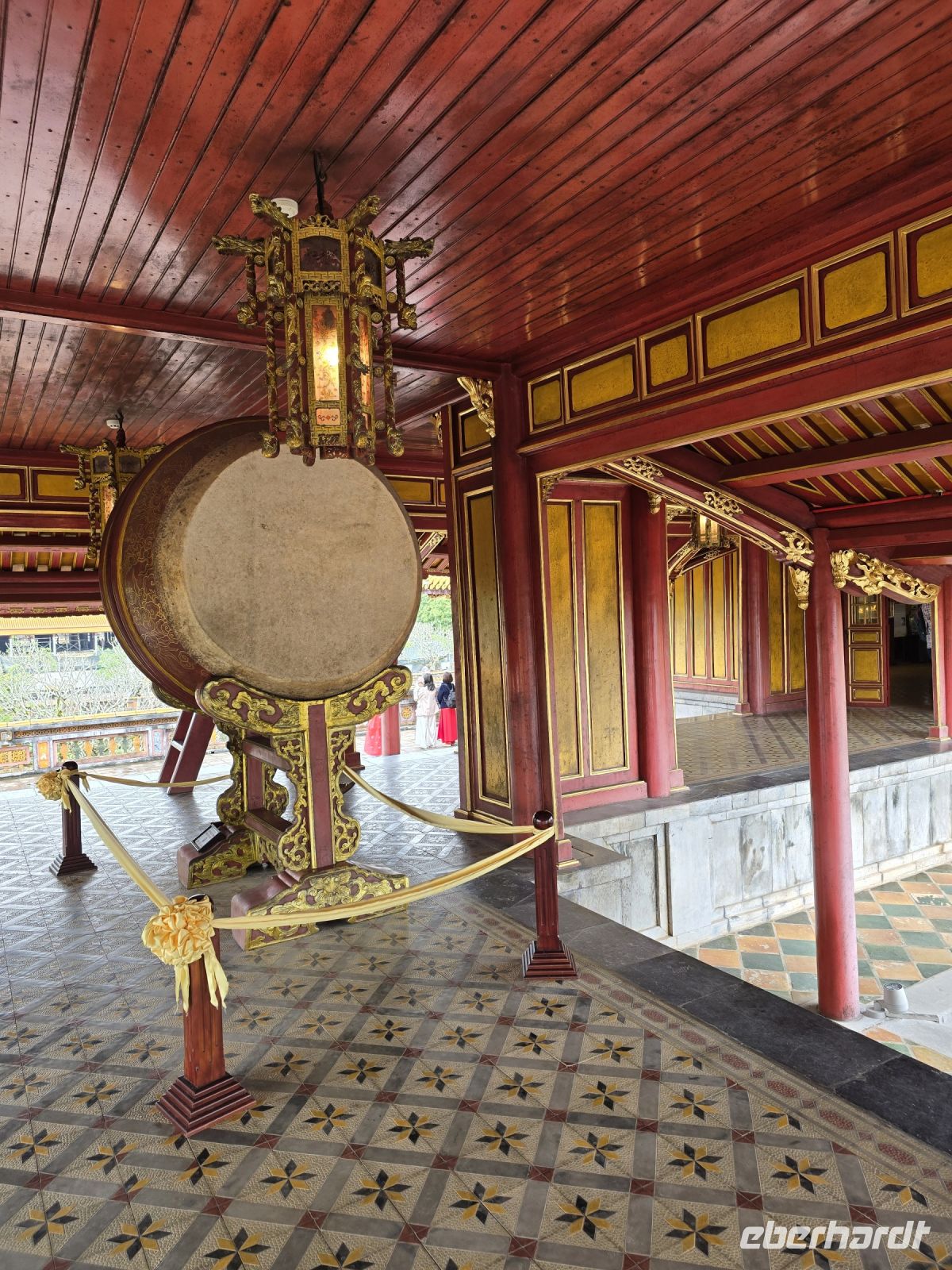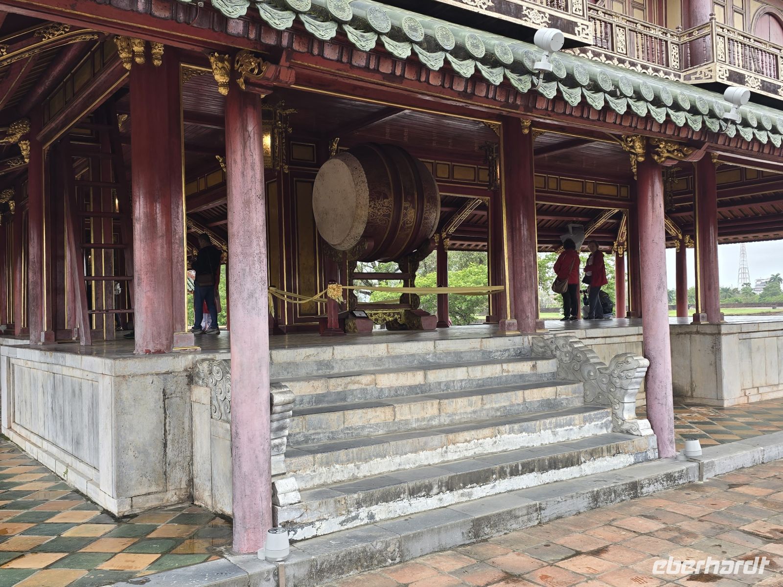 Heute Morgen sind wir direkt vom Hotel zum Kaiserpalast gefahren. Hue ist die Kaiserstadt in der im 19. und 20. Jahrhundert, 14 verschiedenen Kaisern residieret hatten. Die Fläche auf der die Paläste und weitere Gebäude des Kaisers angesiedelt sind, erstreckt sich über 3 Quadratkilometer. Eine riesige Anlage mit großen Parkflächen, Seen und prunkvollen Palästen die meist in Rottönen mit gelblichen Verzierungen geschmückt sind. Hier lebten früher bis zu 60.000 Menschen außerordentlich luxuriös. In einer offenen aber überdachten Galerie ist die große Trommel platziert, mit der Mitteilungen und Ereignisse dem Volk und dem Hofstaat angekündigt werden. Jeder der den Spielfilm "Der letzte Kaiser" gesehen hat, dem ist diese Trommel und der davor liegende Balkon bekannt, hier zeigte sich der Kaiser dem Volk und wurde vom Hof her bejubelt.