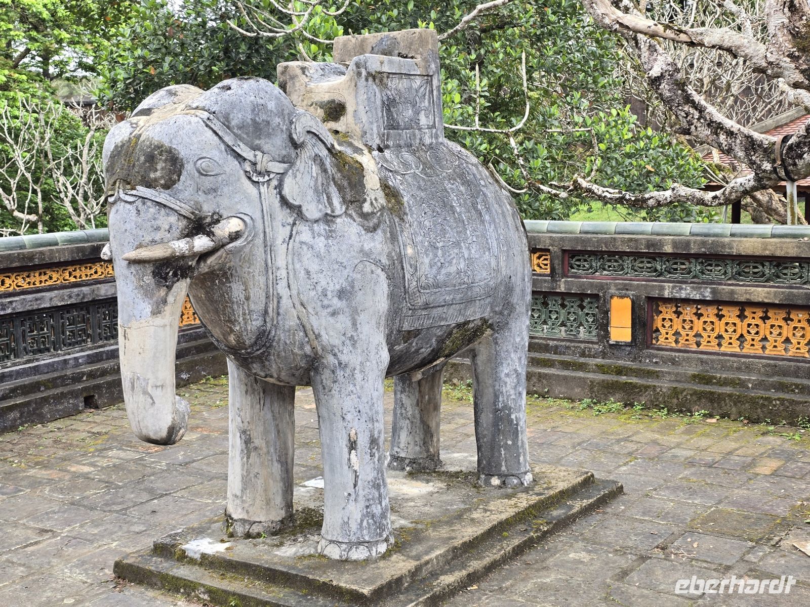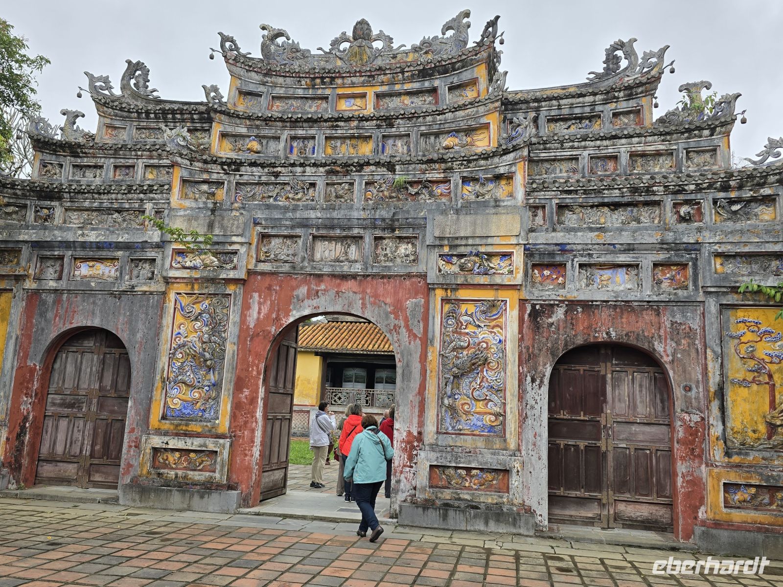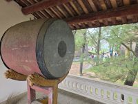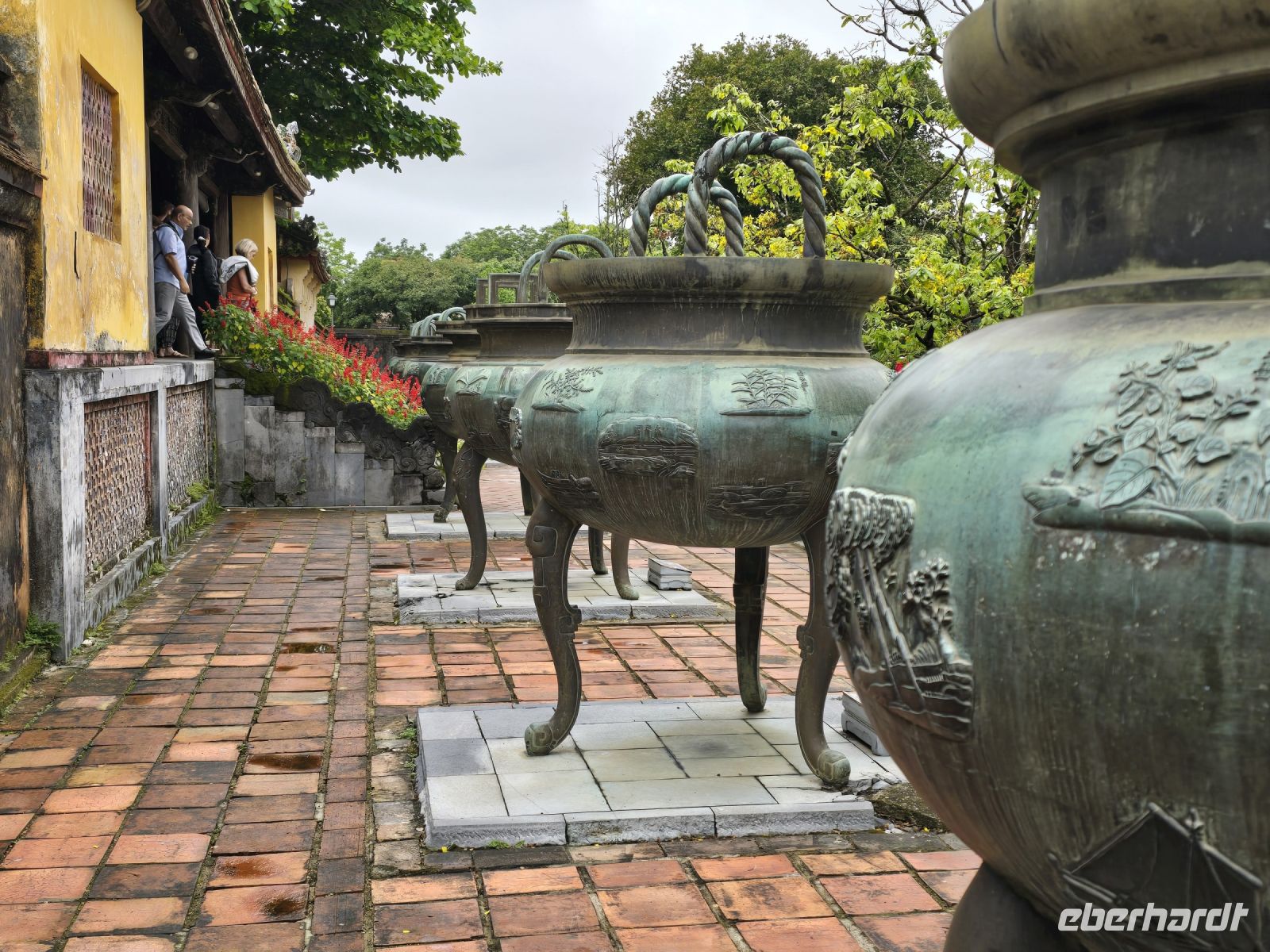 Heute Morgen sind wir direkt vom Hotel zum Kaiserpalast gefahren. Hue ist die Kaiserstadt in der im 19. und 20. Jahrhundert, 14 verschiedenen Kaisern residieret hatten. Die Fläche auf der die Paläste und weitere Gebäude des Kaisers angesiedelt sind, erstreckt sich über 3 Quadratkilometer. Eine riesige Anlage mit großen Parkflächen, Seen und prunkvollen Palästen die meist in Rottönen mit gelblichen Verzierungen geschmückt sind. Hier lebten früher bis zu 60.000 Menschen außerordentlich luxuriös. In einer offenen aber überdachten Galerie ist die große Trommel platziert, mit der Mitteilungen und Ereignisse dem Volk und dem Hofstaat angekündigt werden. Jeder der den Spielfilm "Der letzte Kaiser" gesehen hat, dem ist diese Trommel und der davor liegende Balkon bekannt, hier zeigte sich der Kaiser dem Volk und wurde vom Hof her bejubelt.