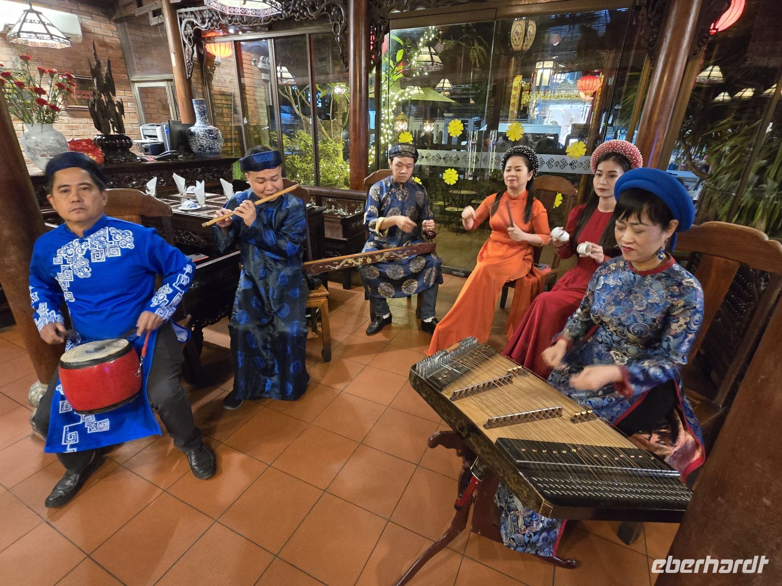Das allabendliche gemeinsame Abendessen ist uns sehr wichtig geworden. Die Art und Weise, der vielen Gänge, auf gemeinsamen Platten serviert, ist eine sehr geselliges Speisen. An diesem Abend werden wir noch überrascht mit einer kleinen Kapelle und einer kleinen Tanz Vorführung.