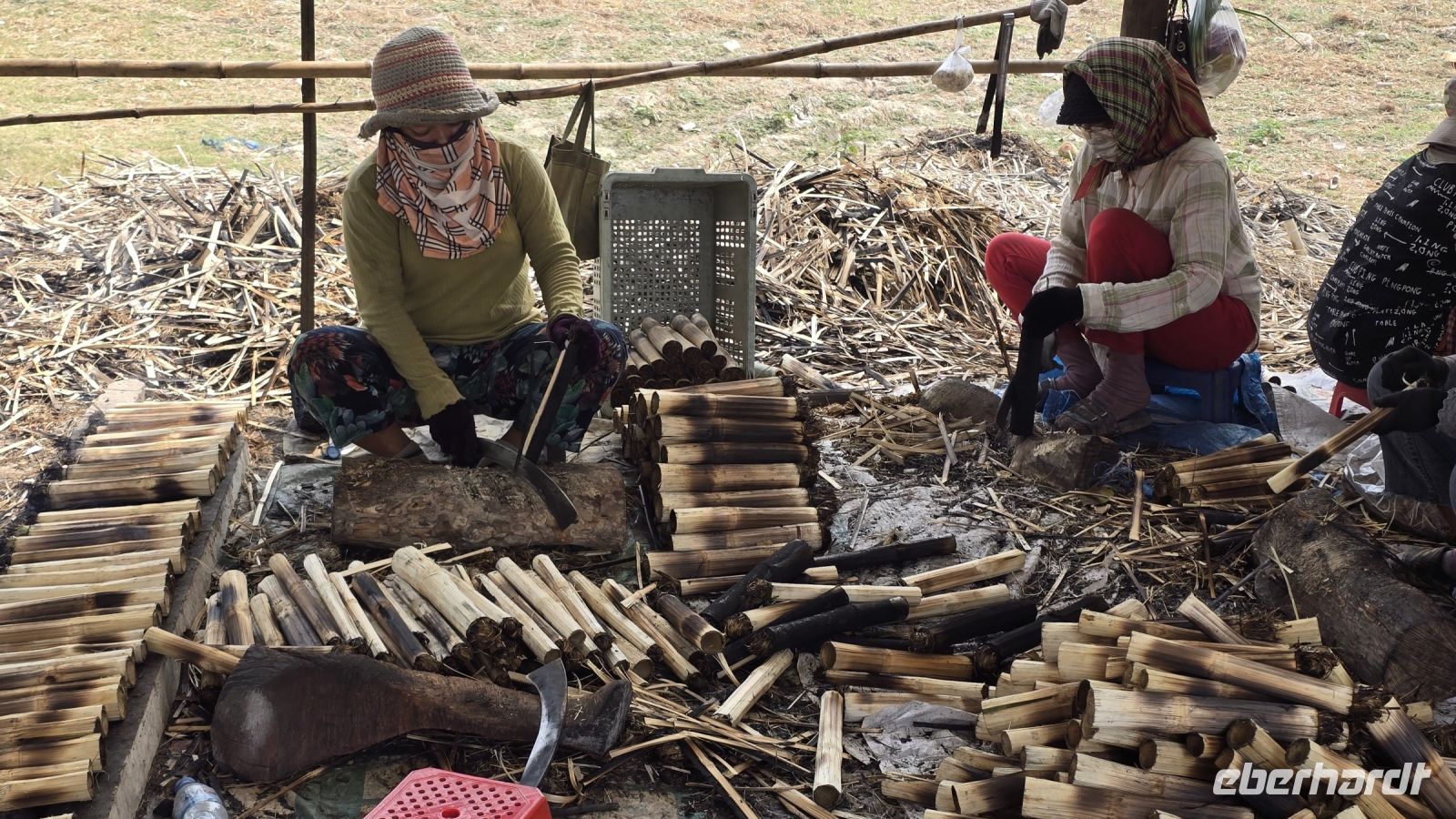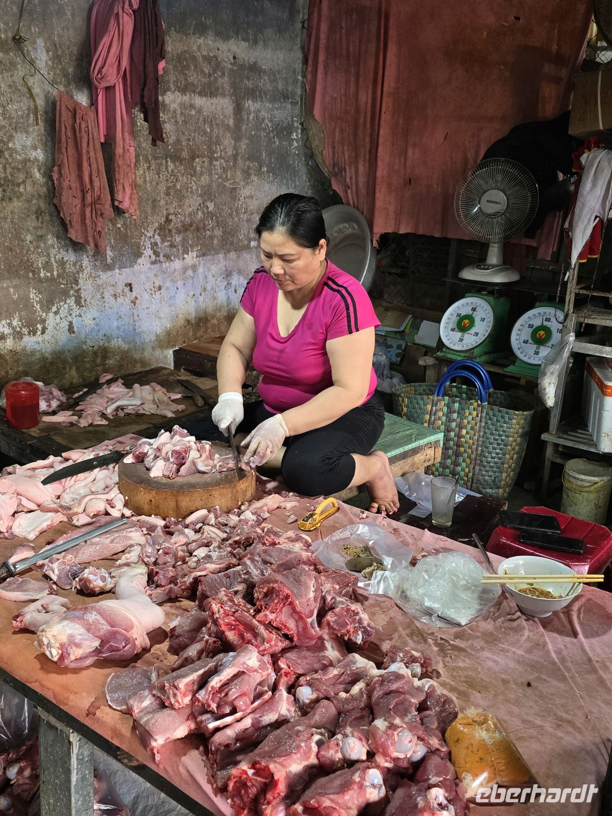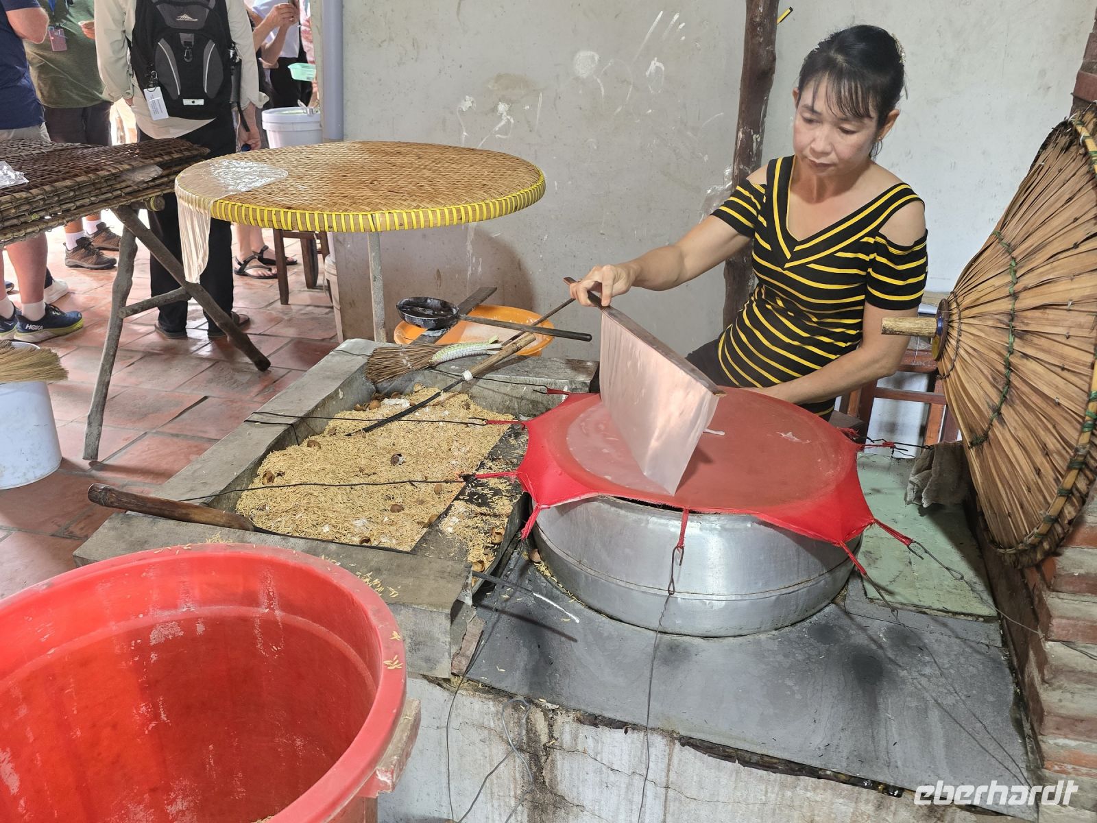 Wieder ging es einige 100 Meter weiter bis wir an einer kleinen Produktionsstätte ankamen. Hier wurden vielfältige Lebensmittel produziert, verpackt und auch verkauft. Als erstes wurde uns gezeigt wie man traditionell dieses Reispapier herstellt. Über einem kochenden Wasserdampf wird ein Stoff gespannt, auf dem wird dann der Reismehlteig dünn verteilt und mit einem Reisstrohdeckel, der aussieht wie die Reis Hüte die wir zuvor bei den Ruderbooten aufhatten, abgedeckt und für 2 Minuten gegart. Dann ist die dünne Reisfolie fest und stabil und kann vorsichtig von dem Tuch abgenommen und für einige Stunden getrocknet werden. Dann kommen wir an einen Arbeitsplatz wo Puffreis hergestellt wird. Mit den Schalen der Reiskörner und Litschi Schalen wird ein Feuer beheizt in dem ein großer Wok steht, der den Boden bedeckt hat mit schwarzem Sand. Wenn der Sand heiß genug ist dann kippt der Arbeiter eine Schüssel Reis in den Wok. Gleichmäßig wird gerührt und schon nach kurzer Zeit geht die Knallerei los. Die Reiskörner erwärmen sich, quellen auf zu schaumigen Kugeln und erst wenn fast alle Reiskörner explodiert sind, wird die ganze Mischung inklusive des Sandes durch ein Sieb getrennt. Der Puffreis kommt dann zum nächsten Arbeitsplatz wo ebenfalls ein großer Wok gefüllt ist mit karamellisiertem Zucker und Sirup aus verschiedenen Zutaten. Hier wird der Puffreis eingefüllt, ergänzt mit allerlei Gewürzen und Erdnüssen. Es entsteht eine klebrige Masse, die glatt in einen flachen Rahmen eingefüllt und auf das richtige Maß gestrichen wird. Schnell ist die Masse trocken und die Leute beginnen mit einem Lineal, das große Rechteck in viele kleine Rechtecke zu zerteilen, die dann wieder an den darauffolgenden Arbeitsplatz für die Verpackung, natürlich von Hand durch eine Frau, weitergegeben werden.