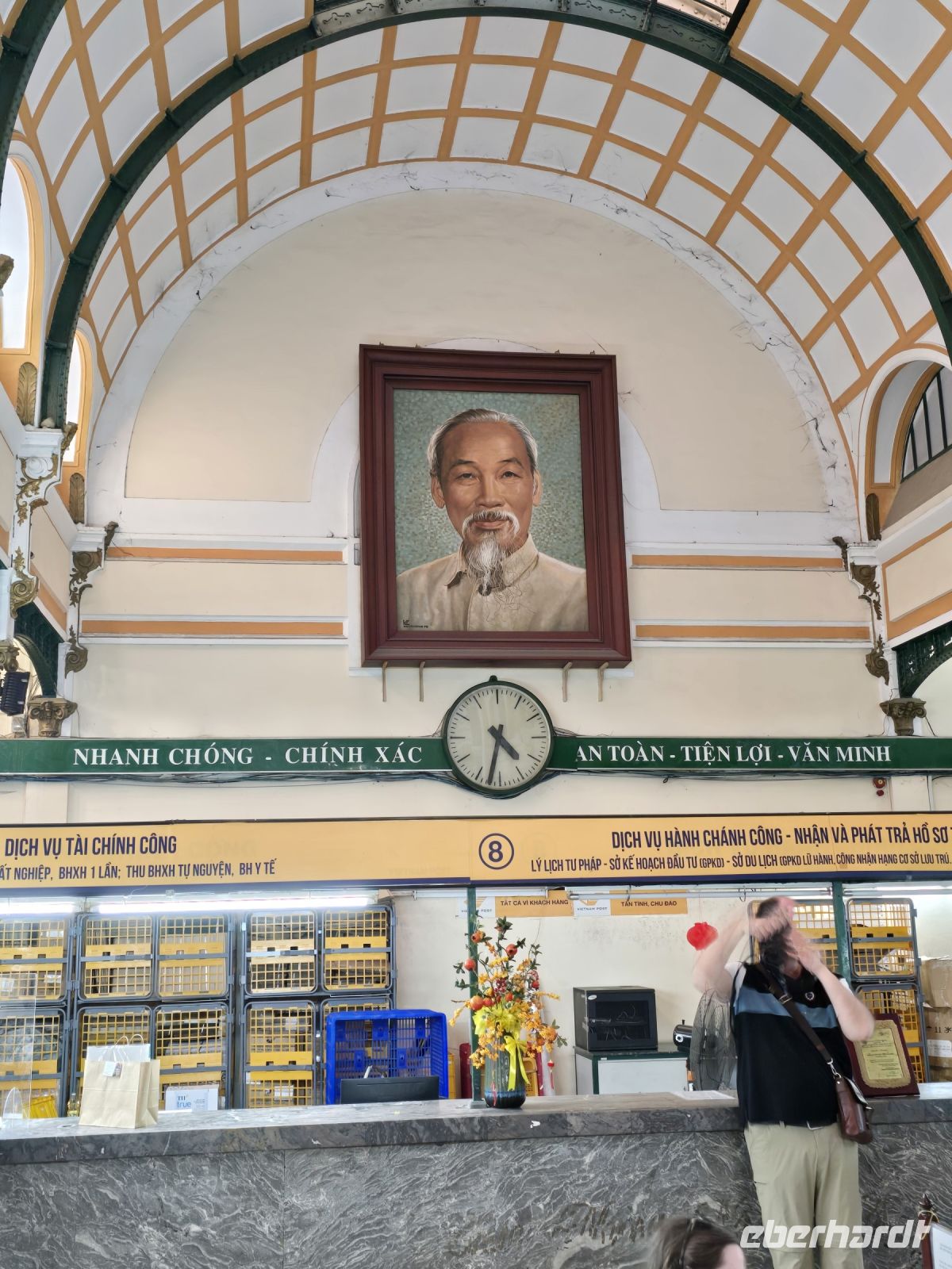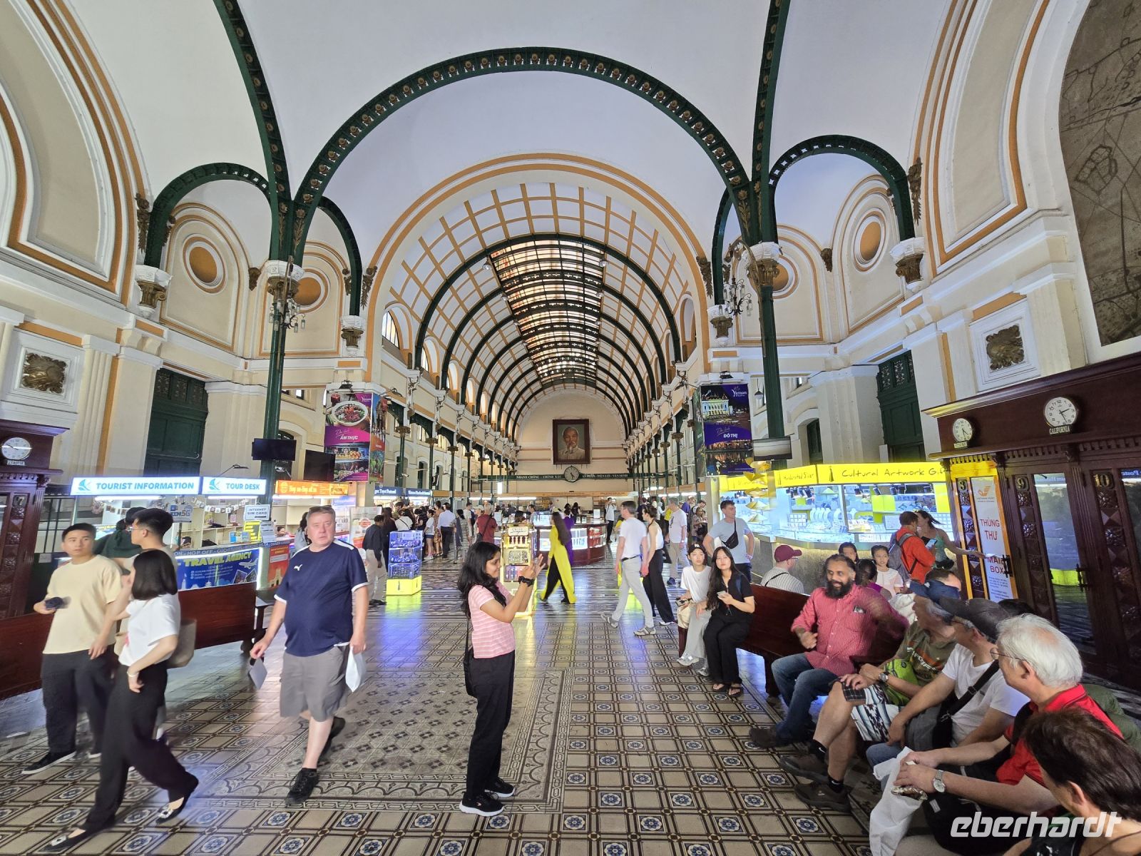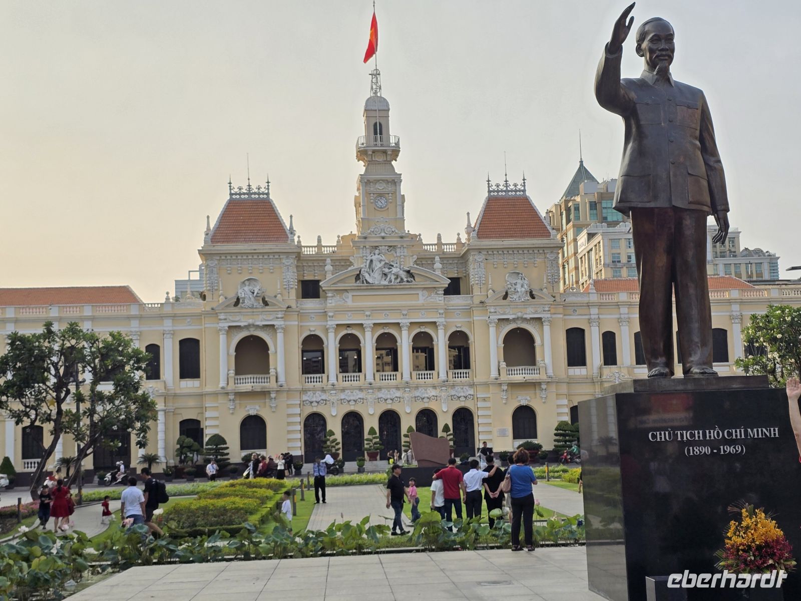 Der Flug nach Ho-Chi-Minh-Stadt startete pünktlich, verlief ohne Zwischenfälle und somit kamen wir auch pünktlich an. Unser Reiseleiter für Südvietnam Herr Trong wartete schon auf uns und gleich nachdem wir unser Gepäck vom Band hatten, bestiegen wir auch schon den Reisebus und machten eine erste Stadtbesichtigung in Saigon. Wir schauten uns als erstes das alte Postamt an, das von den Franzosen Ende des 19 Jahrhunderts gebaut wurde. Es ist auch heute noch eine Augenweide und weitgehend auch noch als Postamt genutzt. Klar es werden lange nicht mehr so viel Briefe und Postkarten geschrieben als früher, deswegen wird ein Teil für Souvenirverkauf genützt, aber die Haupthalle ist auch heute noch ein Postamt. Hier schreibt man auch heute noch gerne Postkarten, vor allem Touristen tun das und versehen sie dann mit dem traditionellen Poststempel und schicken sie nach Hause in die Welt. Wie lange es dauert, heute eine Postkarte zu verschicken werden wir wohl erst in einigen Wochen oder vielleicht auch erst in Monaten wissen. Wir schauten uns noch das alte Rathaus an und das erste Hotel in Saigon an, auch diese beiden Bauwerke wurden von den Franzosen errichtet. Da dieses Jahr das Jahr des Drachen ist, dass am 15 Januar des Mondkalenders begonnen hat, ist in der Fußgängerzone der größte Drachen von ganz Vietnam aufgebaut. Zwei Drachen mit über 120 m Länge schlängeln sich durch den großen Platz vor dem Ho Chi Mingh Standbild. Wir haben uns fest vorgenommen die kurze Zeit die wir in Saigon verbringen, gut auszunutzen. So bringen wir schnell unsere Koffer in unser Hotel und schon nach kurzer Zeit treffen wir uns wieder um mit dem Bus zum Skydeck des Financial Towers zu fahren, um von dort oben die 14 Mill. Einwohnerstadt zu überblicken. Nach nur wenigen Sekunden sind wir oben auf dem Aussichtsplateau angekommen und staunen über den Ausblick. Unten schlängelt sich der Saigon-River durch die Stadt, ein mächtiger und breiter Fluss und auf beiden Seiten gehen die Wolkenkratzer in die Höhe, sind beleuchtet mit Farben, spielen so dass die Skyline von Saigon sich zeigt wie ein kleines theaterlichtspiel. An diesem Abend haben wir aber noch einen weiteren Termin, deshalb verlassen wir das Skydeck auch bald wieder und fahren zu einem Restaurant Schiff, das auf dem Saigon River eingelegt hat. Hier werden wir zu Abendessen. Wir sind im obersten Deck in einem separaten Raum mit herrlichem Blick auf die Skyline von Saigon, das Schiff legt ab und an uns vorüber zieht die abwechslungsreiche Stadt mit ihren architektonischen Highlights und fantasievollen Gebäude Illuminationen, es ist ein wahrer Augenschmaus. Während wir die Stadt bestaunen, wird uns ein ausgezeichnetes Menü serviert, eines der besten Essen die wir auf der Reise bisher hatten. Und nicht genug des Genusses, werden uns noch durch eine Tanzgruppe und zwei traditionellen Musikgruppen, vietnamesische und moderne Musik geboten. Die traditionellen Tänzerinnen in den bunten Kostümen, mit den großen Fächern, nehmen unsere Aufmerksamkeit komplett ein, die Skyline hat für diesen Moment unsere Aufmerksamkeit verloren. Es war ein wunderschöner Abend, in nur wenigen Stunden ist es uns gelungen einen schnellen Überblick über Saigon zu bekommen. Wir sind alle von der Stadt restlos begeistert.
